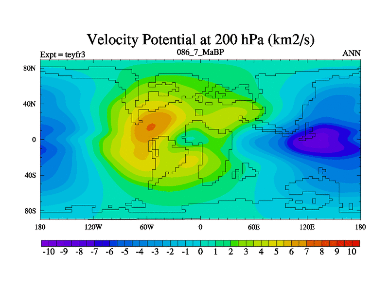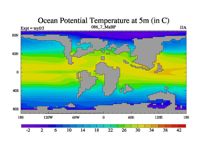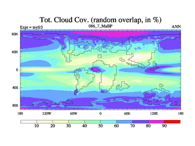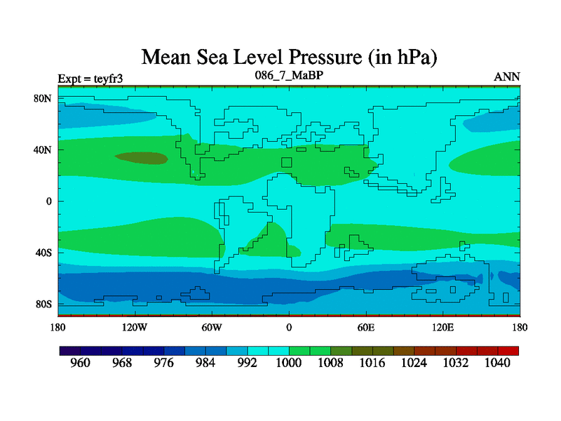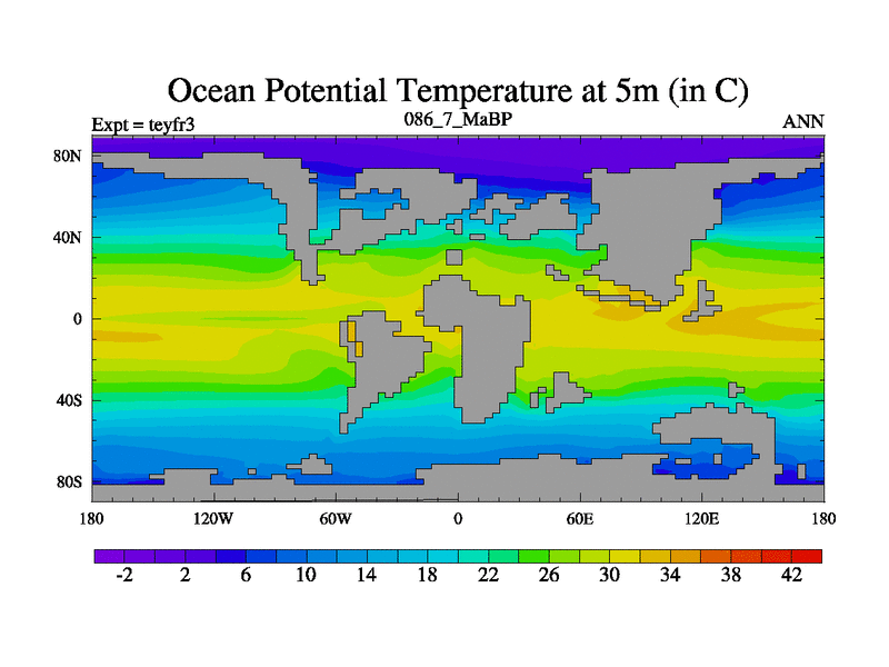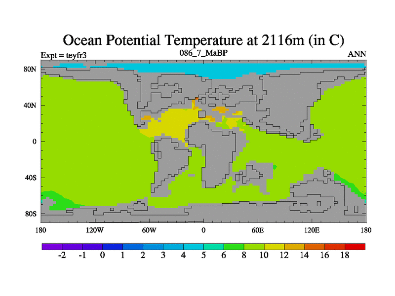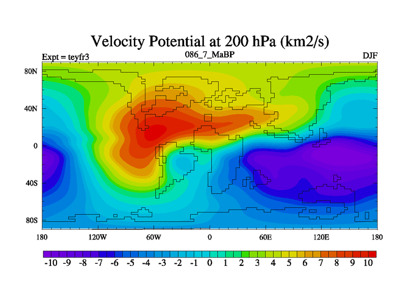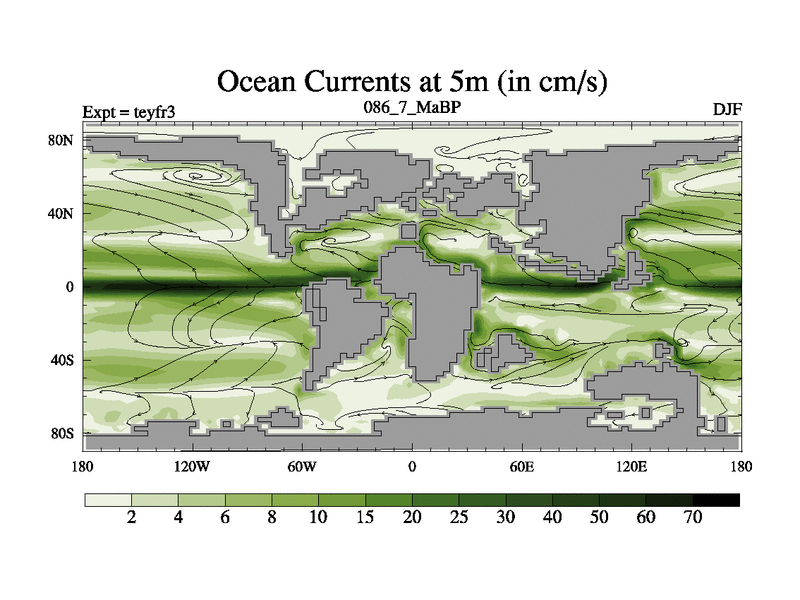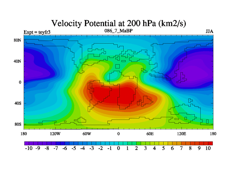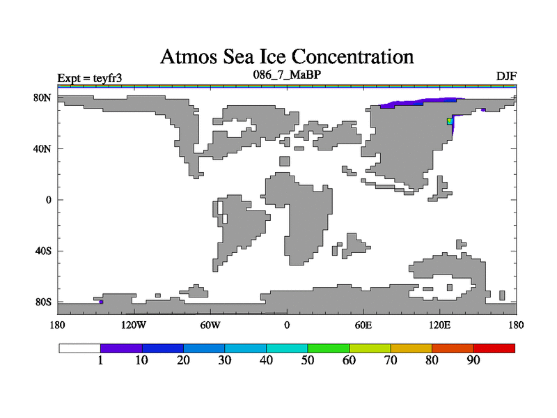 This is the 86.7 Ma simulation using the Scotese palaeogeographies and revised CCN etc. Updated HadCM3L ocean parameters and soil parameters. Also made sure orography gravity wave drag was consistent.