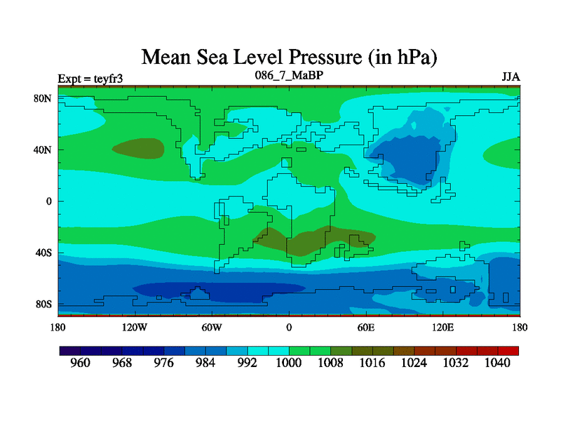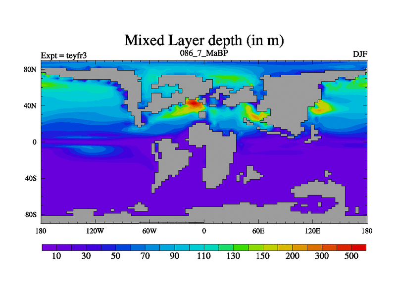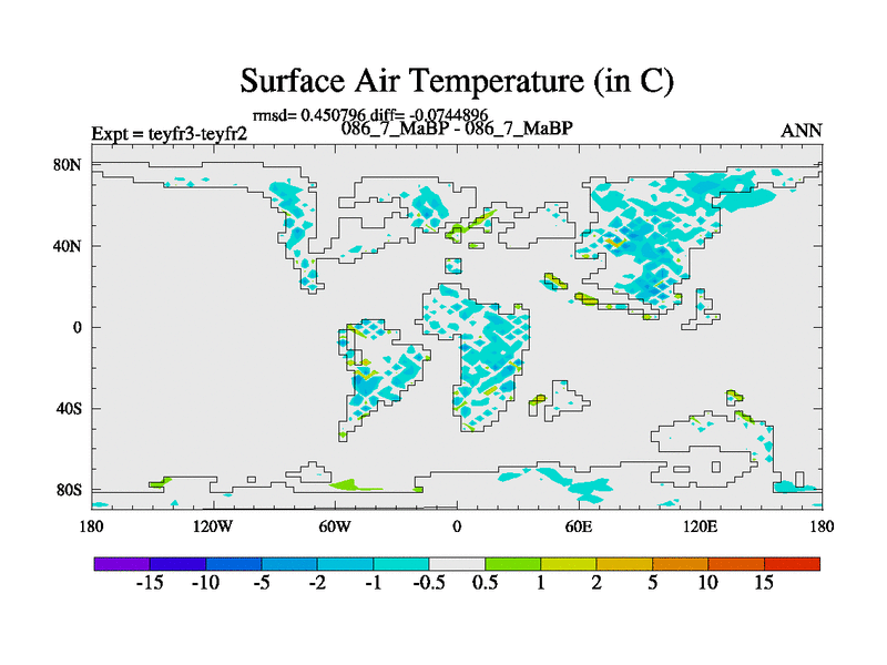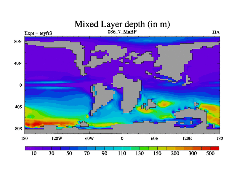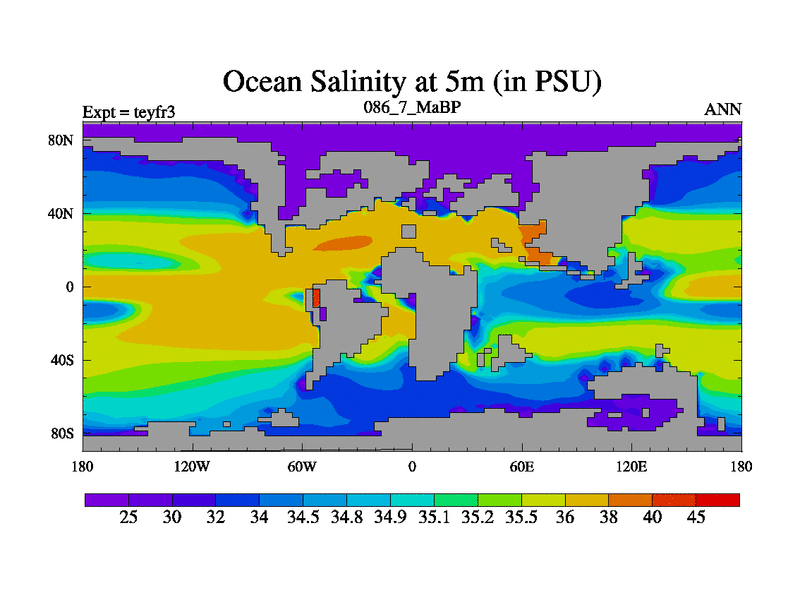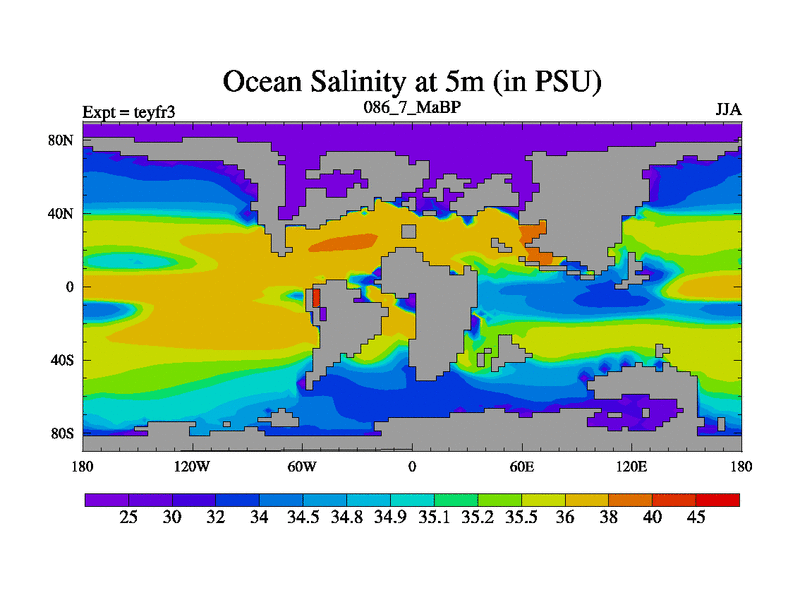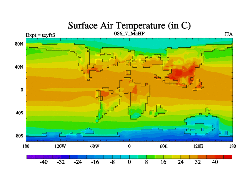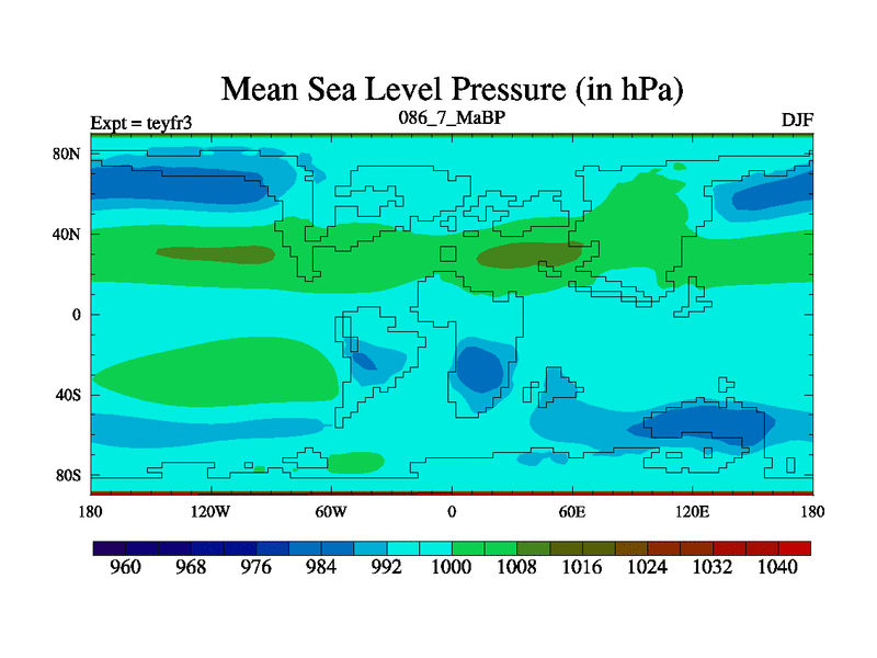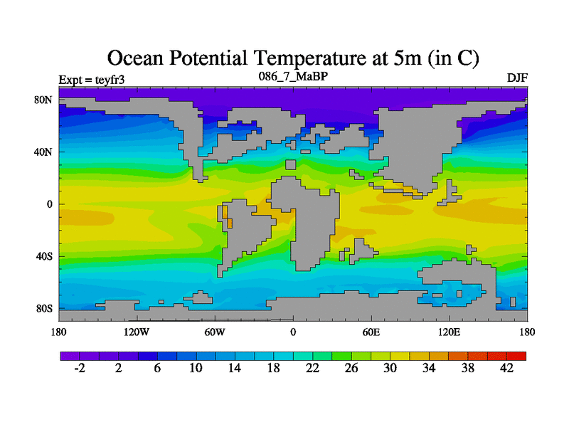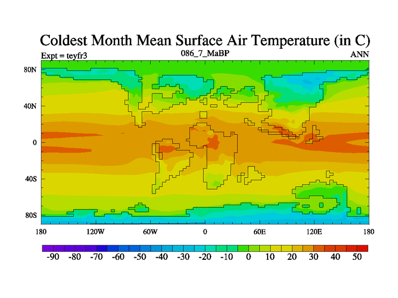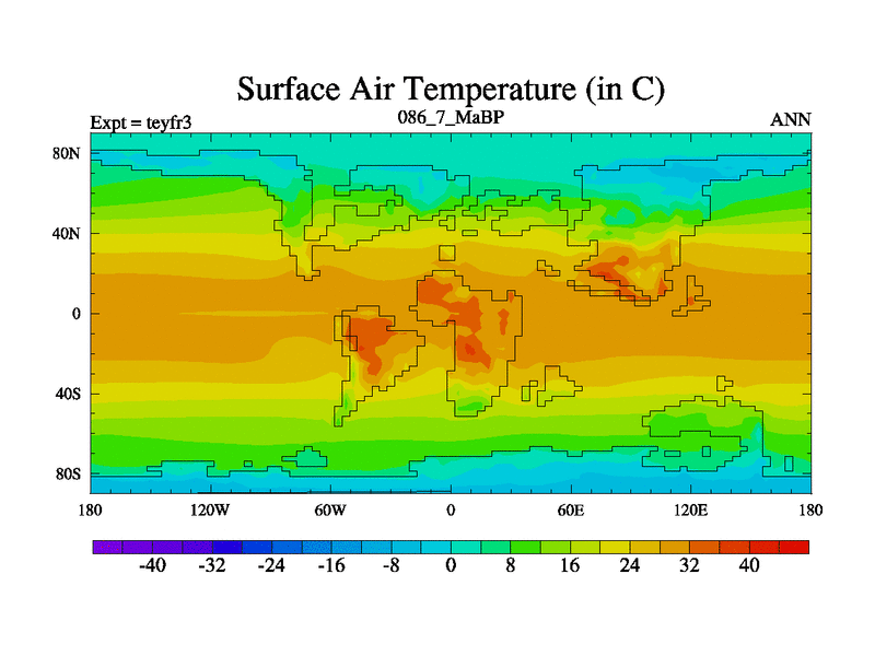 This is the 86.7 Ma simulation using the Scotese palaeogeographies and revised CCN etc. Updated HadCM3L ocean parameters and soil parameters. Also made sure orography gravity wave drag was consistent.