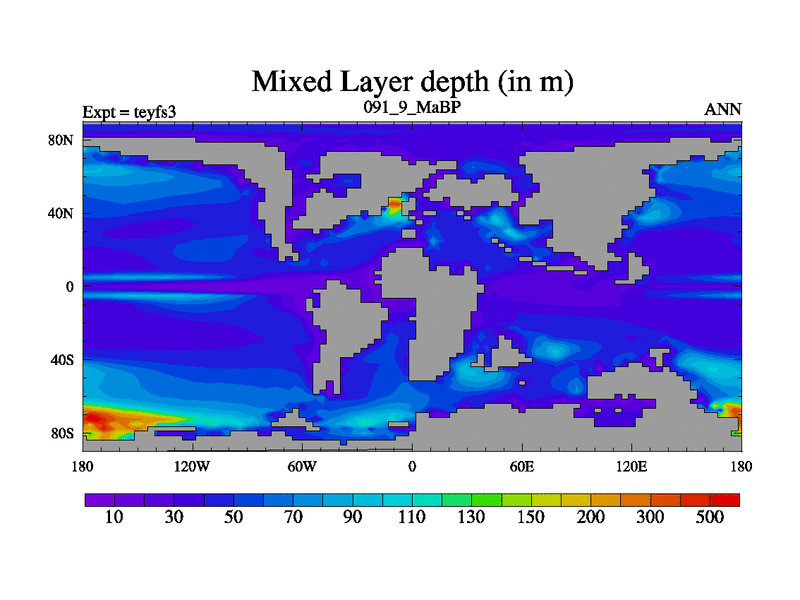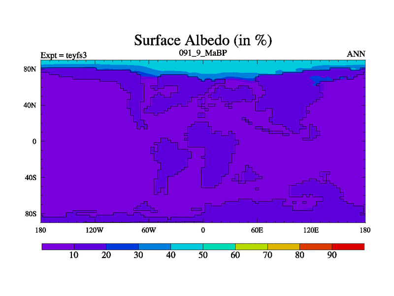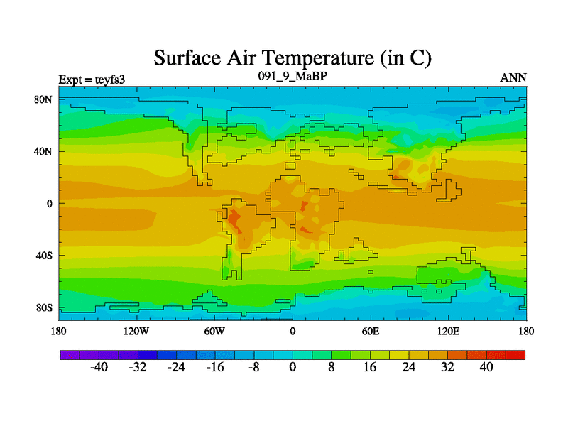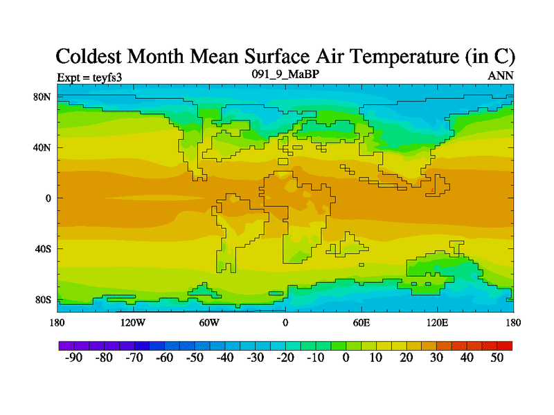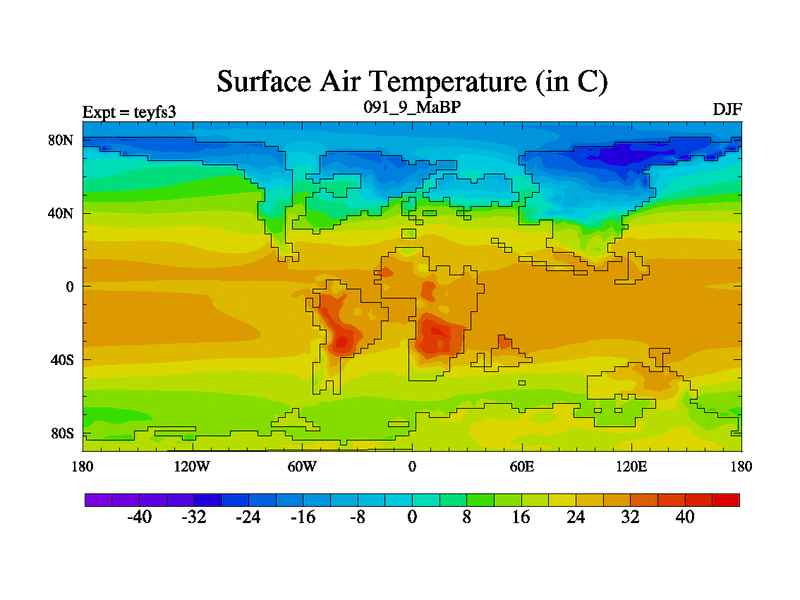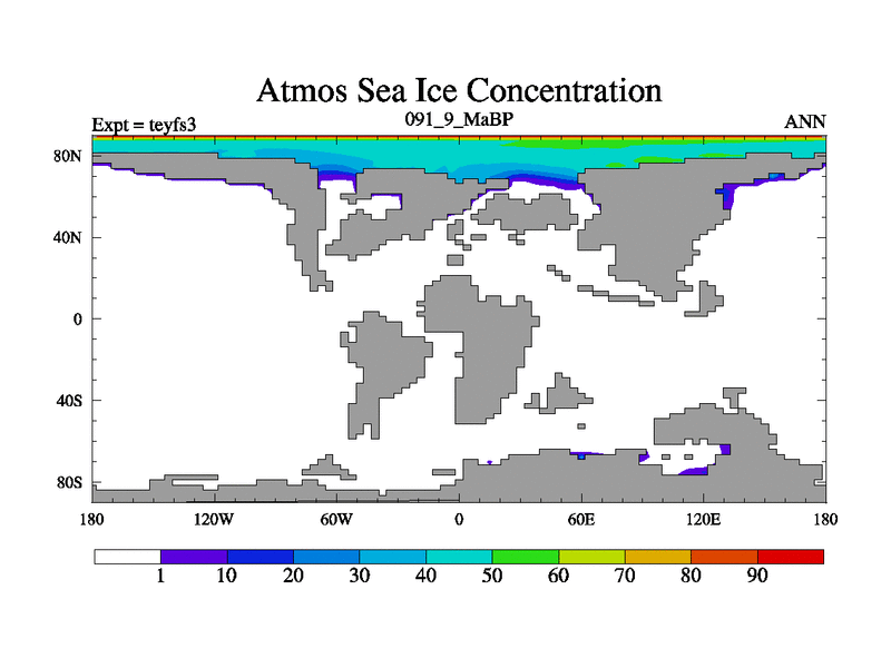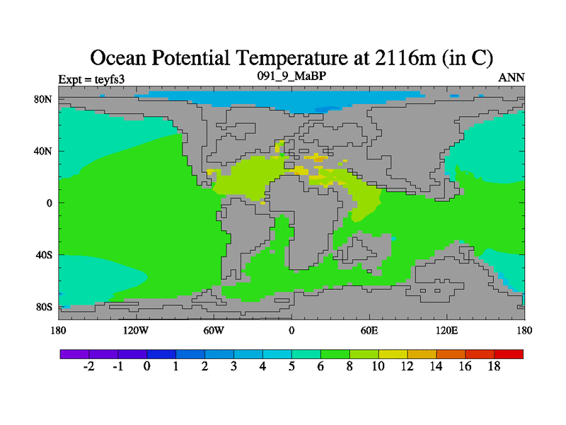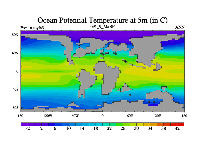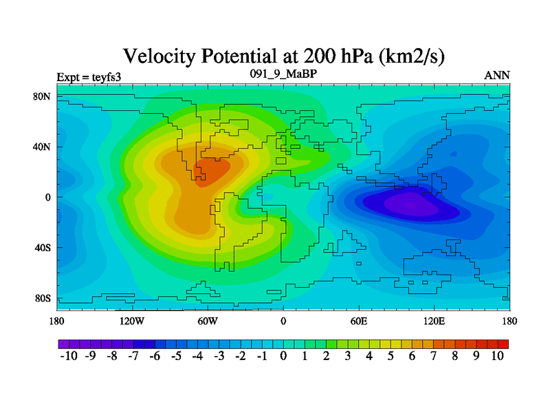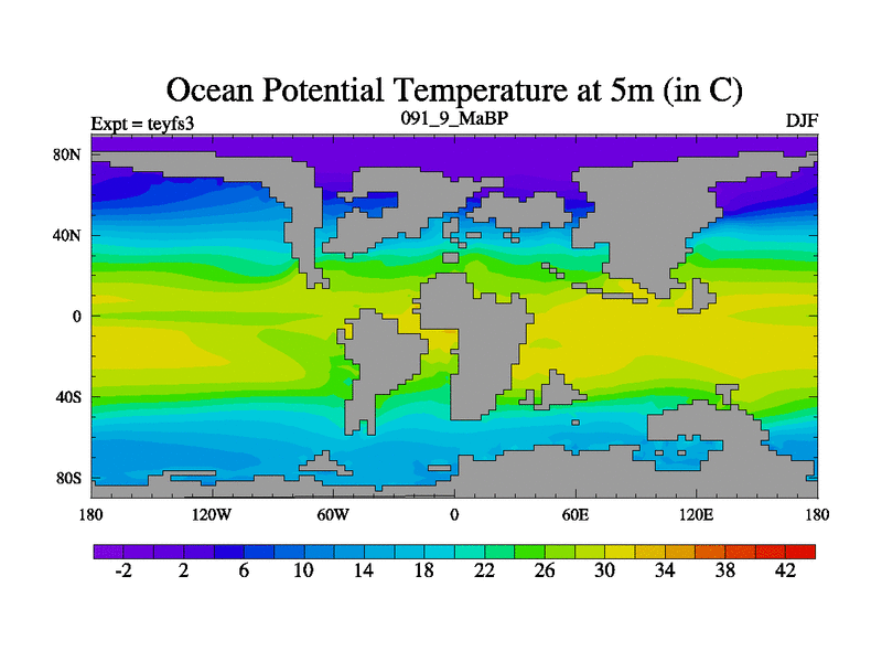 This is the 91.9 Ma simulation using the Scotese palaeogeographies and revised CCN etc. Updated HadCM3L ocean parameters and soil parameters. Also made sure orography gravity wave drag was consistent.