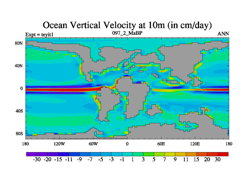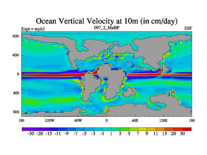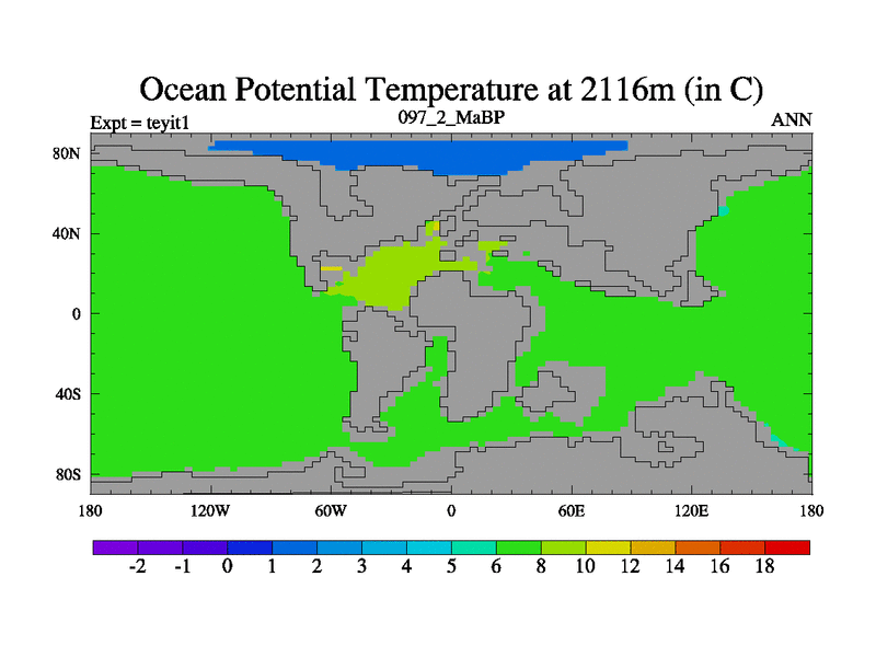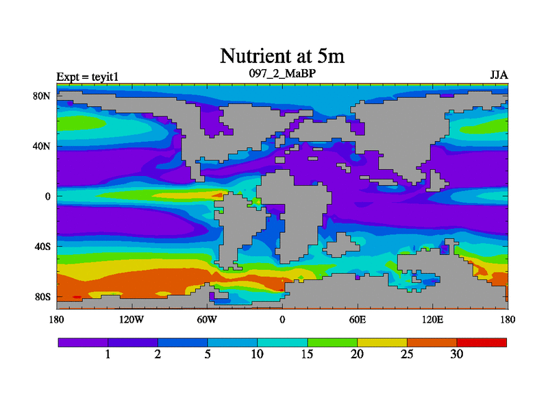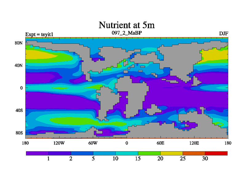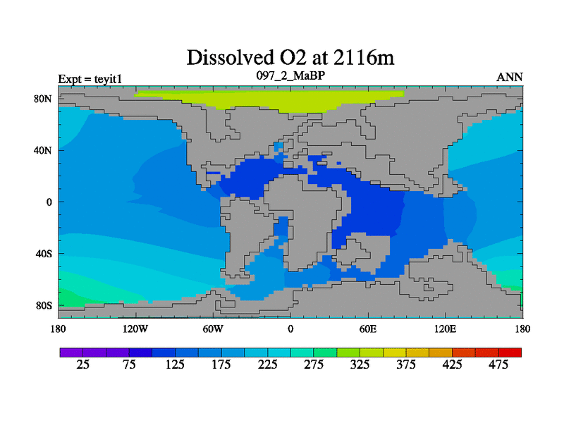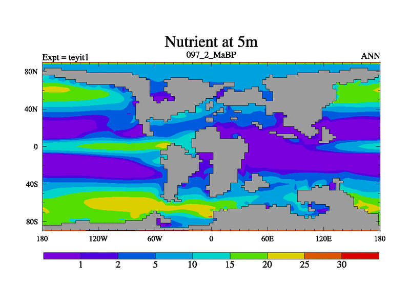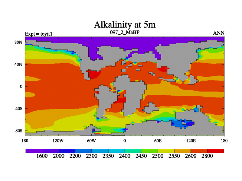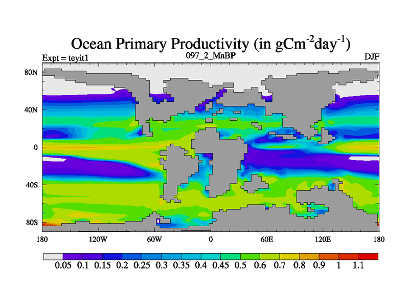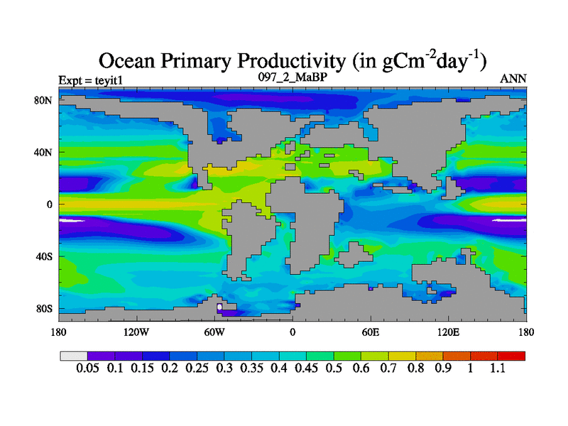 This is the 97.2 Ma simulation using the Scotese palaeogeographies and revised CCN etc. Now includes ocean biogeochemistry