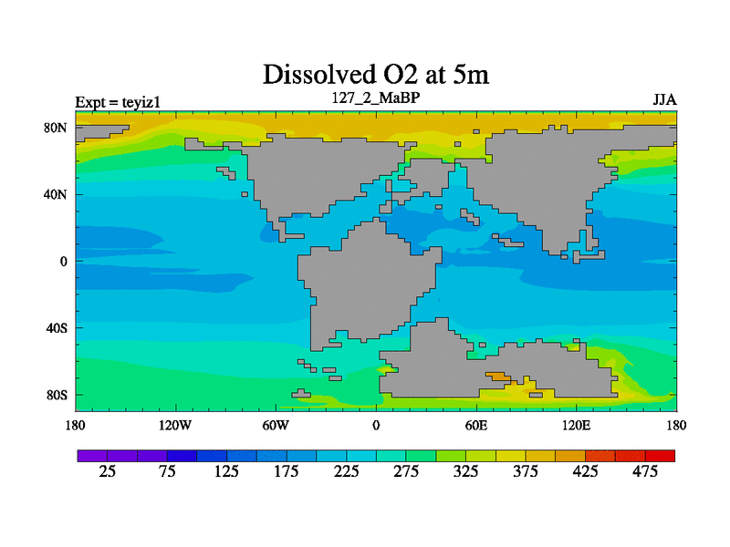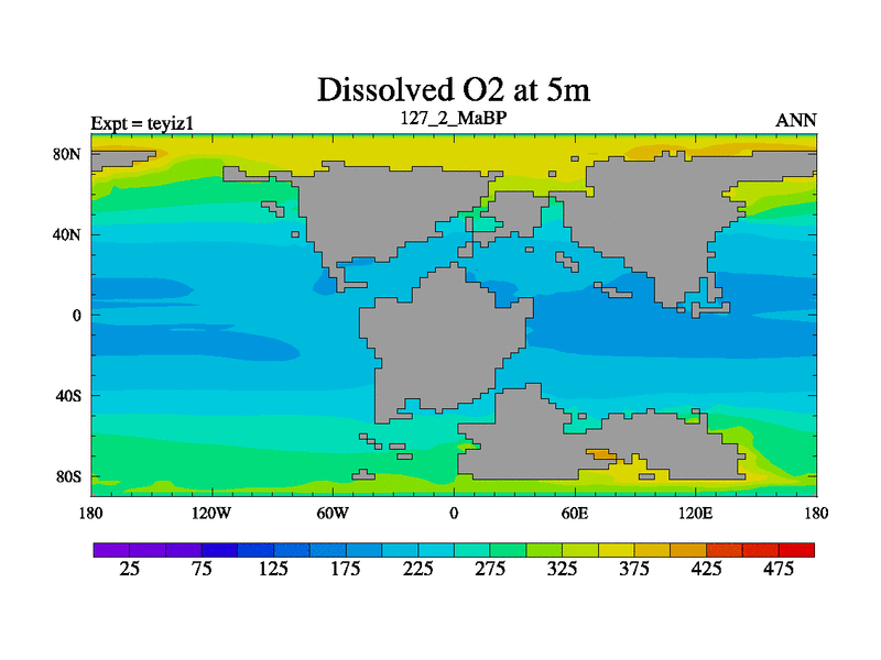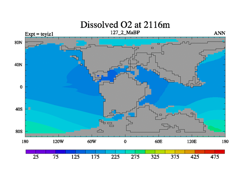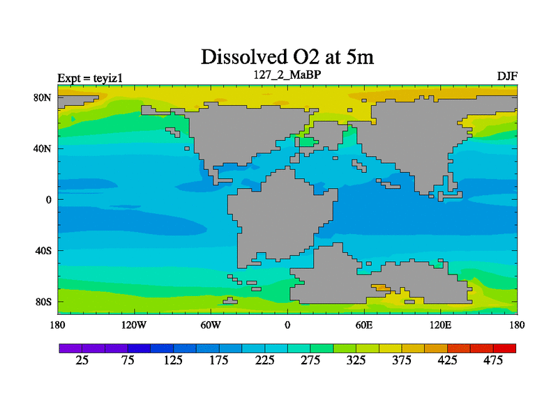 This is the 127.2 Ma simulation using the Scotese palaeogeographies and revised CCN etc. Now includes ocean biogeochemistry