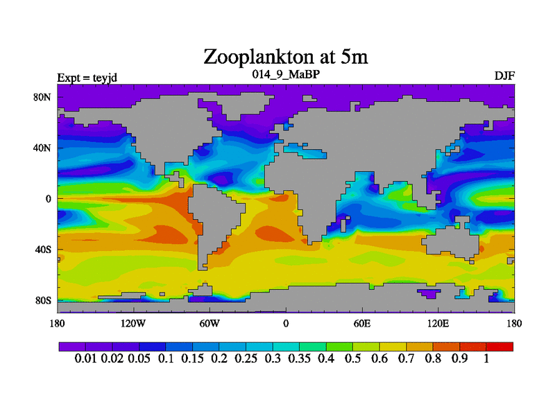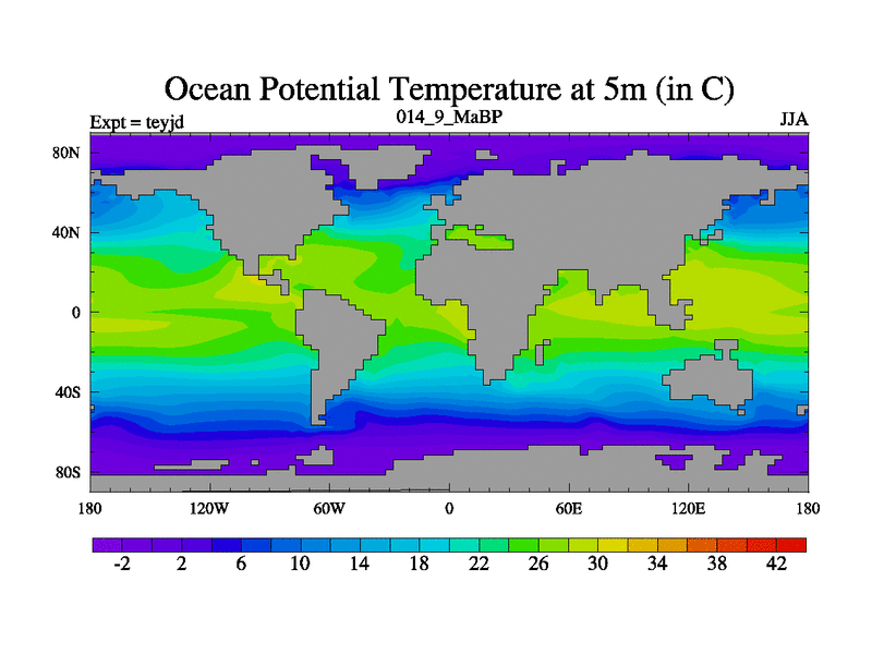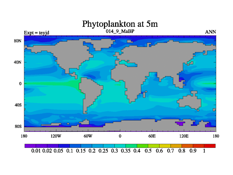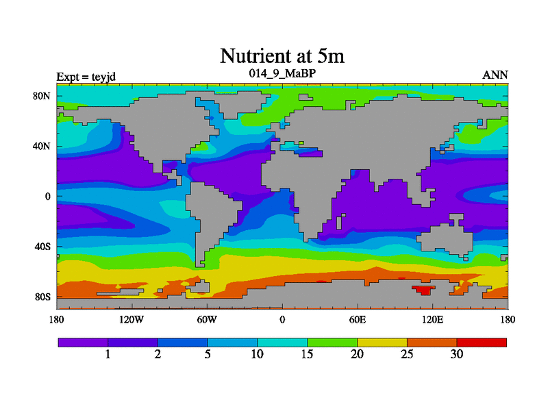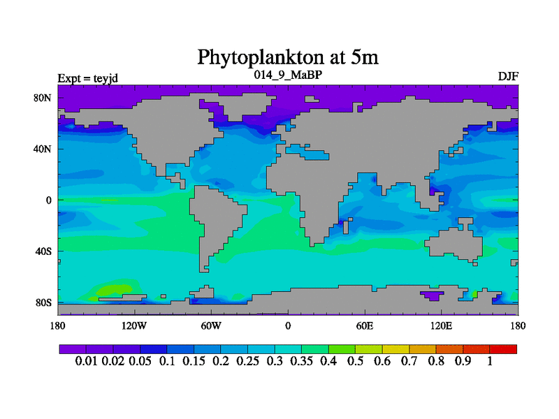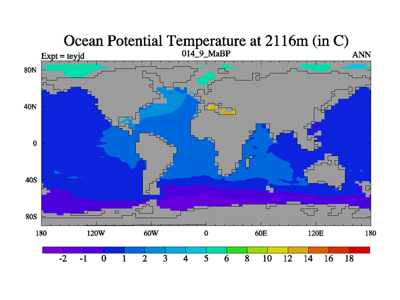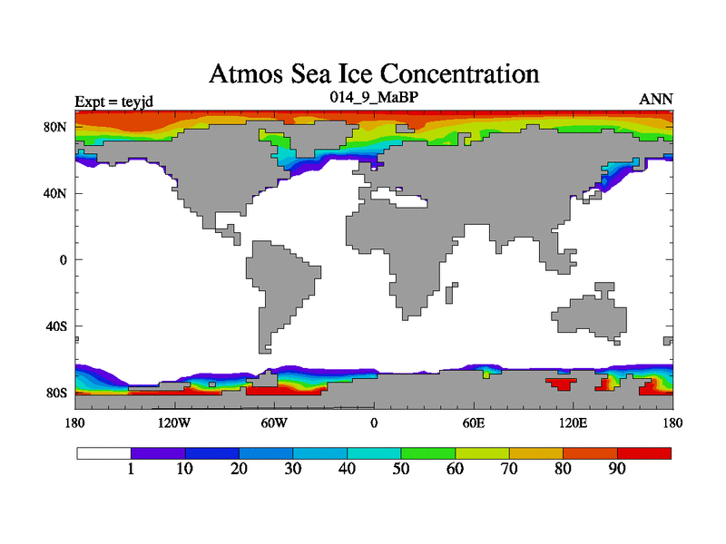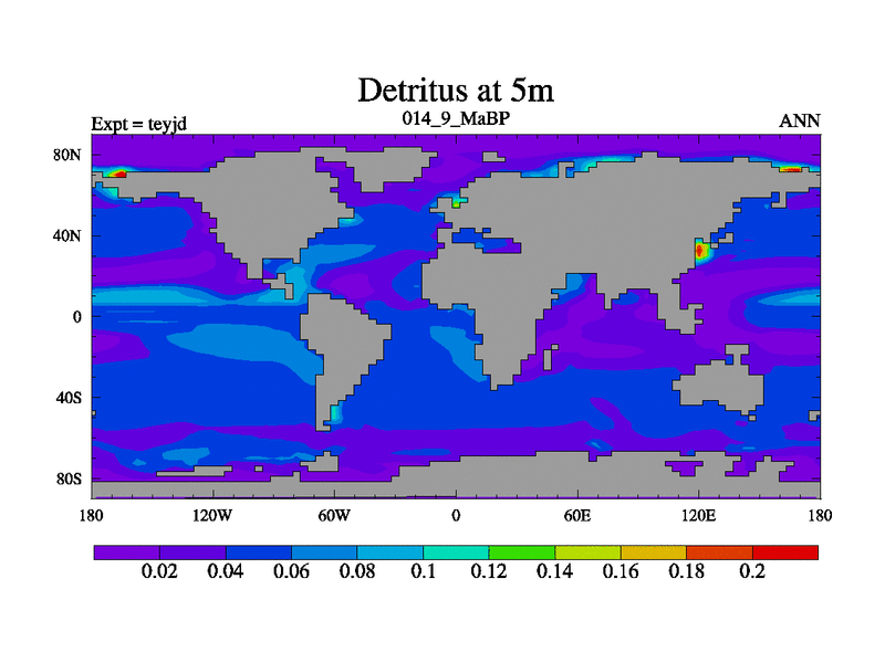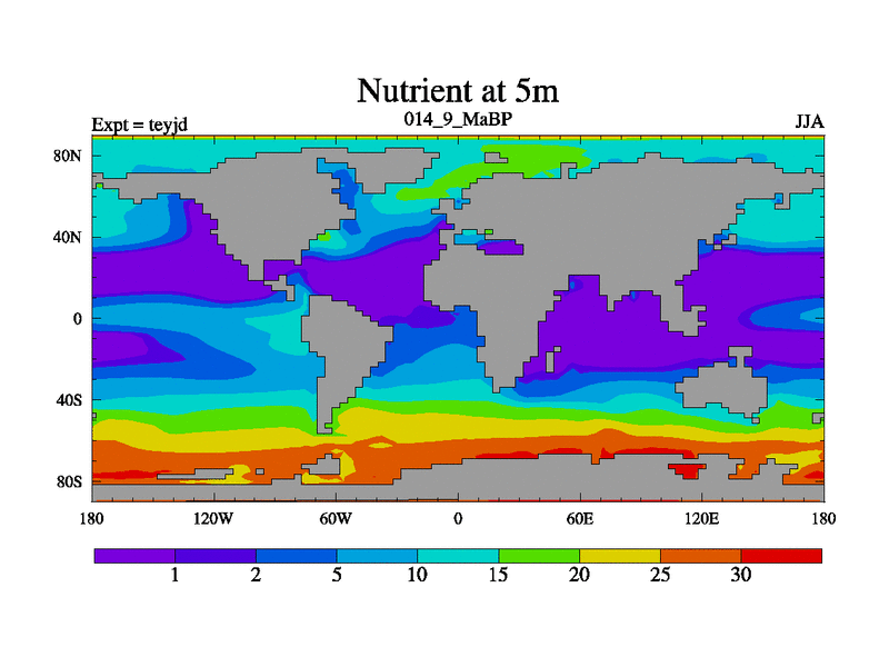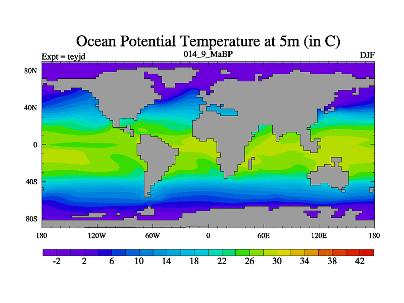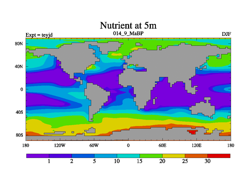 This is the 14.9 Ma simulation using the Scotese palaeogeographies and revised CCN etc. As teyfa3 but corrected orography problem over Antartartica. Now includes ocean biogeochemistry