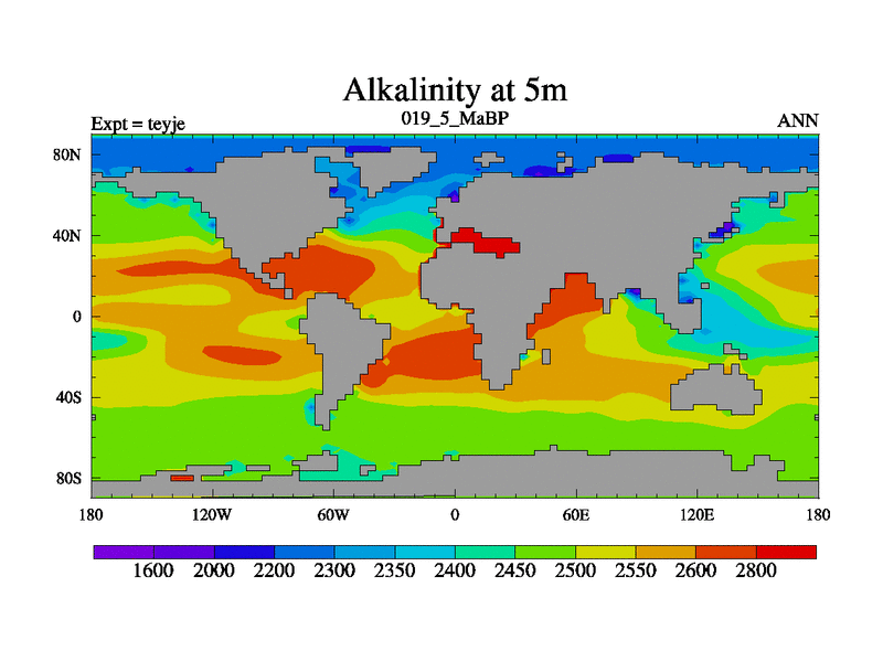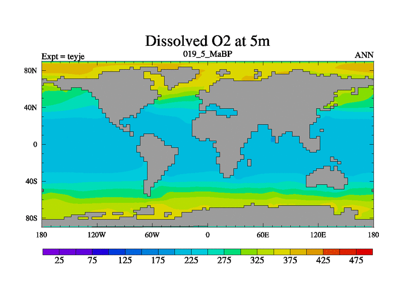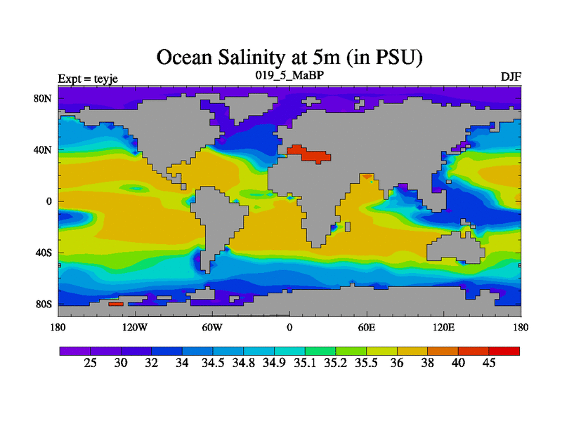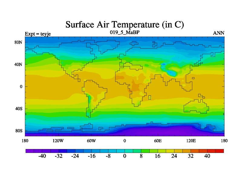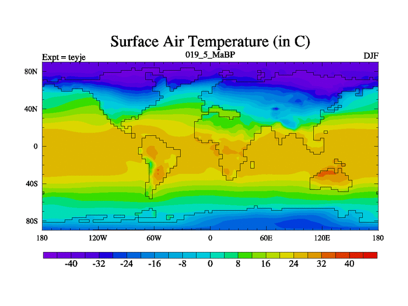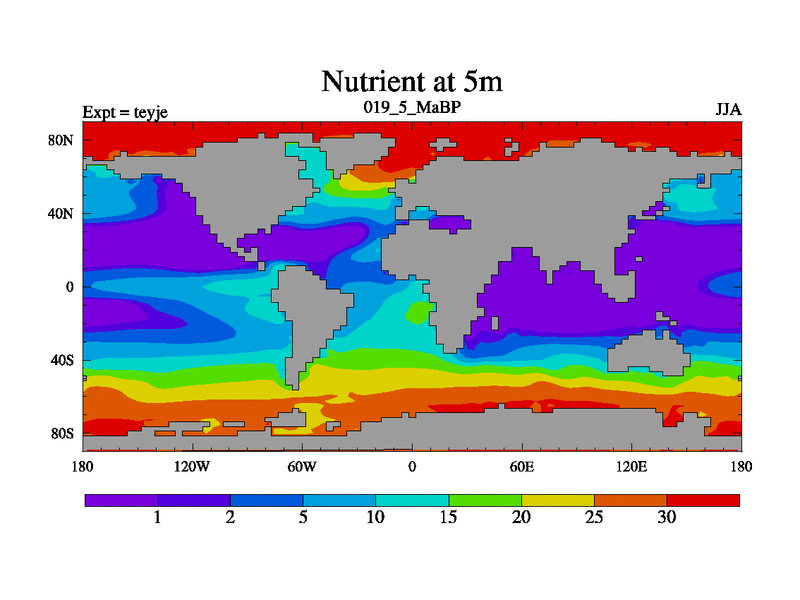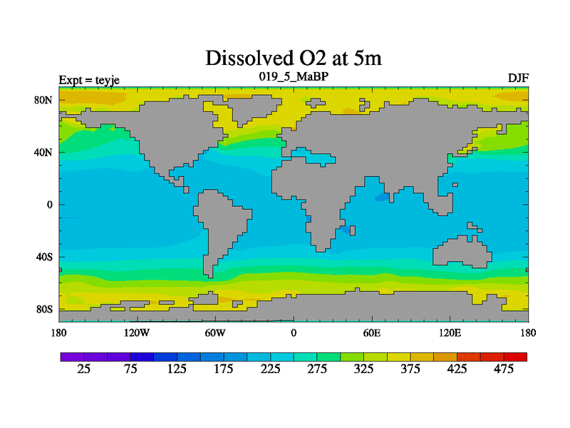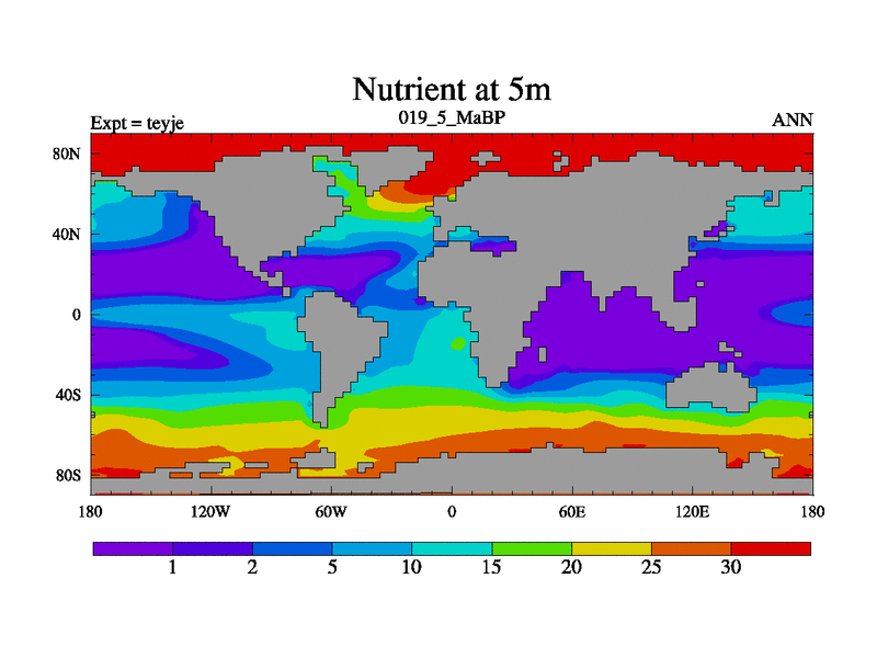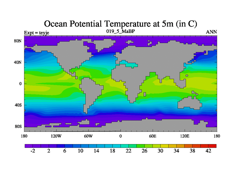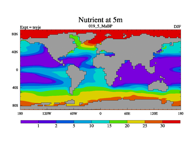 This is the 19.5 Ma simulation using the Scotese palaeogeographies and revised CCN etc. As teyfa3 but corrected orography problem over Antartartica. Now includes ocean biogeochemistry