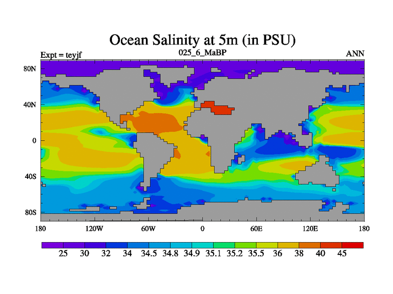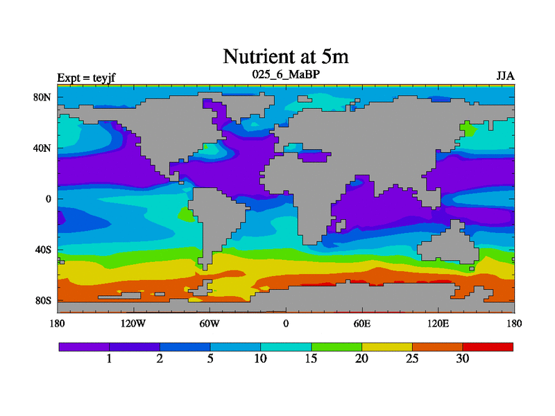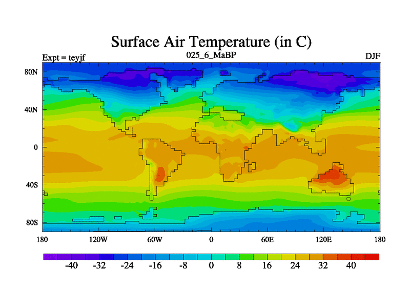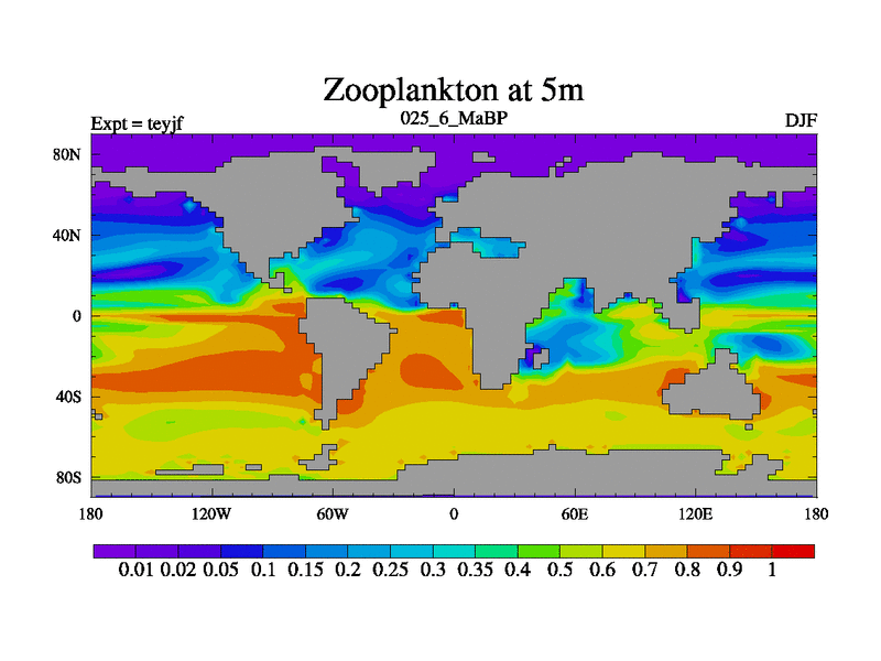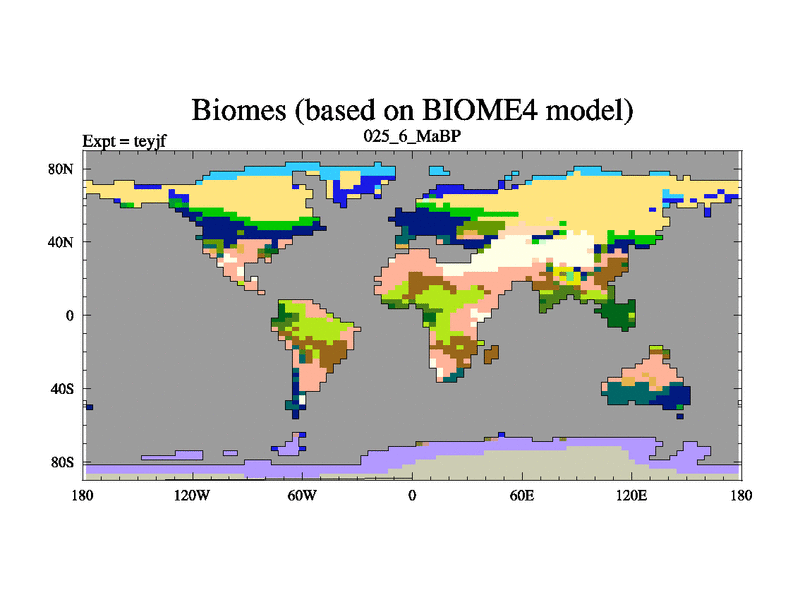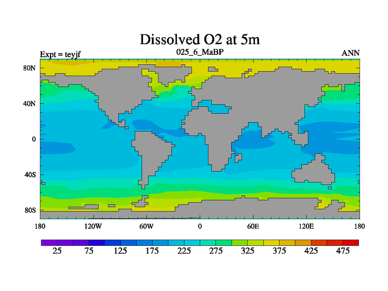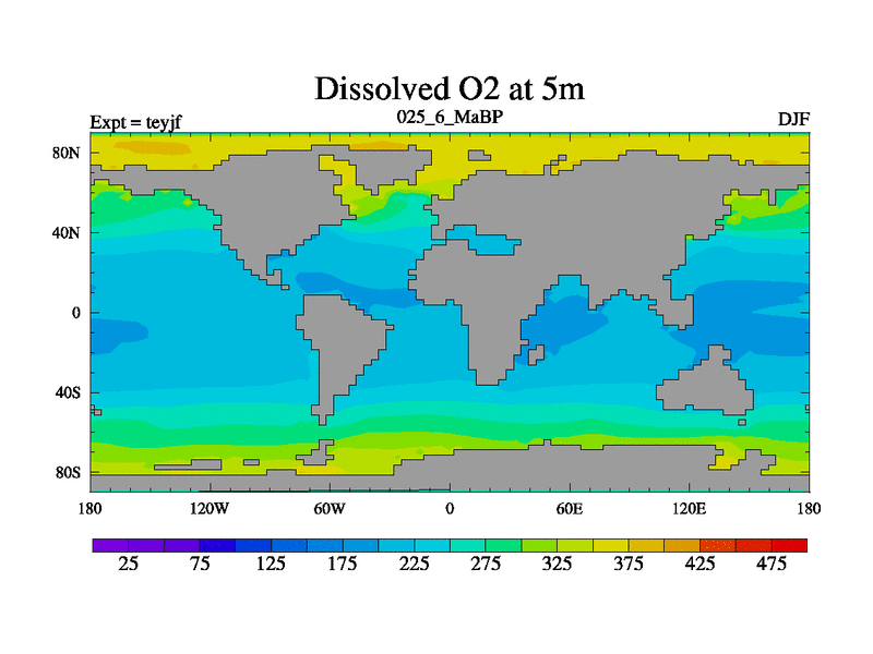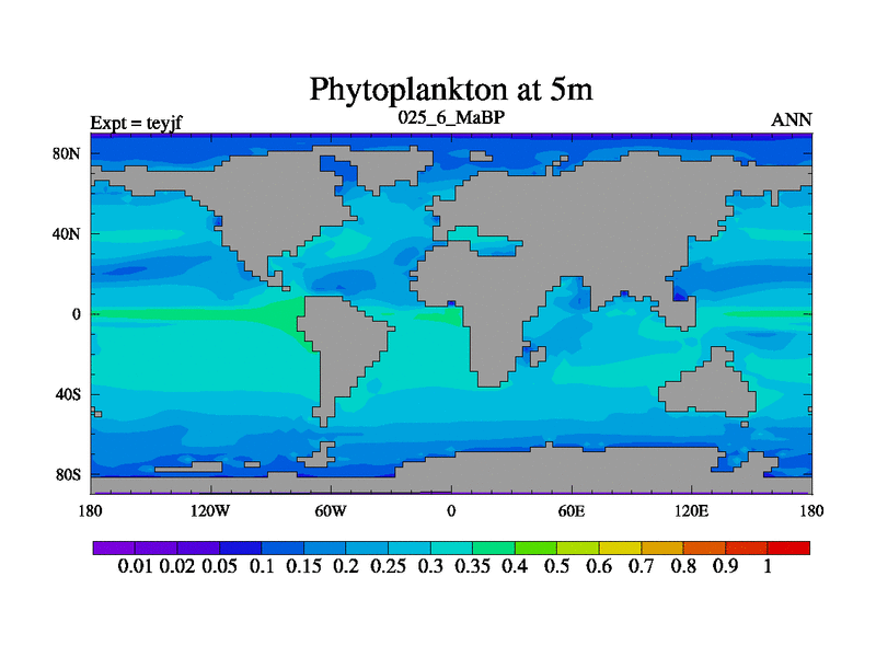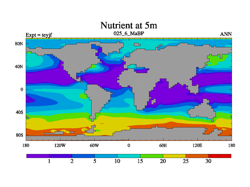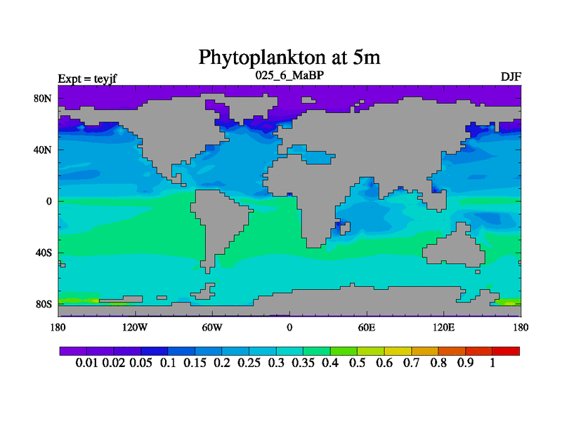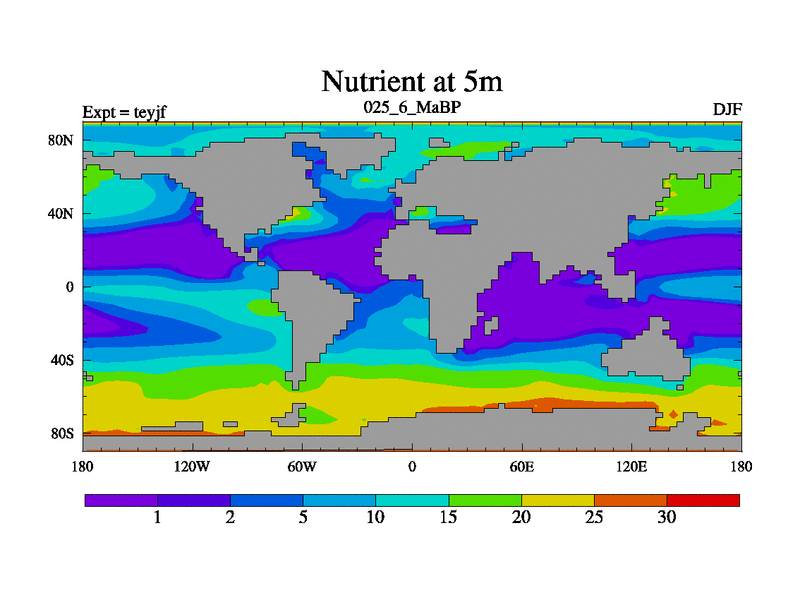 This is the 25.6 Ma simulation using the Scotese palaeogeographies and revised CCN etc. As teyfa3 but corrected orography problem over Antartartica. Now includes ocean biogeochemistry