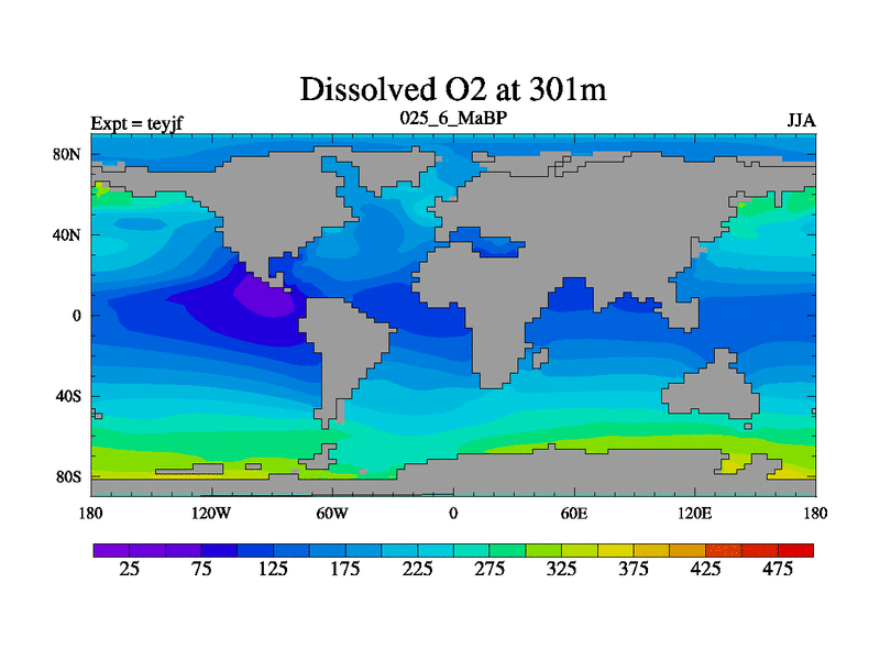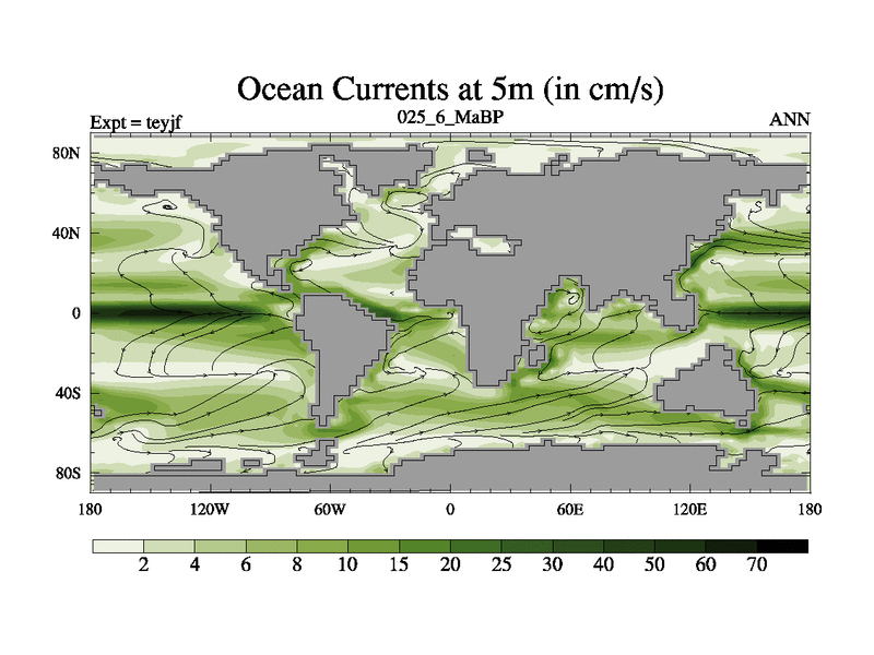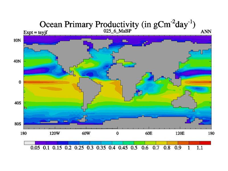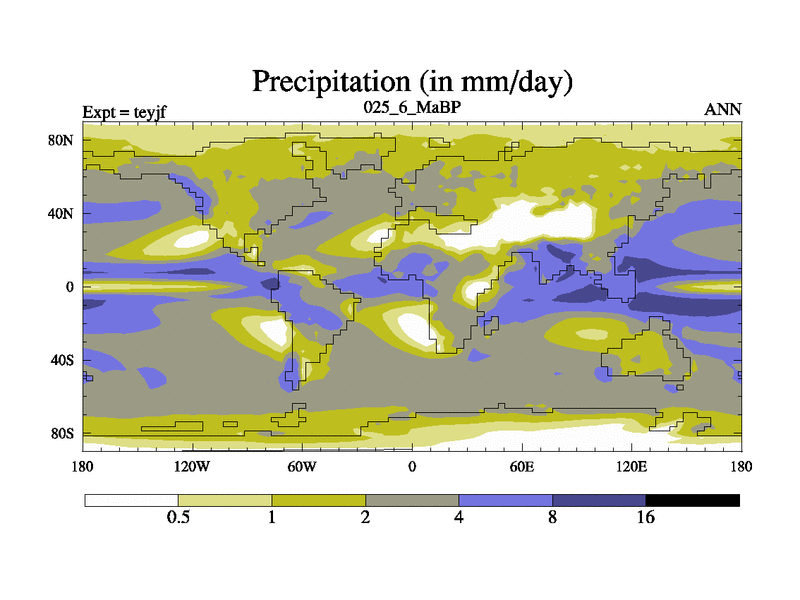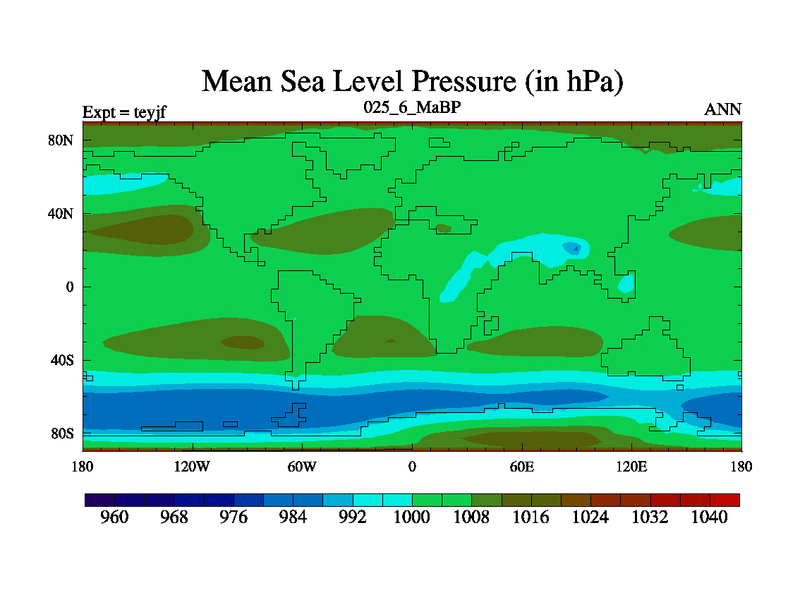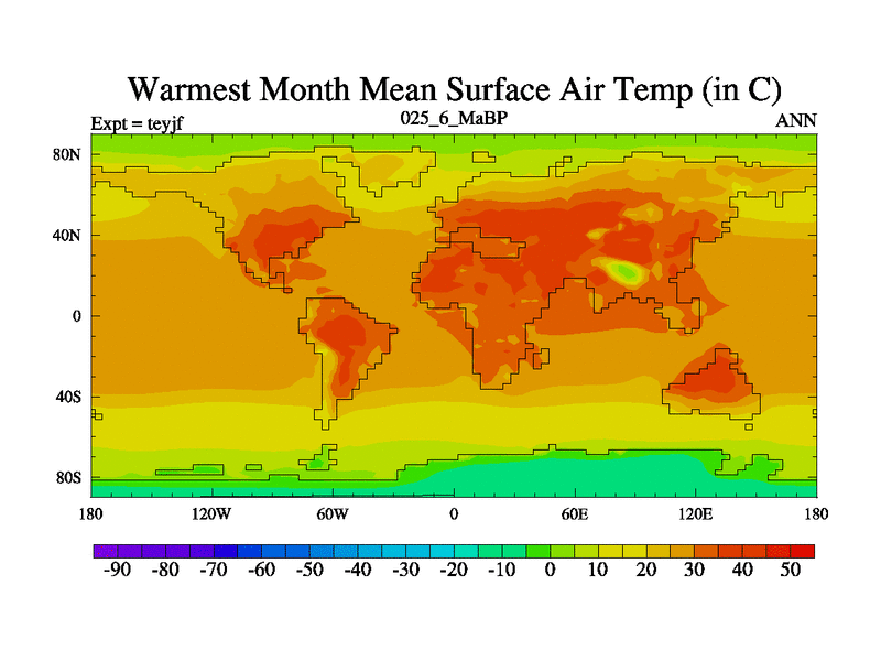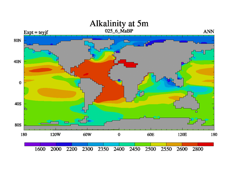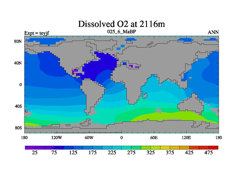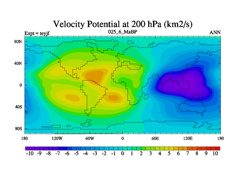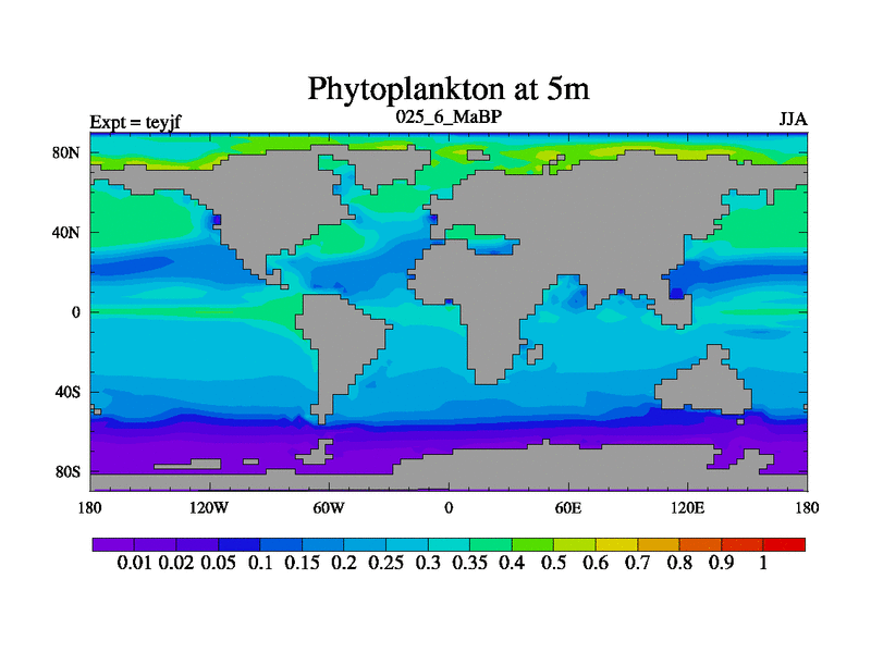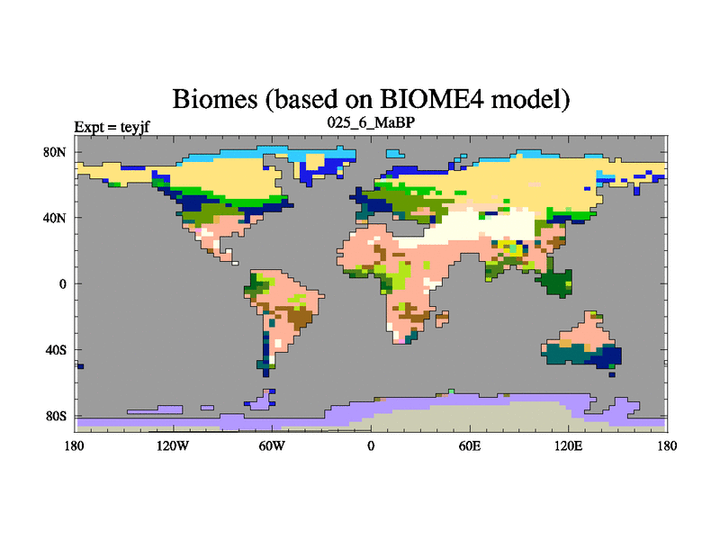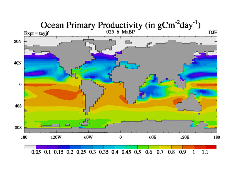This is the 25.6 Ma simulation using the Scotese palaeogeographies and revised CCN etc. As teyfa3 but corrected orography problem over Antartartica. Now includes ocean biogeochemistry