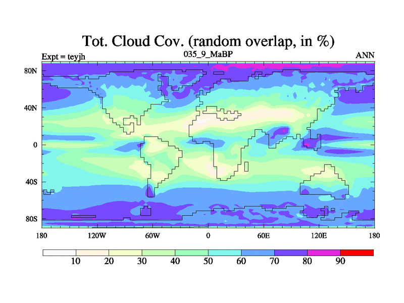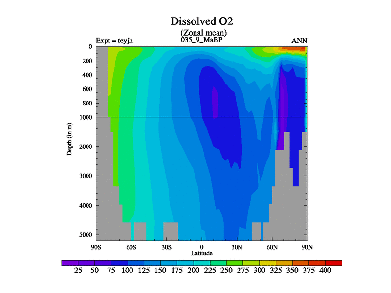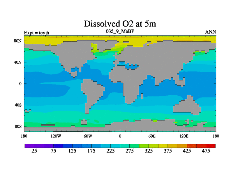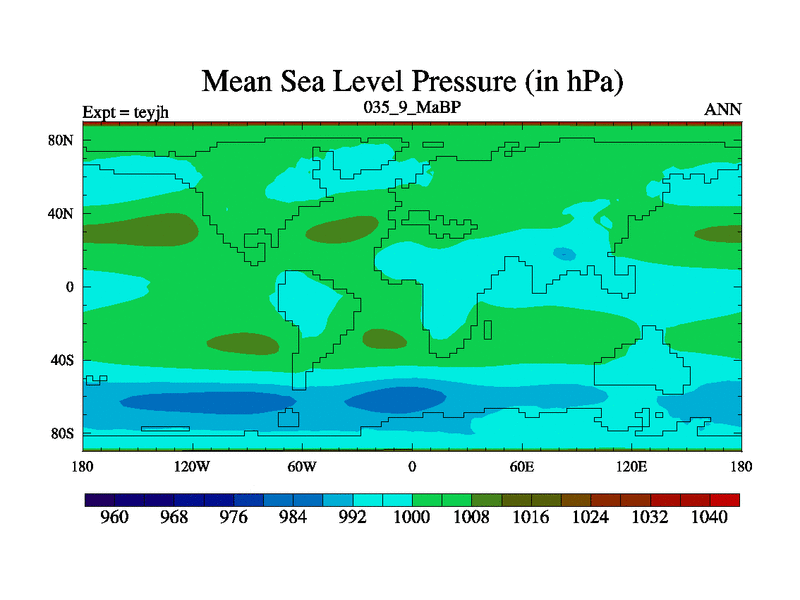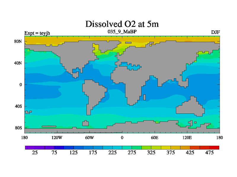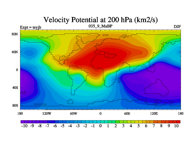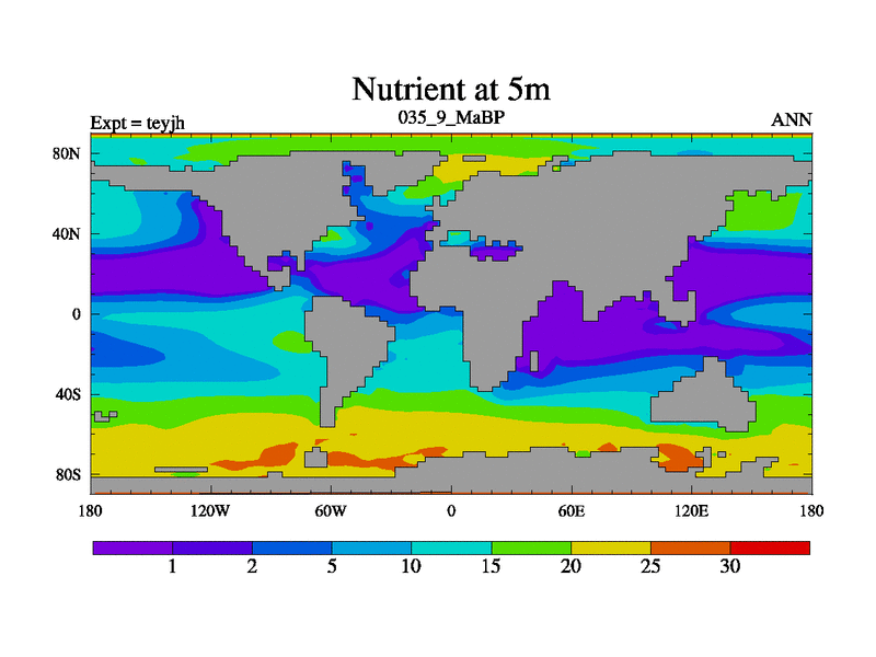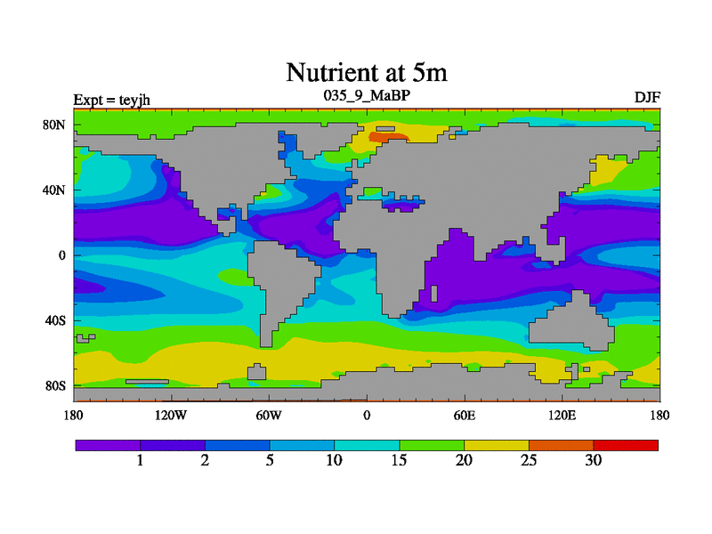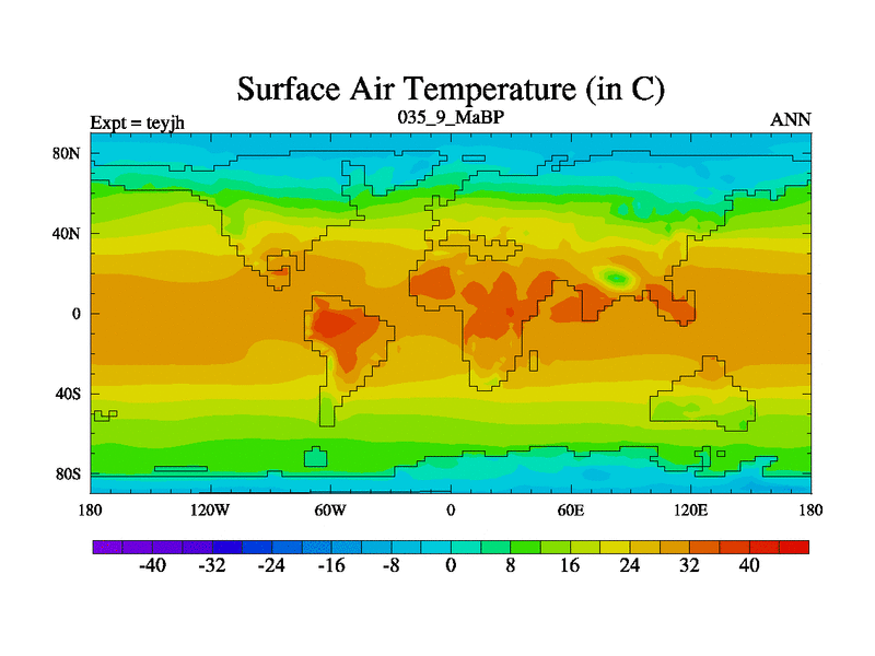This is the 35.9 Ma simulation using the Scotese palaeogeographies and revised CCN etc. As teyfa3 but corrected orography problem over Antartartica. Now includes ocean biogeochemistry