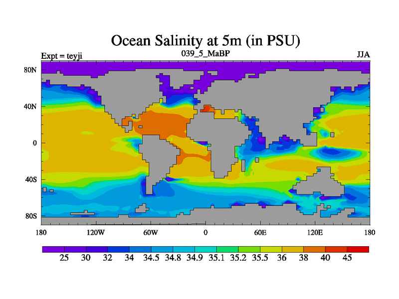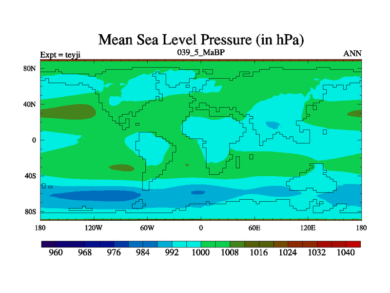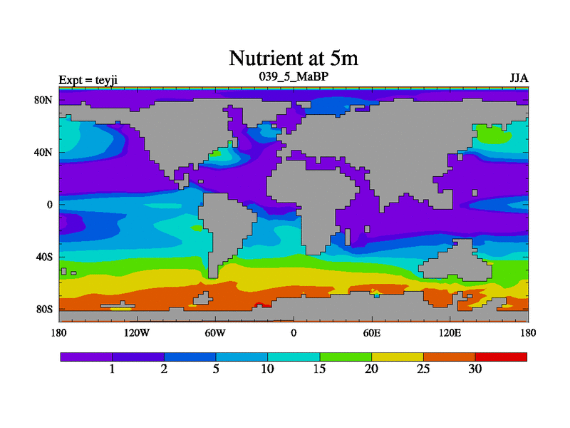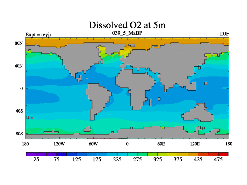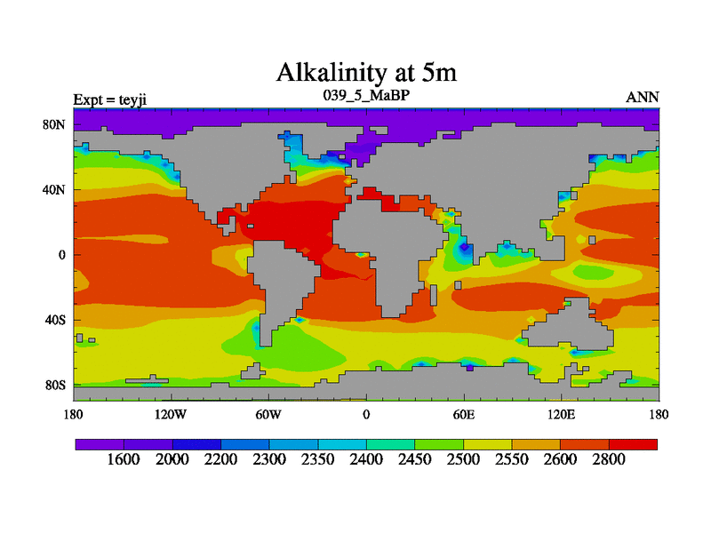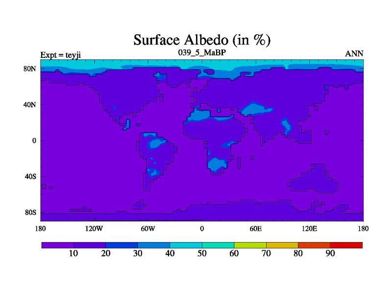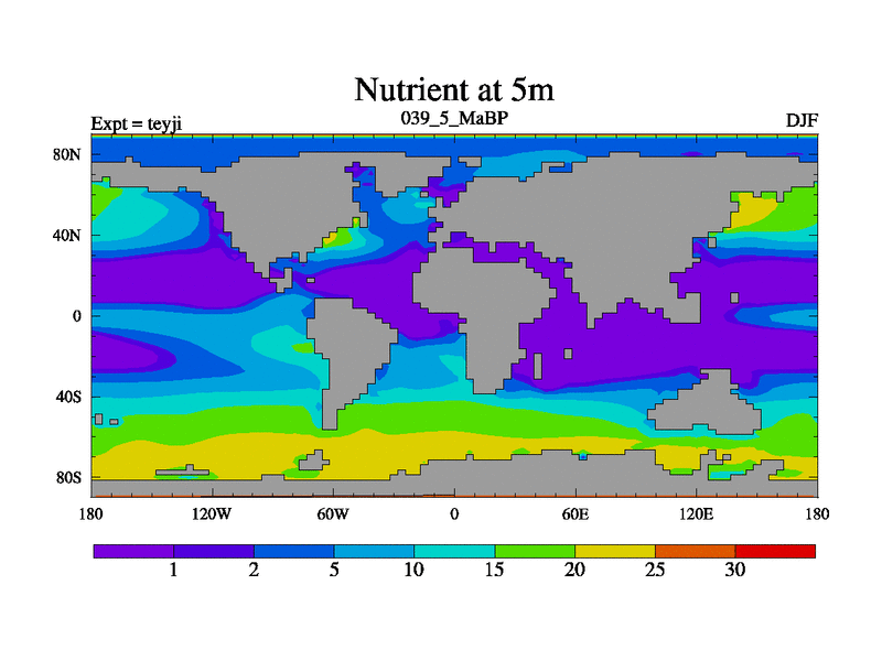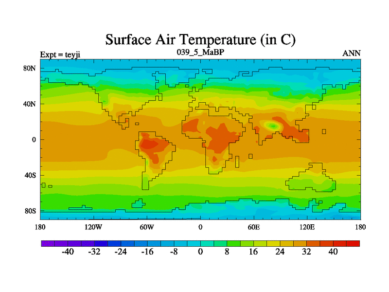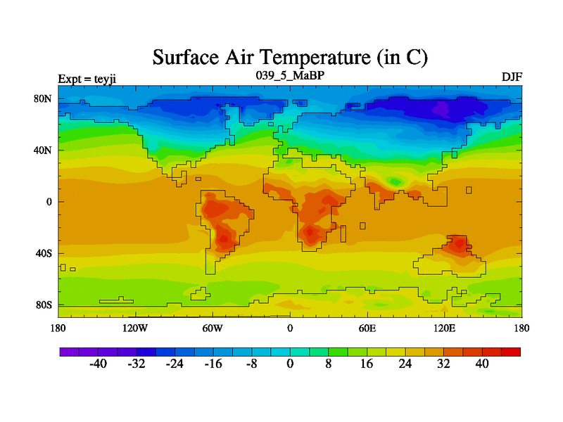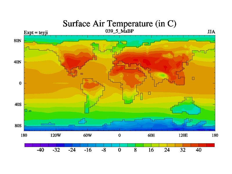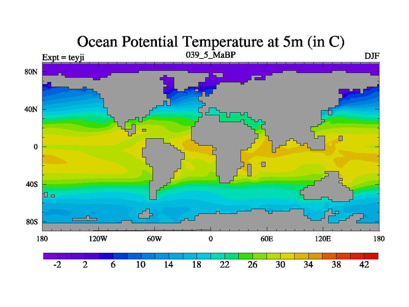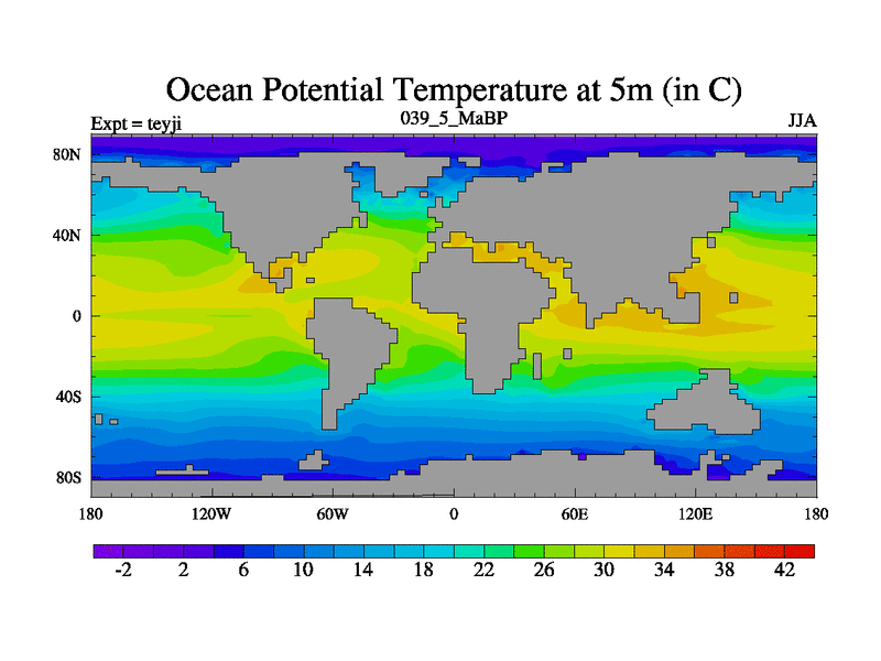 This is the 39.5 Ma simulation using the Scotese palaeogeographies and revised CCN etc. As teyfa3 but corrected orography problem over Antartartica. Now includes ocean biogeochemistry