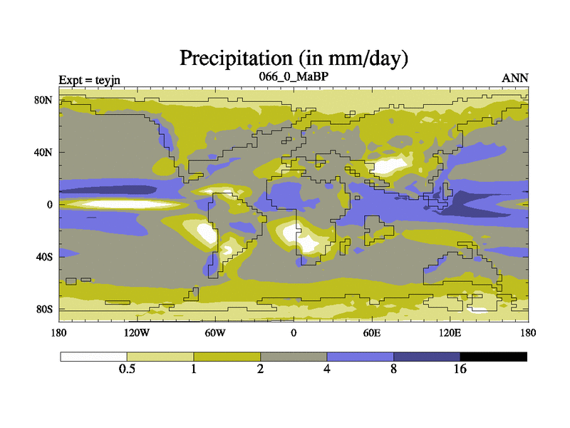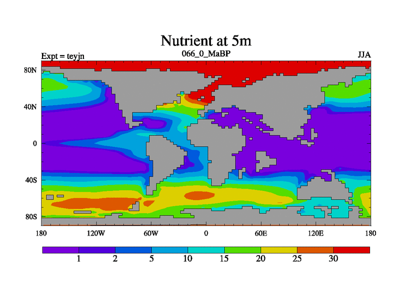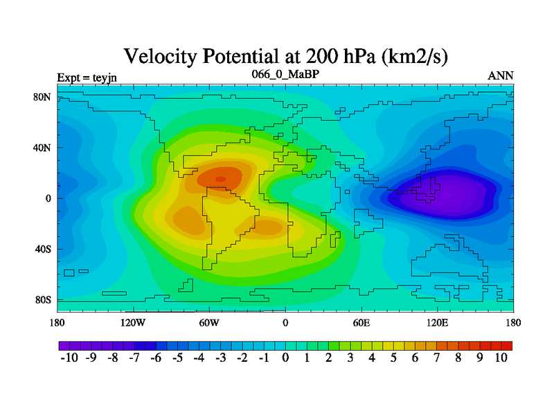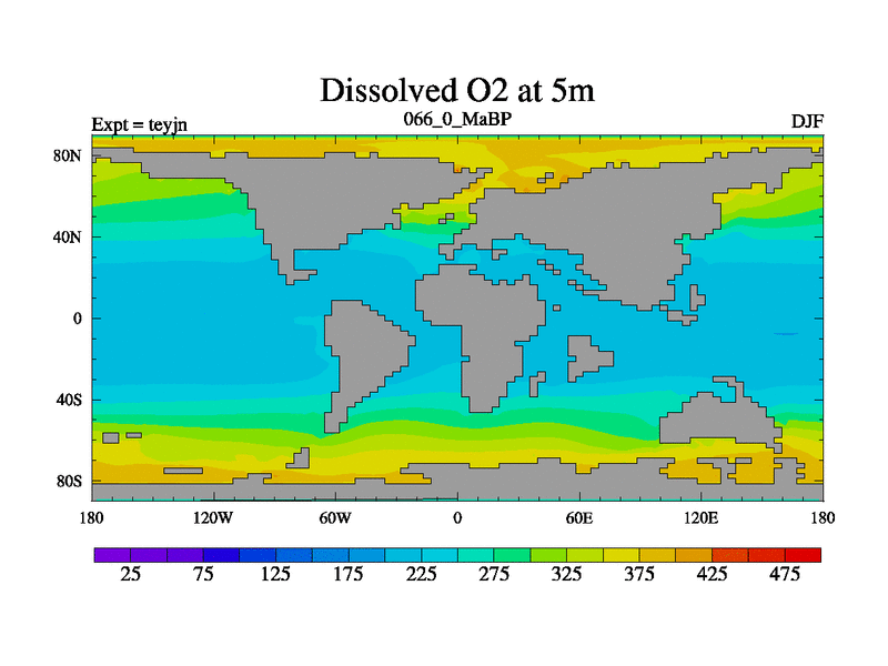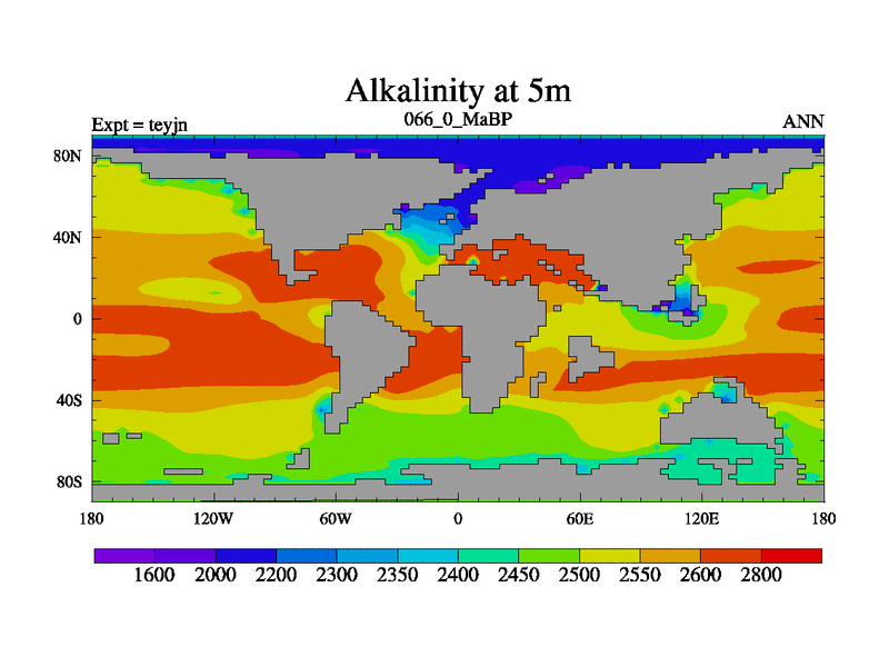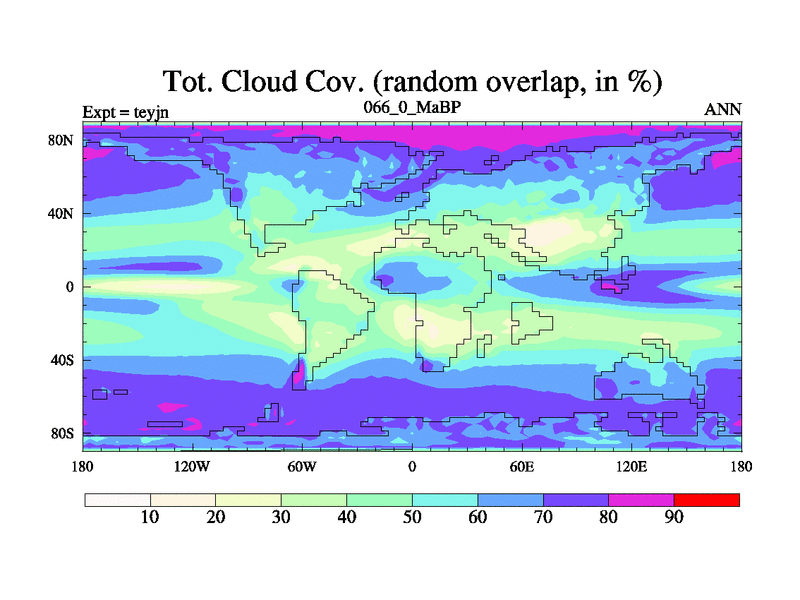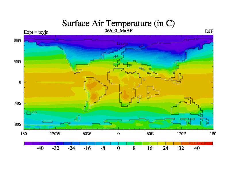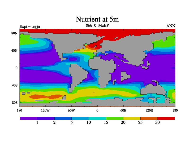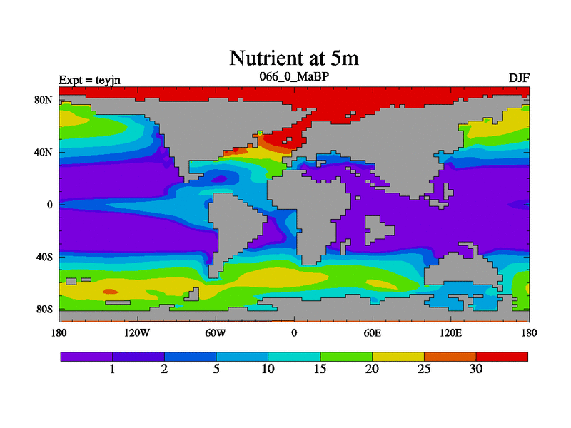 This is the 66.0 Ma simulation using the Scotese palaeogeographies and revised CCN etc. As teyfa3 but corrected orography problem over Antartartica. Now includes ocean biogeochemistry