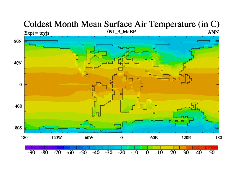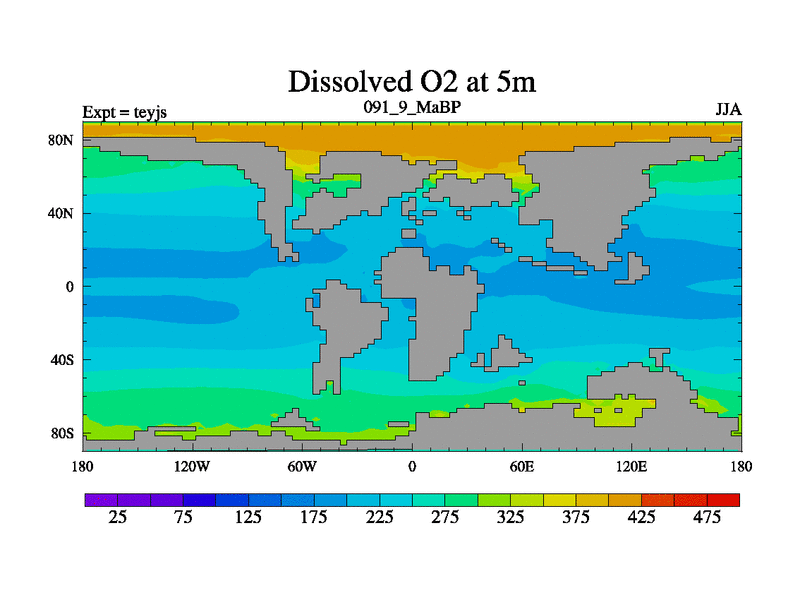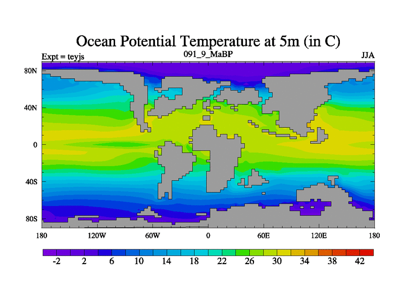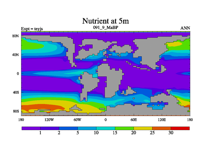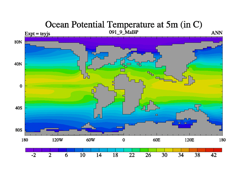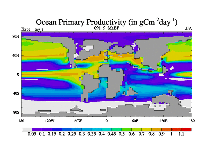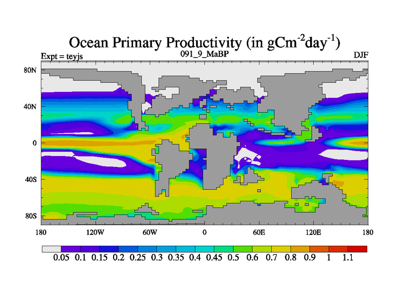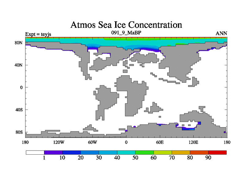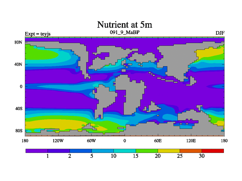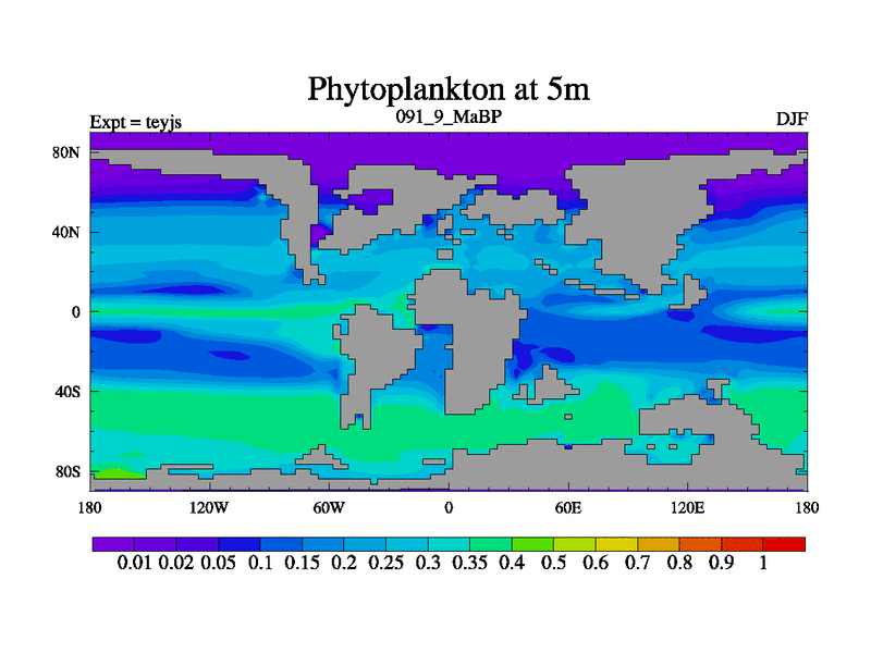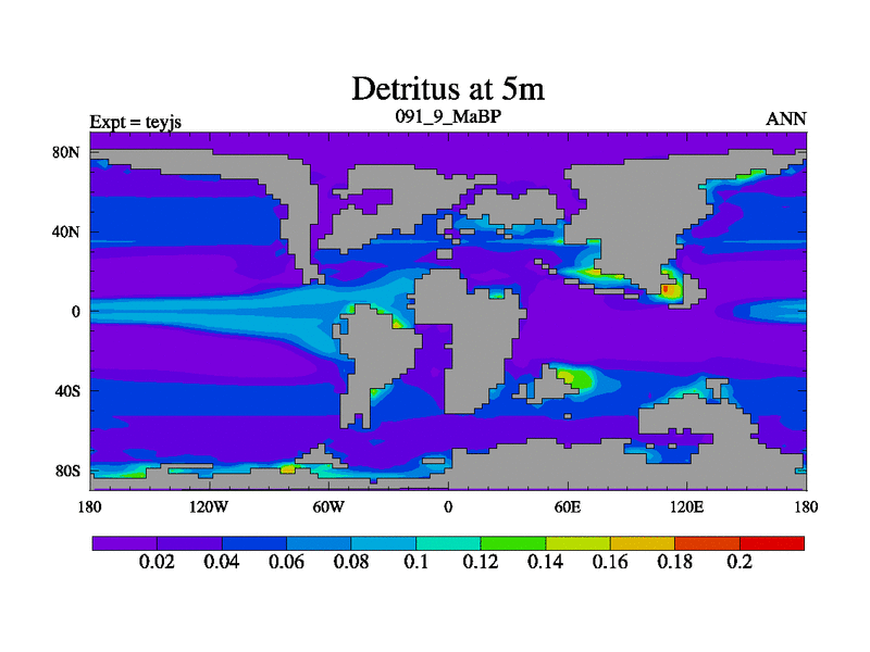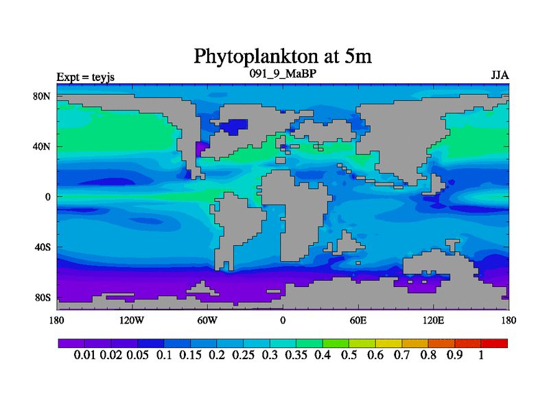 This is the 91.9 Ma simulation using the Scotese palaeogeographies and revised CCN etc. As teyfa3 but corrected orography problem over Antartartica. Now includes ocean biogeochemistry