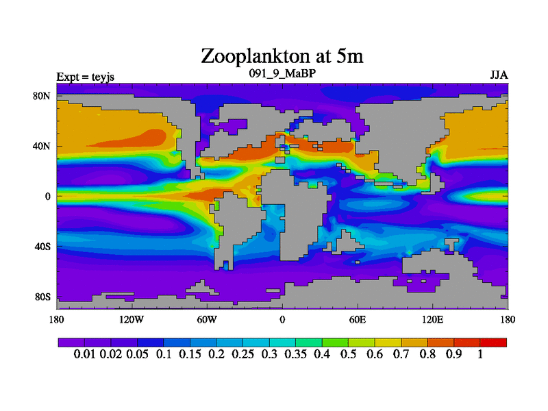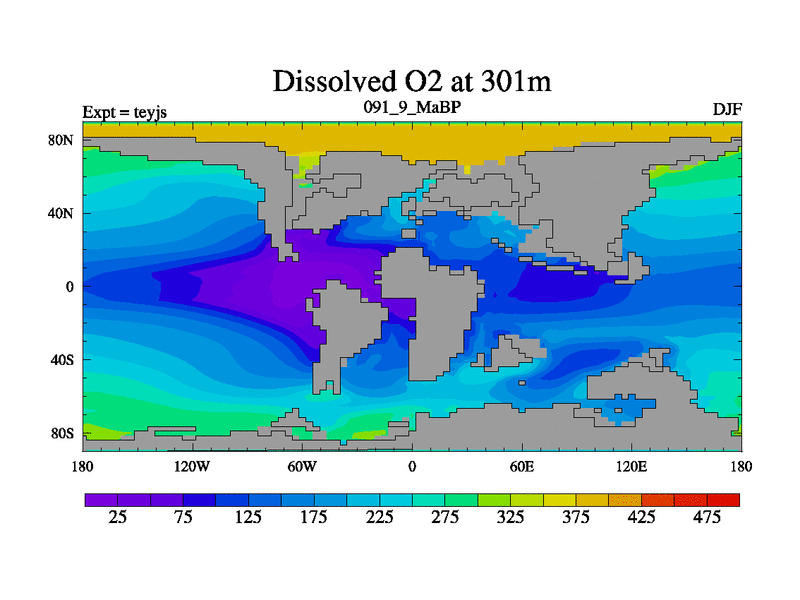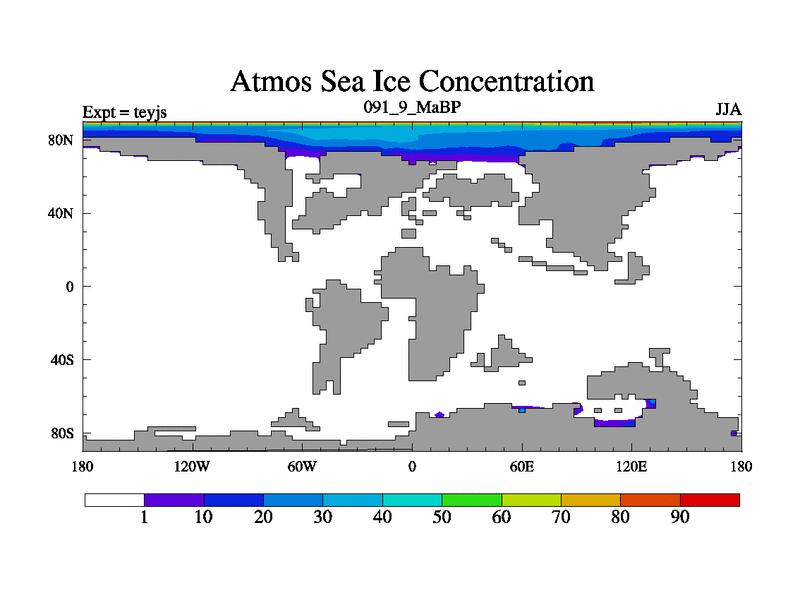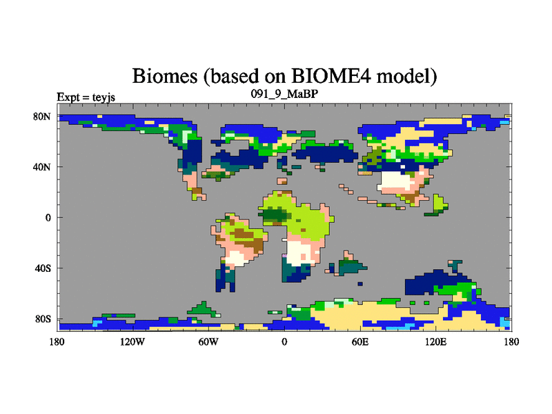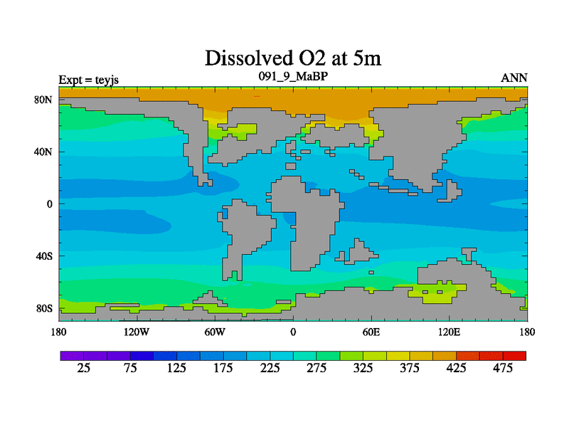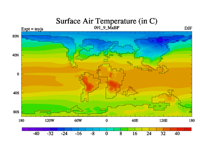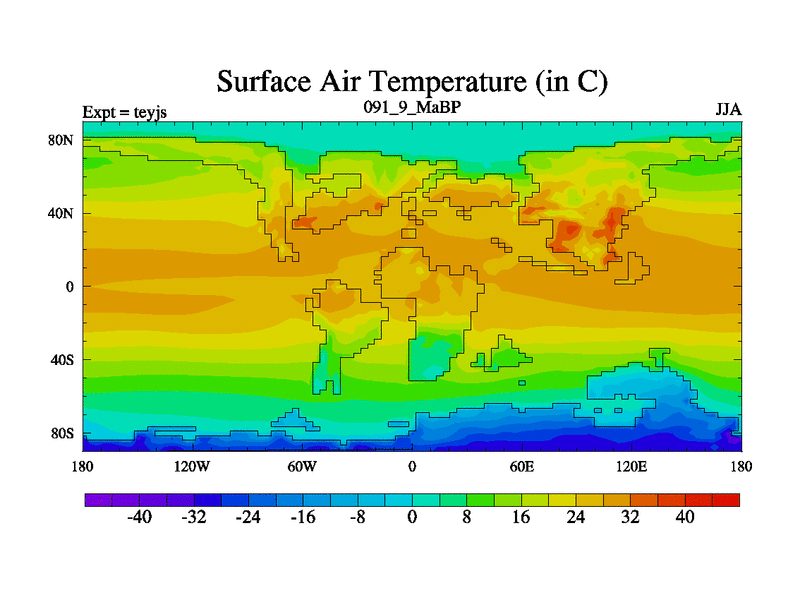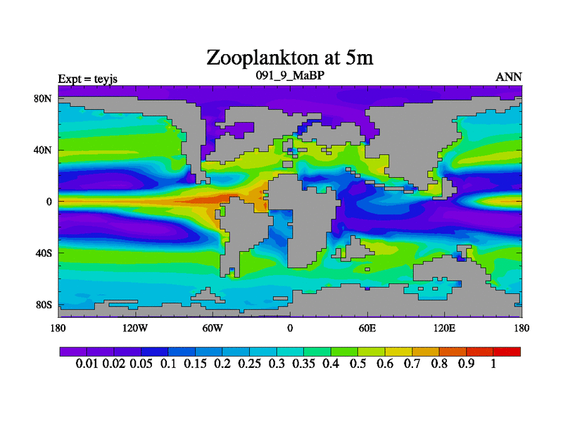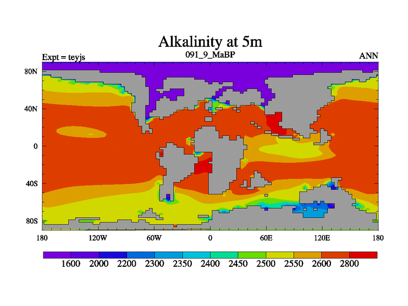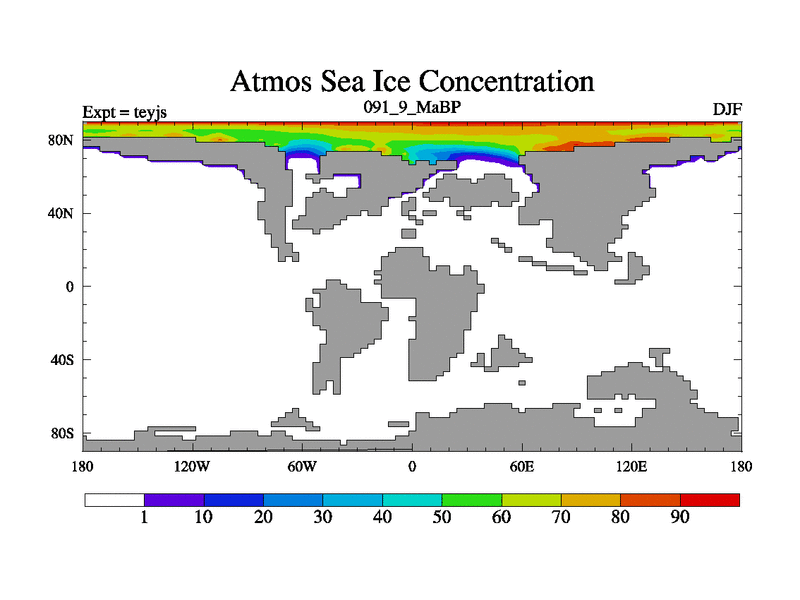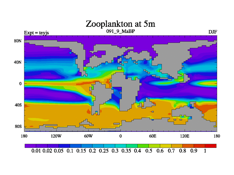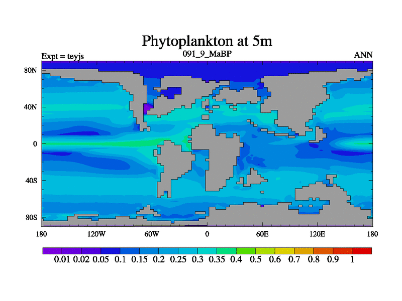 This is the 91.9 Ma simulation using the Scotese palaeogeographies and revised CCN etc. As teyfa3 but corrected orography problem over Antartartica. Now includes ocean biogeochemistry