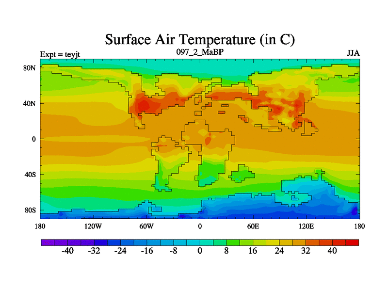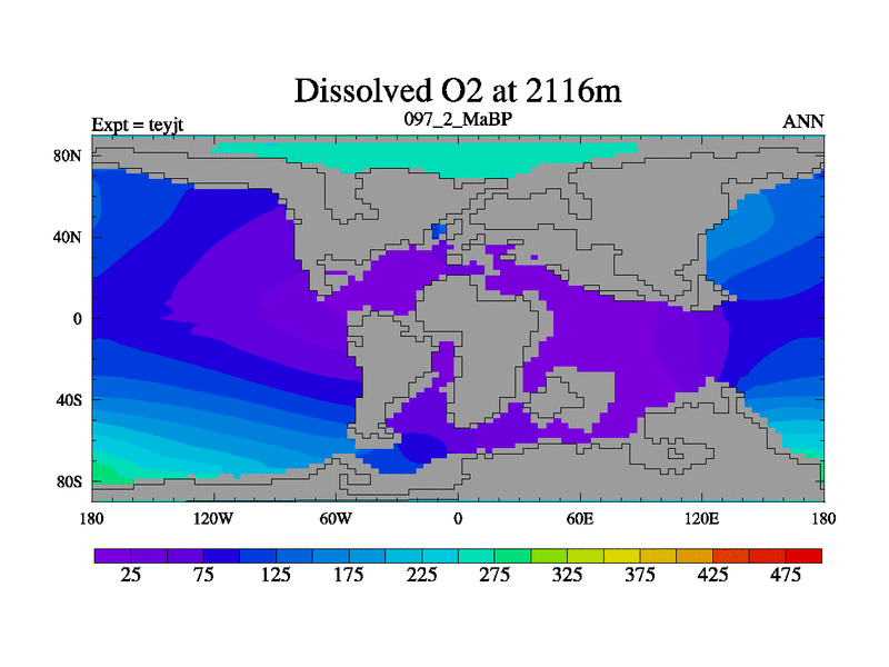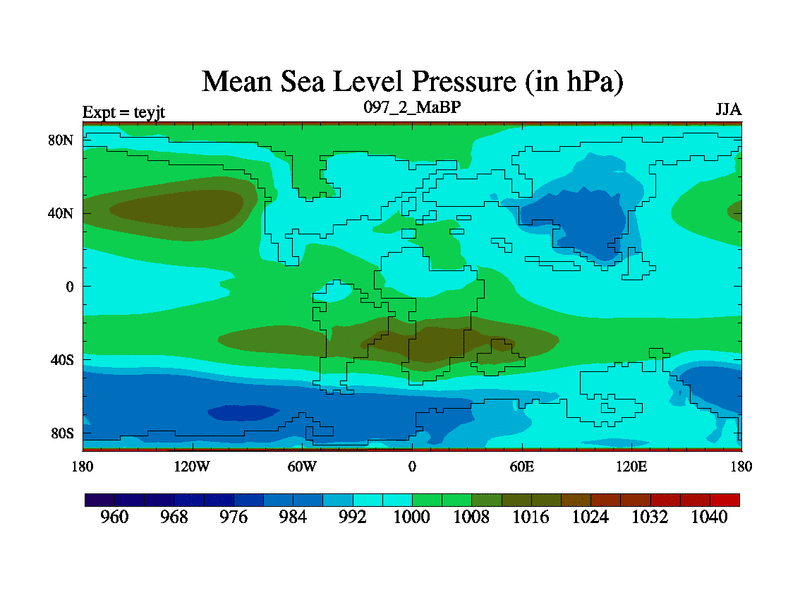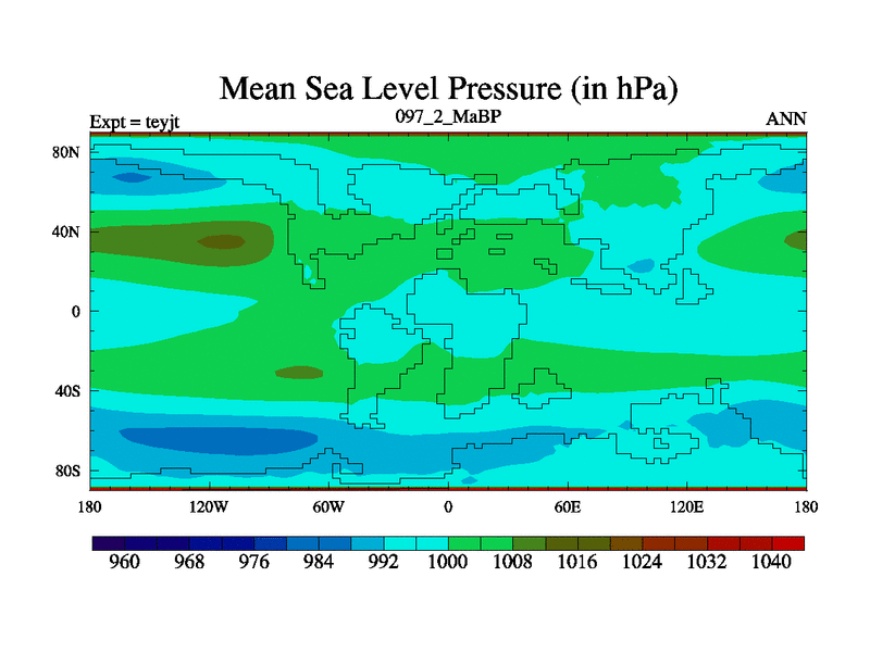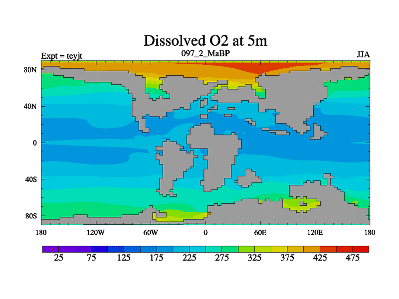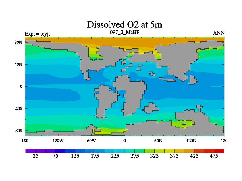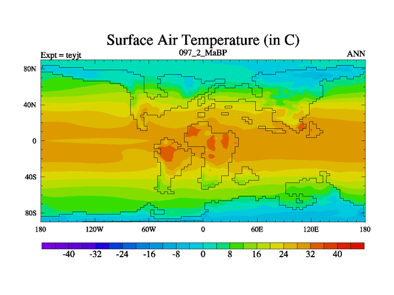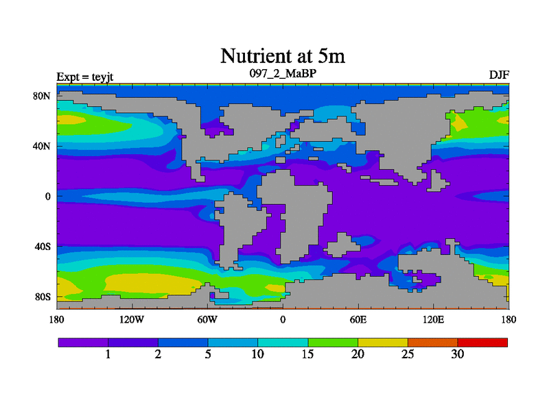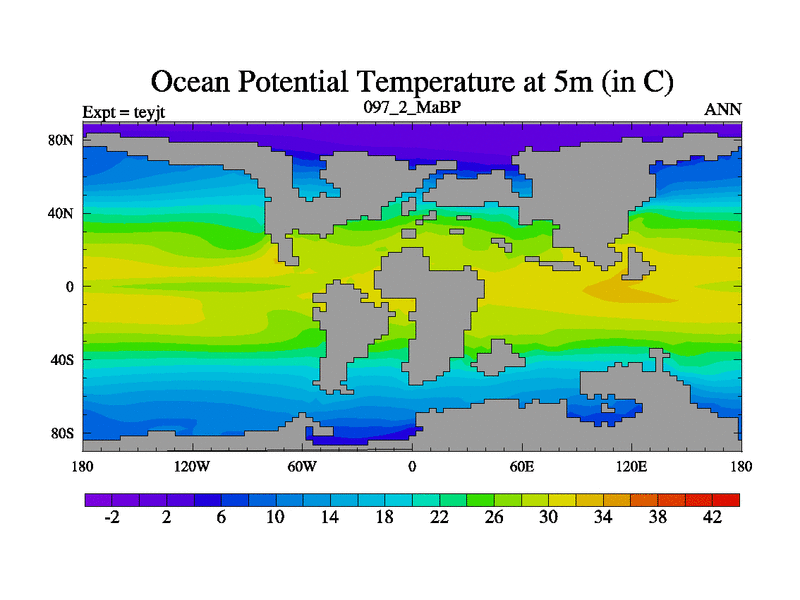 This is the 97.2 Ma simulation using the Scotese palaeogeographies and revised CCN etc. As teyfa3 but corrected orography problem over Antartartica. Now includes ocean biogeochemistry