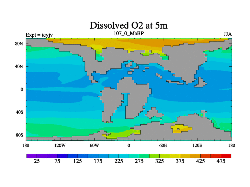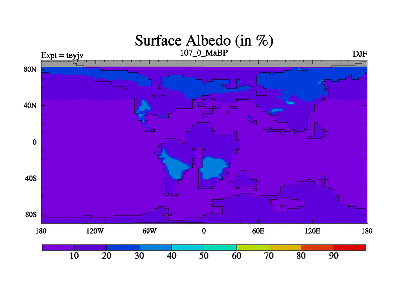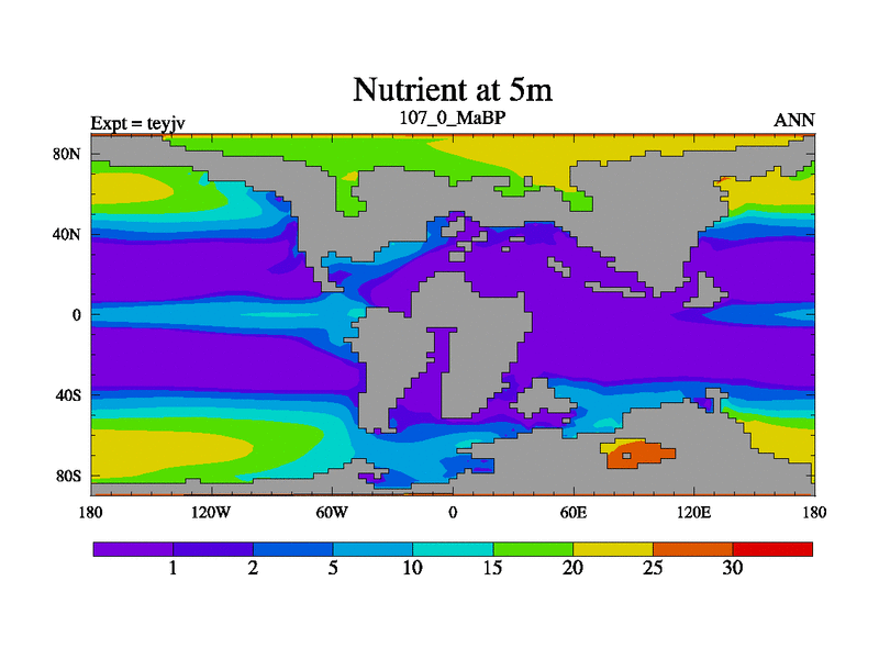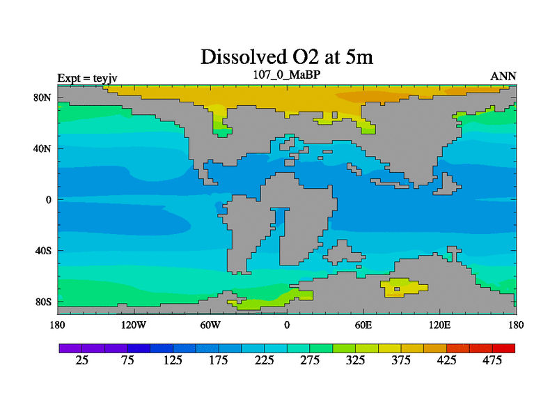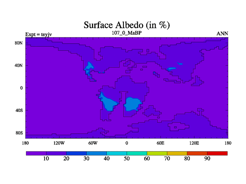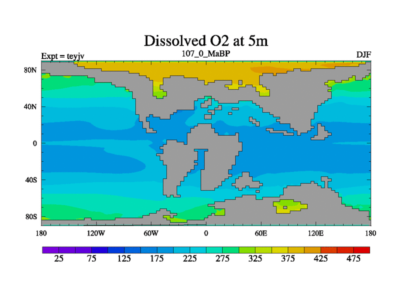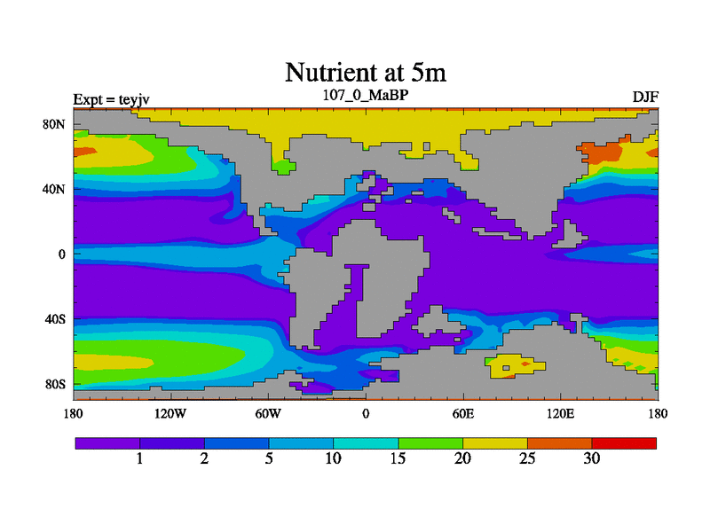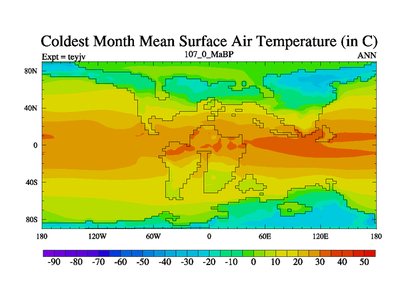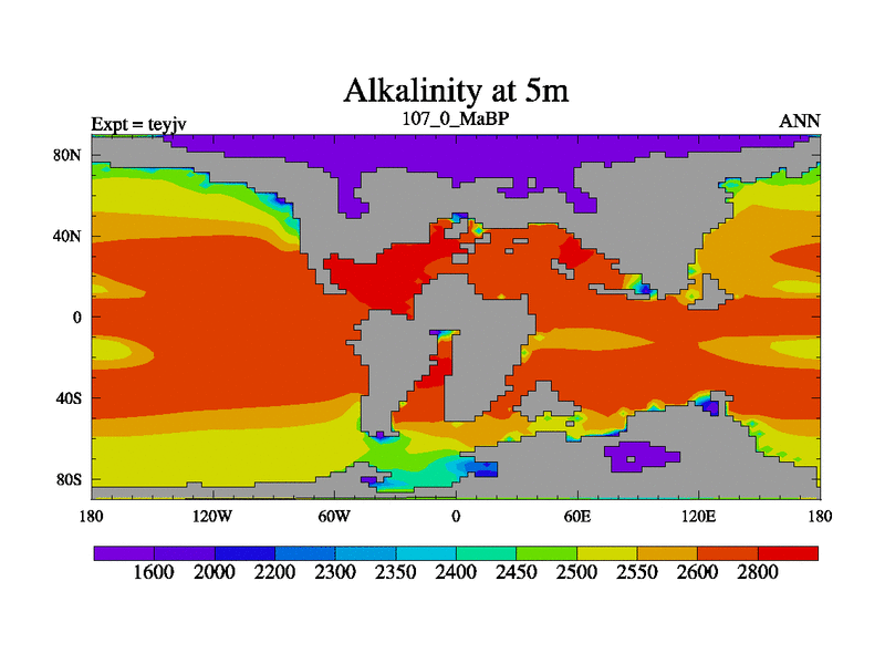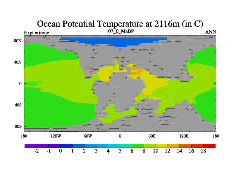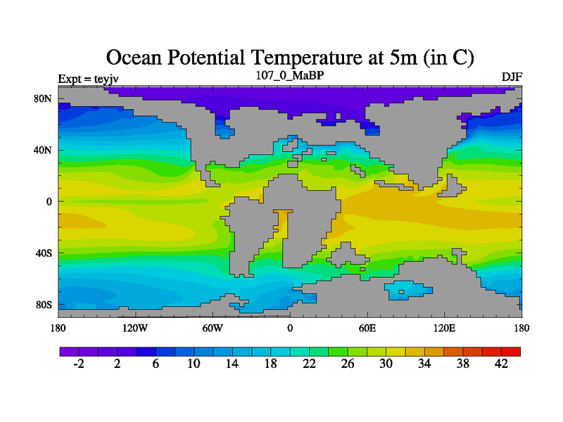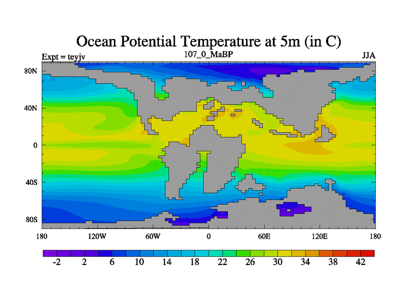This is the 107.0 Ma simulation using the Scotese palaeogeographies and revised CCN etc. As teyfa3 but corrected orography problem over Antartartica. Now includes ocean biogeochemistry