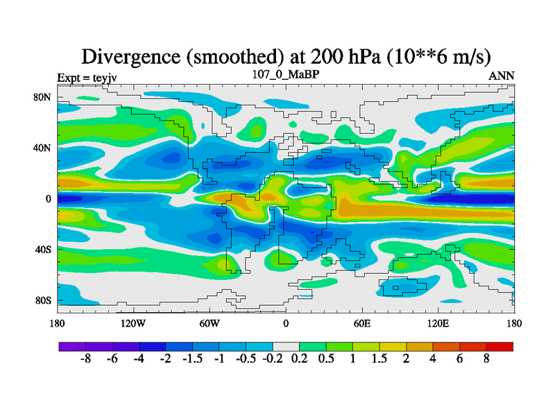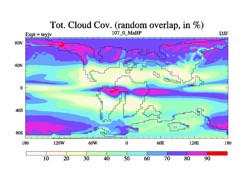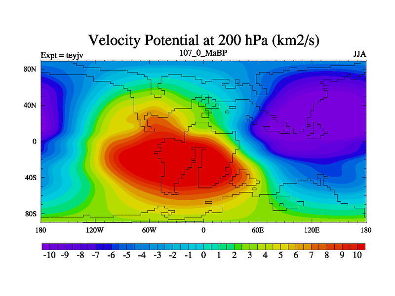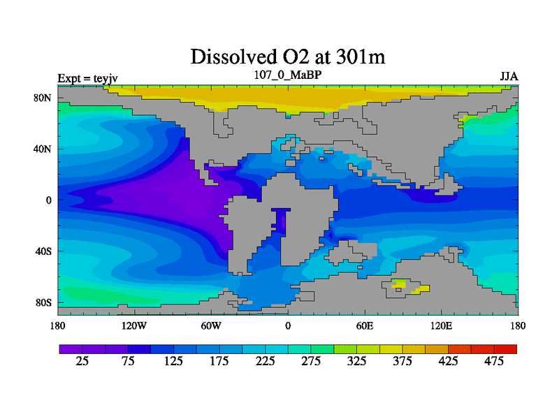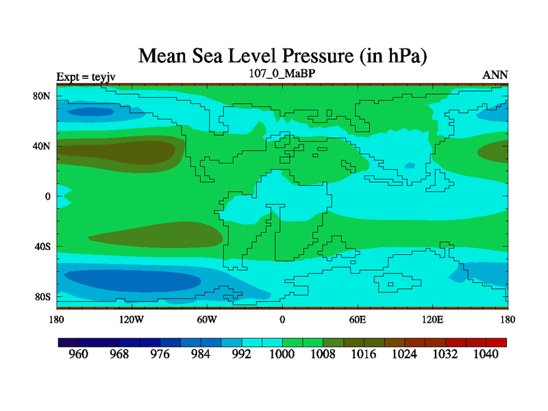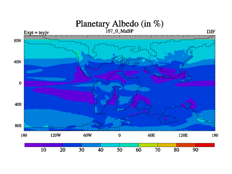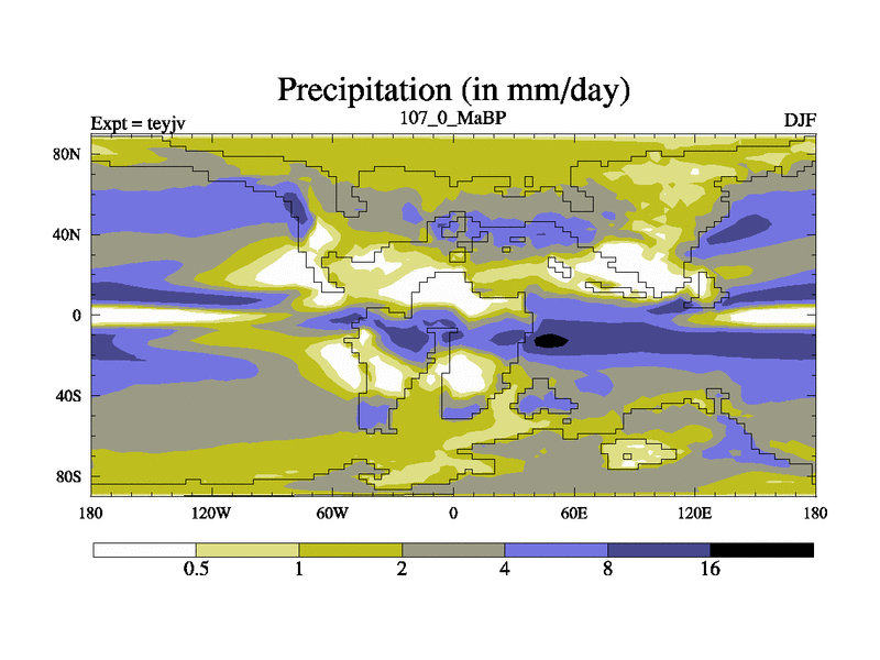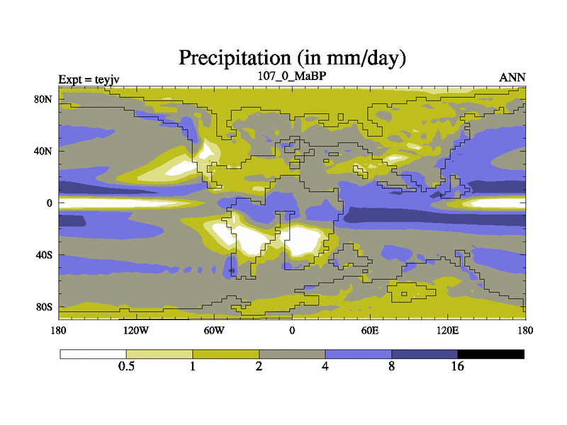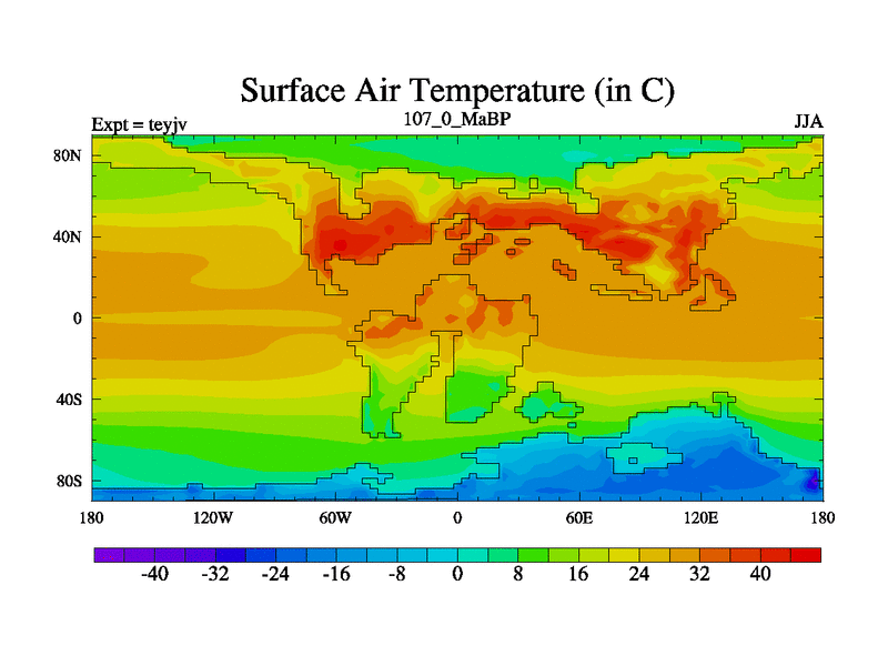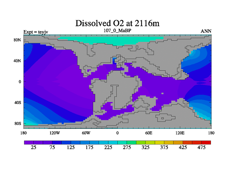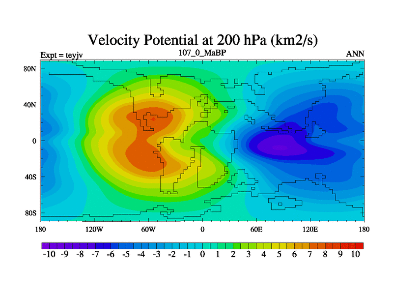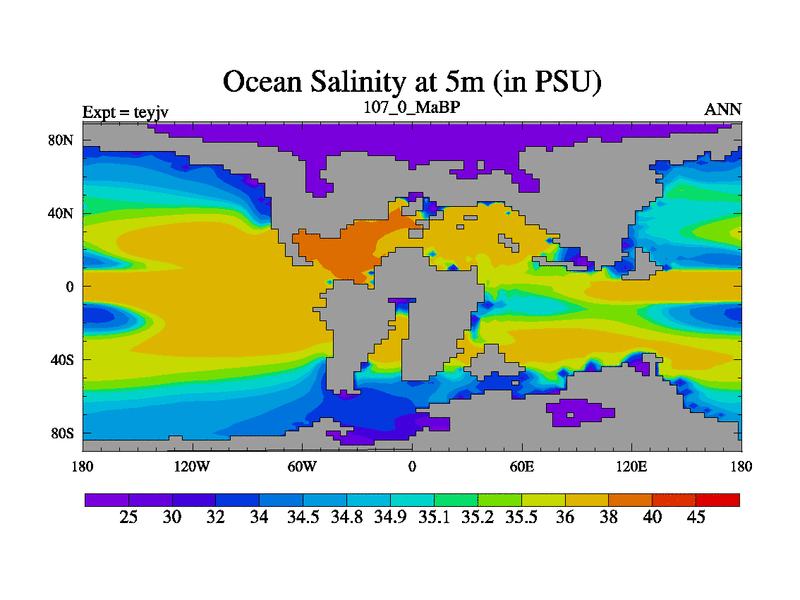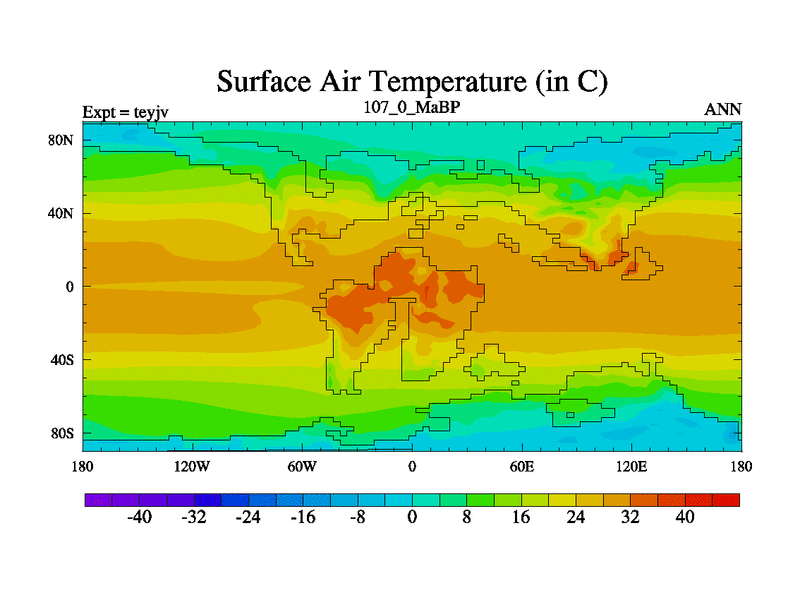 This is the 107.0 Ma simulation using the Scotese palaeogeographies and revised CCN etc. As teyfa3 but corrected orography problem over Antartartica. Now includes ocean biogeochemistry