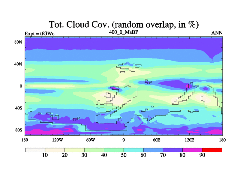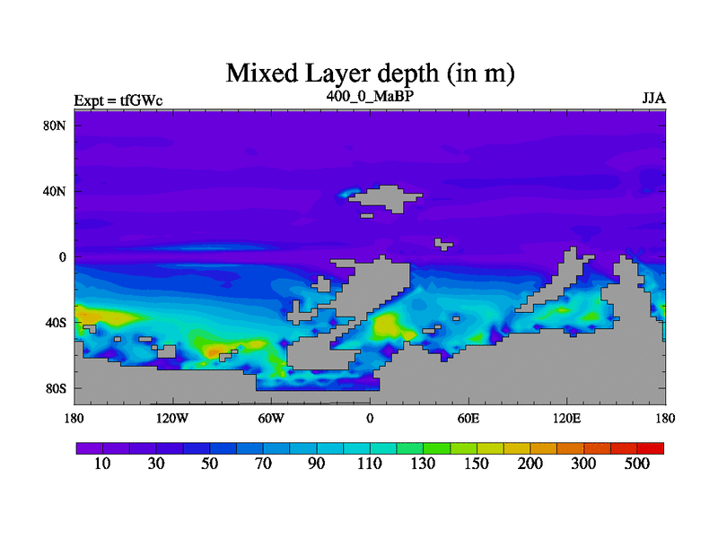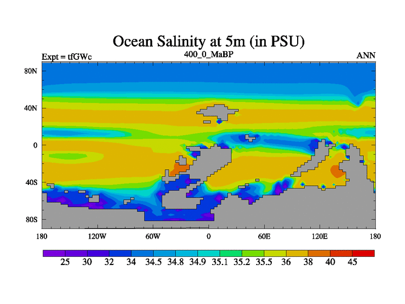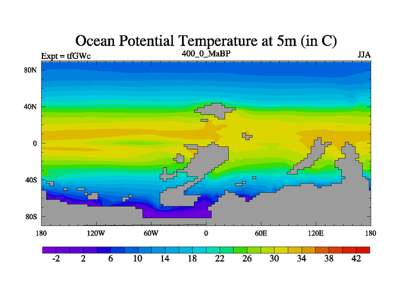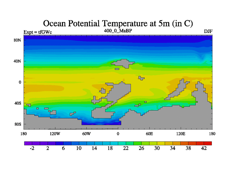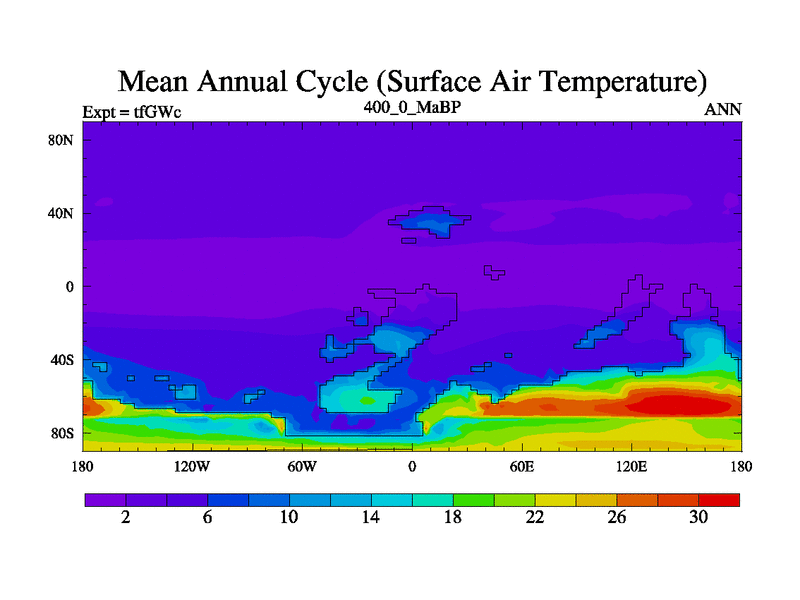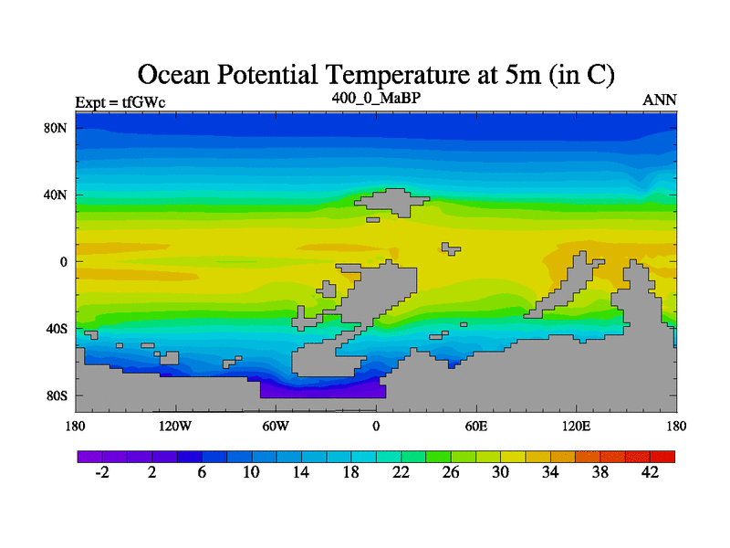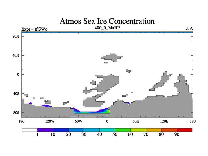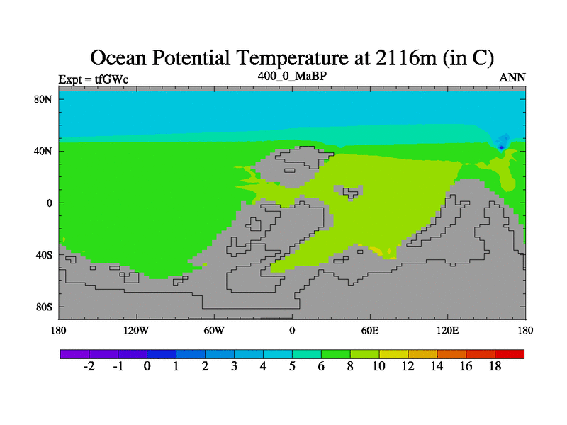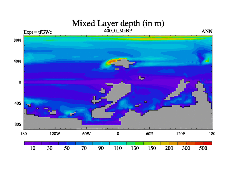 This is the 400.0 Ma simulation using the Scotese palaeogeographies and revised CCN etc. This version has islands included. Started from end of teYEc.