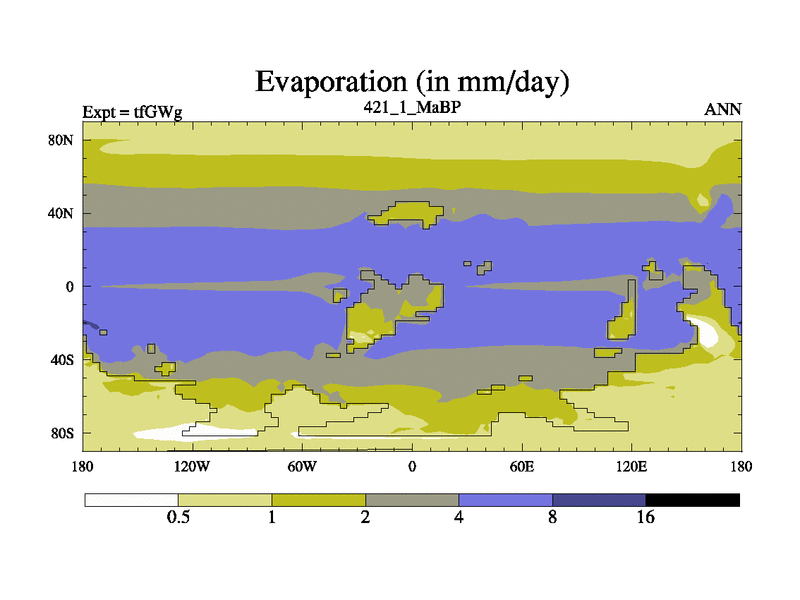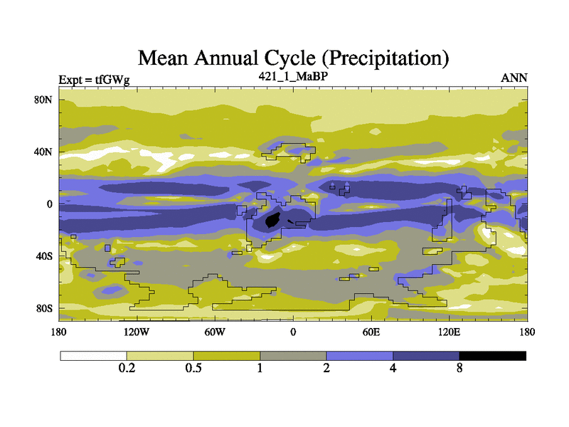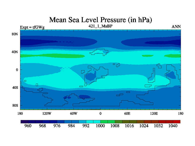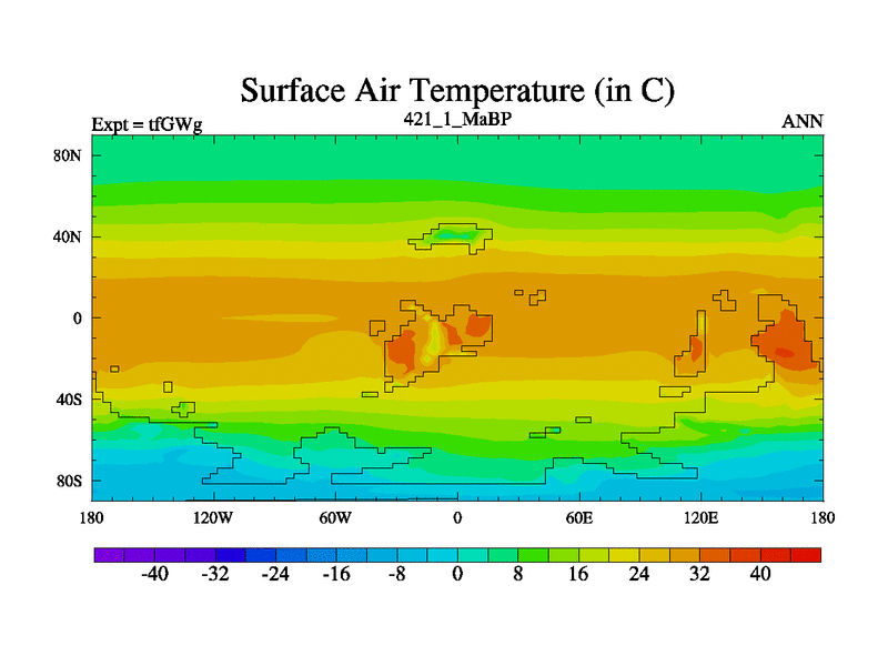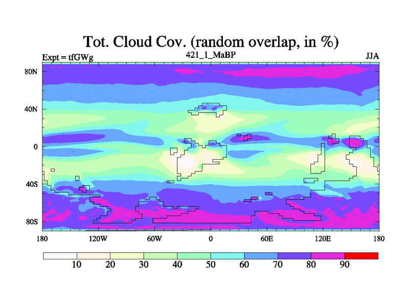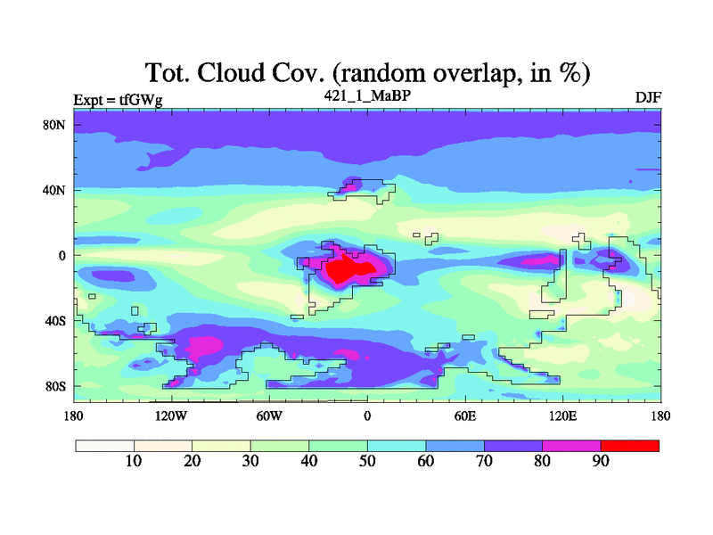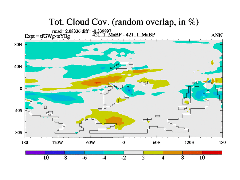 This is the 421.1 Ma simulation using the Scotese palaeogeographies and revised CCN etc. This version has islands included. Started from end of teYEg.