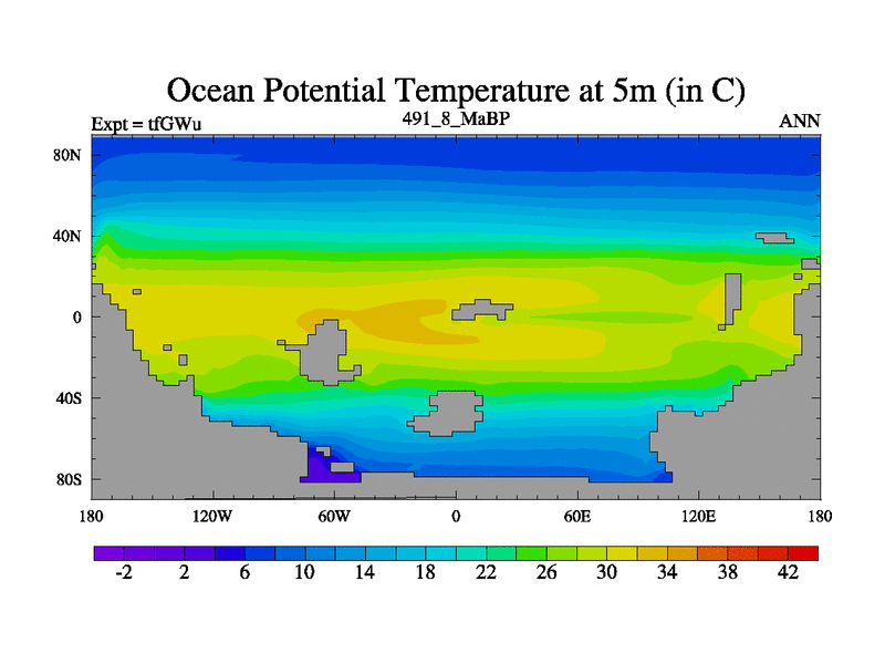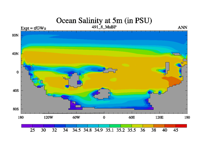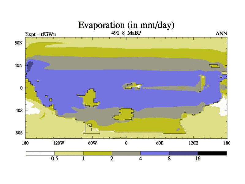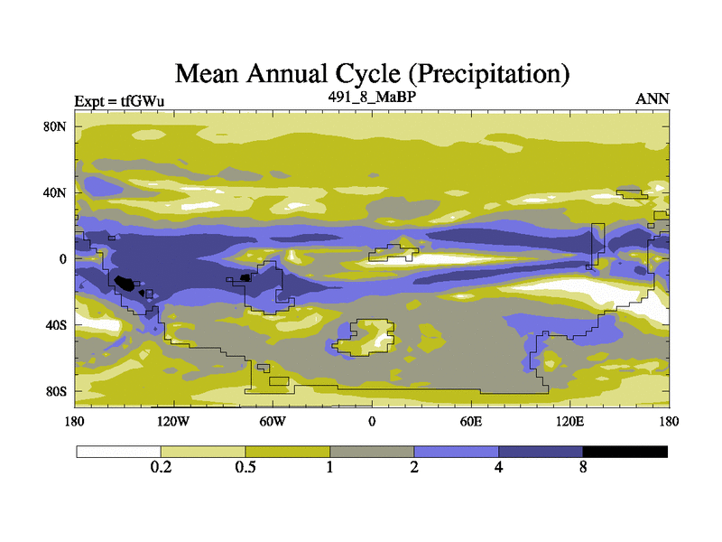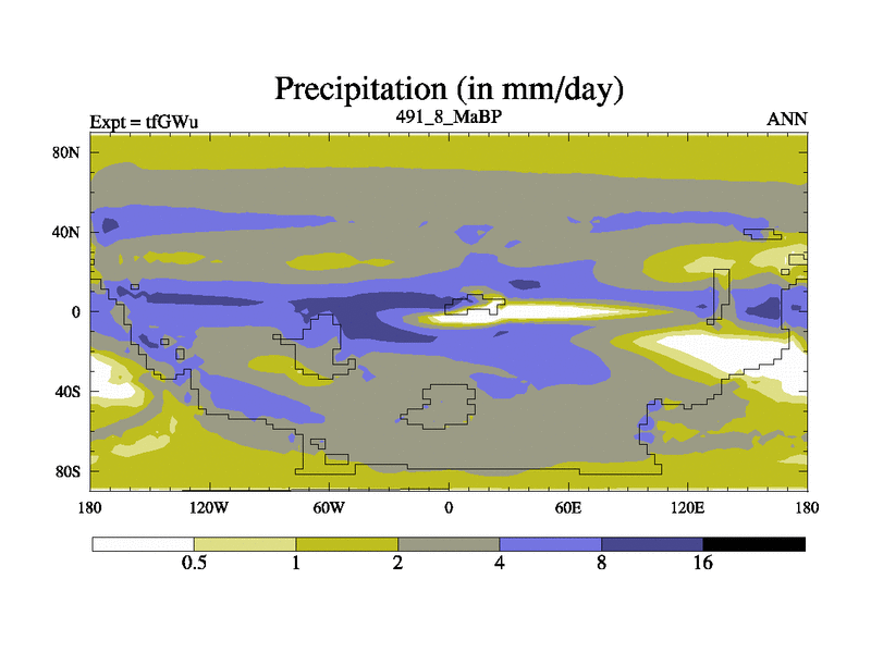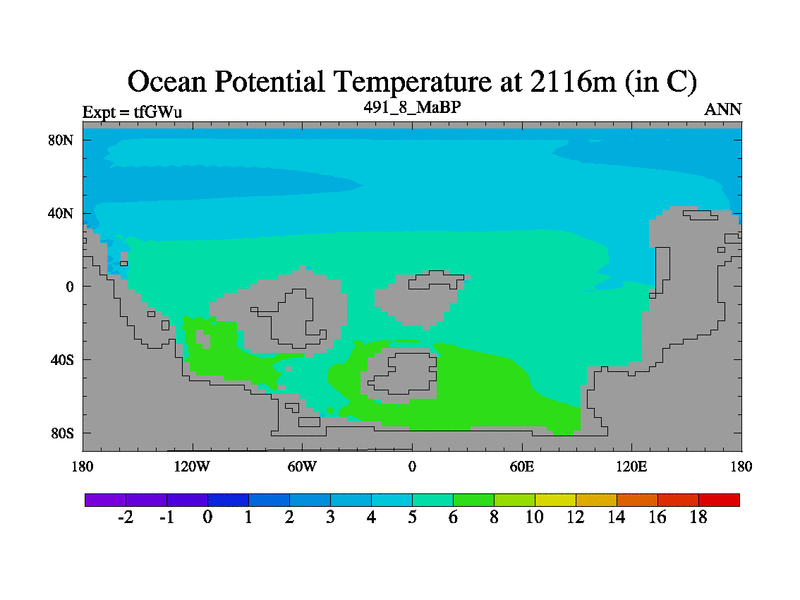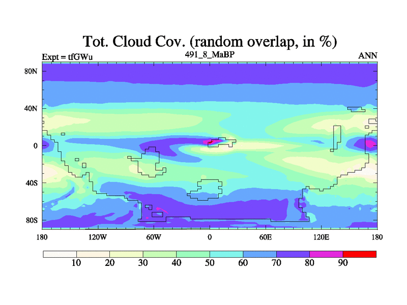 This is the 491.8 Ma simulation using the Scotese palaeogeographies and revised CCN etc. This version has islands included. Started from end of teYEu.
