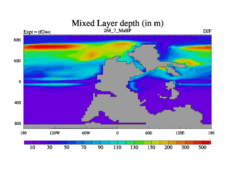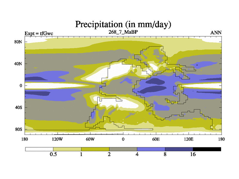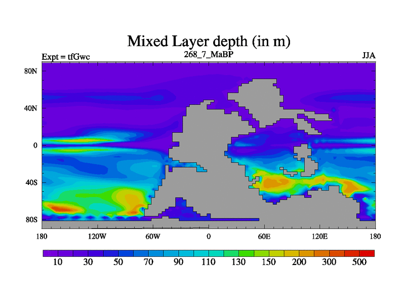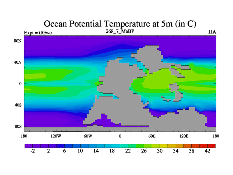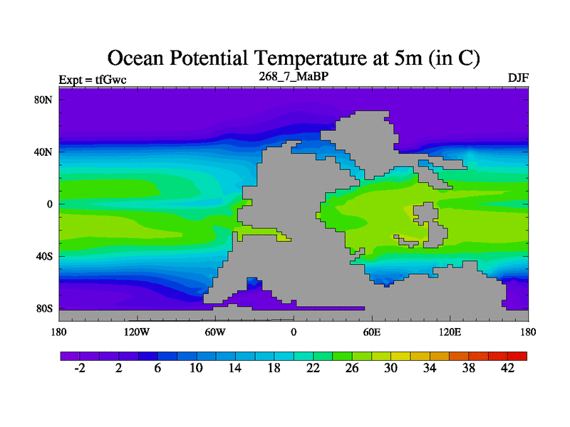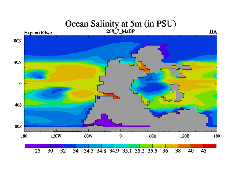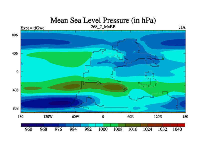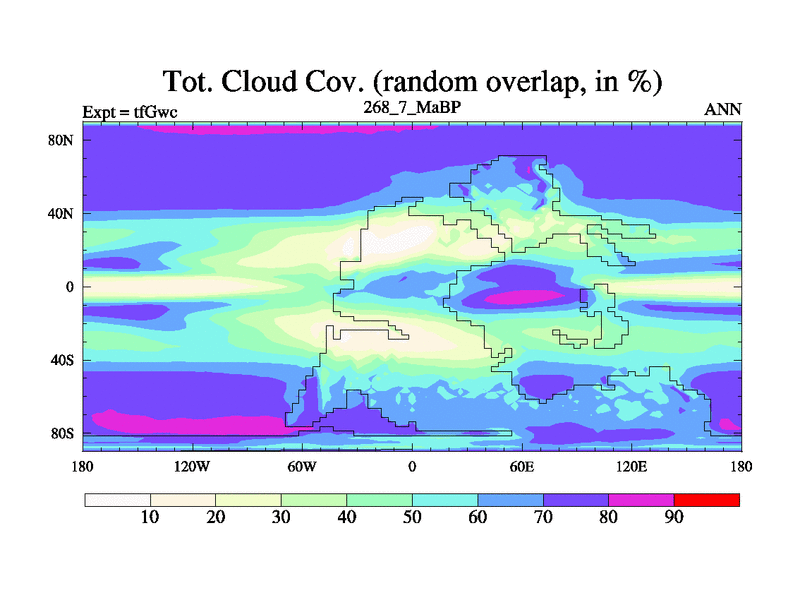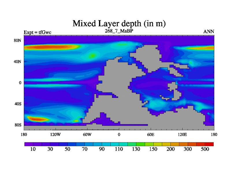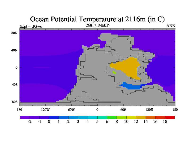 This is the 268.7 Ma simulation using the Scotese palaeogeographies and revised CCN etc. This version has islands included. Started from end of teYec.