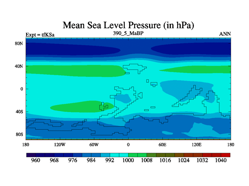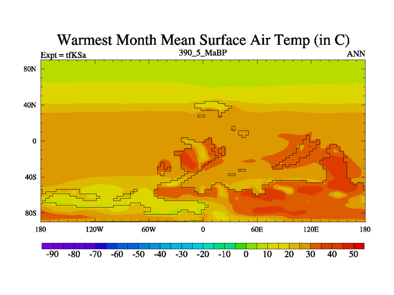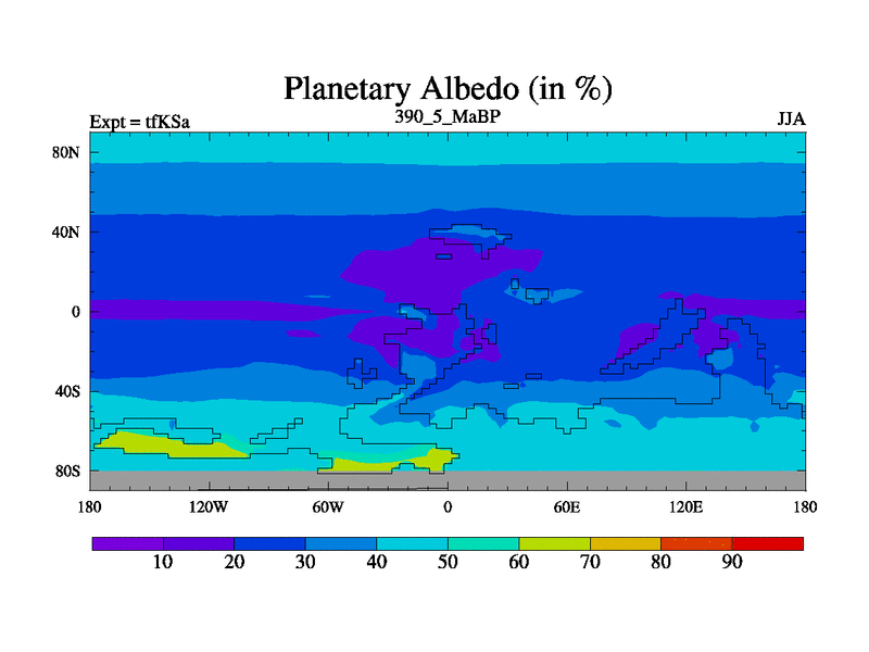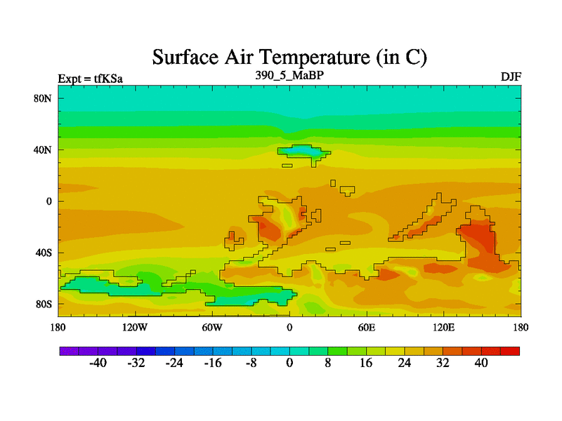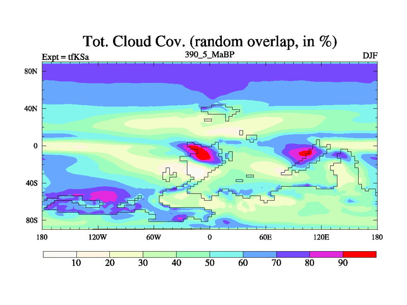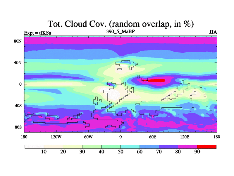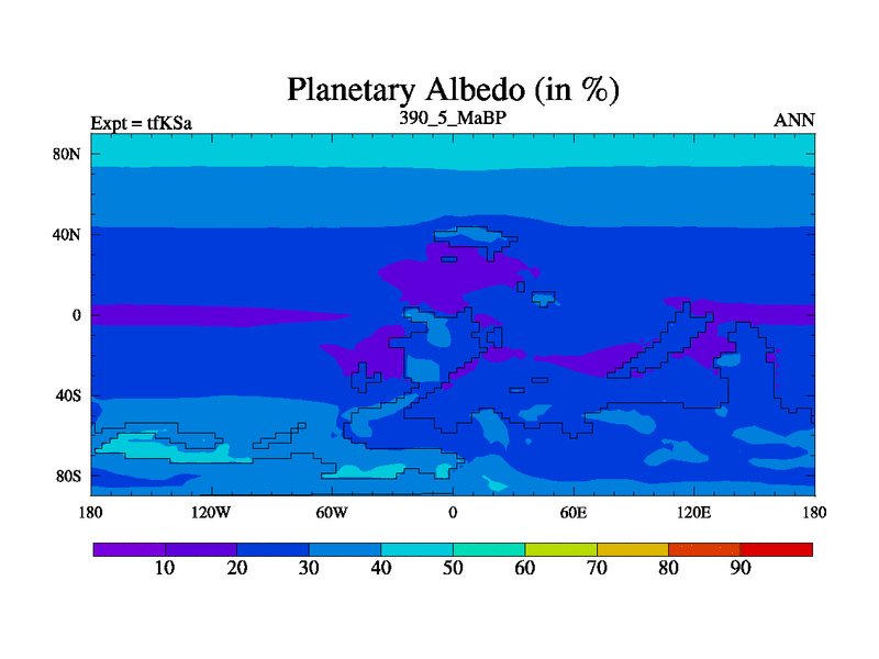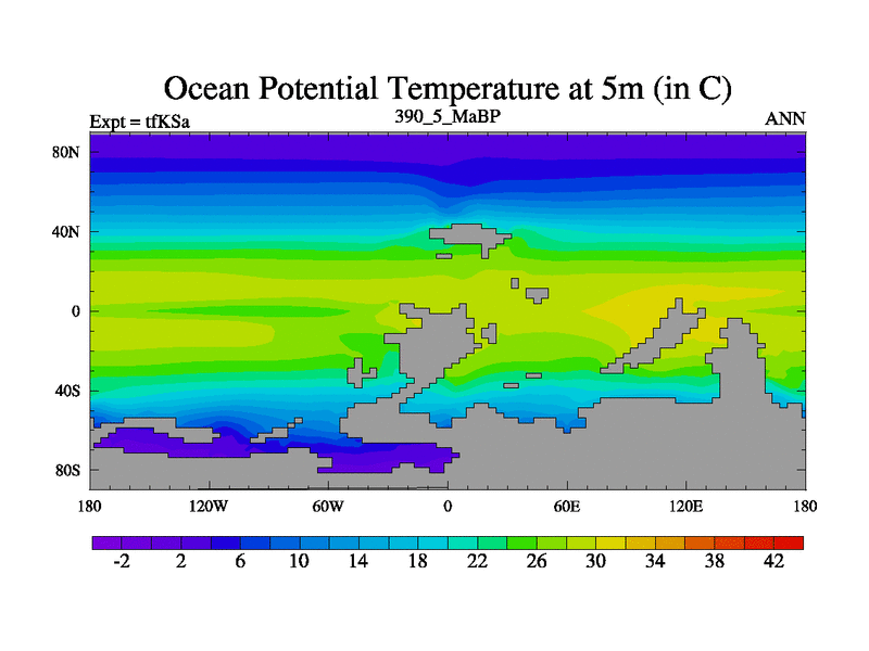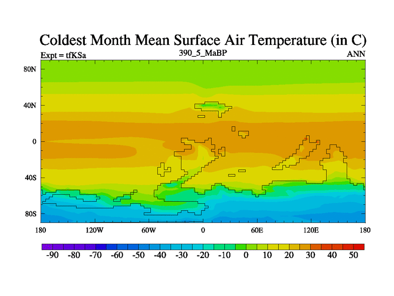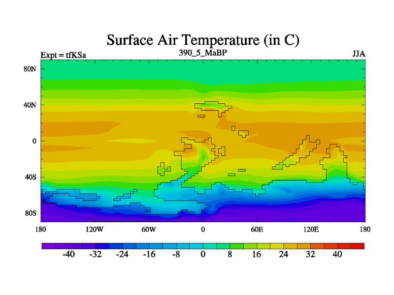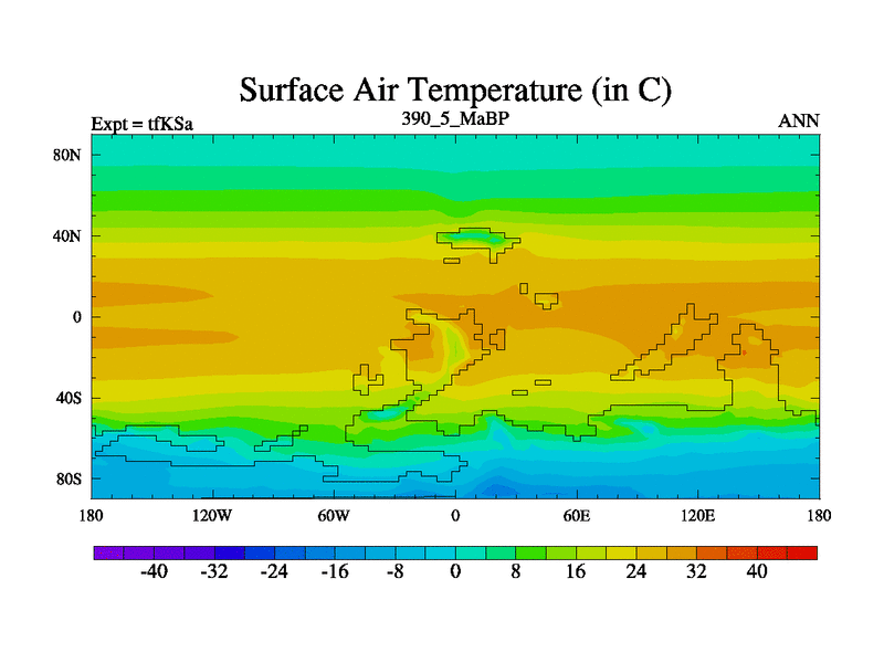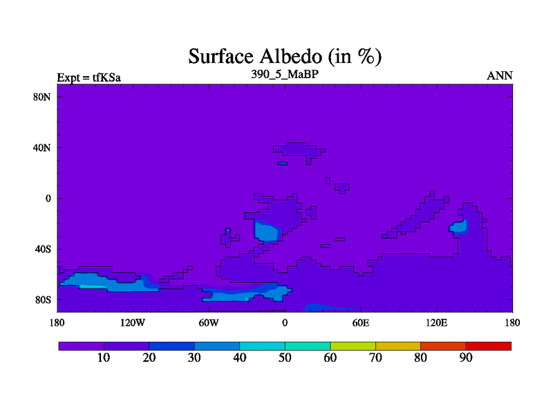 This is the 390.5 Ma simulation using the Scotese palaeogeographies and revised CCN etc. This version has islands and smoothing and desert albedo included. Tuned CO2 to give Scotese temperatures. Started from end of tfKEa.