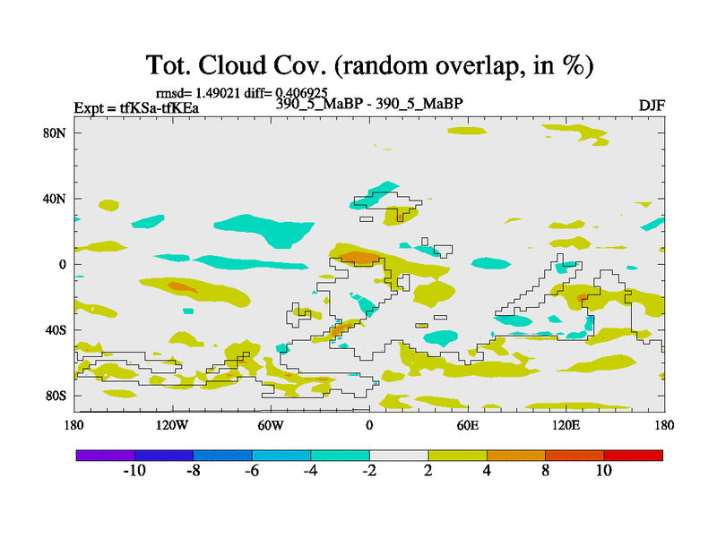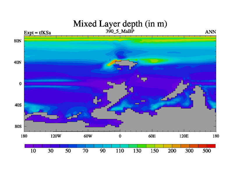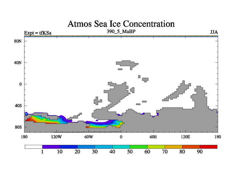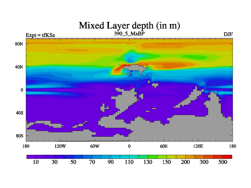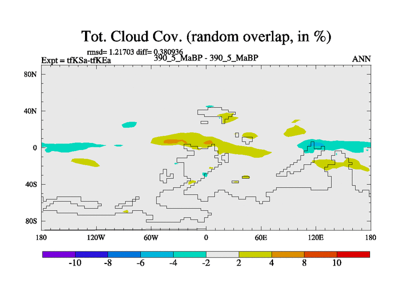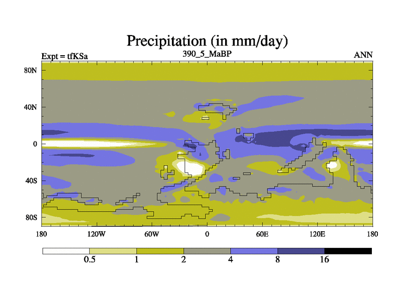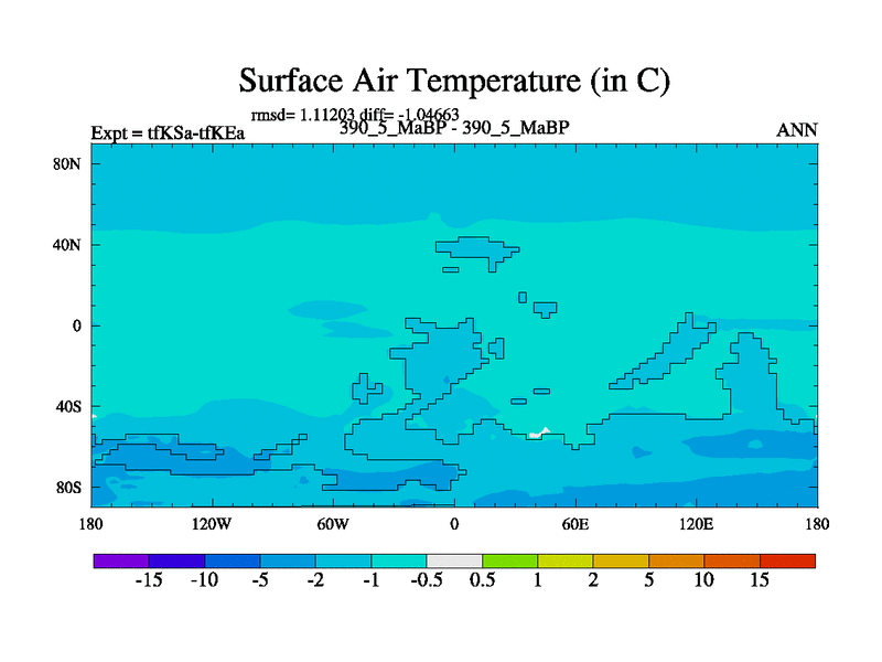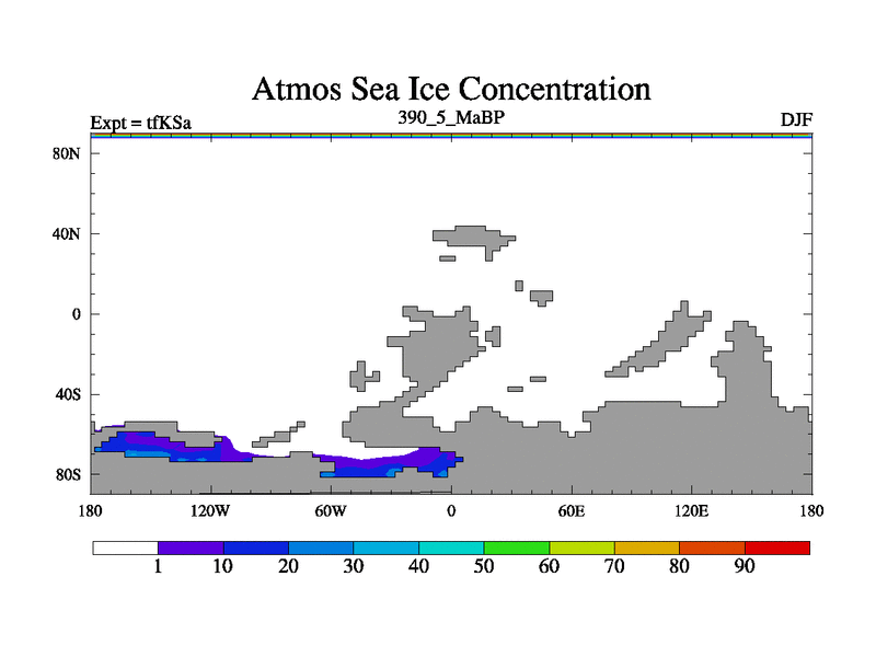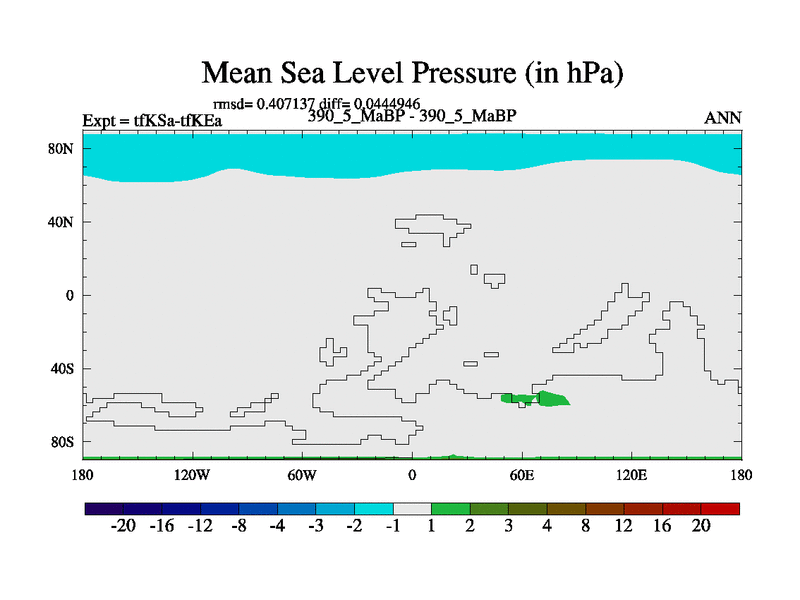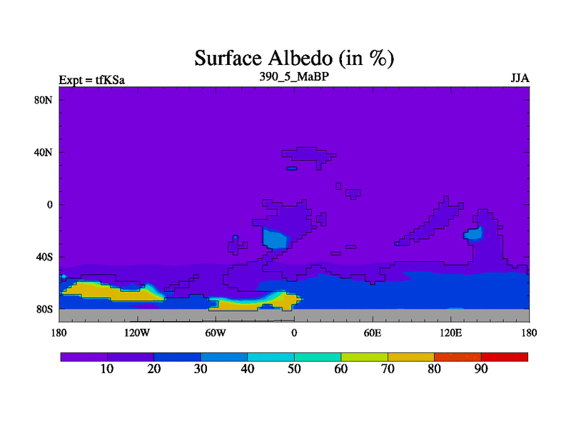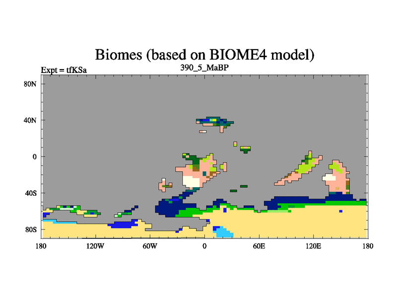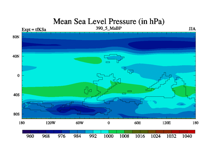This is the 390.5 Ma simulation using the Scotese palaeogeographies and revised CCN etc. This version has islands and smoothing and desert albedo included. Tuned CO2 to give Scotese temperatures. Started from end of tfKEa.