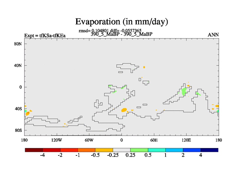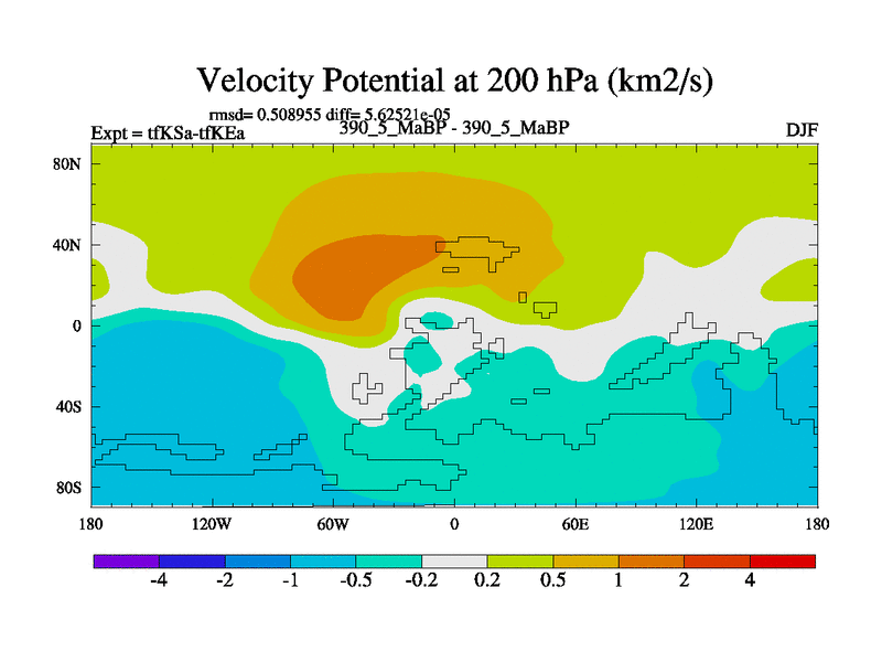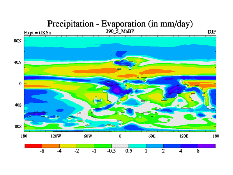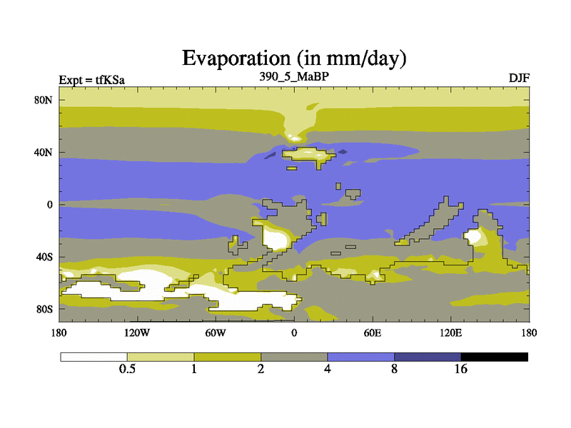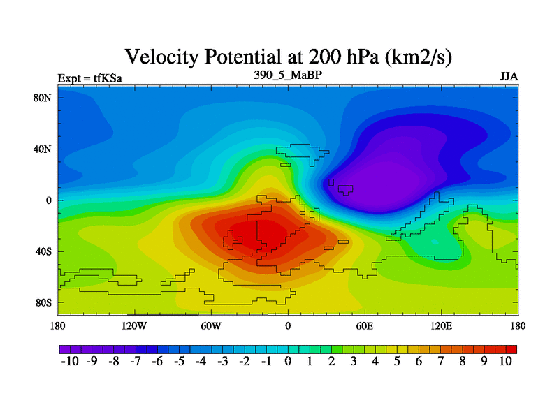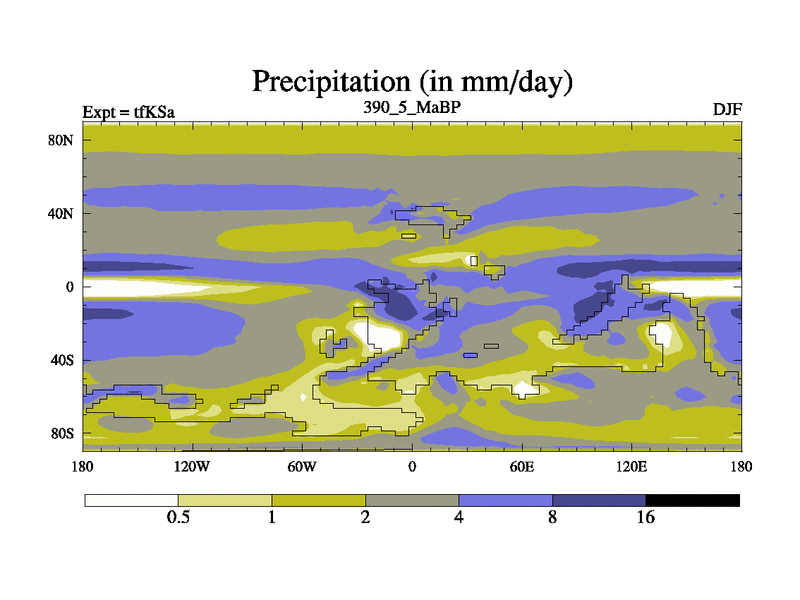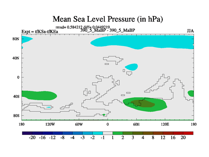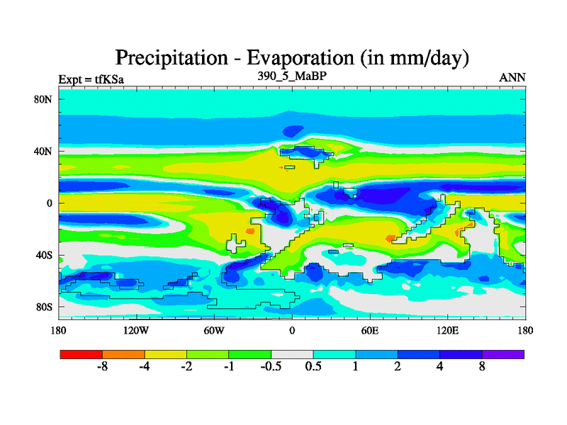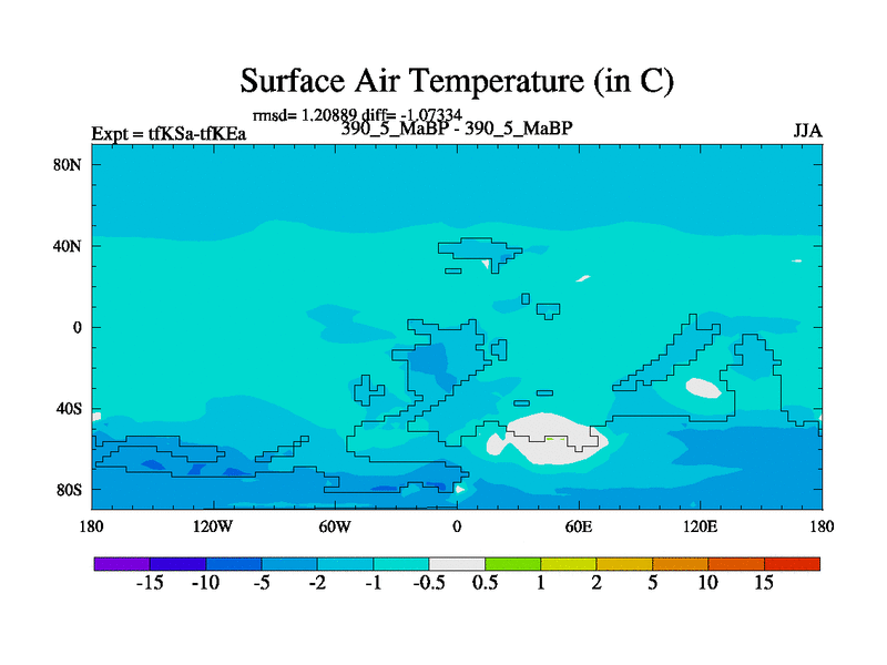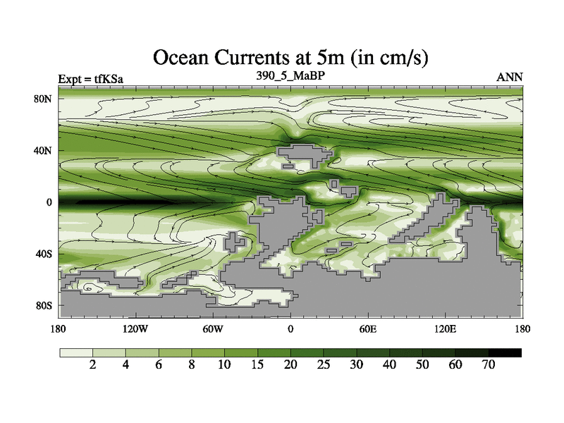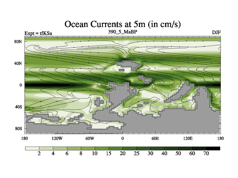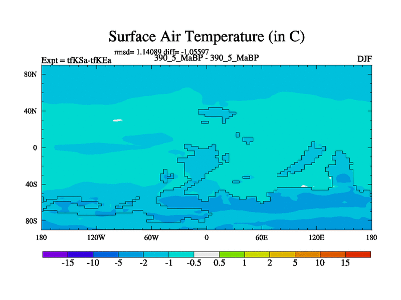 This is the 390.5 Ma simulation using the Scotese palaeogeographies and revised CCN etc. This version has islands and smoothing and desert albedo included. Tuned CO2 to give Scotese temperatures. Started from end of tfKEa.