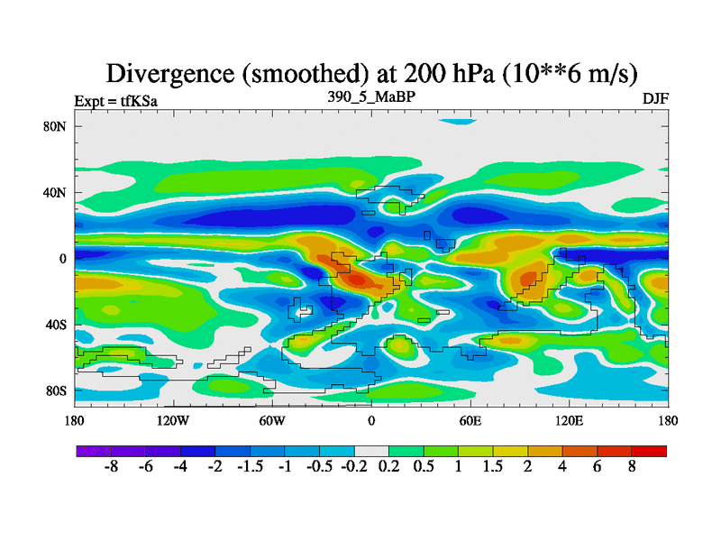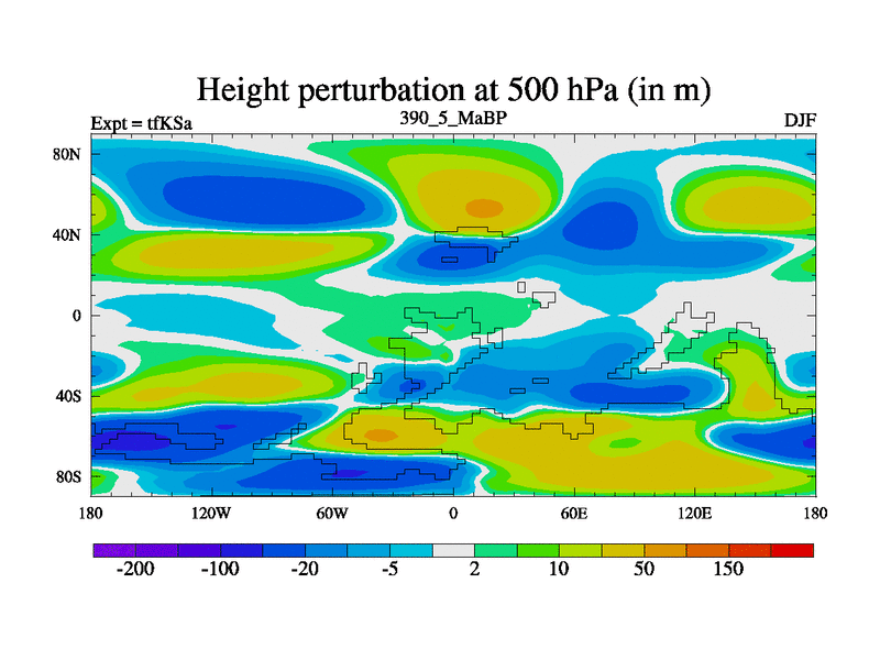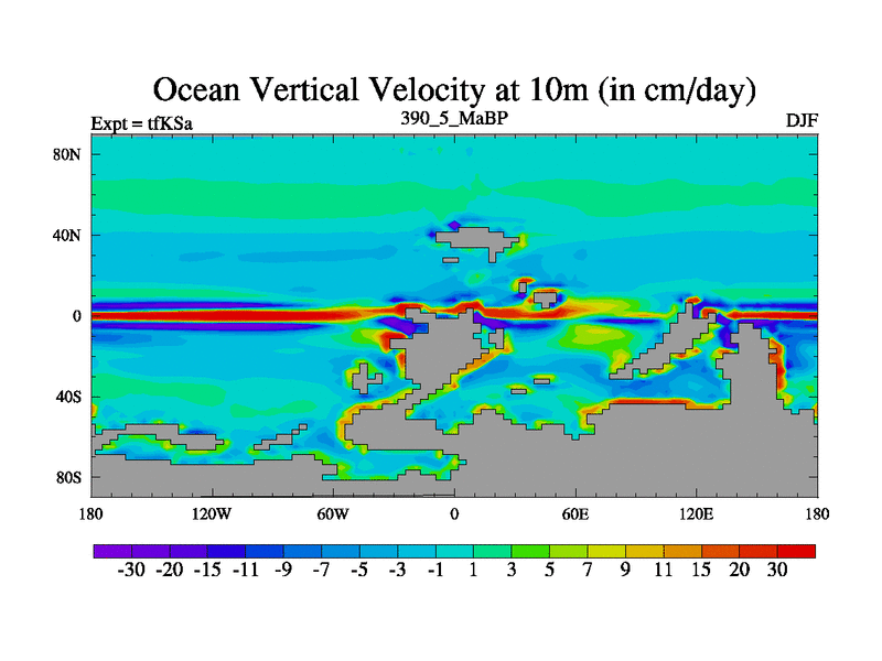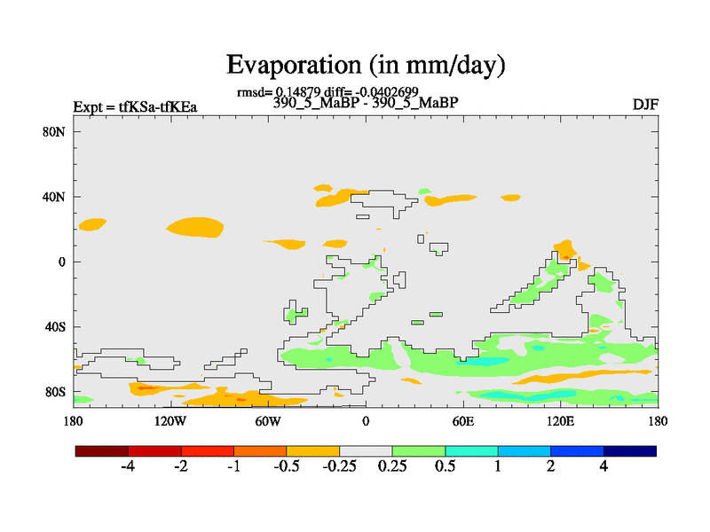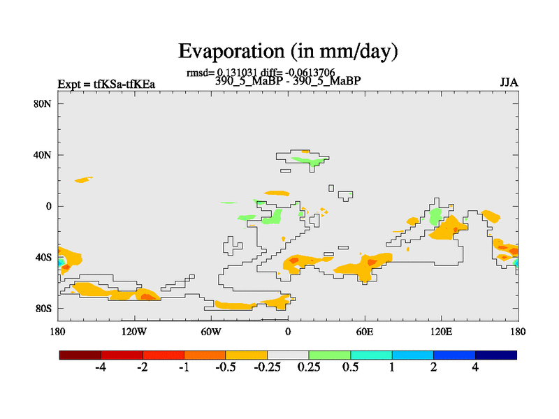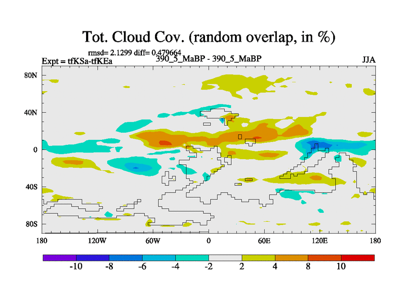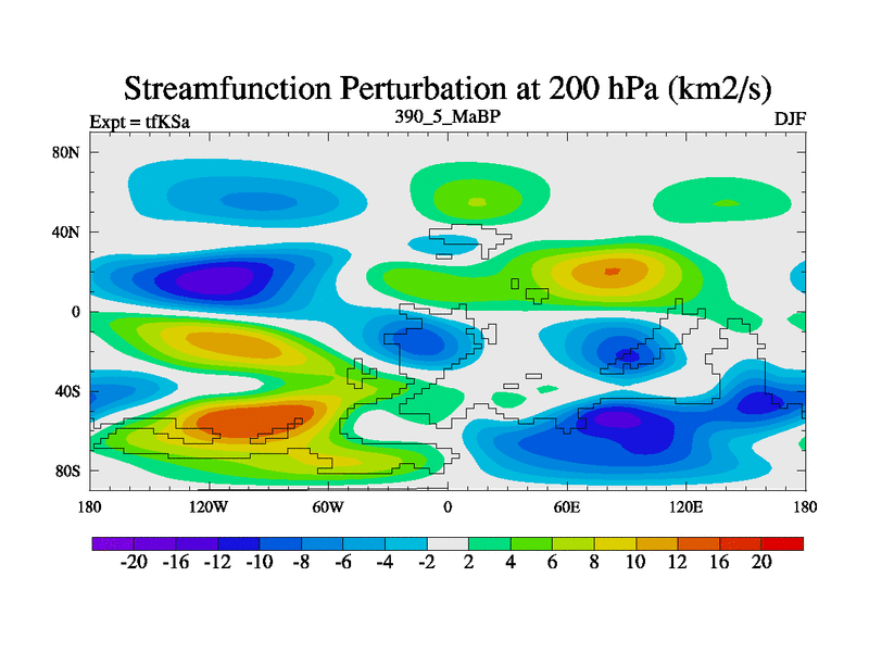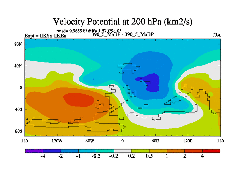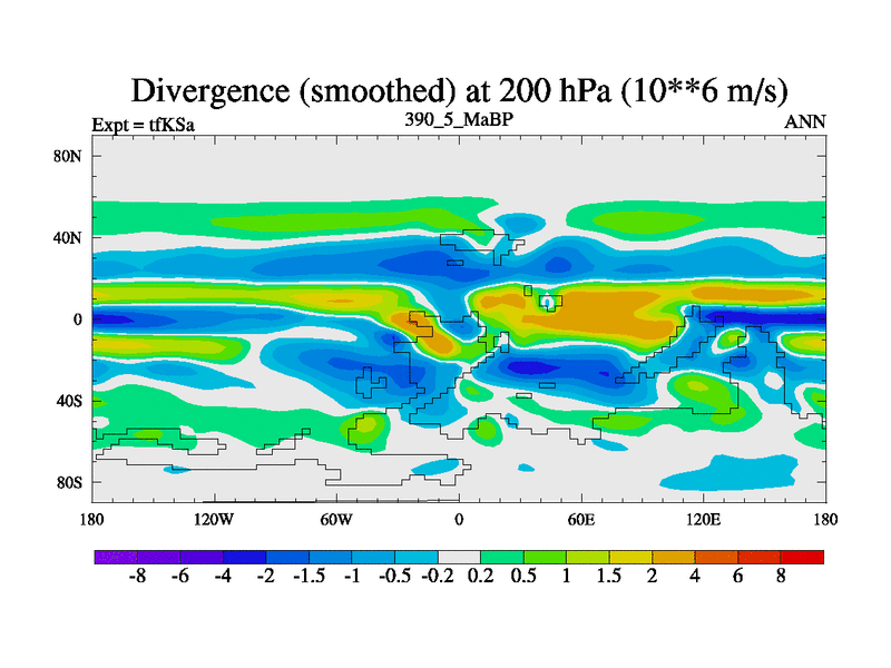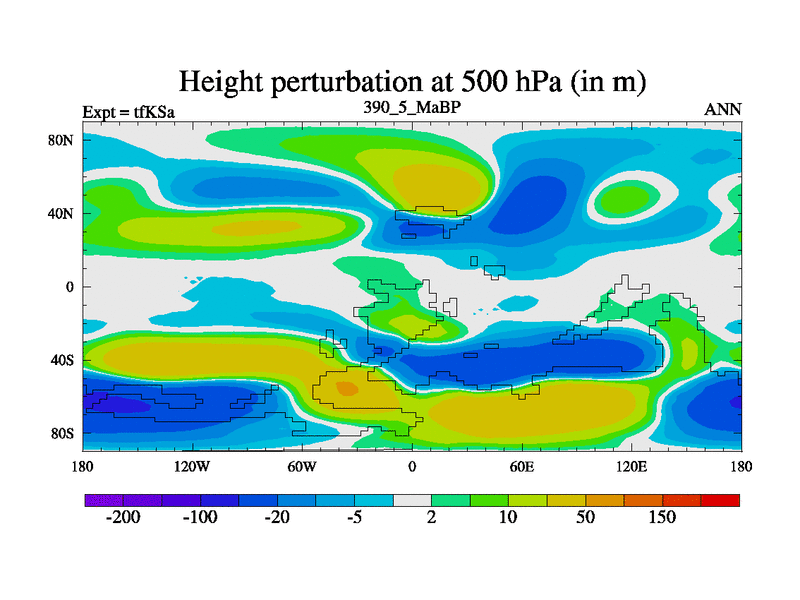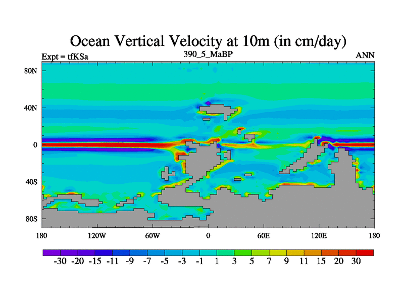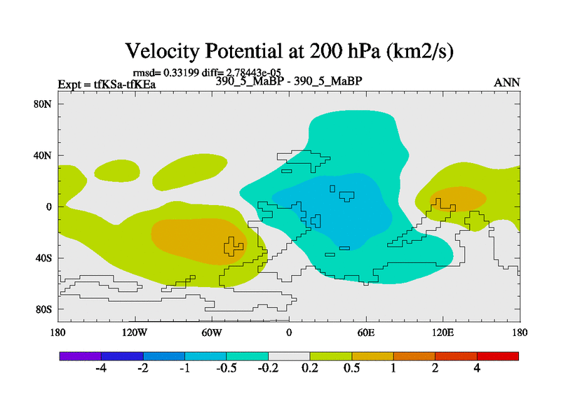 This is the 390.5 Ma simulation using the Scotese palaeogeographies and revised CCN etc. This version has islands and smoothing and desert albedo included. Tuned CO2 to give Scotese temperatures. Started from end of tfKEa.