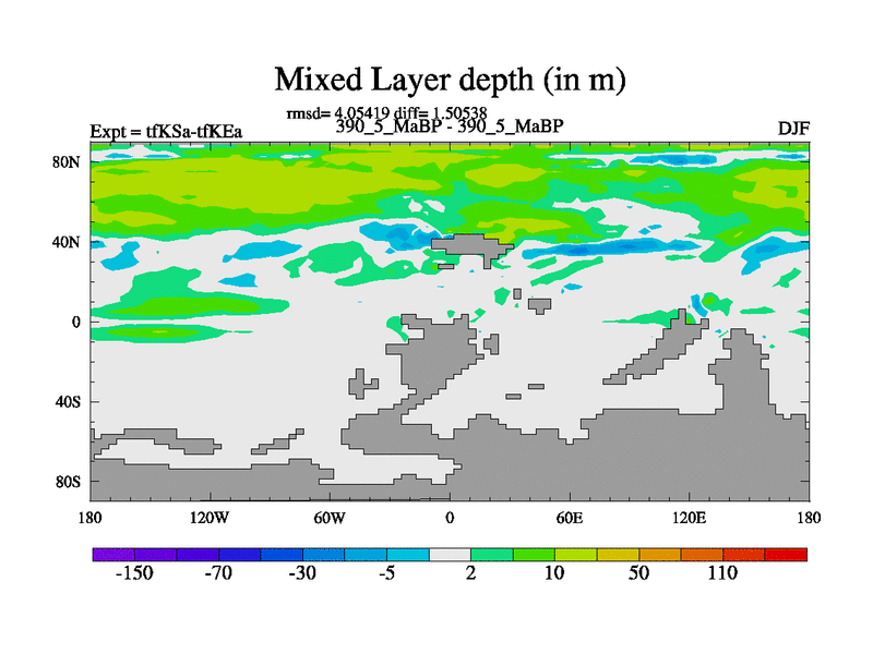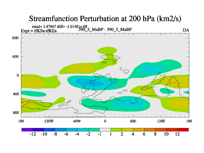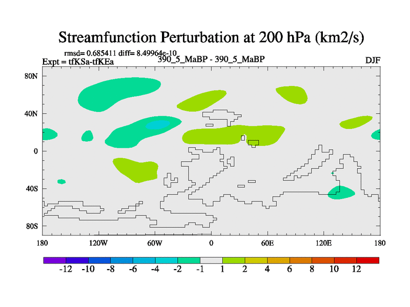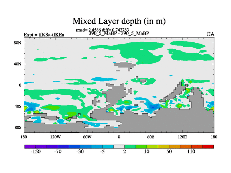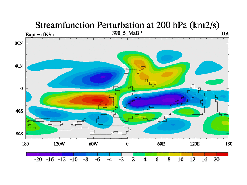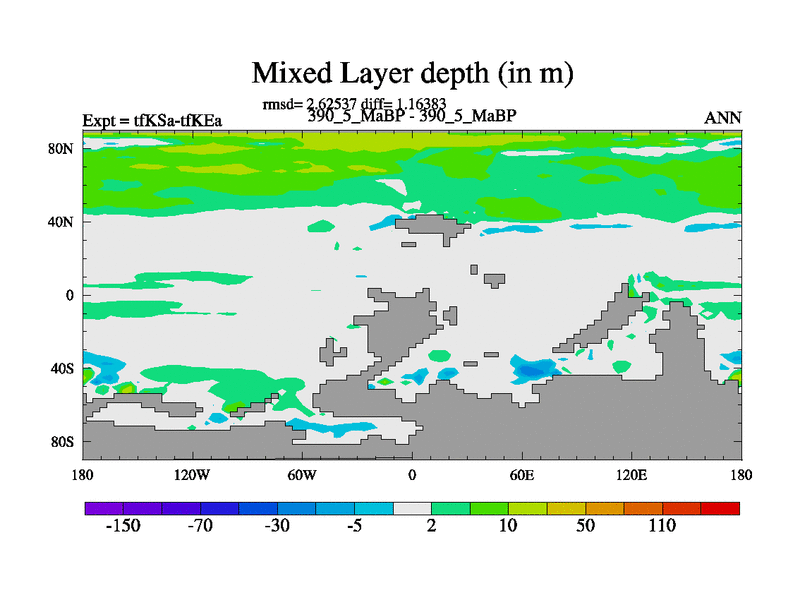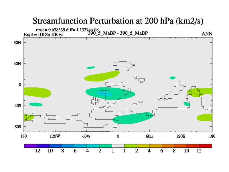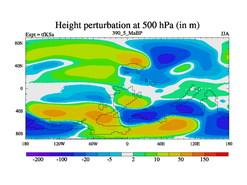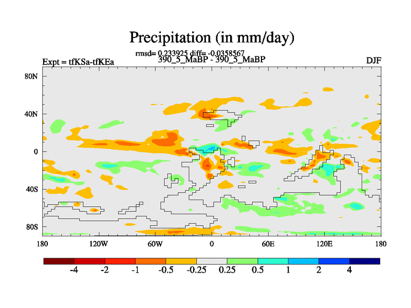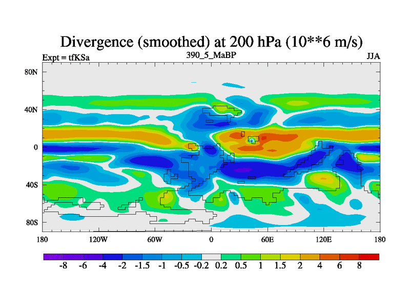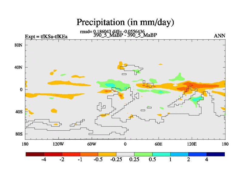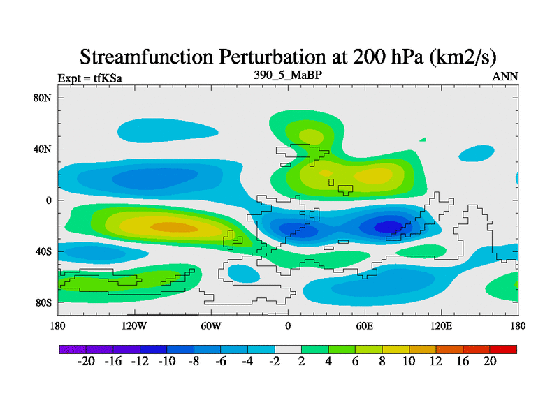 This is the 390.5 Ma simulation using the Scotese palaeogeographies and revised CCN etc. This version has islands and smoothing and desert albedo included. Tuned CO2 to give Scotese temperatures. Started from end of tfKEa.