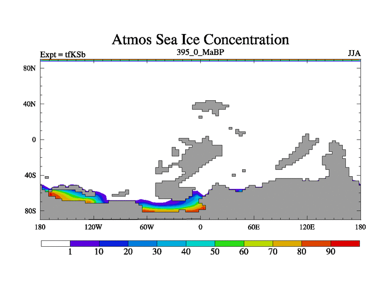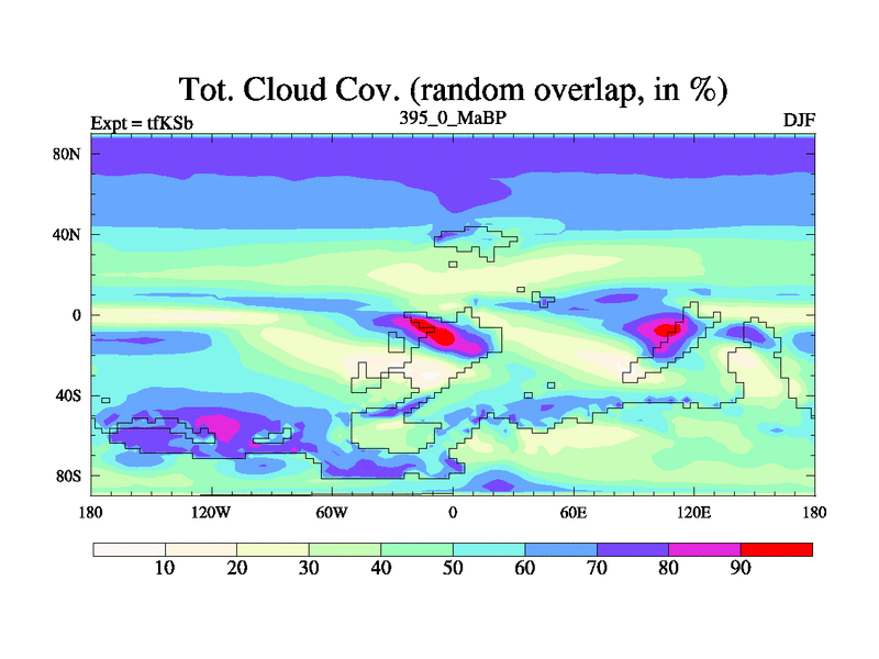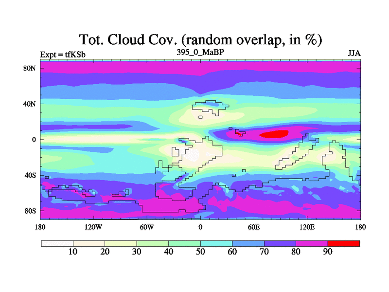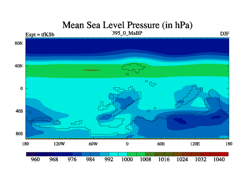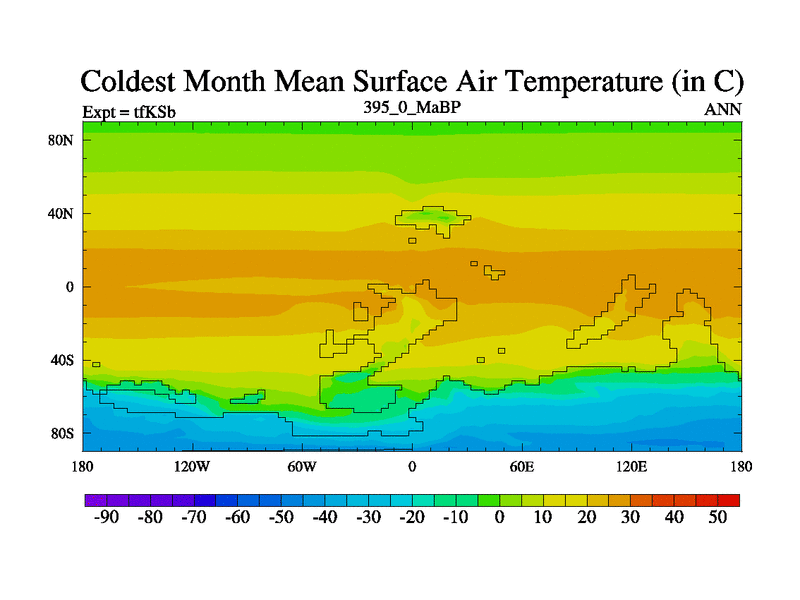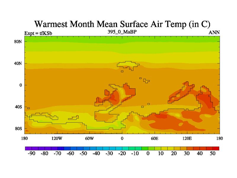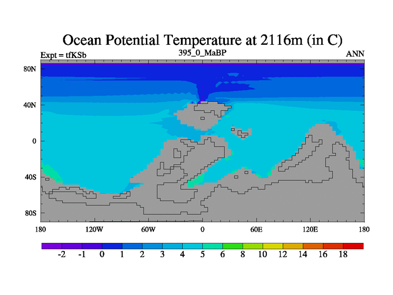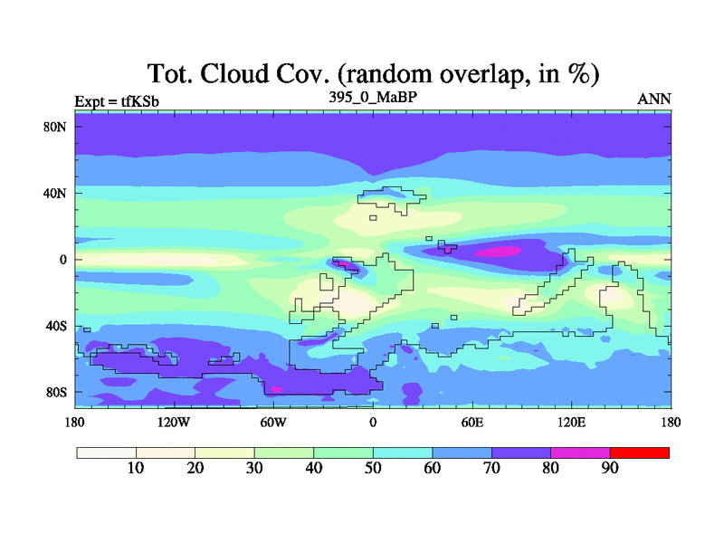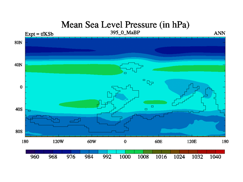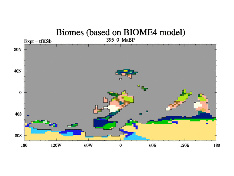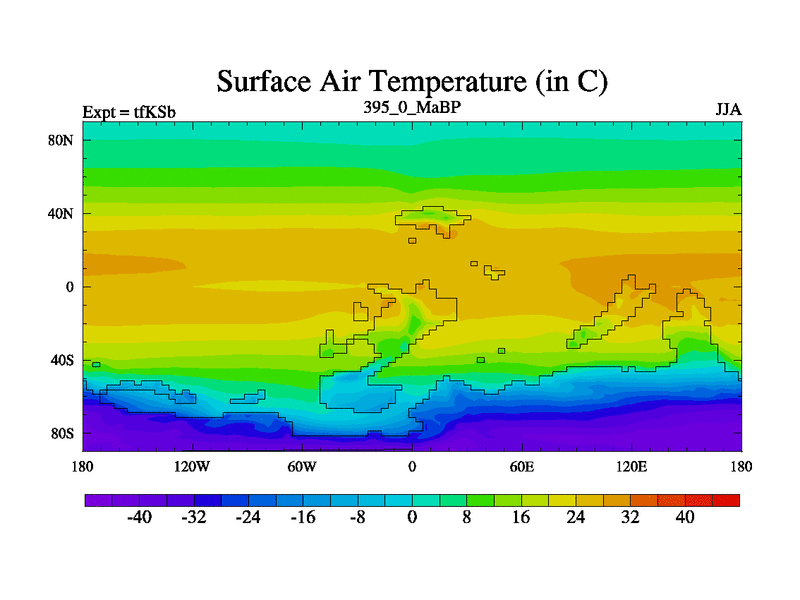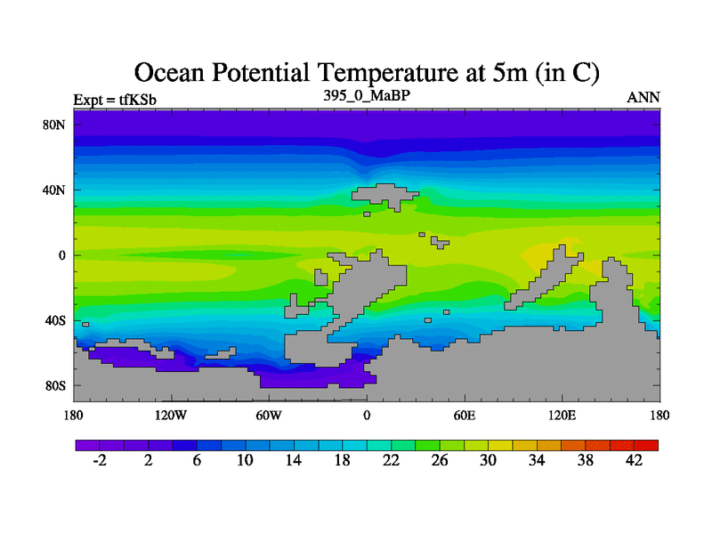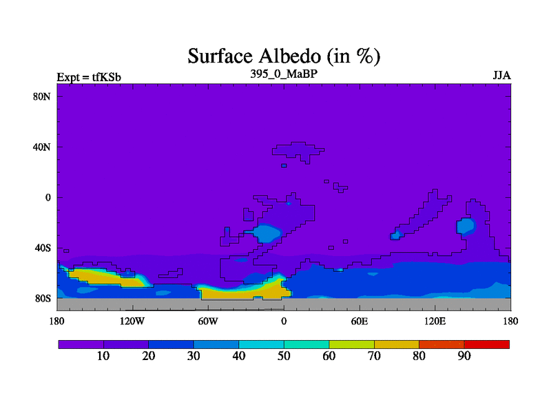 This is the 395.0 Ma simulation using the Scotese palaeogeographies and revised CCN etc. This version has islands and smoothing and desert albedo included. Tuned CO2 to give Scotese temperatures. Started from end of tfKEb.