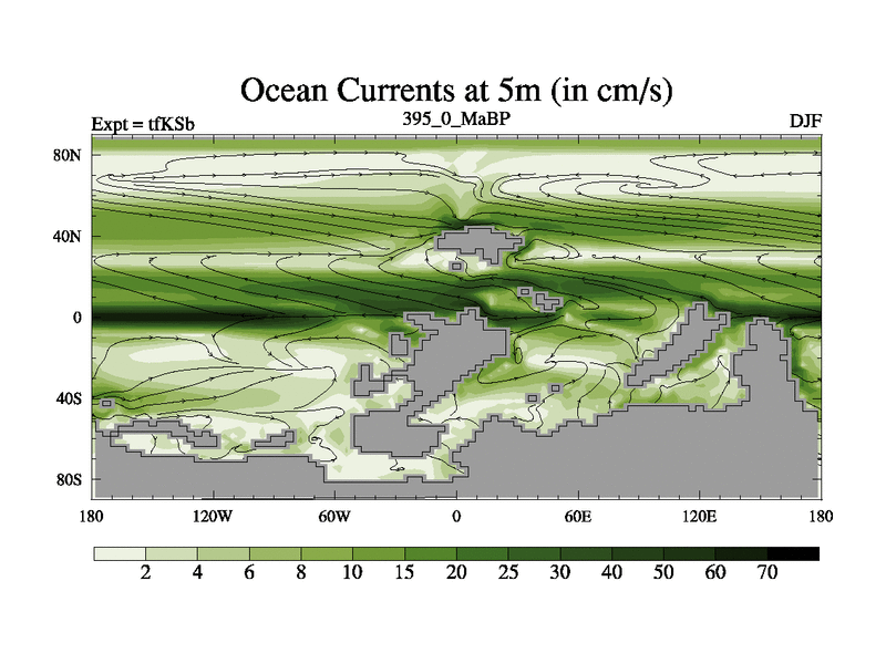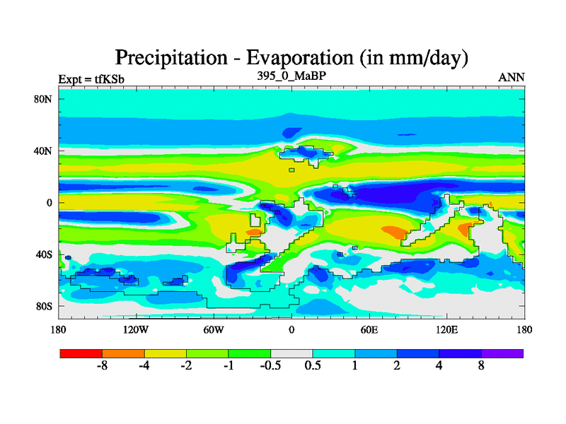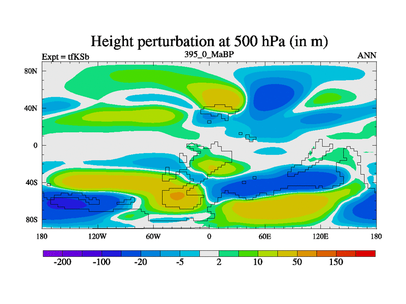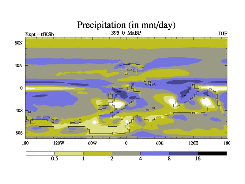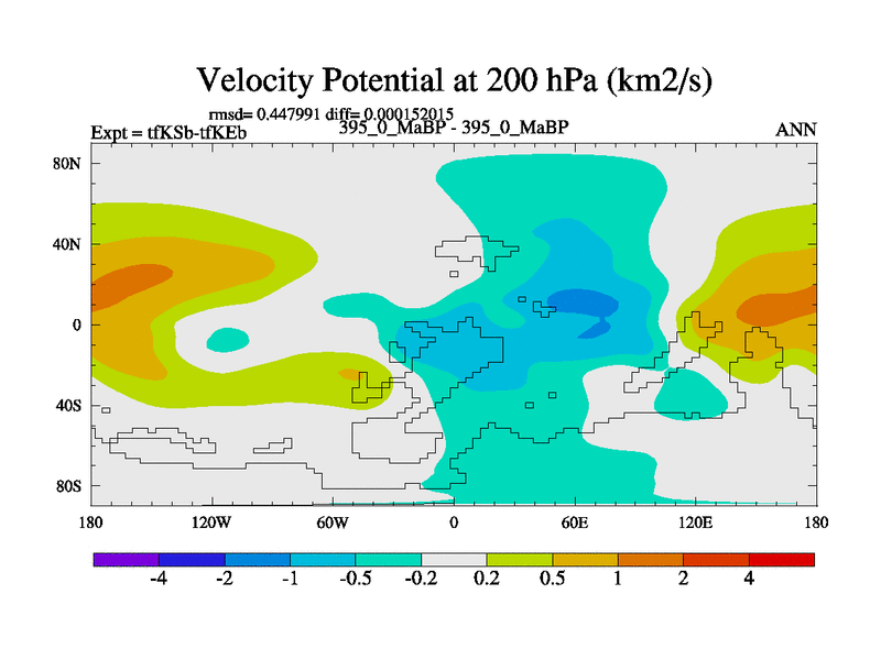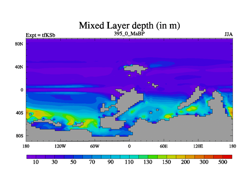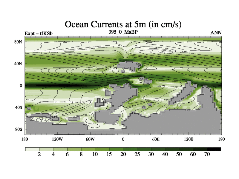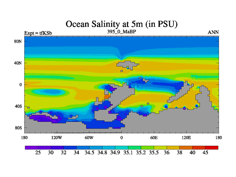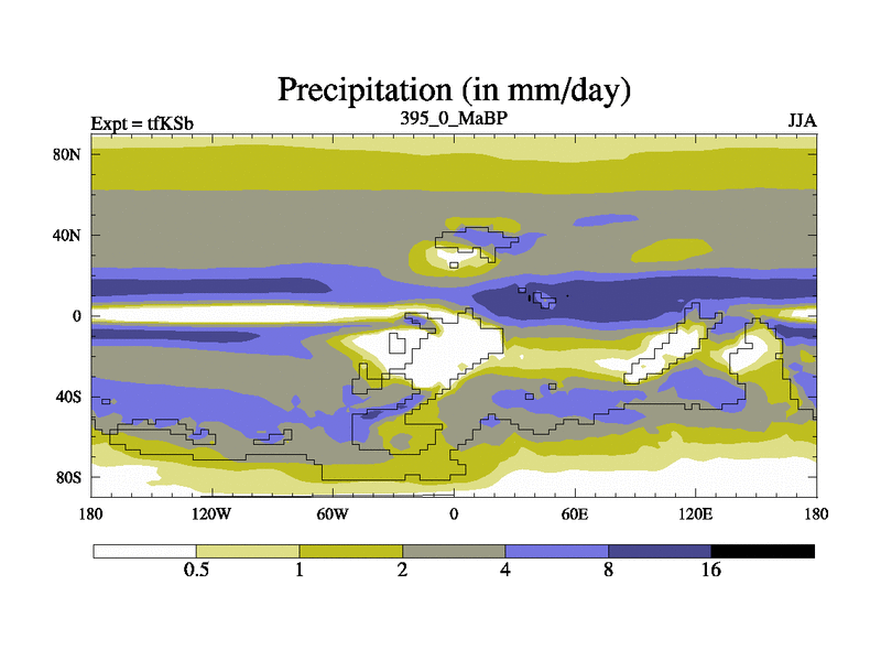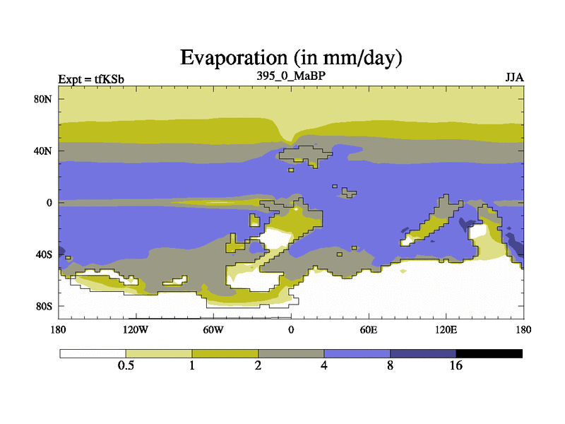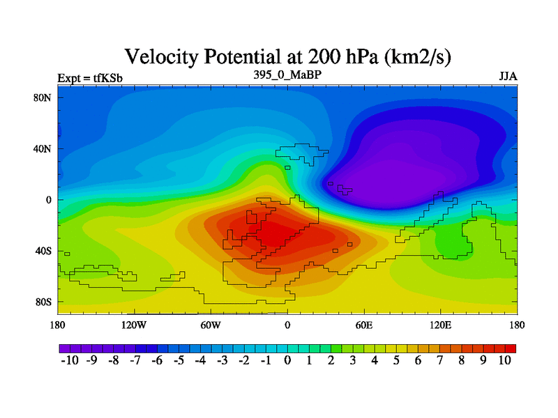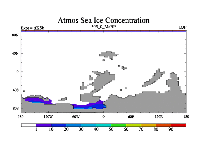 This is the 395.0 Ma simulation using the Scotese palaeogeographies and revised CCN etc. This version has islands and smoothing and desert albedo included. Tuned CO2 to give Scotese temperatures. Started from end of tfKEb.