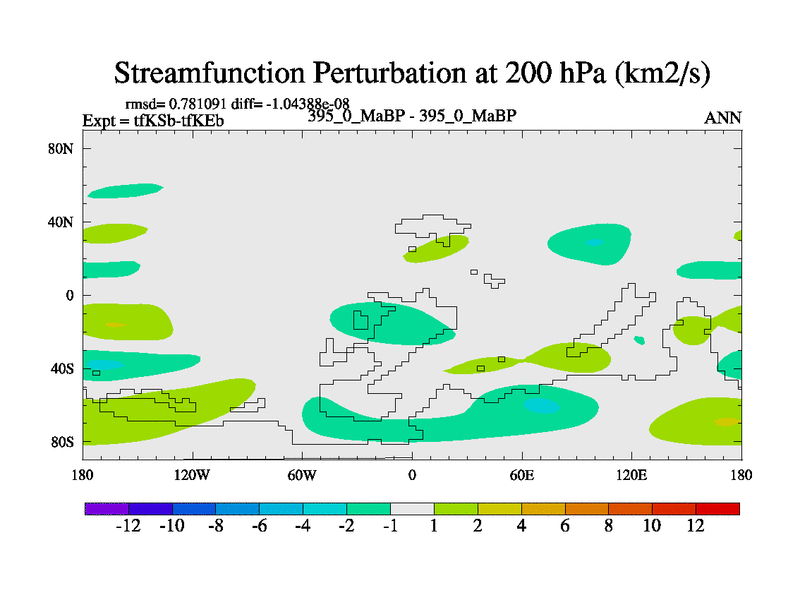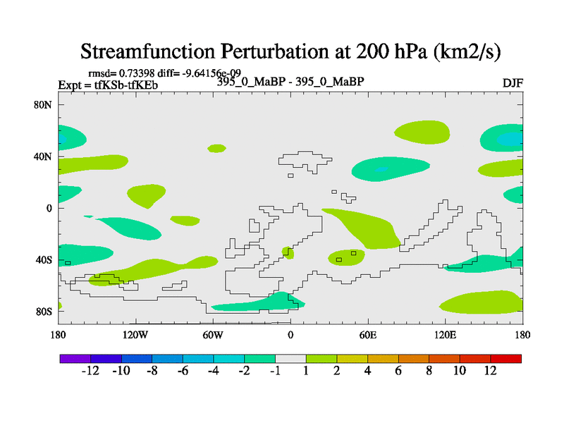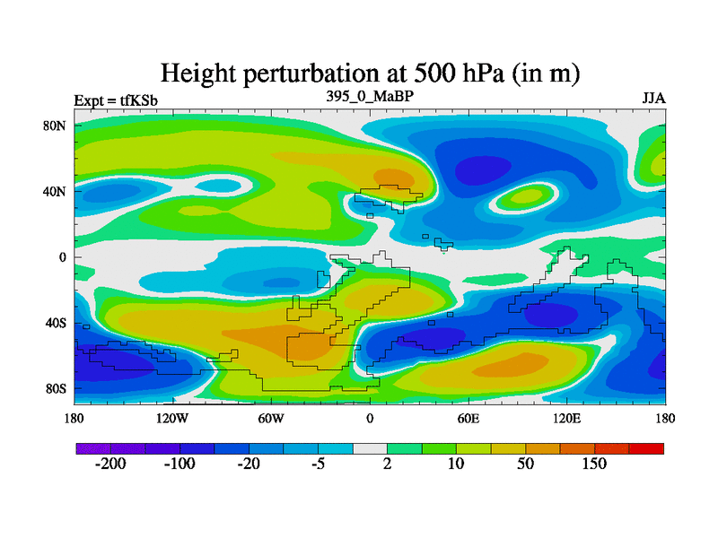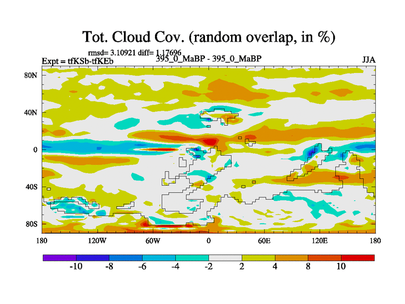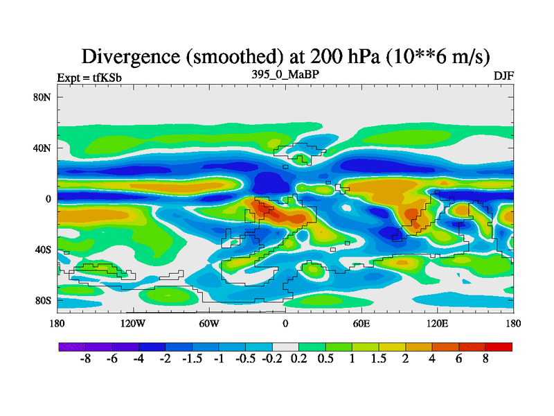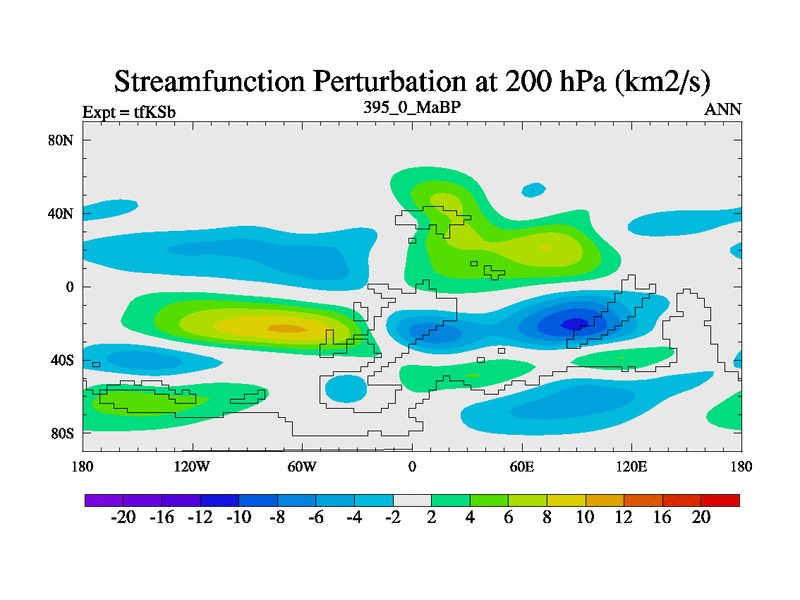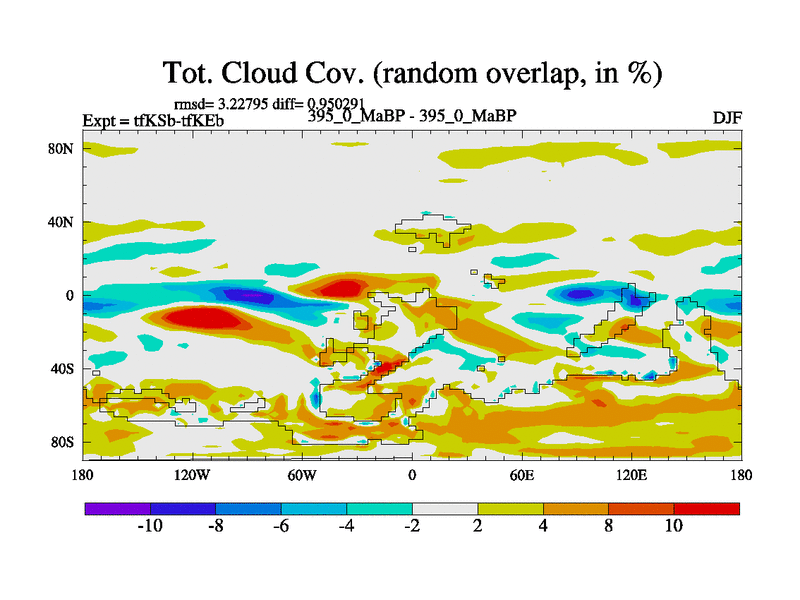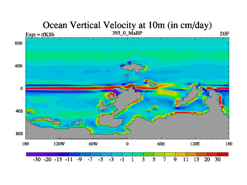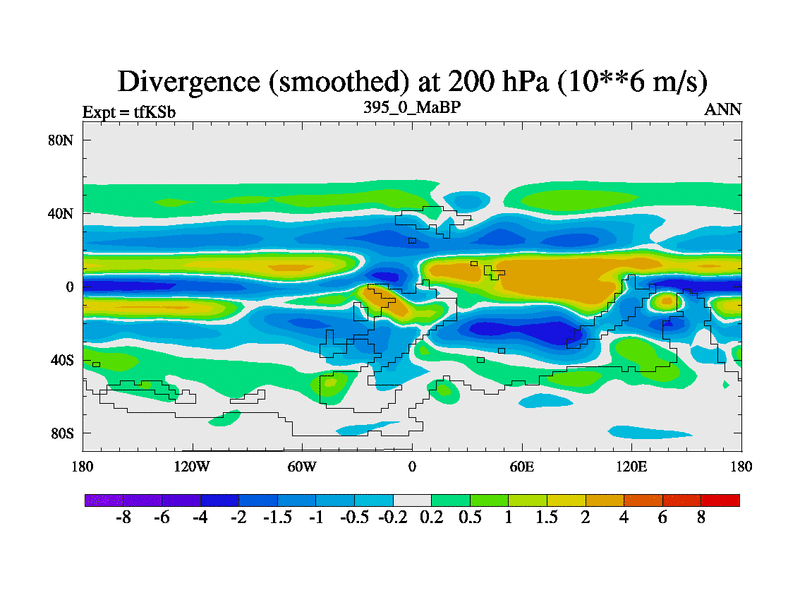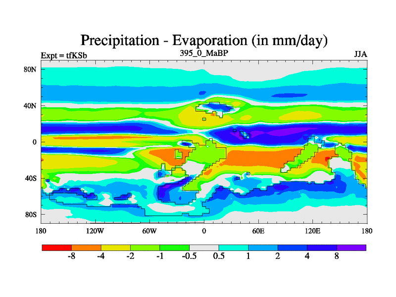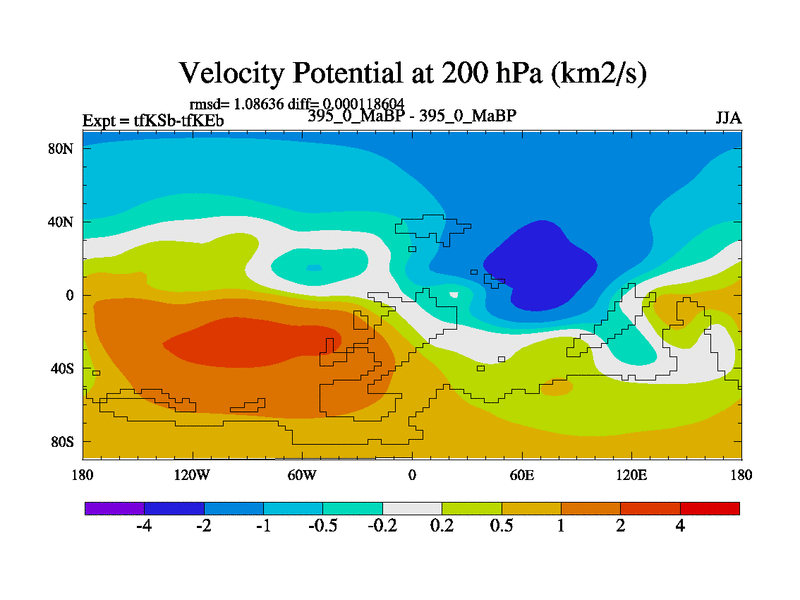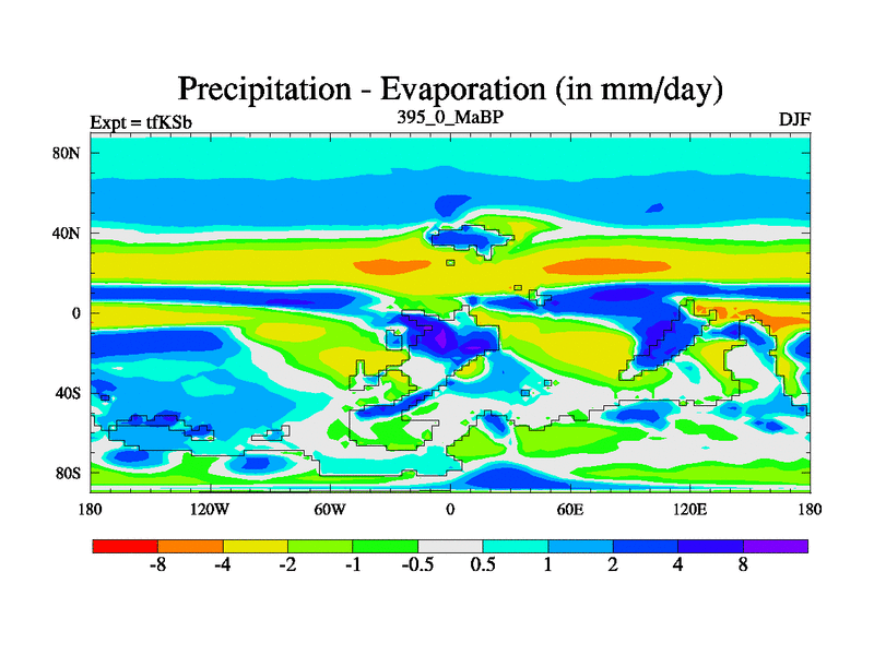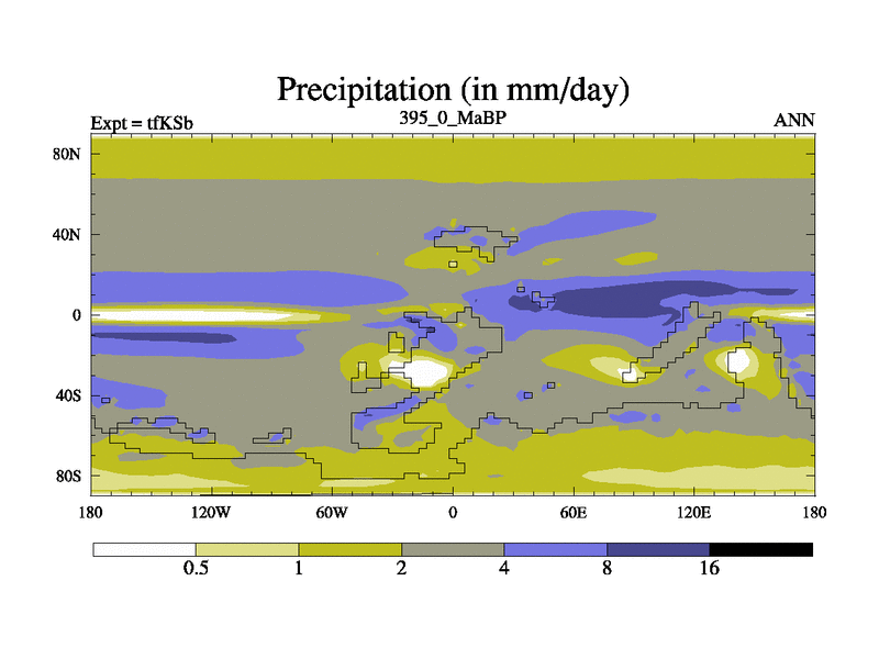 This is the 395.0 Ma simulation using the Scotese palaeogeographies and revised CCN etc. This version has islands and smoothing and desert albedo included. Tuned CO2 to give Scotese temperatures. Started from end of tfKEb.
