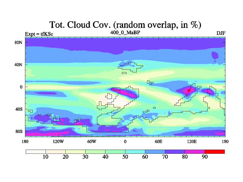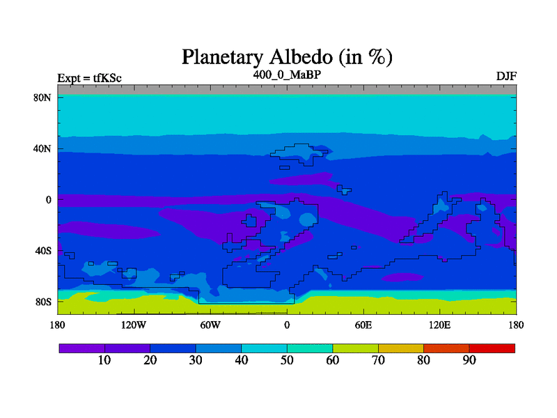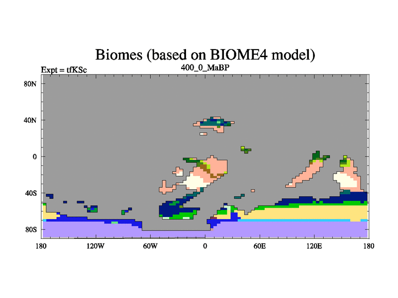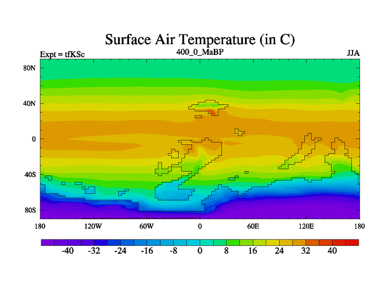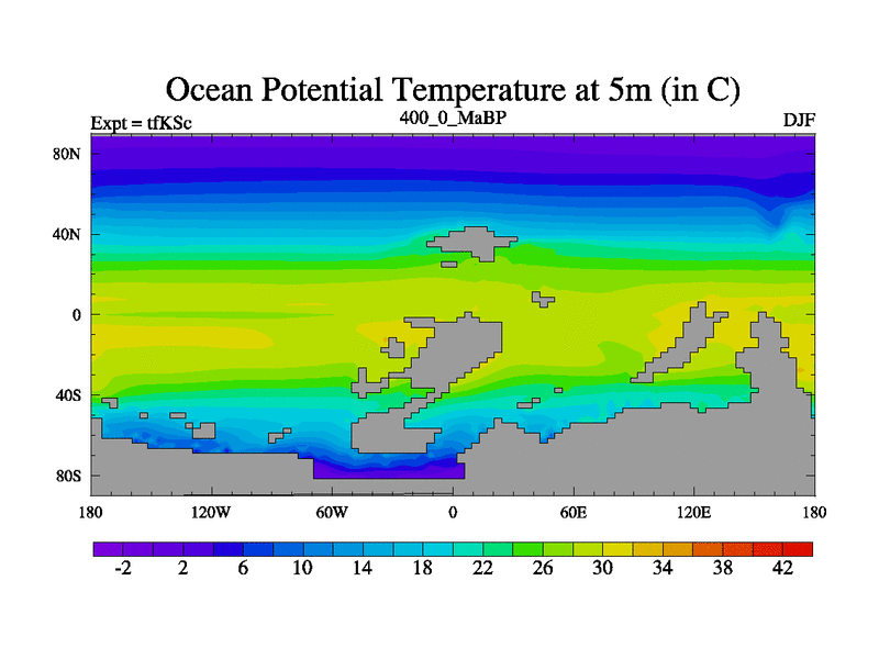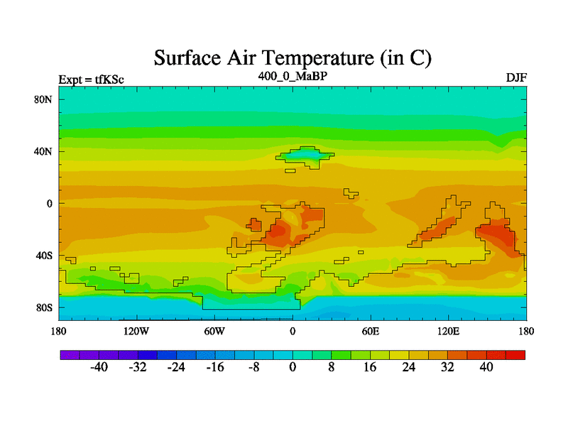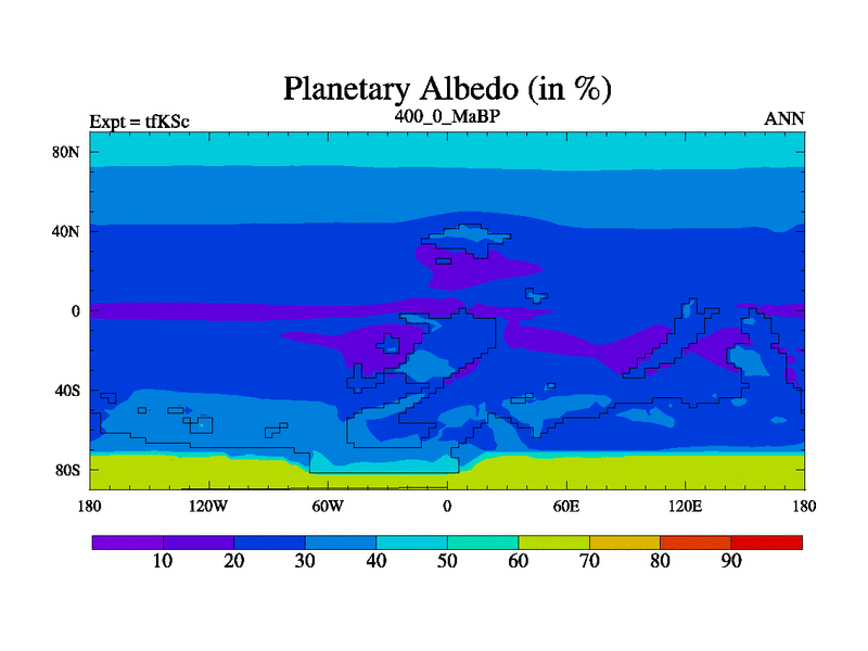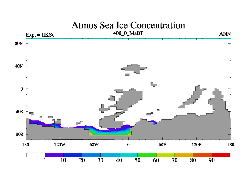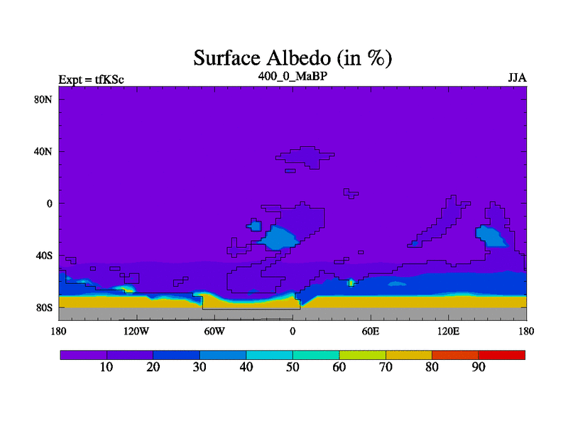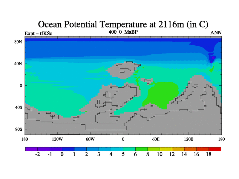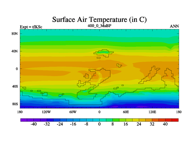 This is the 400.0 Ma simulation using the Scotese palaeogeographies and revised CCN etc. This version has islands and smoothing and desert albedo included. Tuned CO2 to give Scotese temperatures. Started from end of tfKEc.