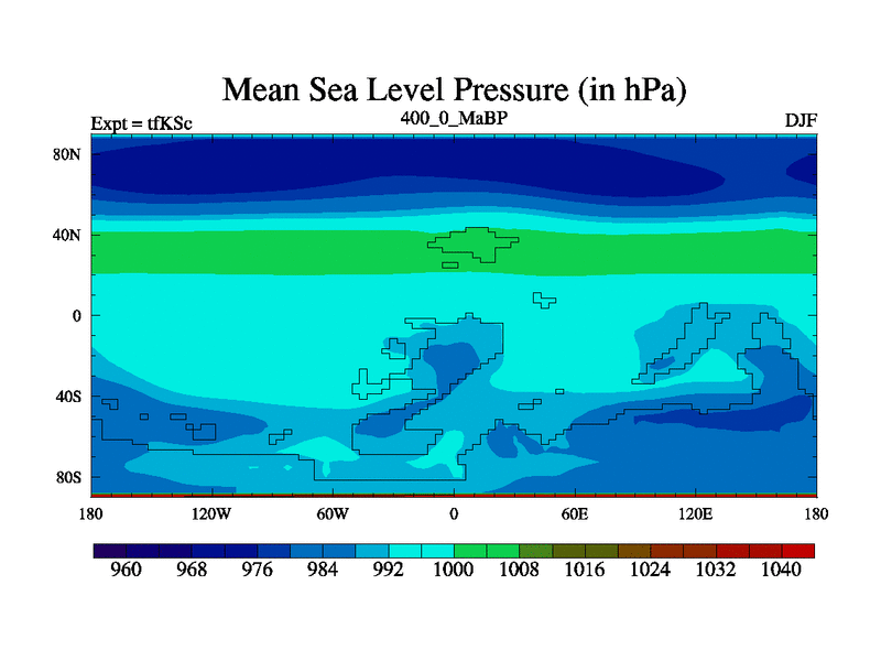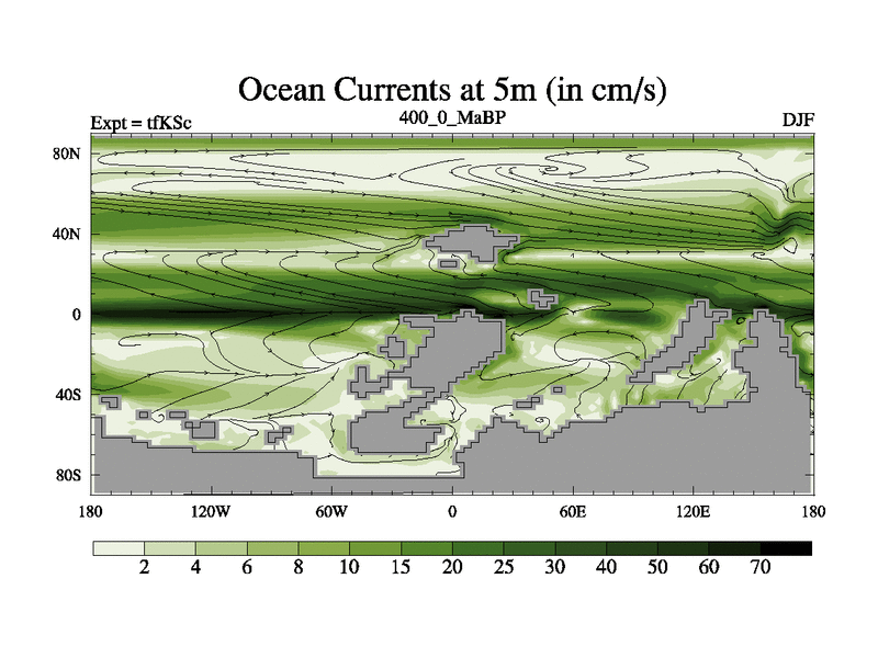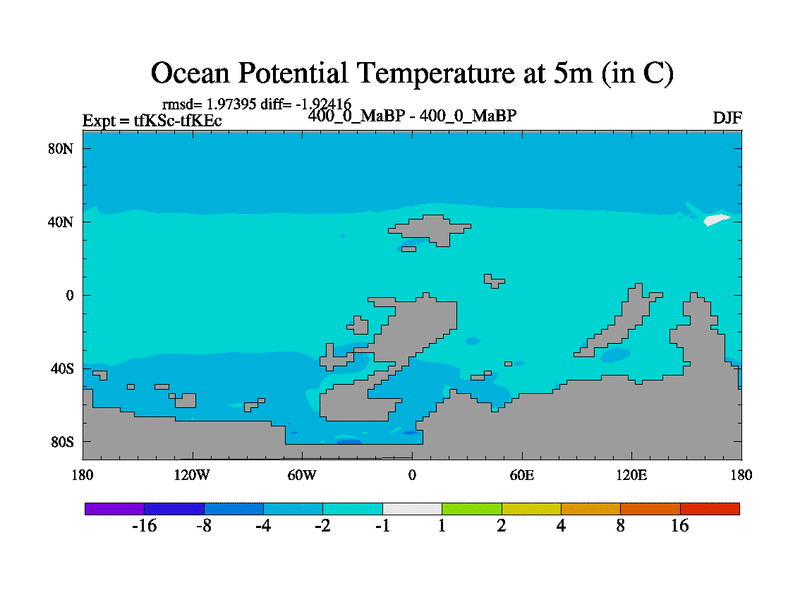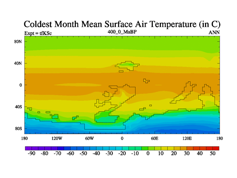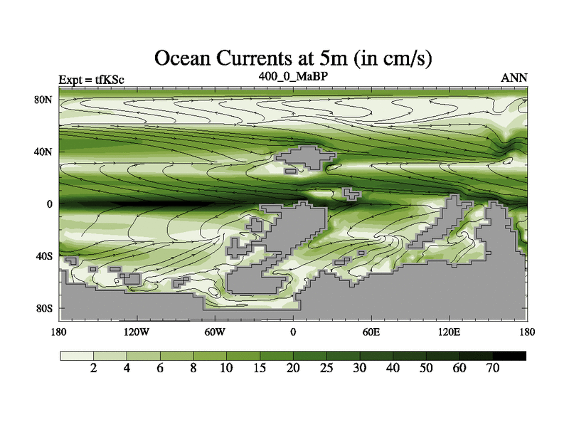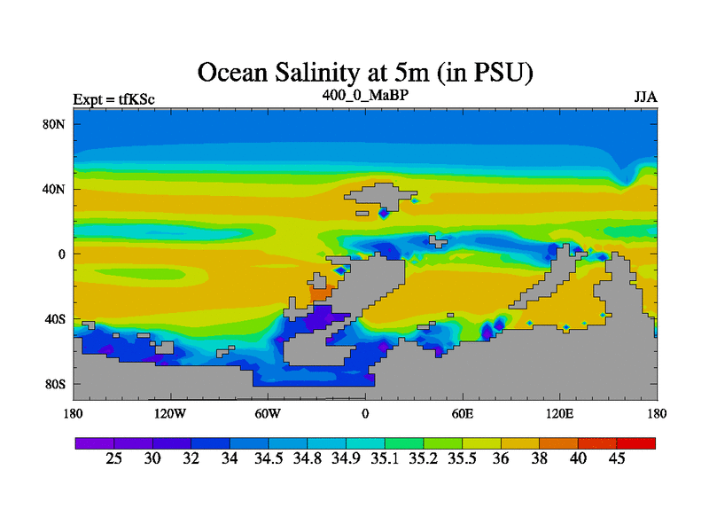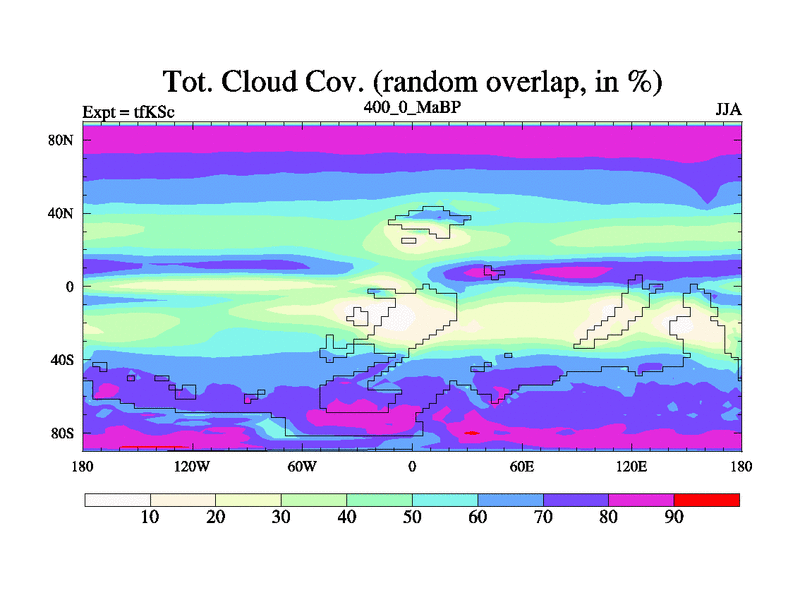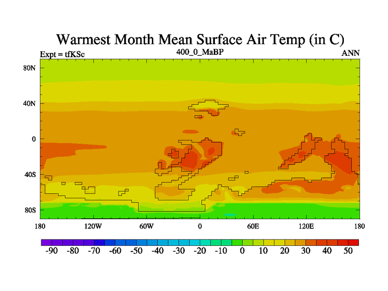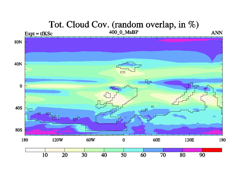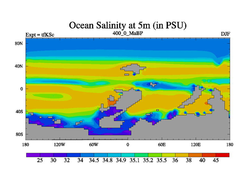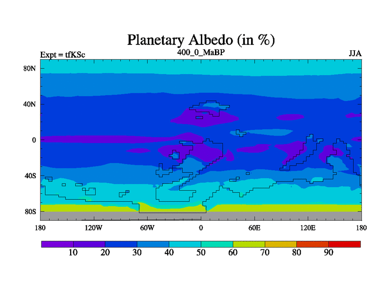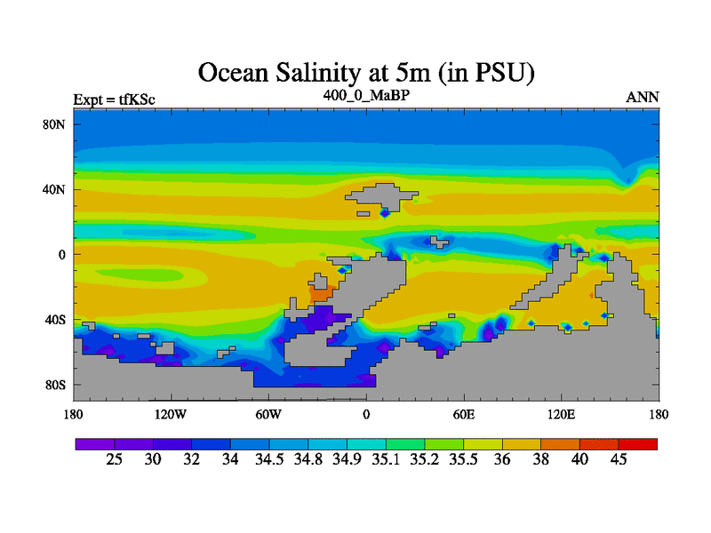 This is the 400.0 Ma simulation using the Scotese palaeogeographies and revised CCN etc. This version has islands and smoothing and desert albedo included. Tuned CO2 to give Scotese temperatures. Started from end of tfKEc.