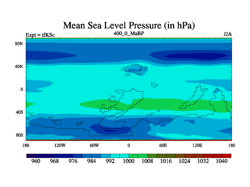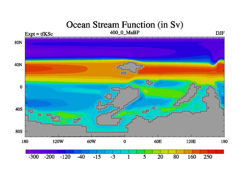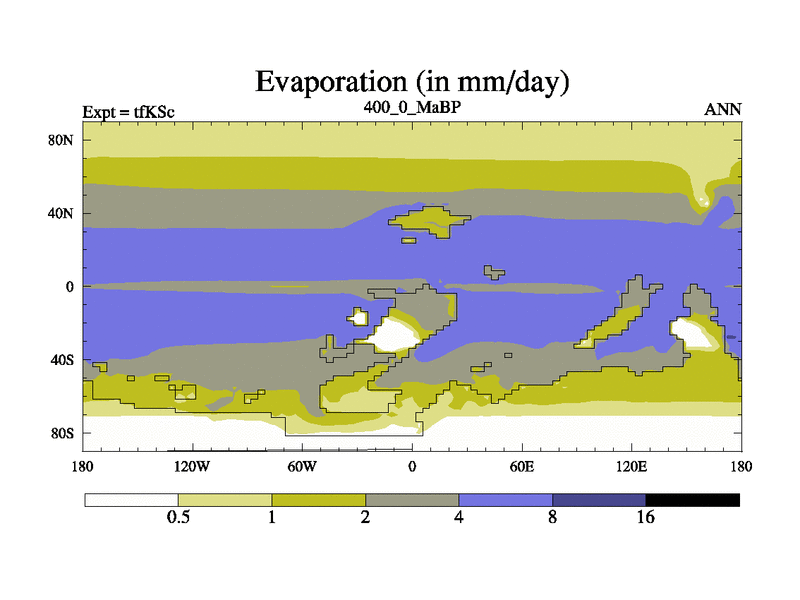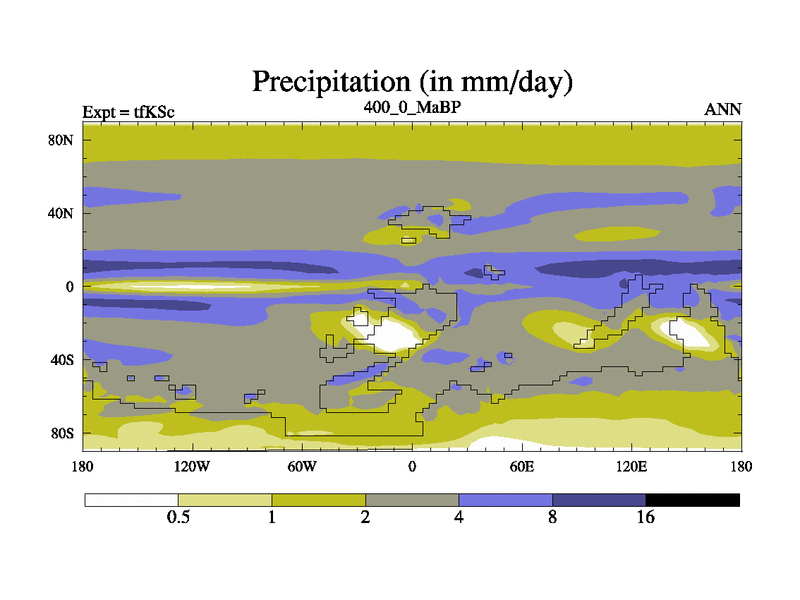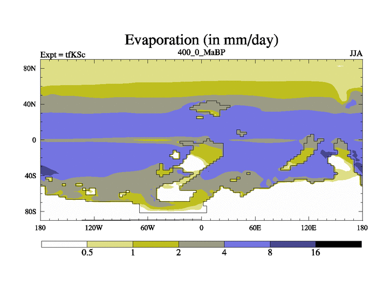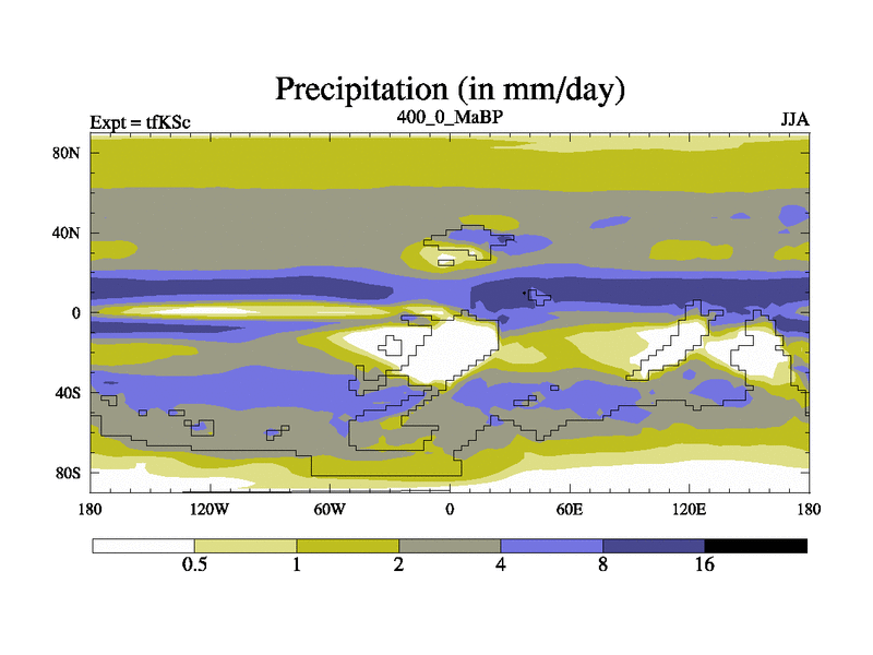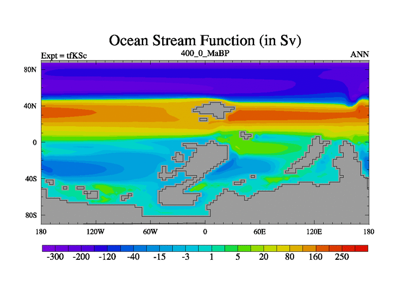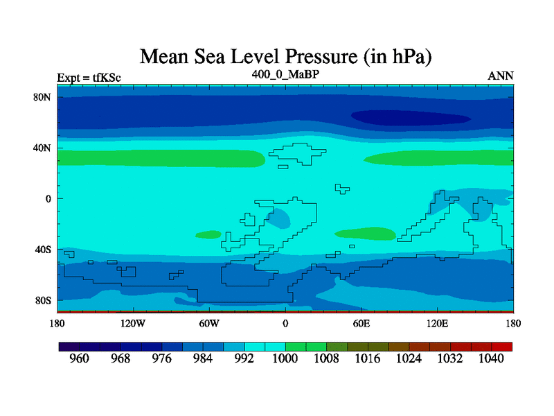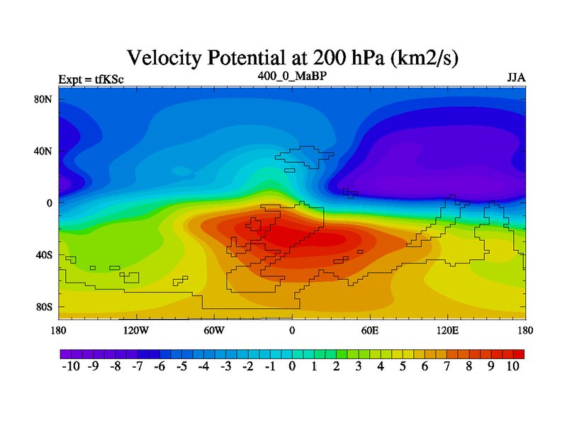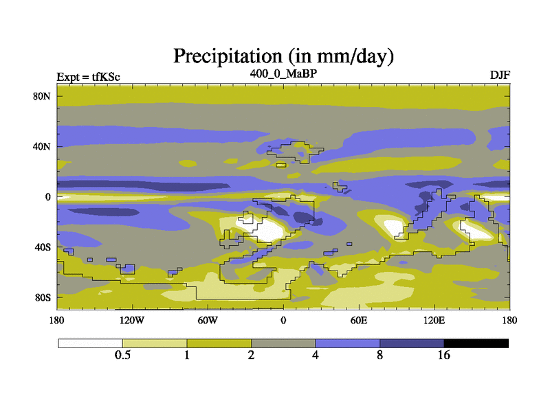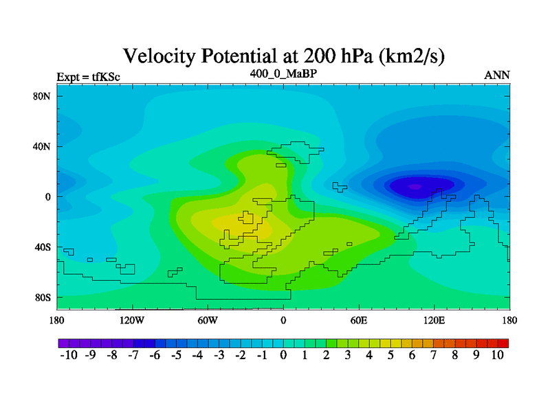 This is the 400.0 Ma simulation using the Scotese palaeogeographies and revised CCN etc. This version has islands and smoothing and desert albedo included. Tuned CO2 to give Scotese temperatures. Started from end of tfKEc.