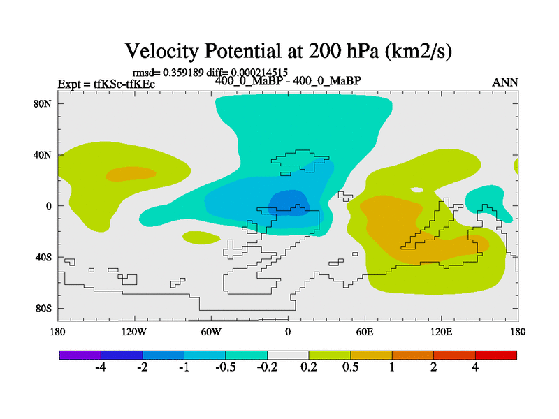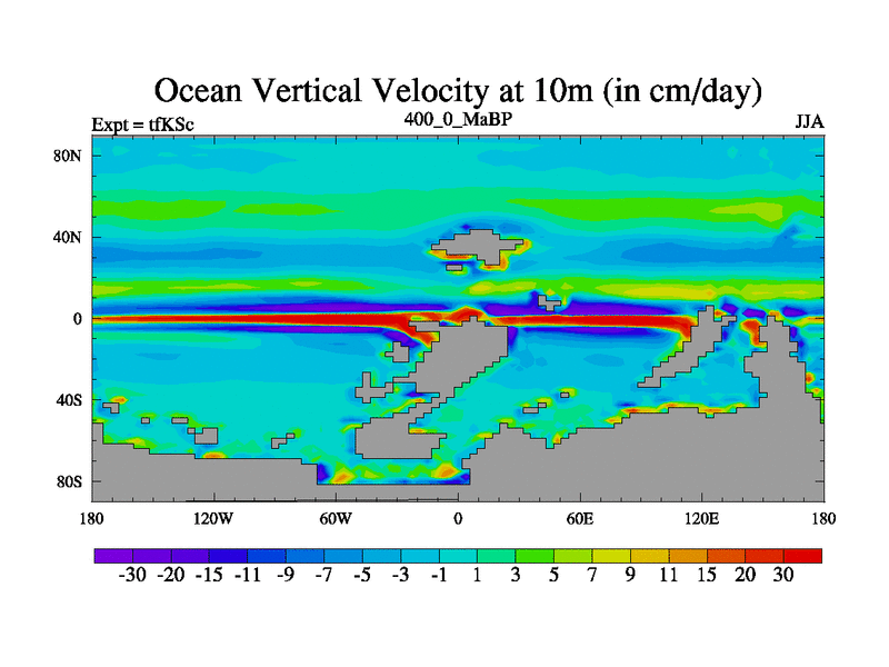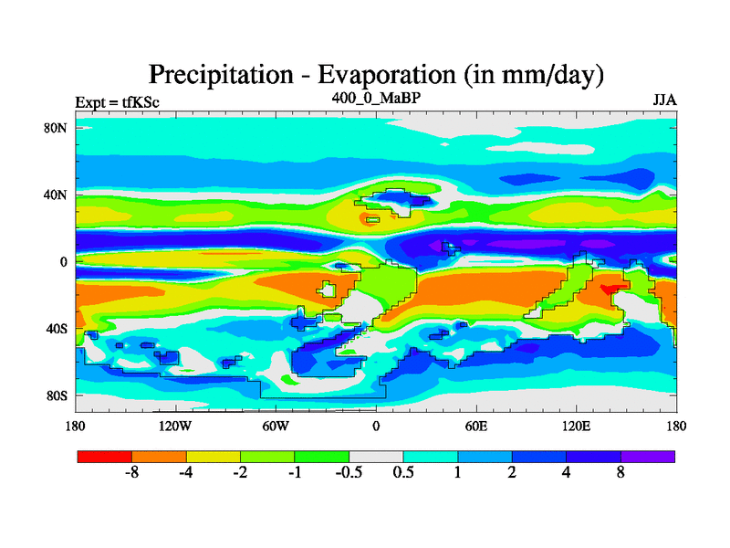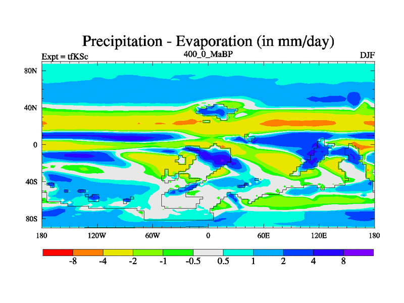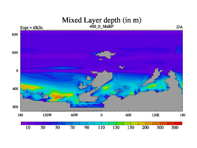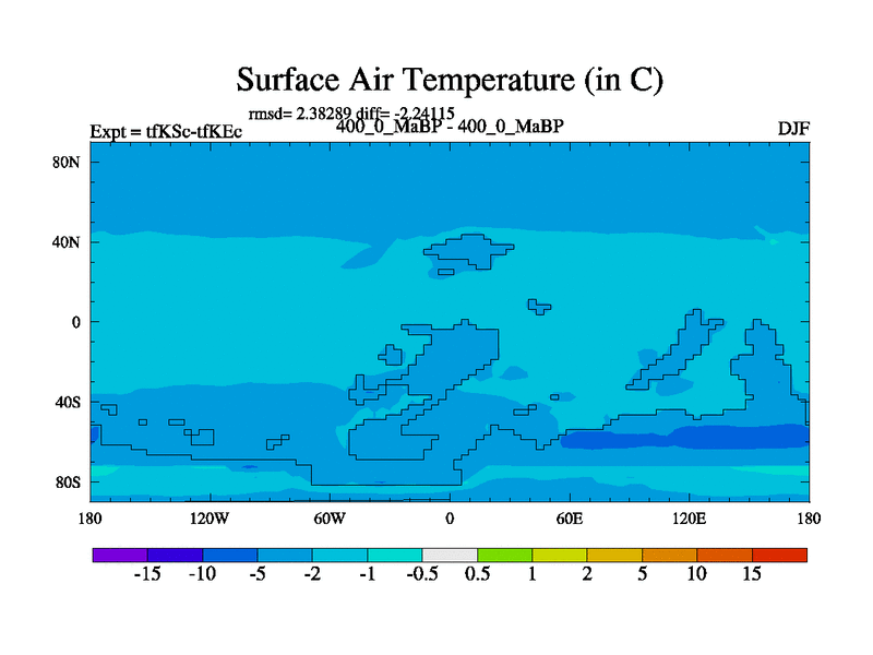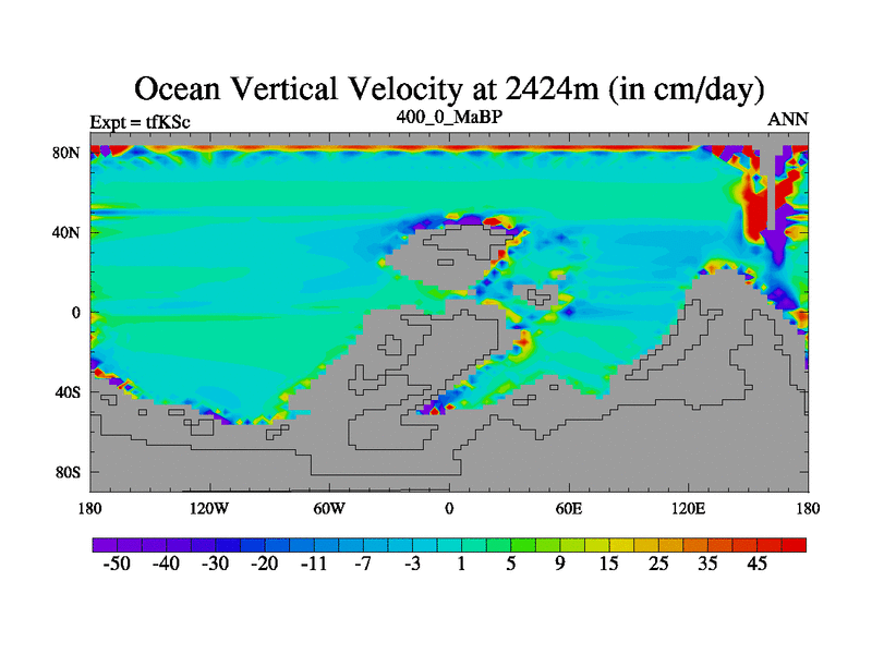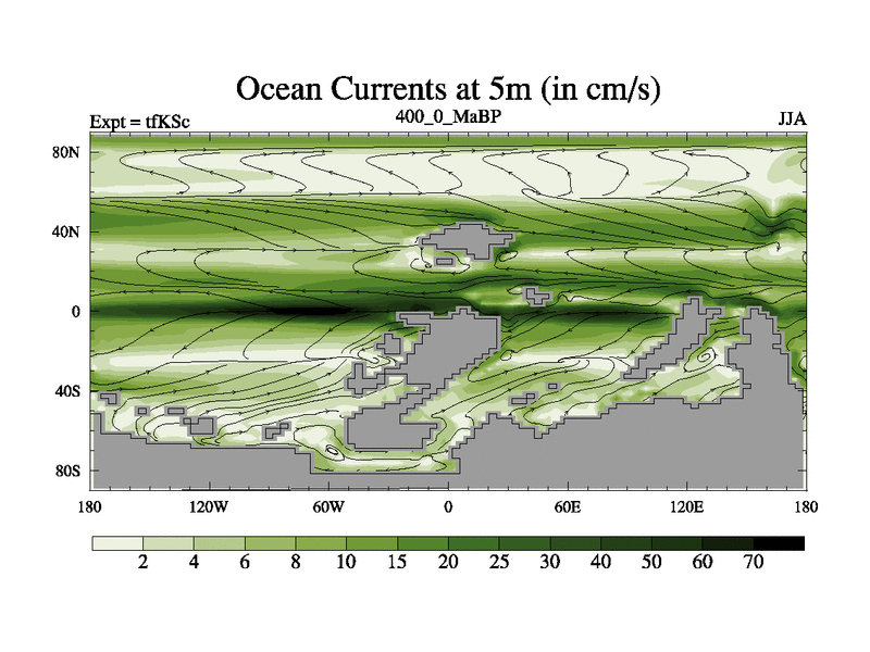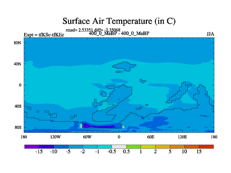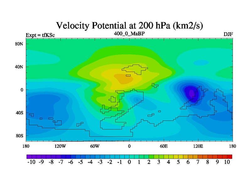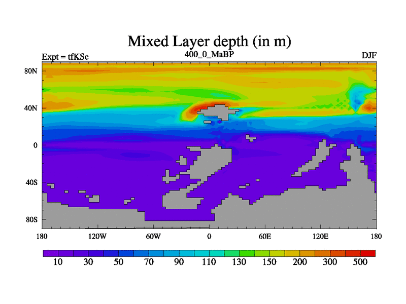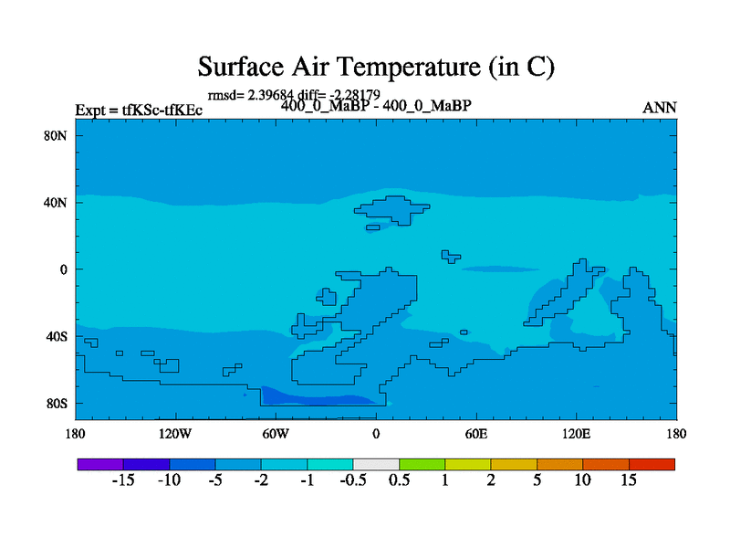 This is the 400.0 Ma simulation using the Scotese palaeogeographies and revised CCN etc. This version has islands and smoothing and desert albedo included. Tuned CO2 to give Scotese temperatures. Started from end of tfKEc.
