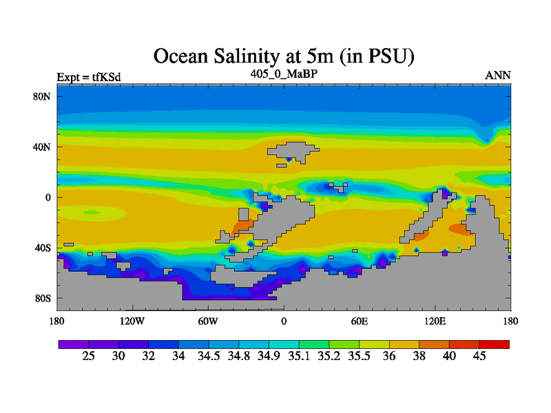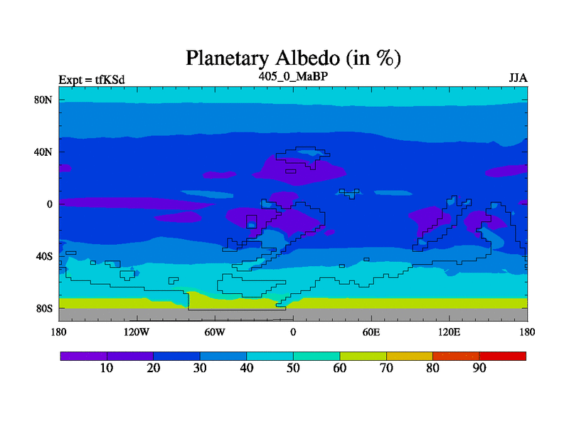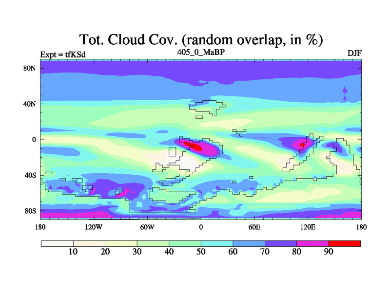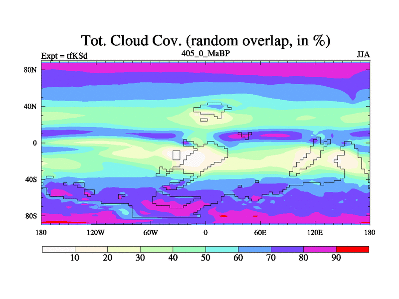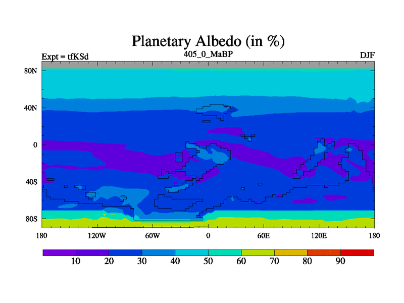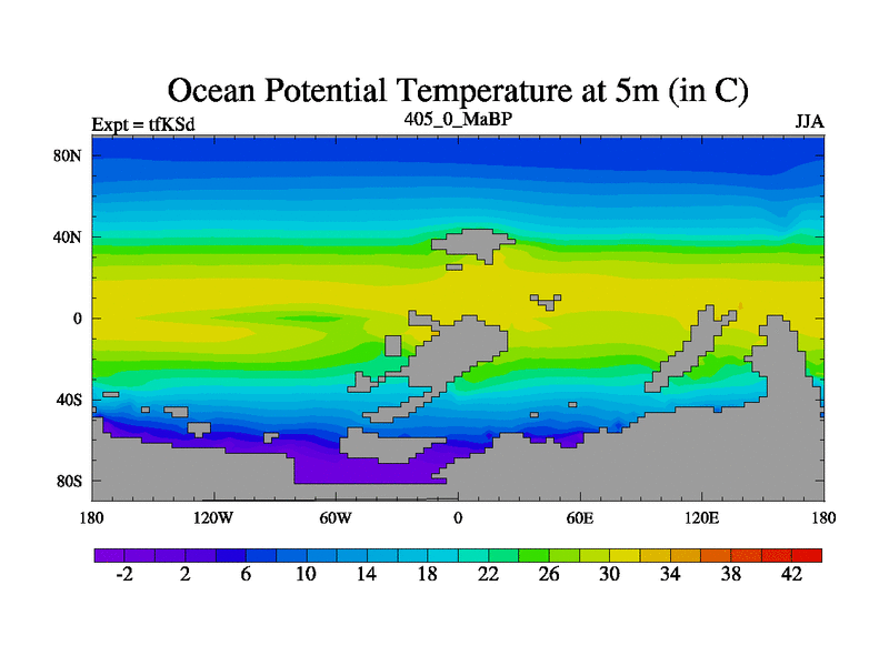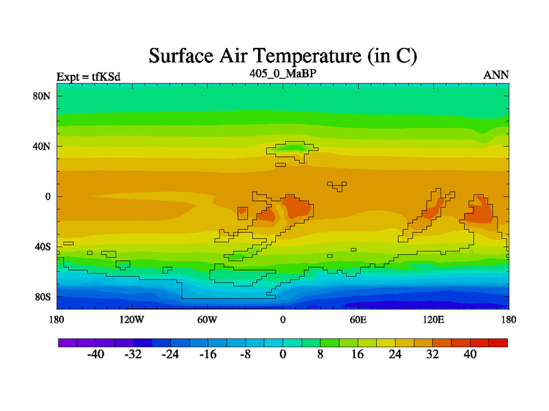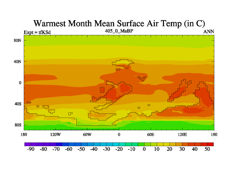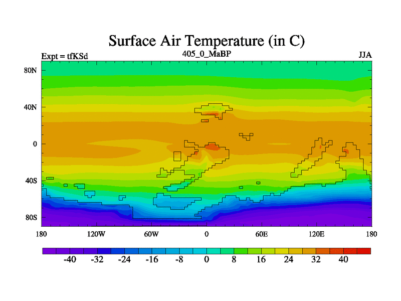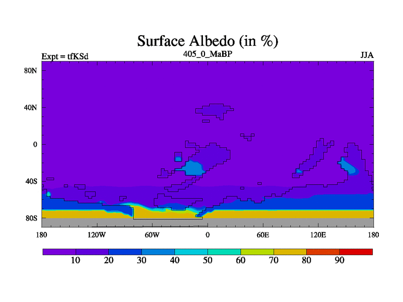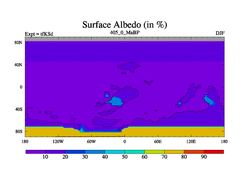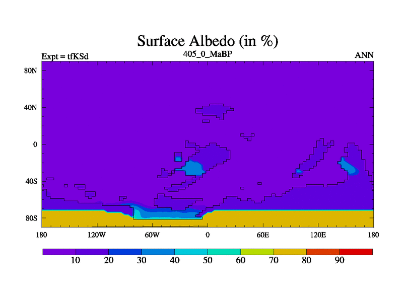 This is the 405.0 Ma simulation using the Scotese palaeogeographies and revised CCN etc. This version has islands and smoothing and desert albedo included. Tuned CO2 to give Scotese temperatures. Started from end of tfKEd.