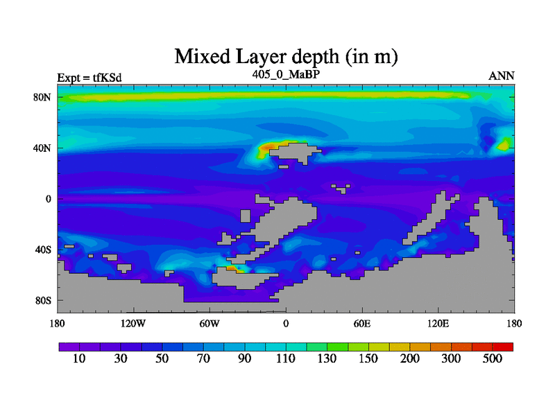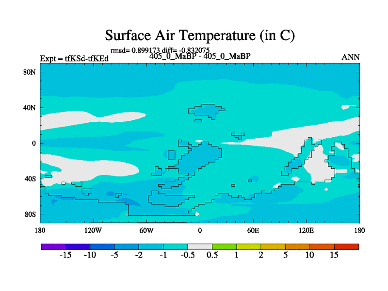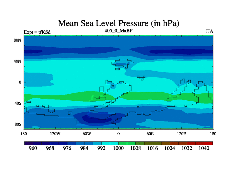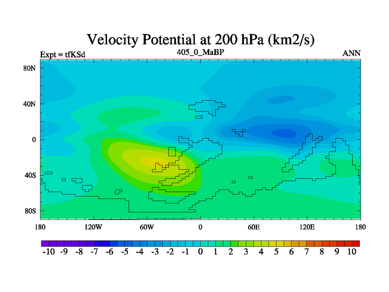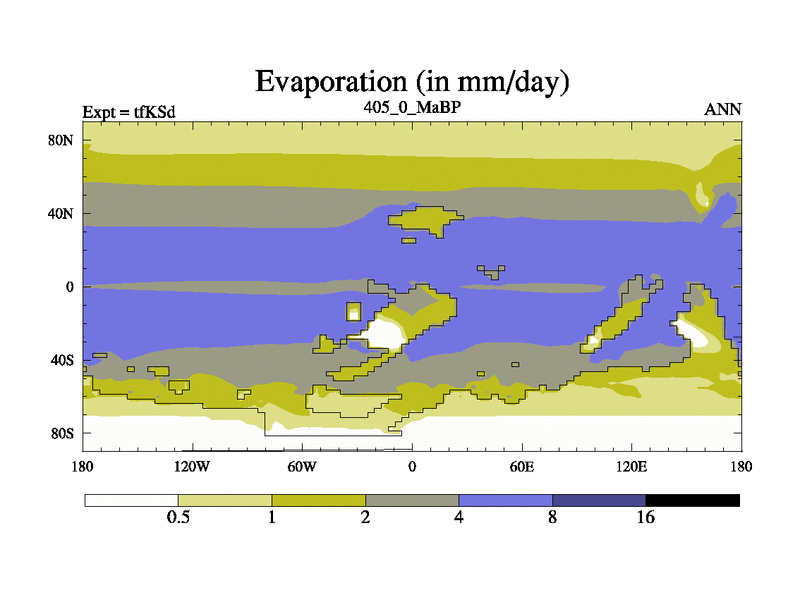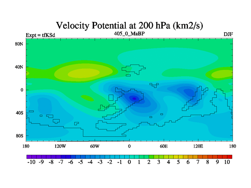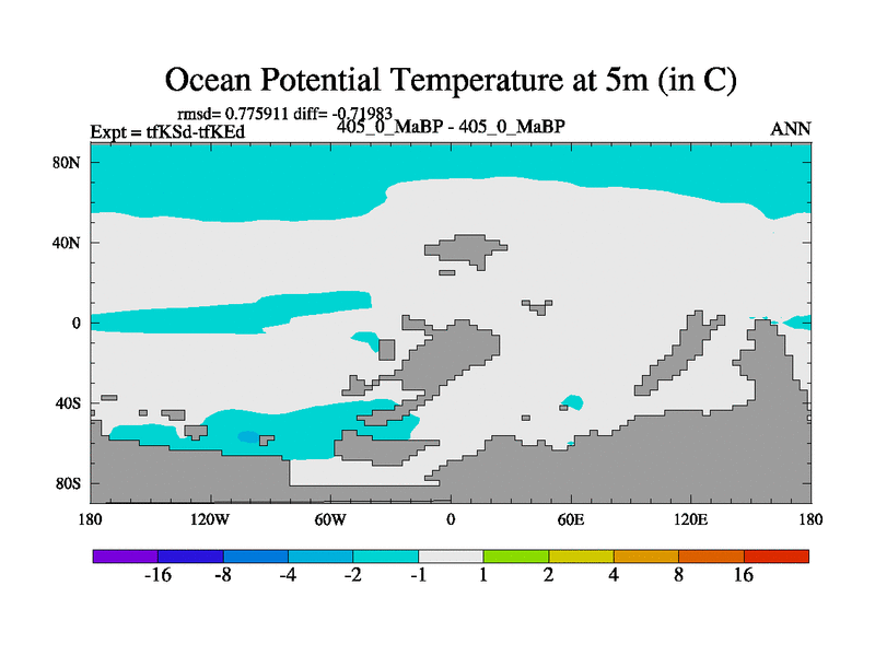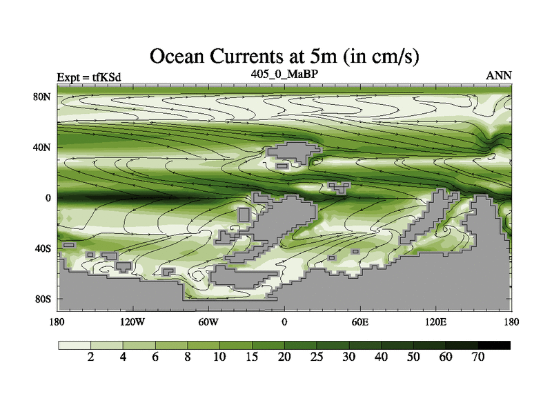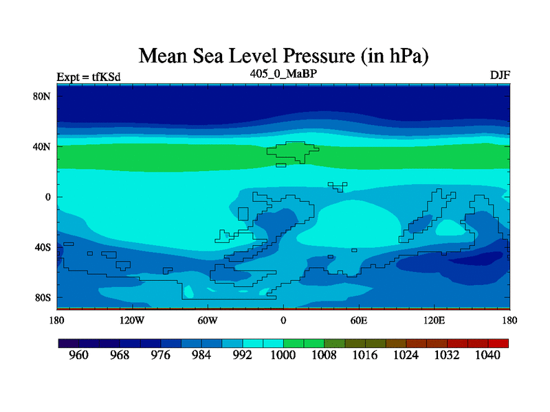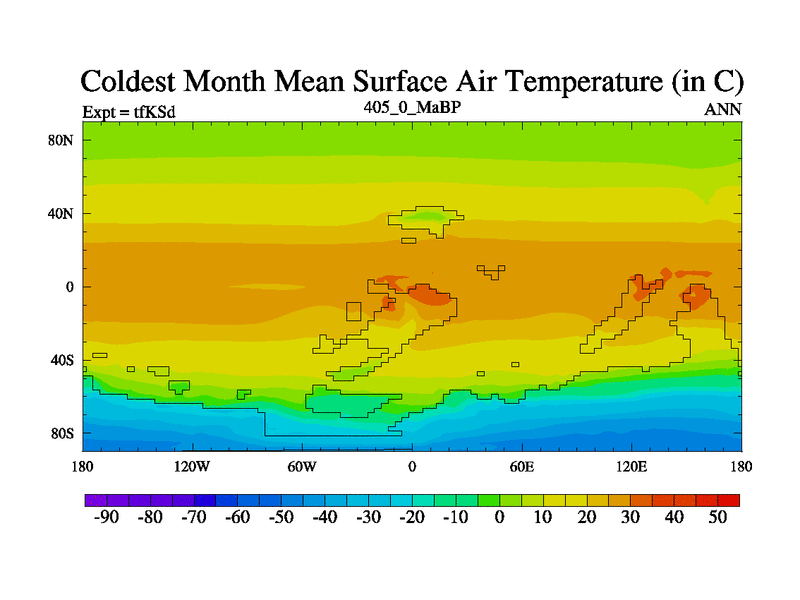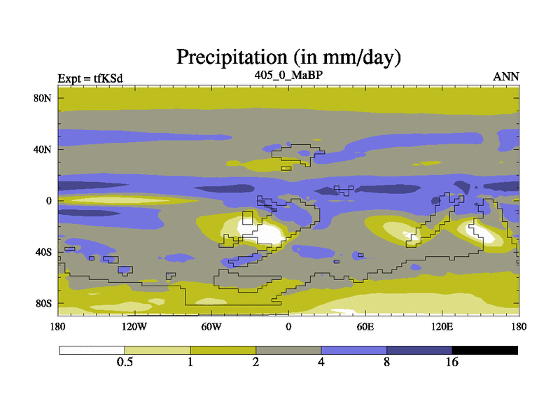 This is the 405.0 Ma simulation using the Scotese palaeogeographies and revised CCN etc. This version has islands and smoothing and desert albedo included. Tuned CO2 to give Scotese temperatures. Started from end of tfKEd.