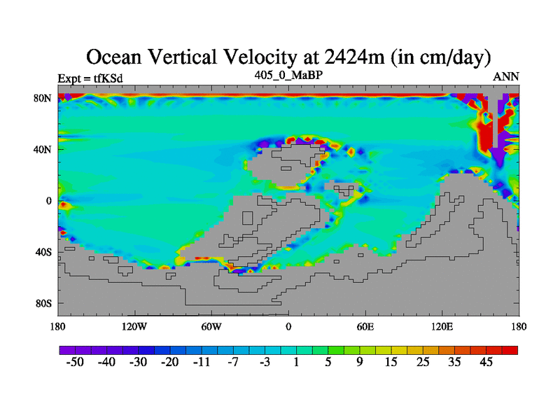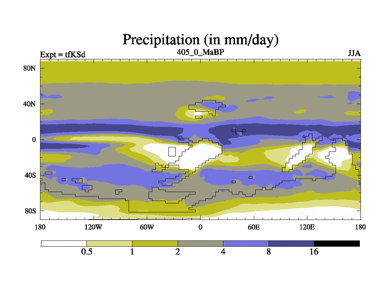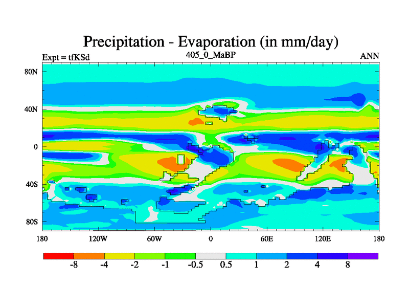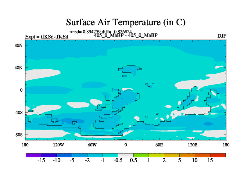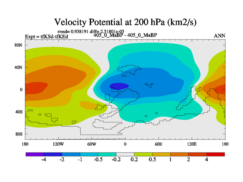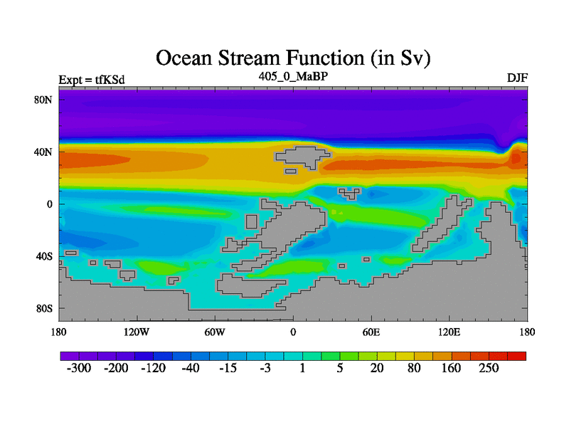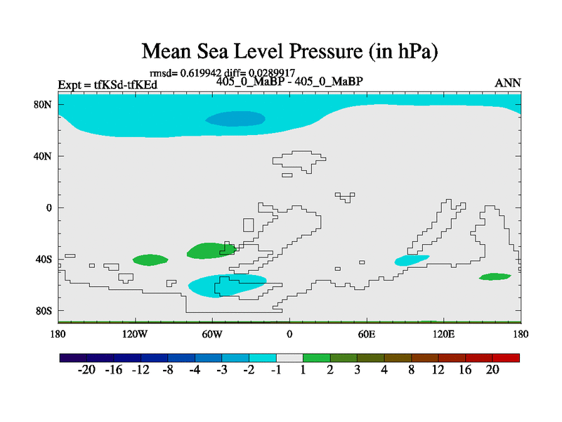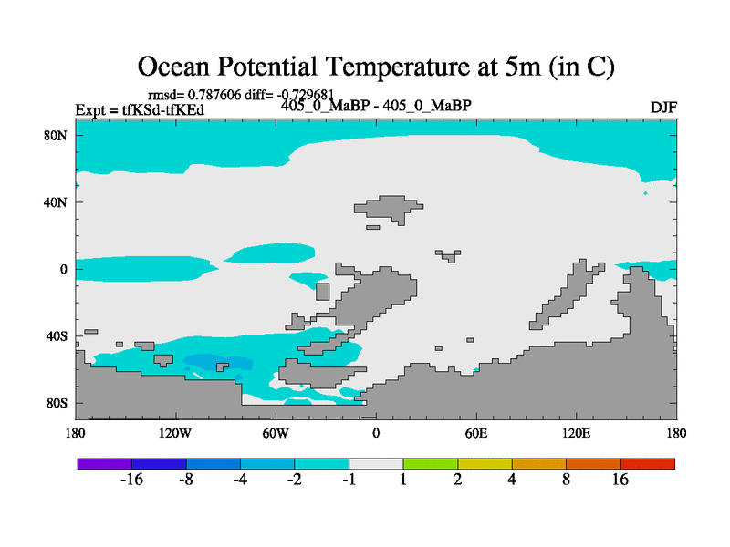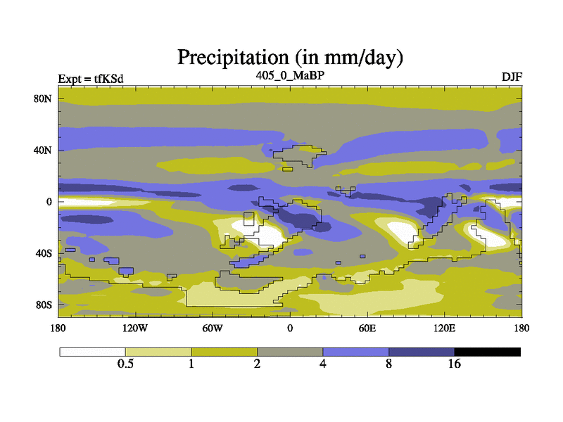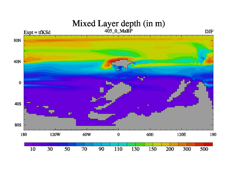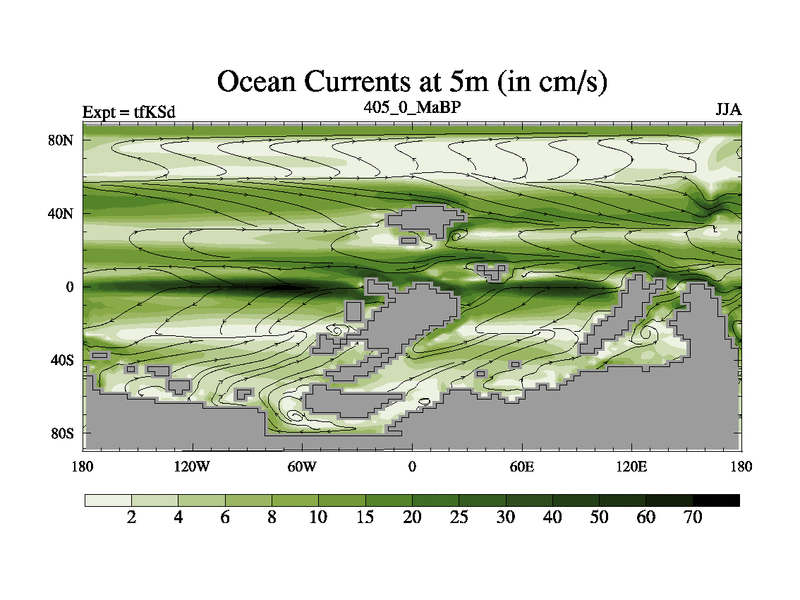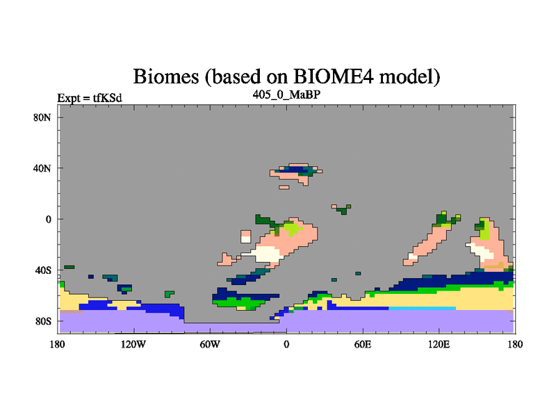 This is the 405.0 Ma simulation using the Scotese palaeogeographies and revised CCN etc. This version has islands and smoothing and desert albedo included. Tuned CO2 to give Scotese temperatures. Started from end of tfKEd.