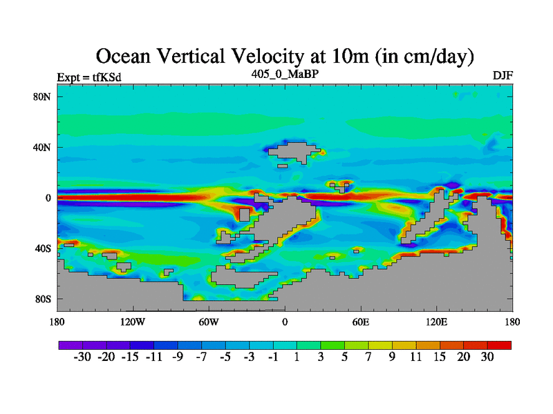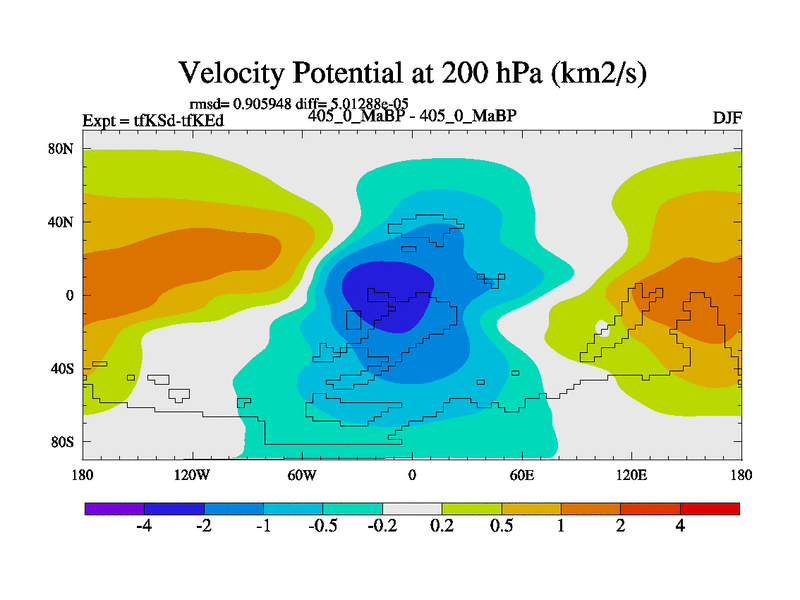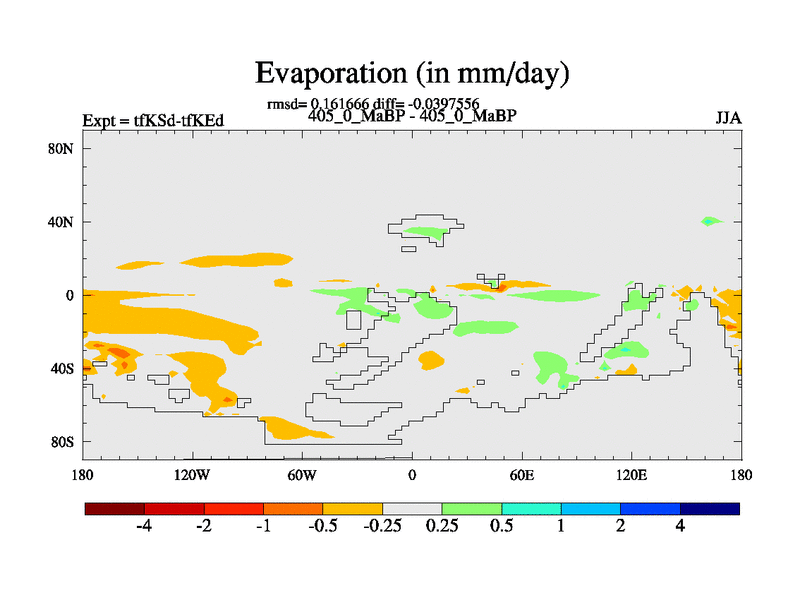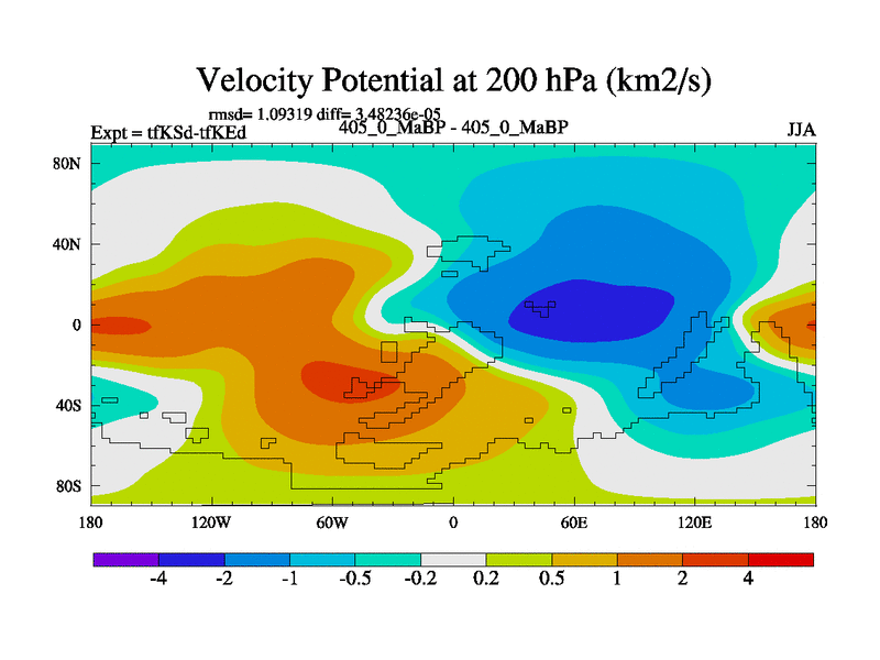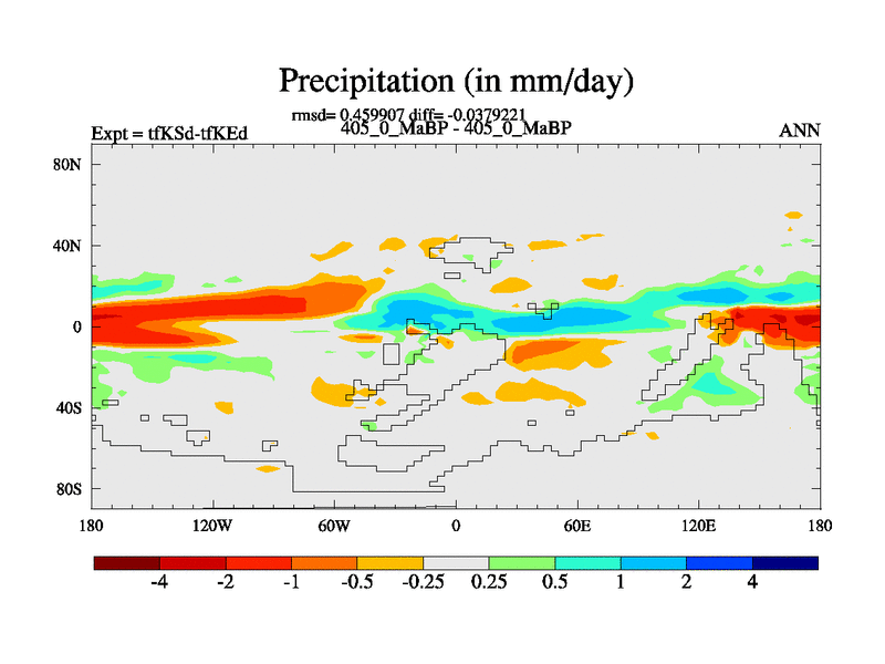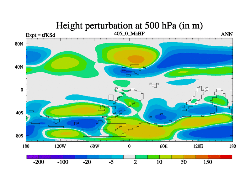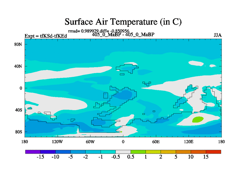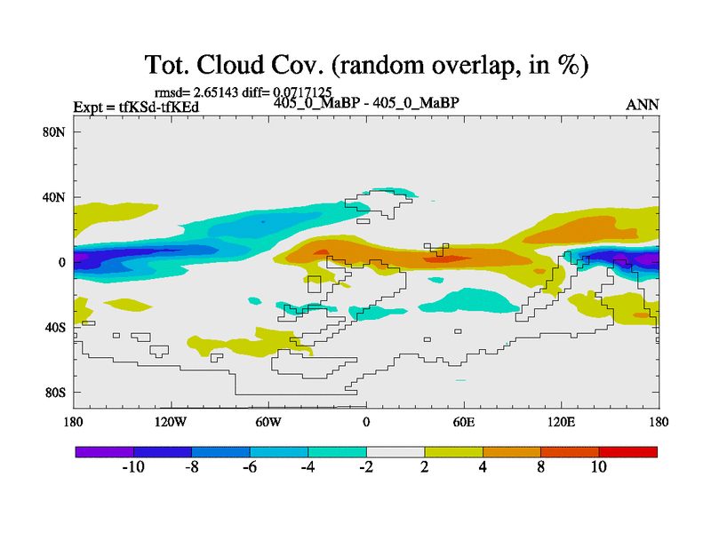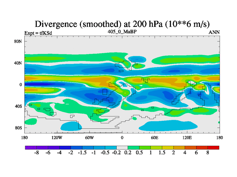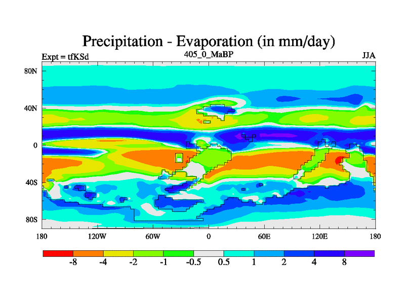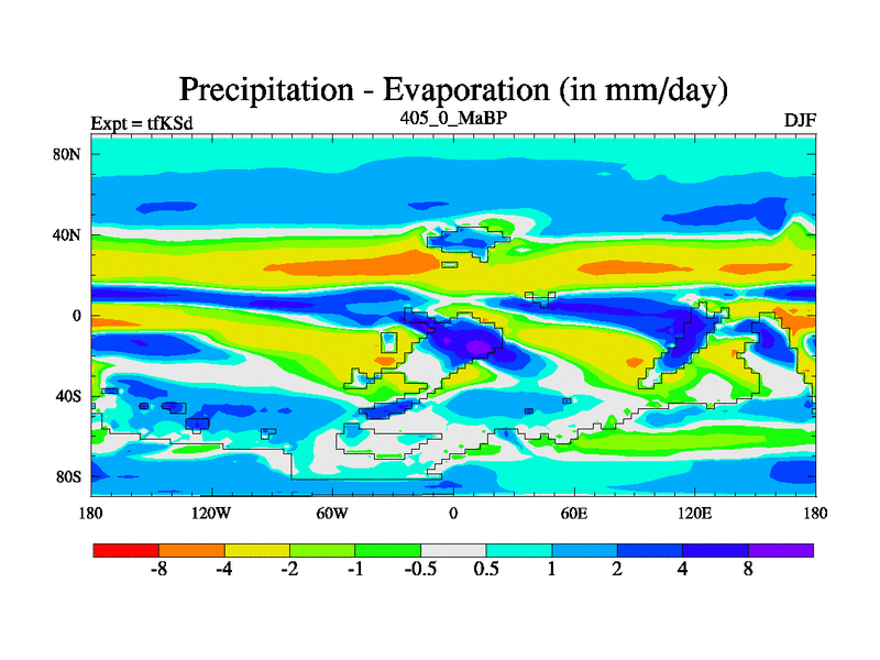 This is the 405.0 Ma simulation using the Scotese palaeogeographies and revised CCN etc. This version has islands and smoothing and desert albedo included. Tuned CO2 to give Scotese temperatures. Started from end of tfKEd.