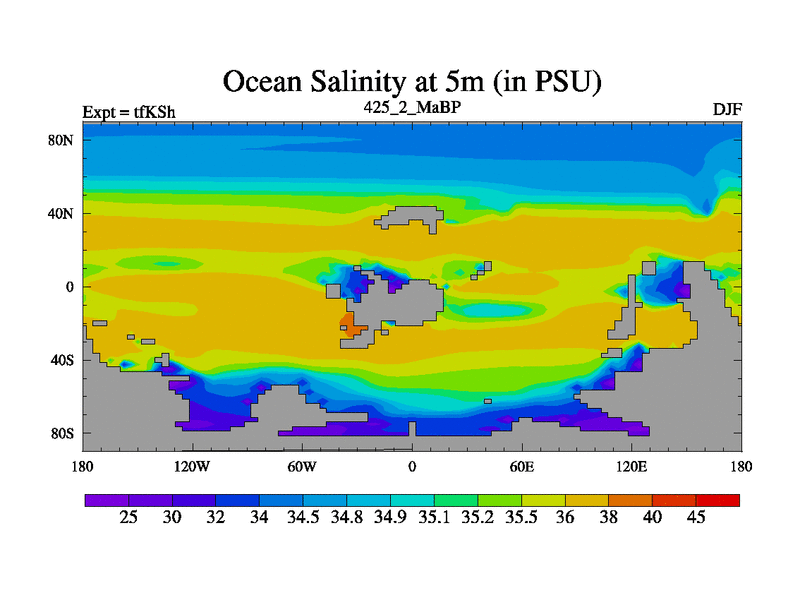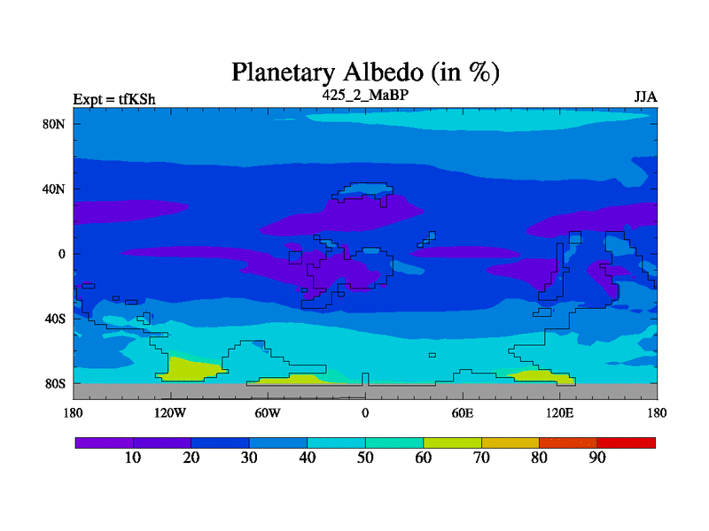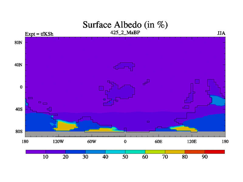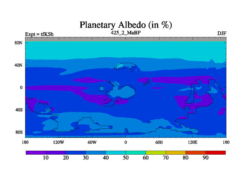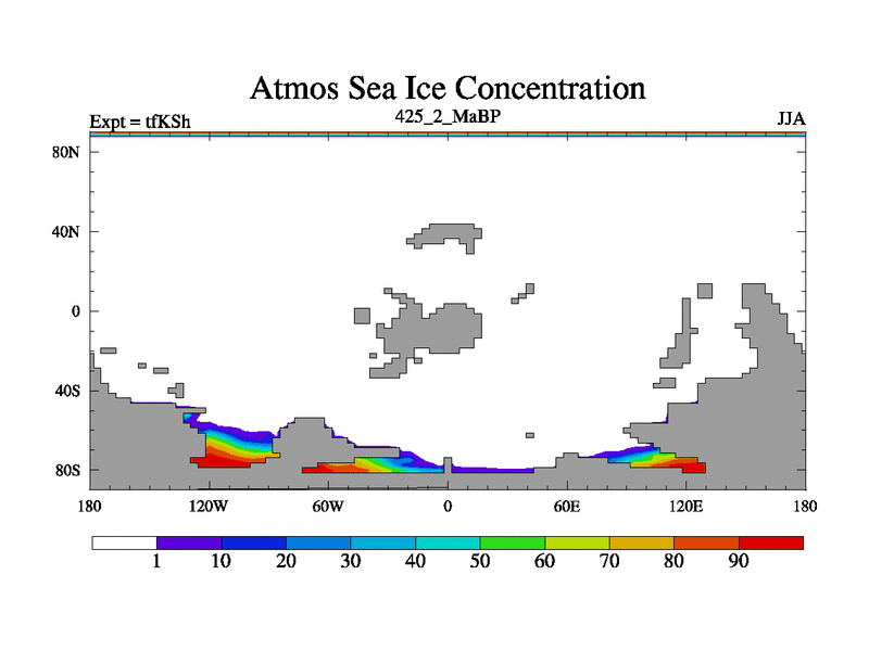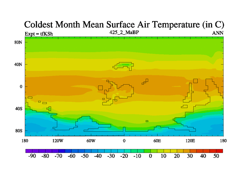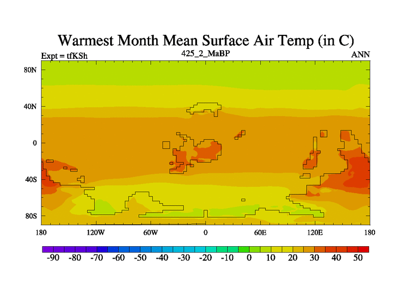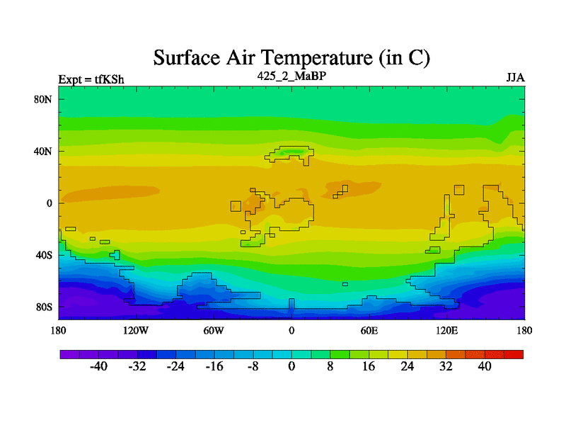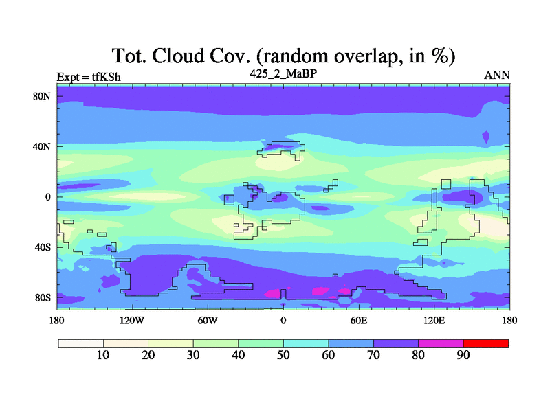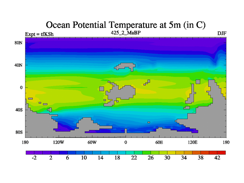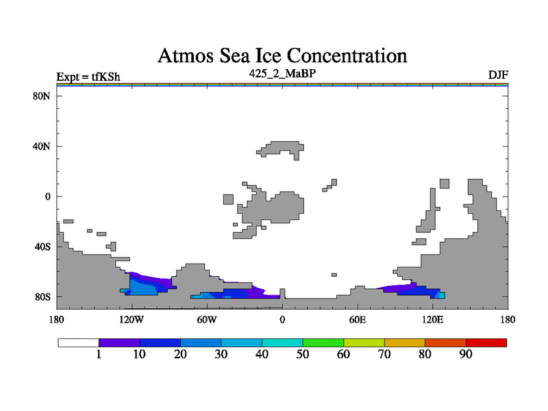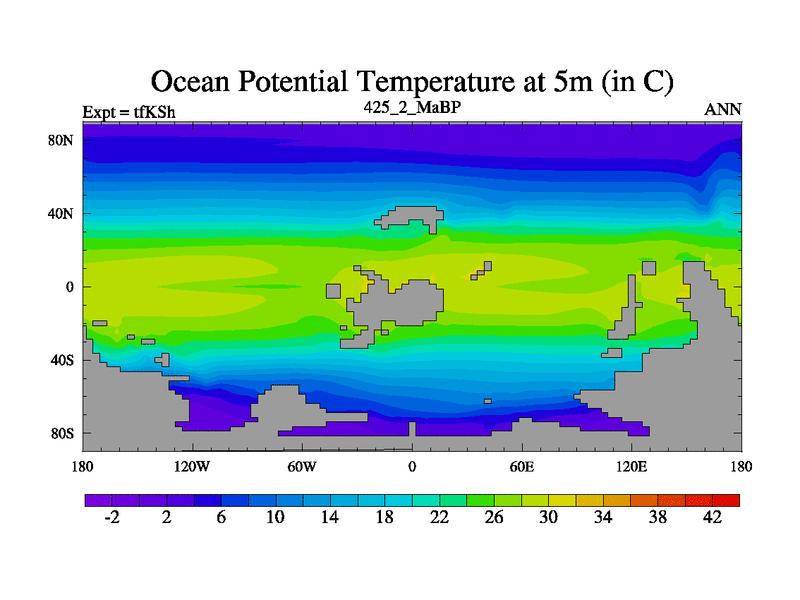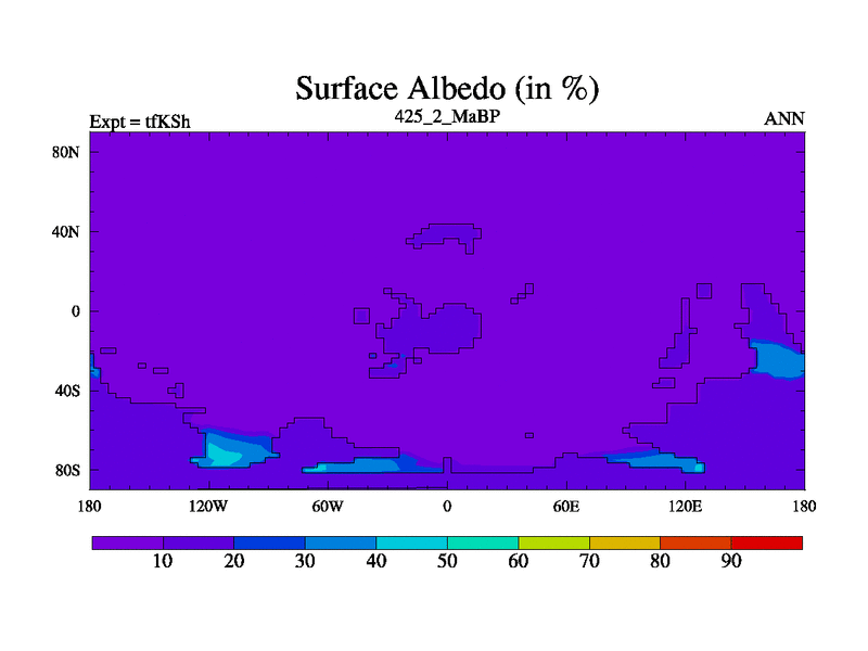 This is the 425.2 Ma simulation using the Scotese palaeogeographies and revised CCN etc. This version has islands and smoothing and desert albedo included. Tuned CO2 to give Scotese temperatures. Started from end of tfKEh.