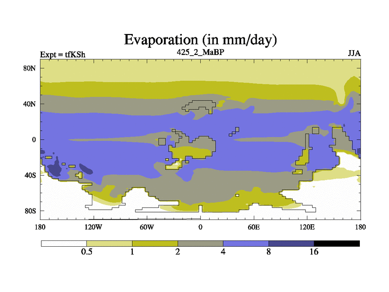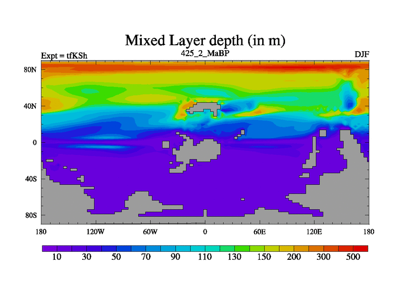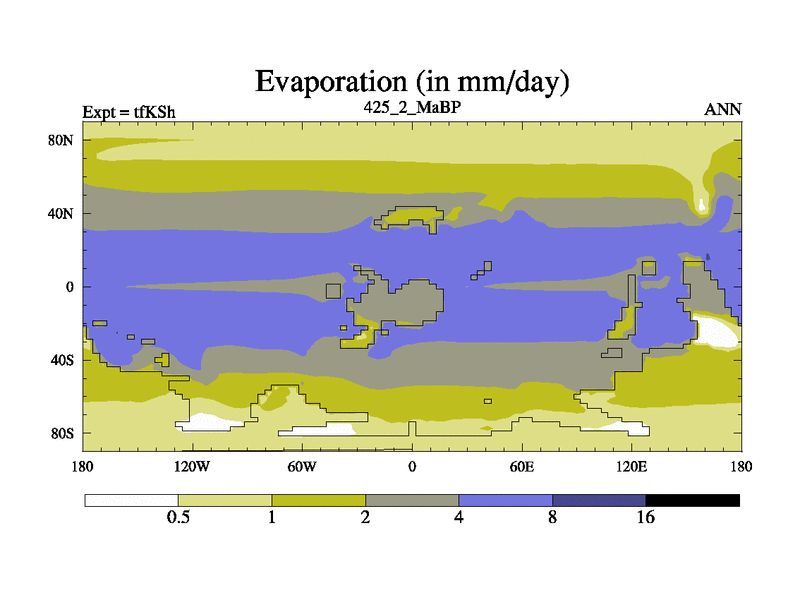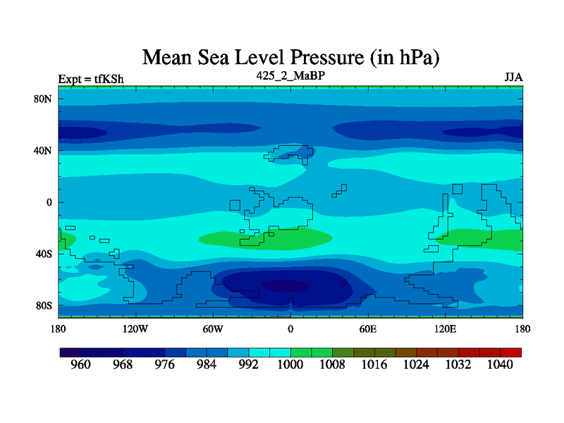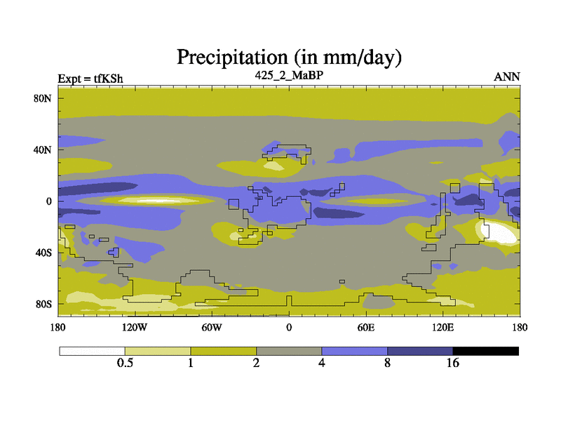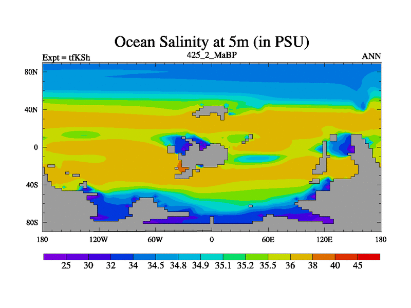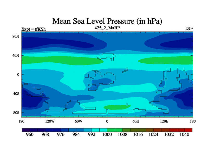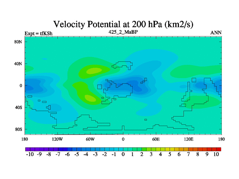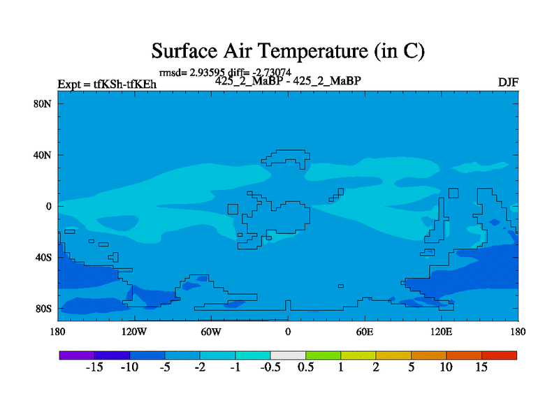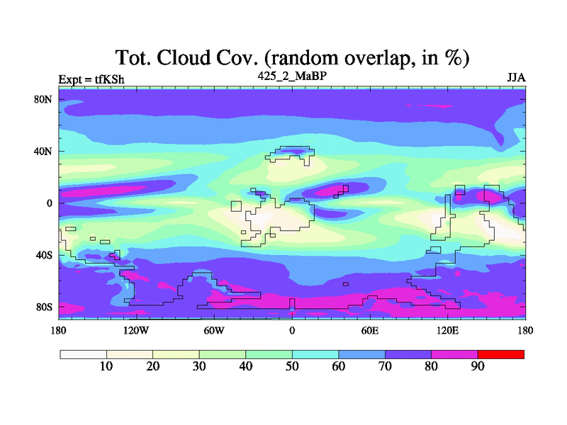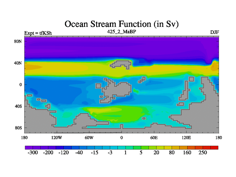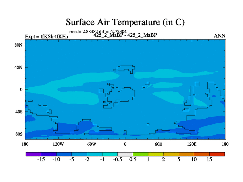 This is the 425.2 Ma simulation using the Scotese palaeogeographies and revised CCN etc. This version has islands and smoothing and desert albedo included. Tuned CO2 to give Scotese temperatures. Started from end of tfKEh.