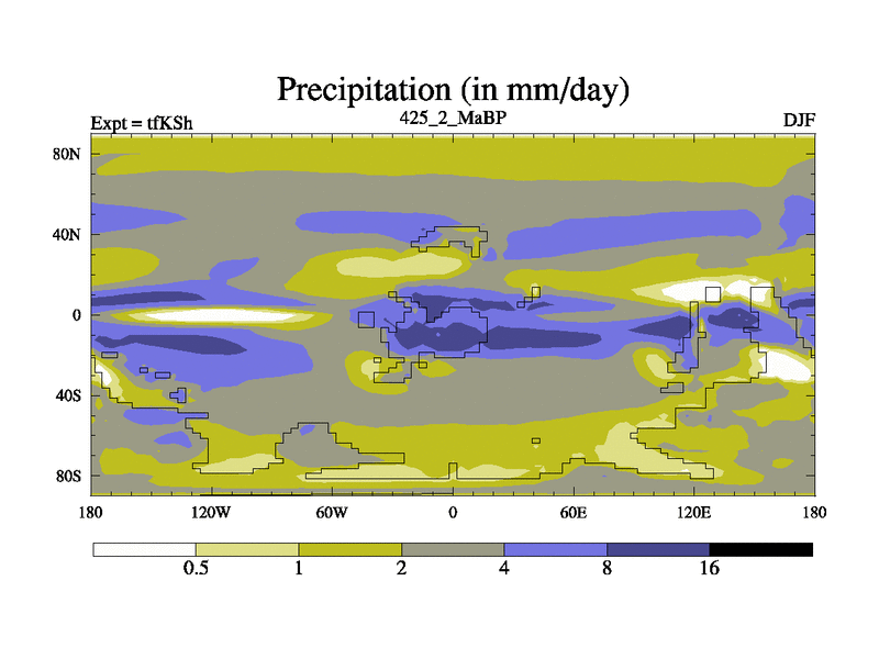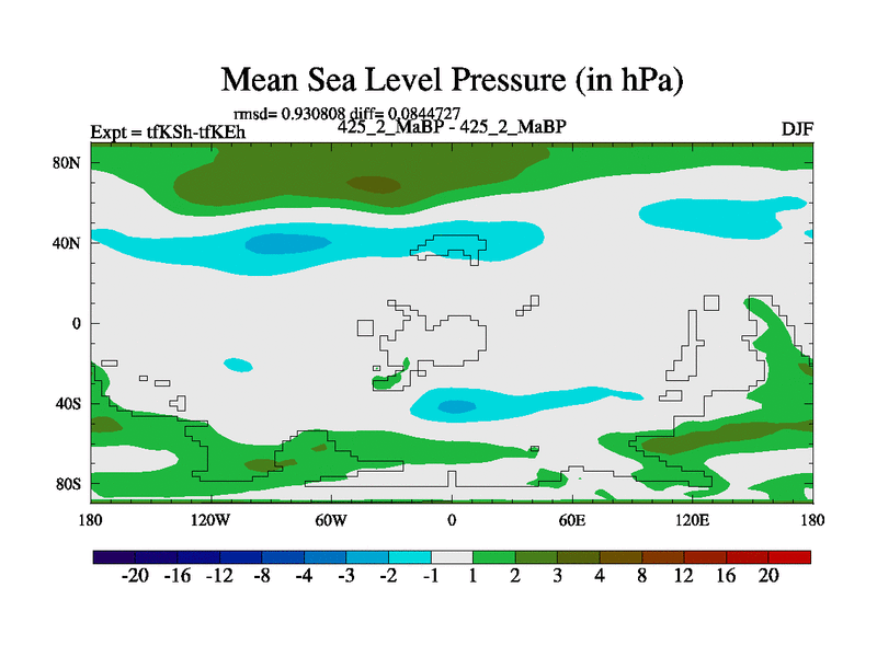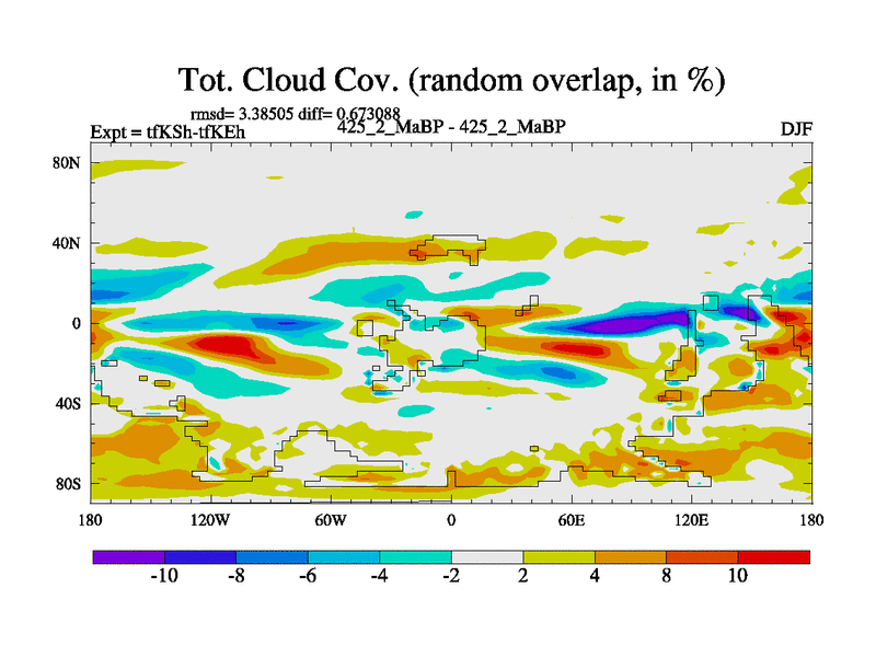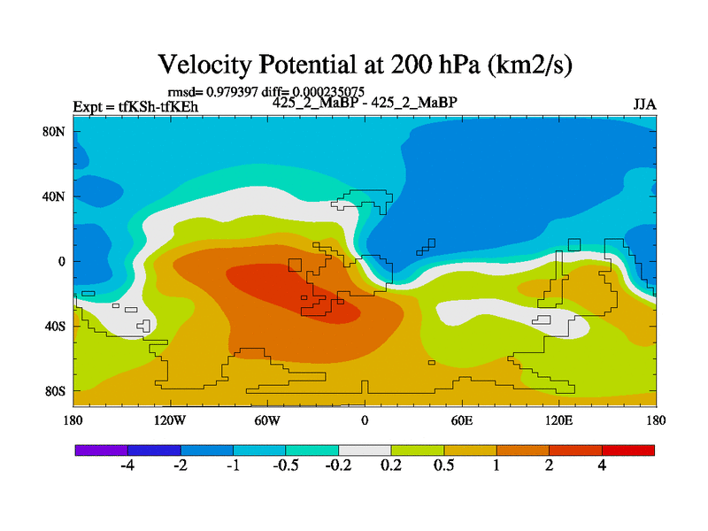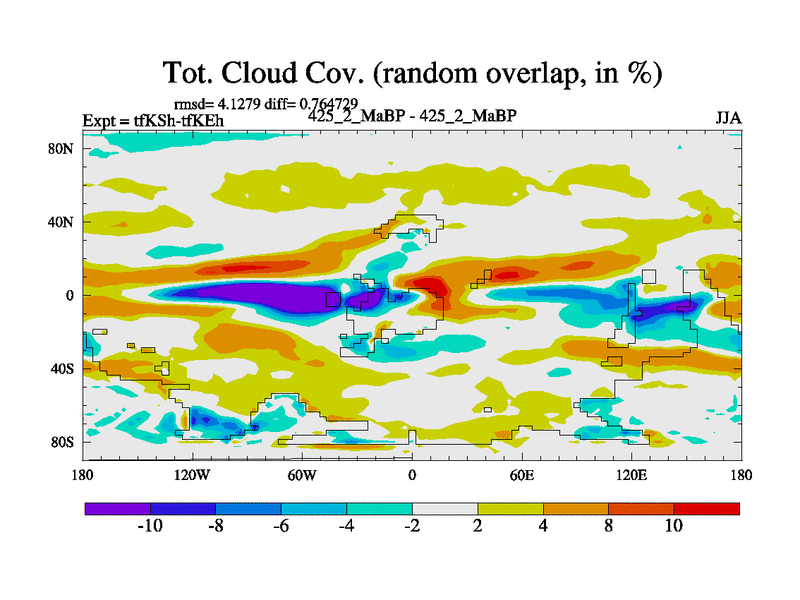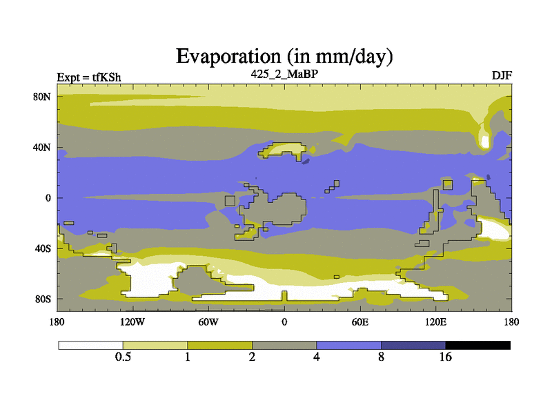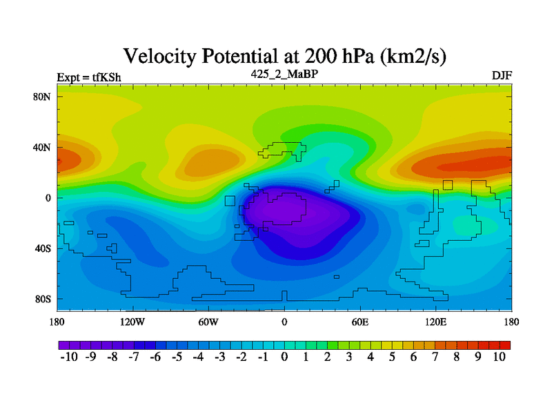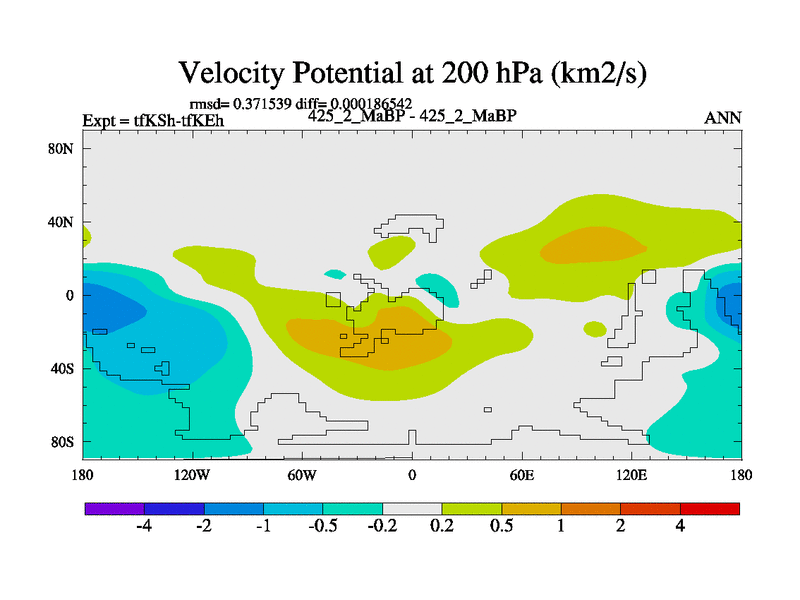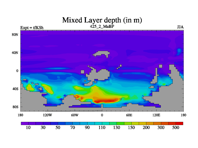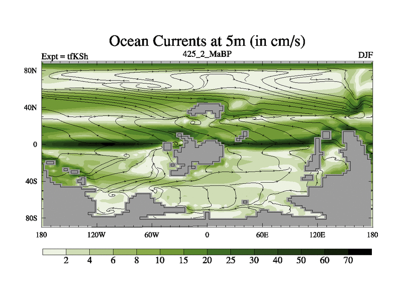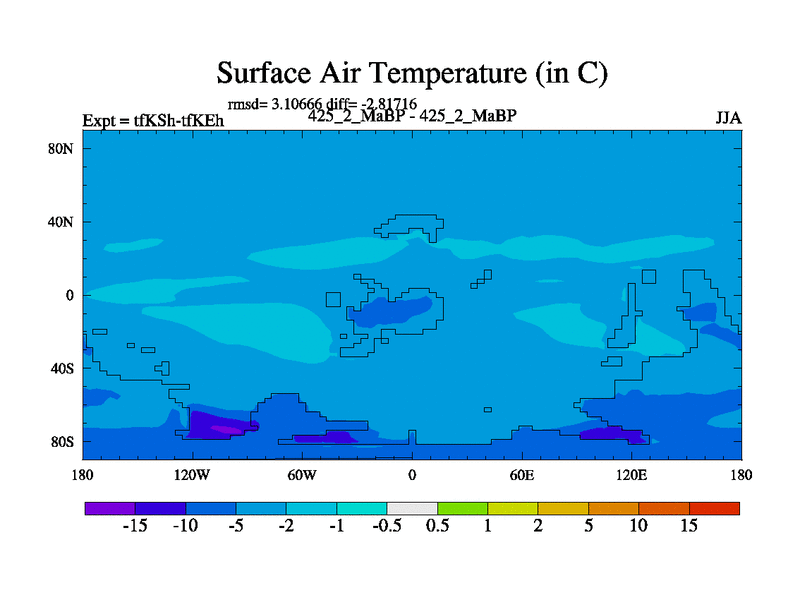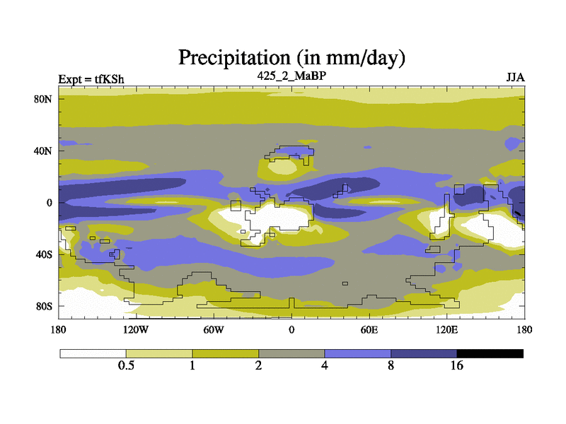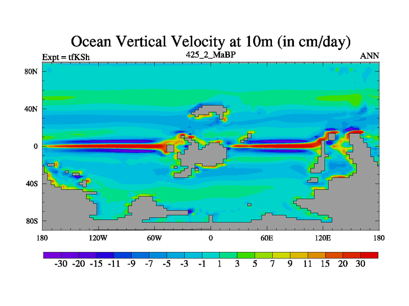 This is the 425.2 Ma simulation using the Scotese palaeogeographies and revised CCN etc. This version has islands and smoothing and desert albedo included. Tuned CO2 to give Scotese temperatures. Started from end of tfKEh.