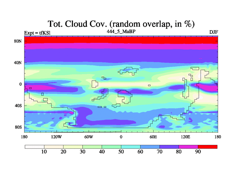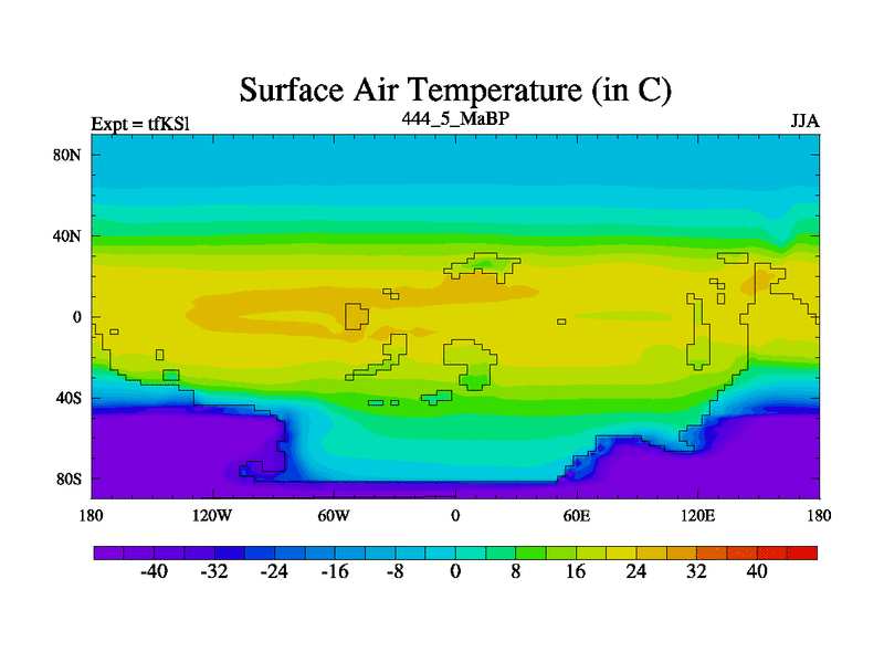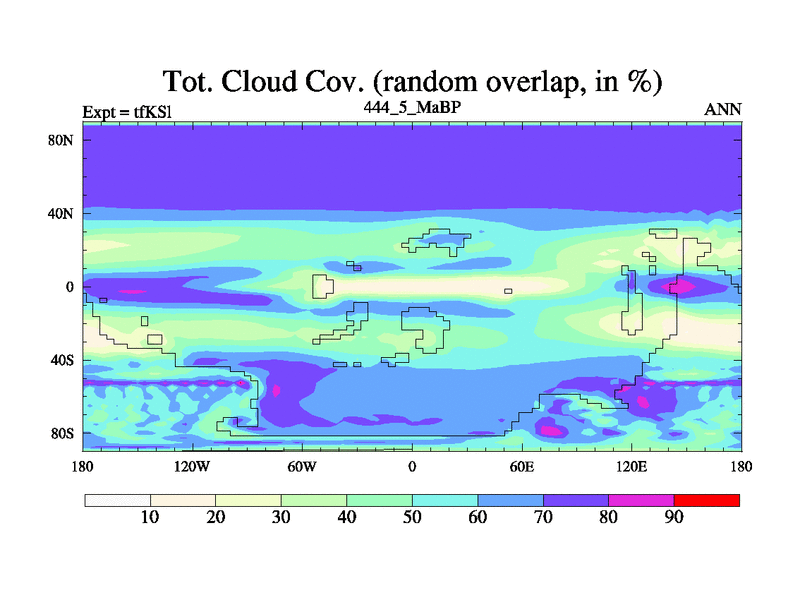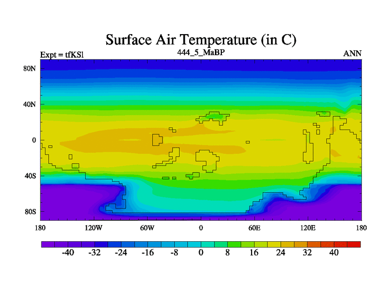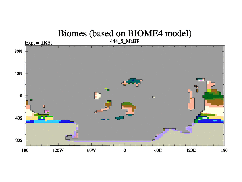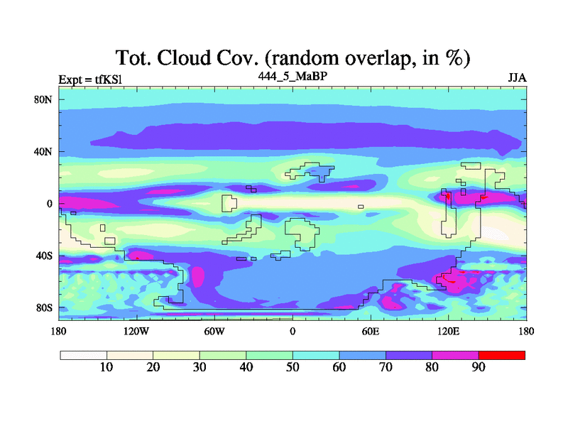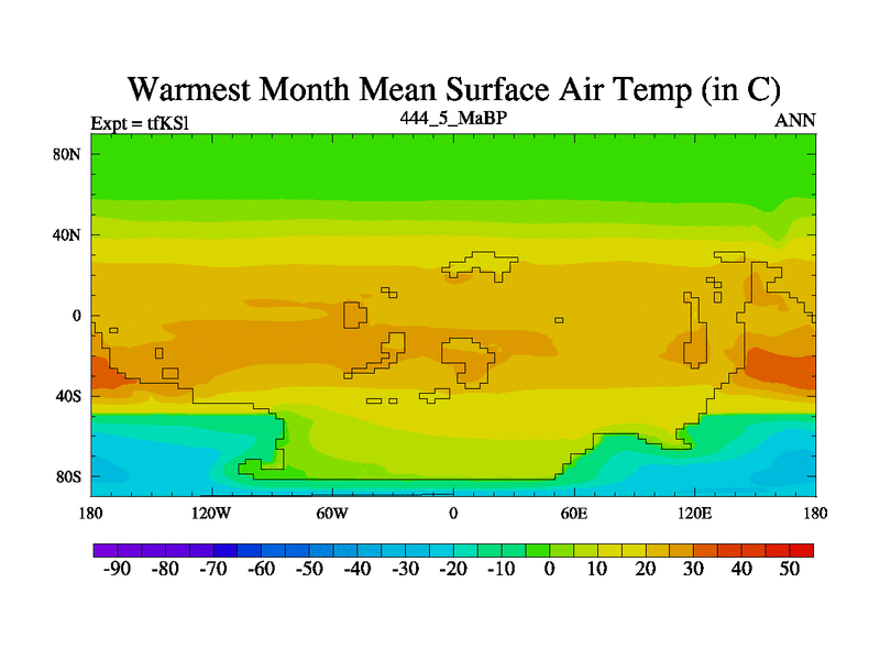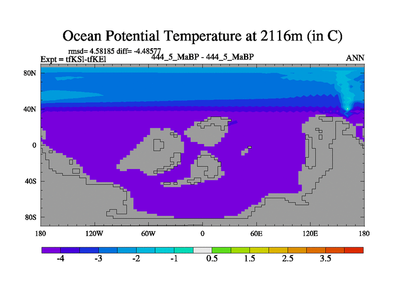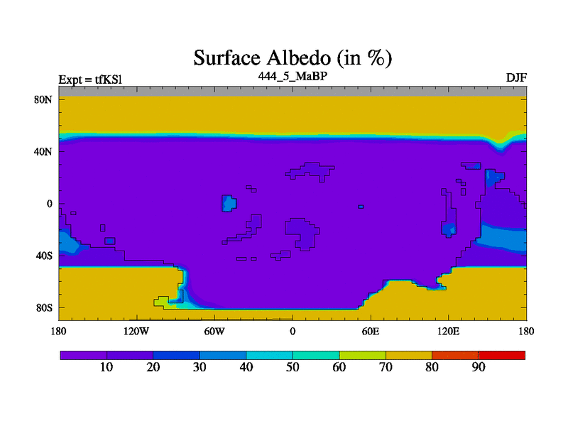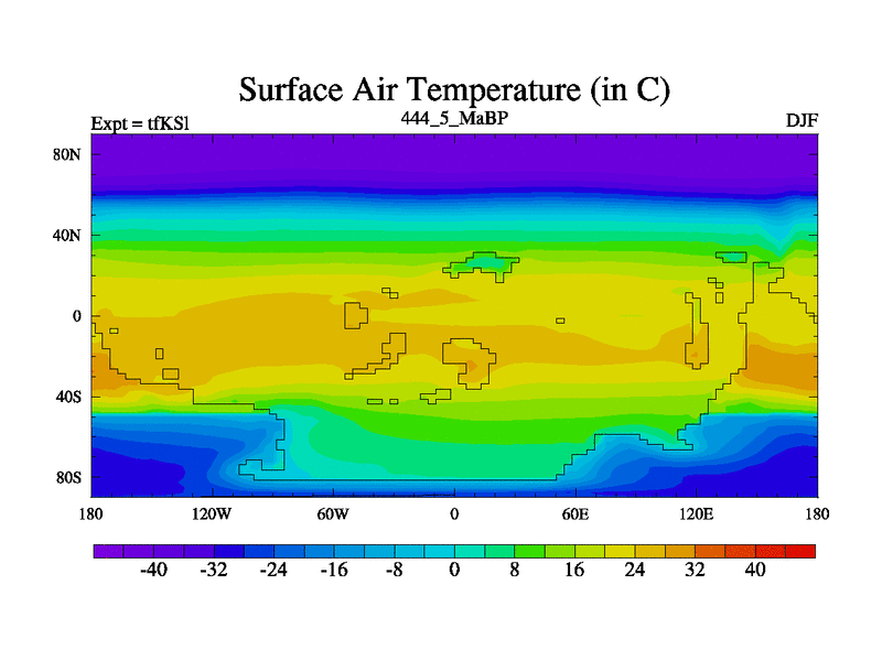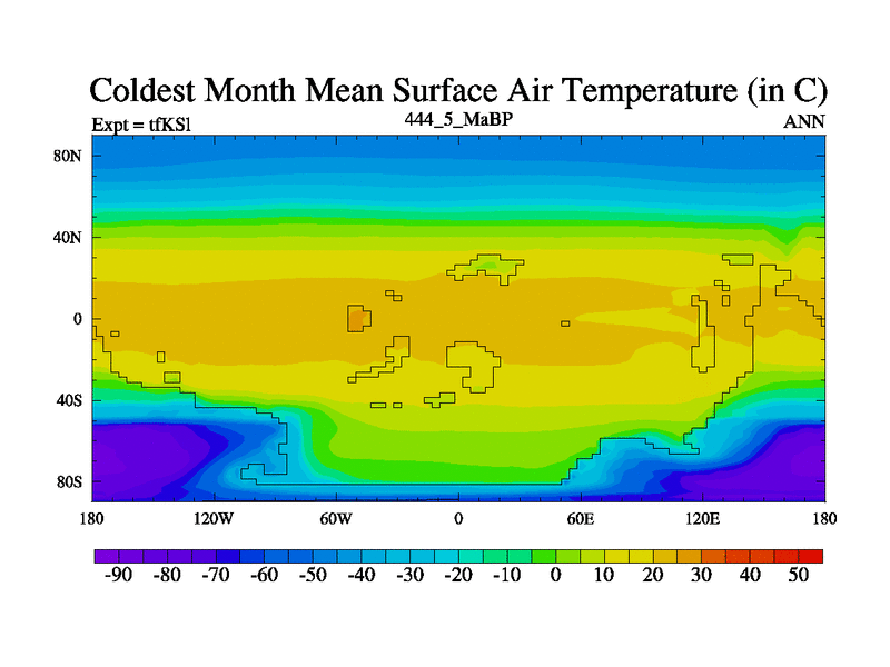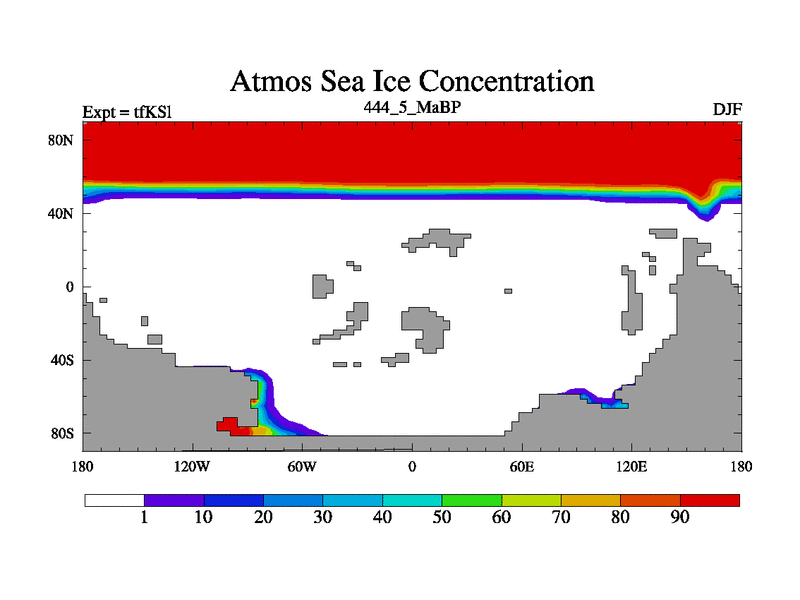 This is the 444.5 Ma simulation using the Scotese palaeogeographies and revised CCN etc. This version has islands and smoothing and desert albedo included. Tuned CO2 to give Scotese temperatures. Started from end of tfKEl.