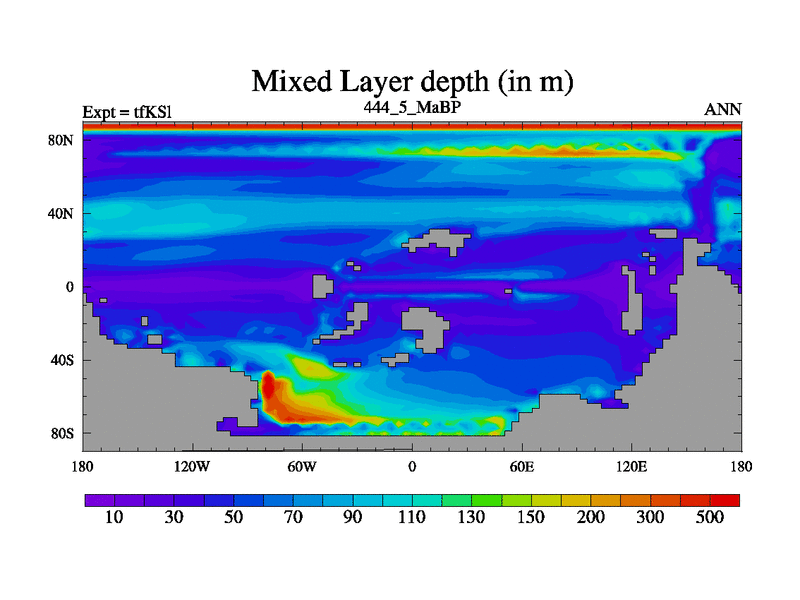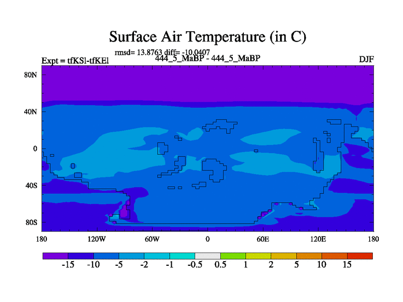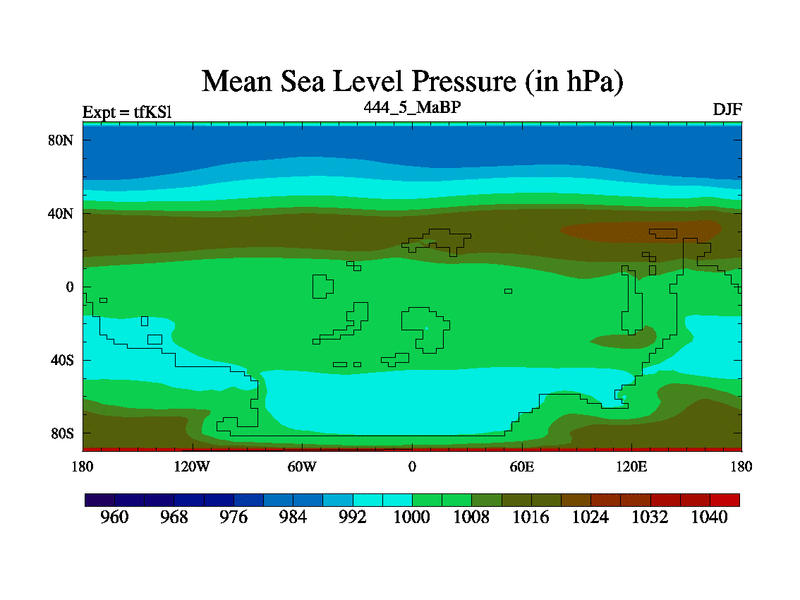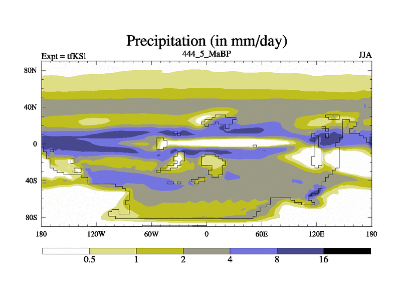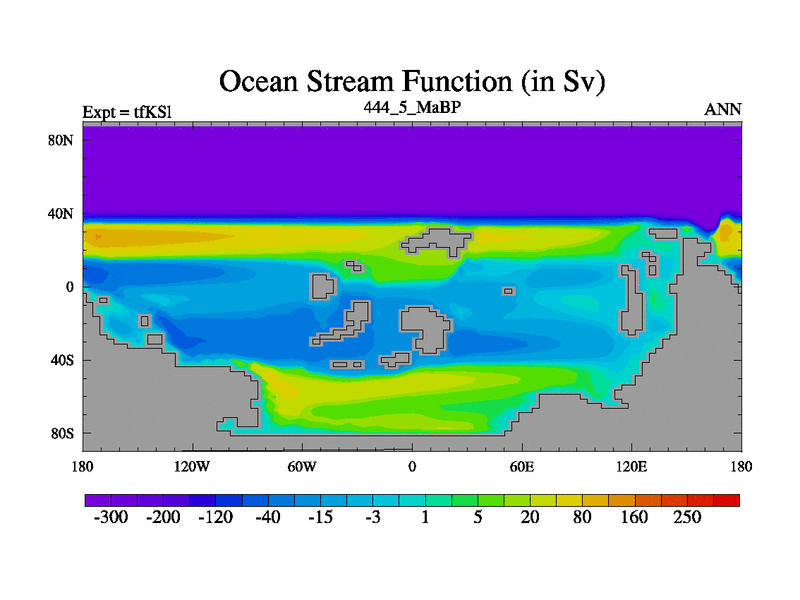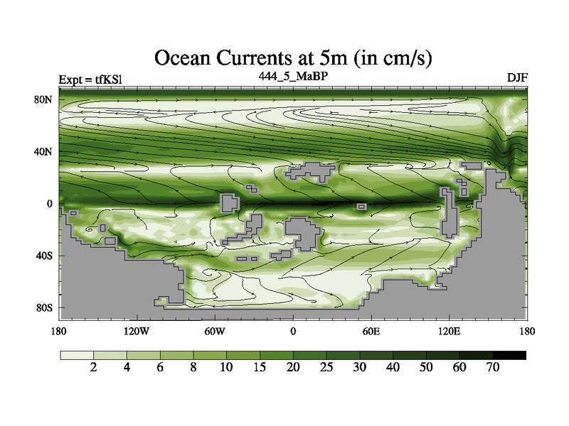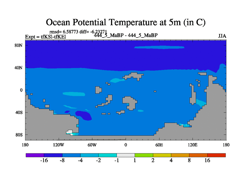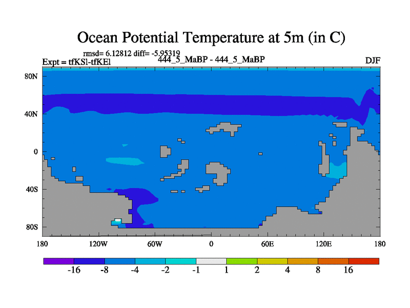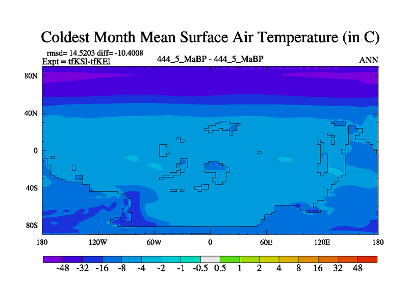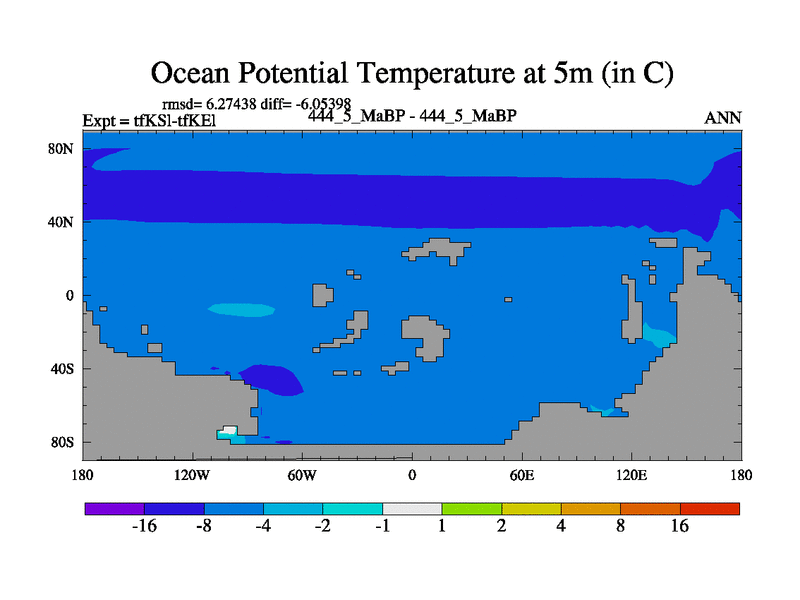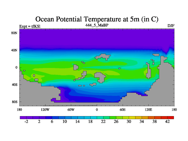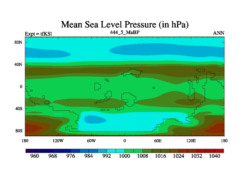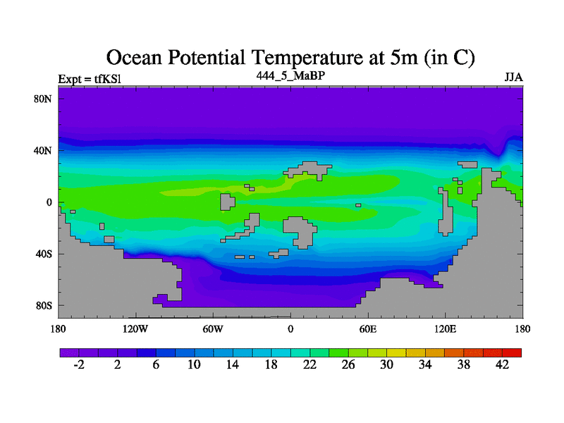 This is the 444.5 Ma simulation using the Scotese palaeogeographies and revised CCN etc. This version has islands and smoothing and desert albedo included. Tuned CO2 to give Scotese temperatures. Started from end of tfKEl.