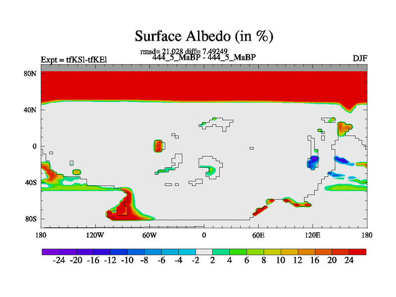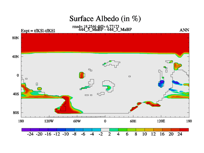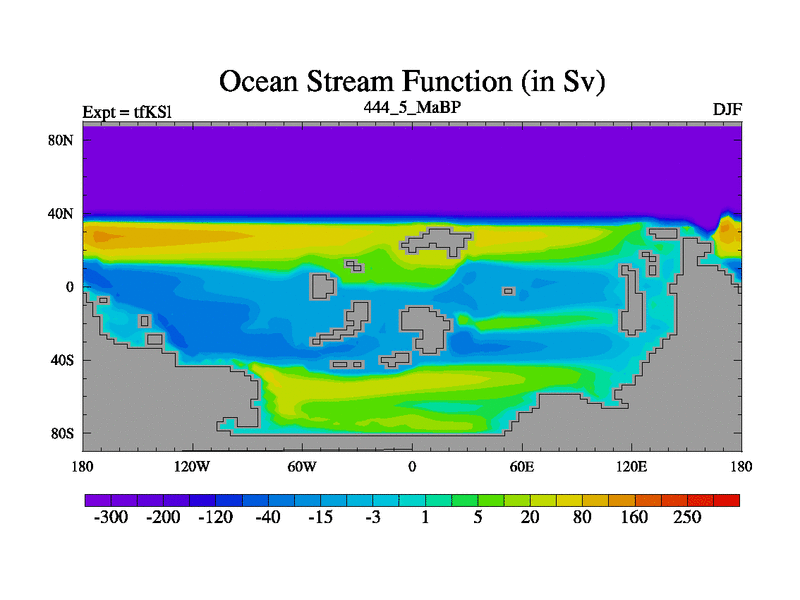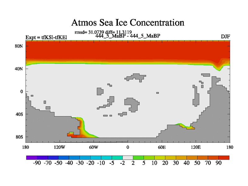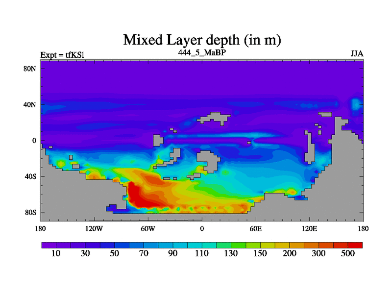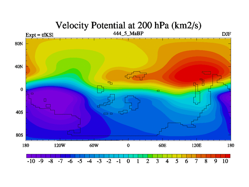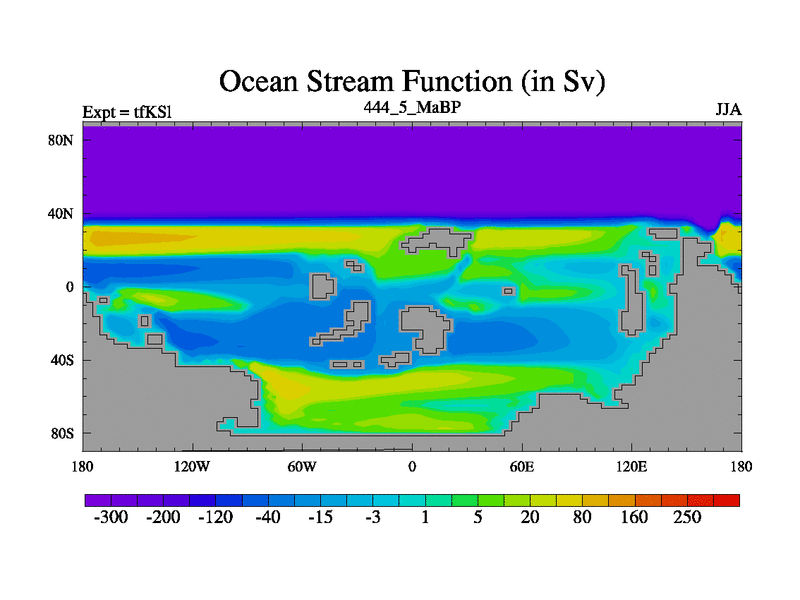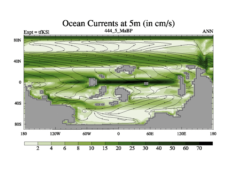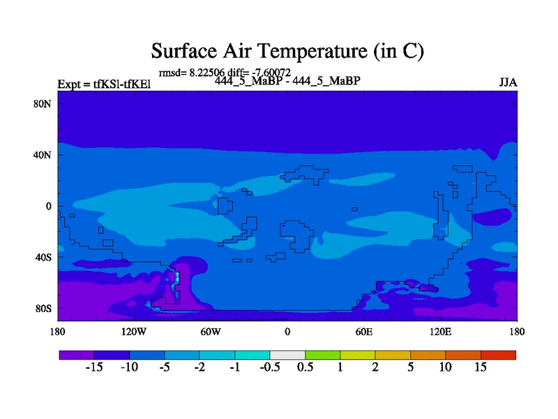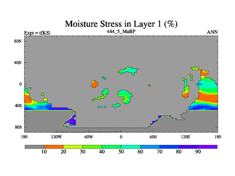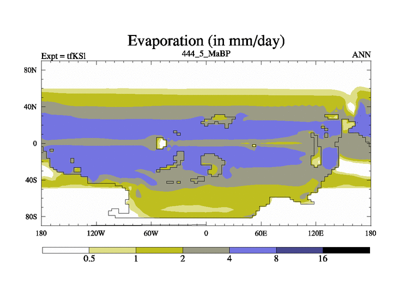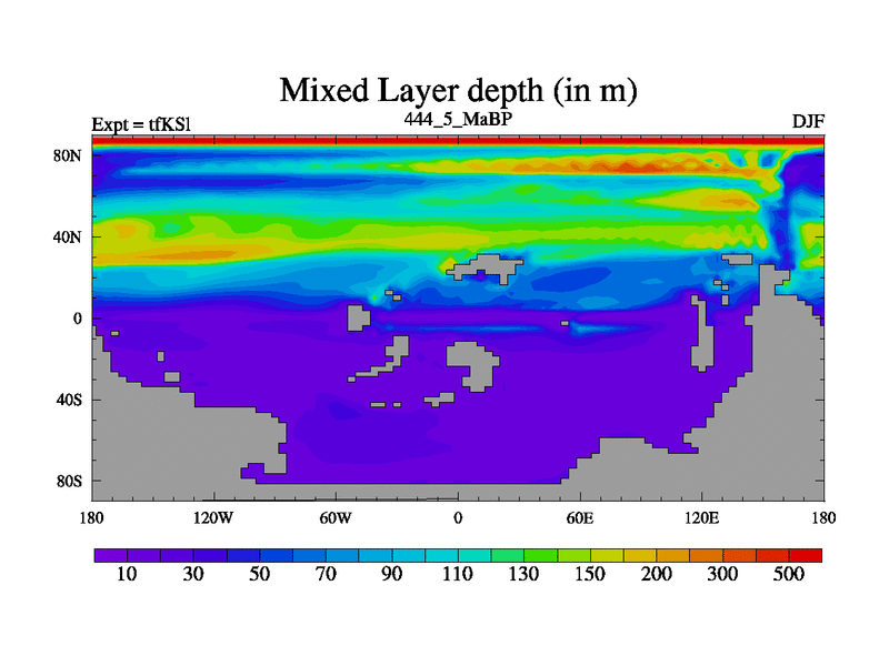 This is the 444.5 Ma simulation using the Scotese palaeogeographies and revised CCN etc. This version has islands and smoothing and desert albedo included. Tuned CO2 to give Scotese temperatures. Started from end of tfKEl.