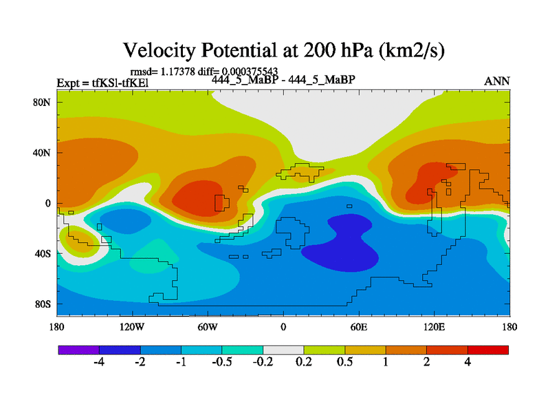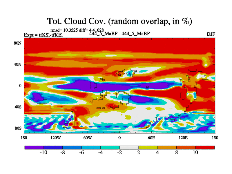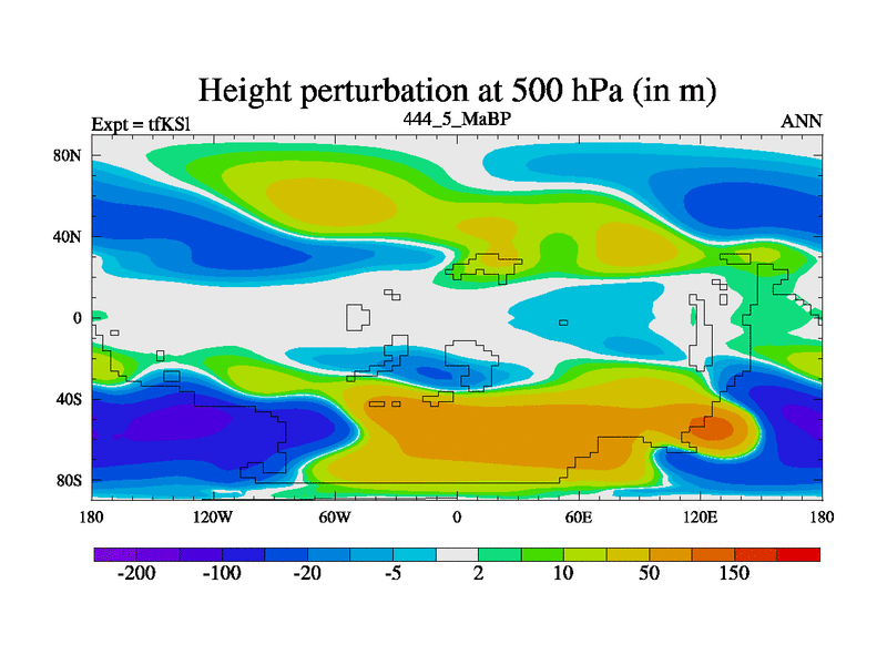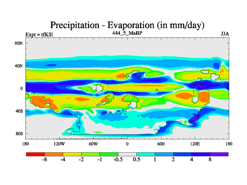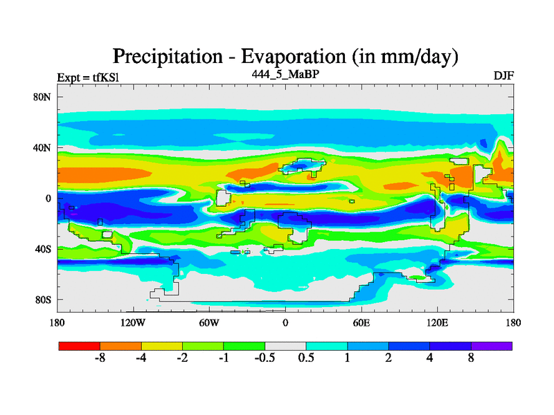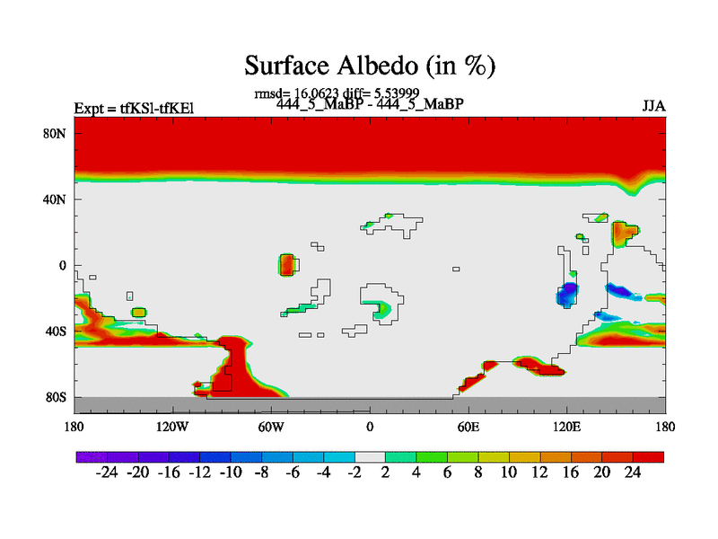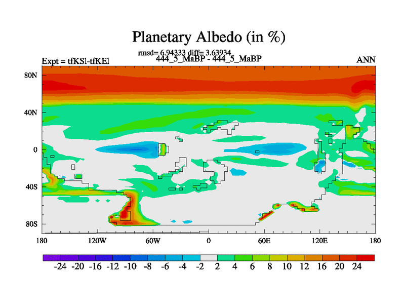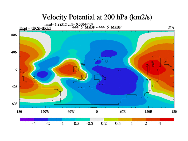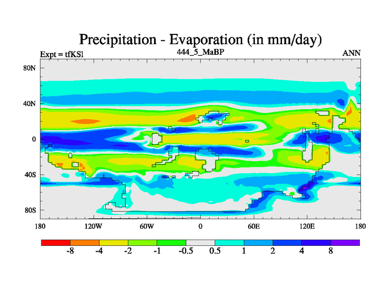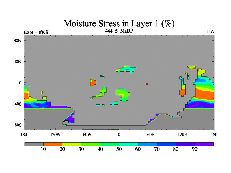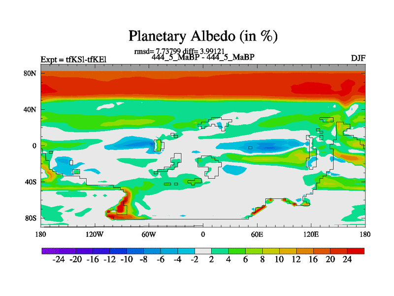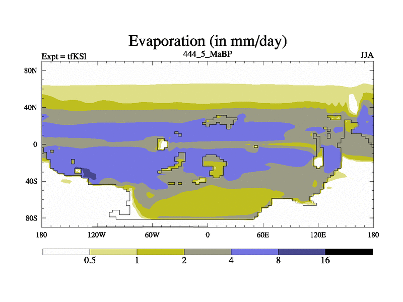 This is the 444.5 Ma simulation using the Scotese palaeogeographies and revised CCN etc. This version has islands and smoothing and desert albedo included. Tuned CO2 to give Scotese temperatures. Started from end of tfKEl.