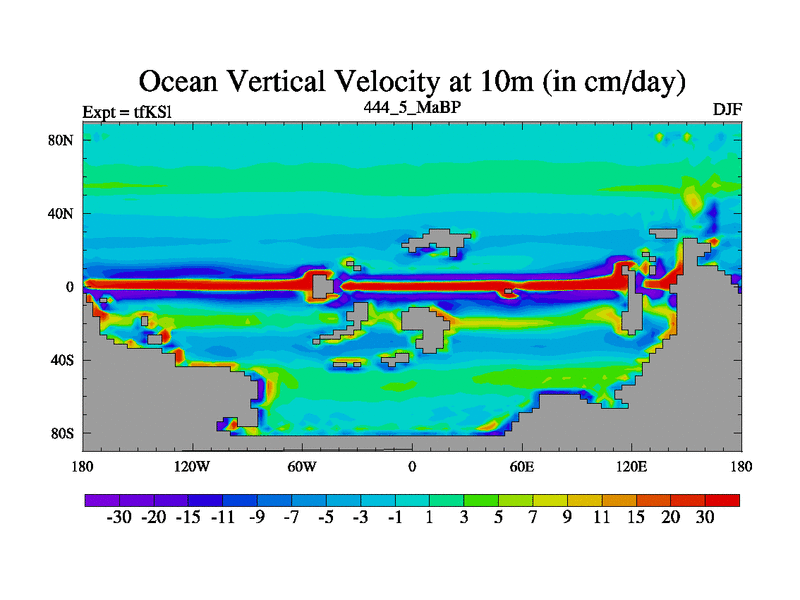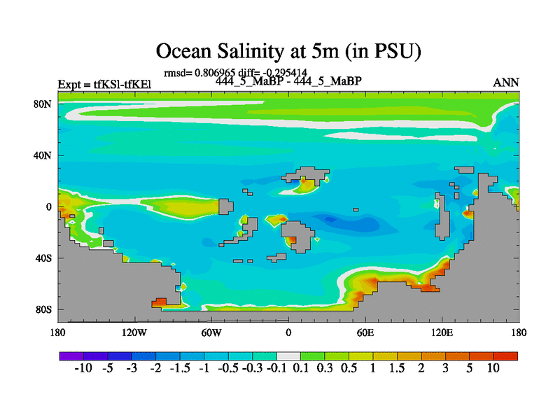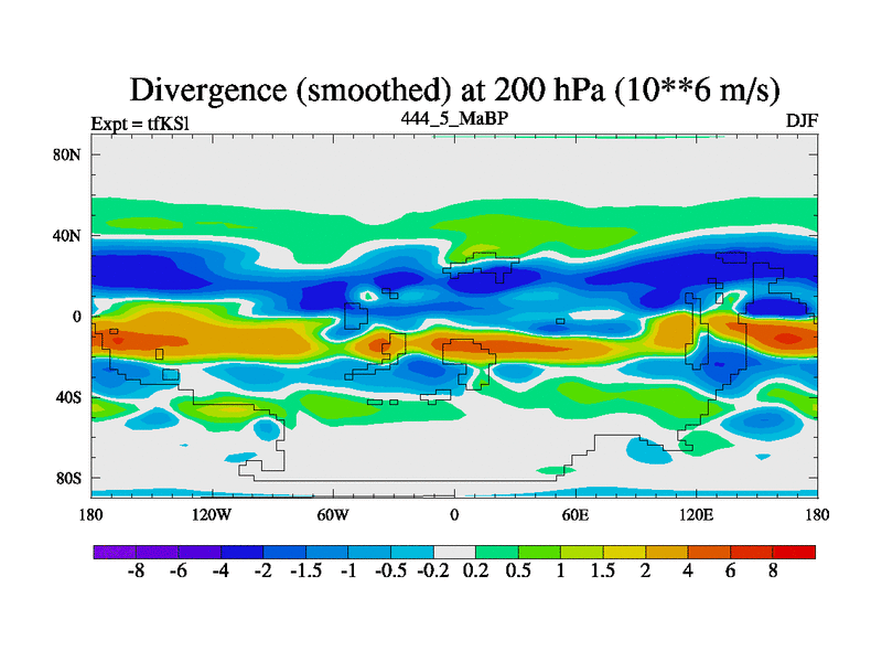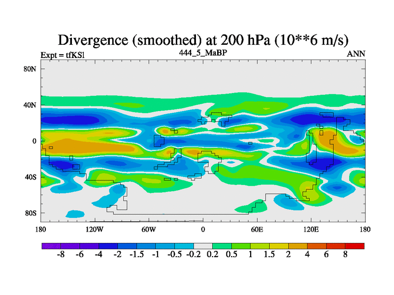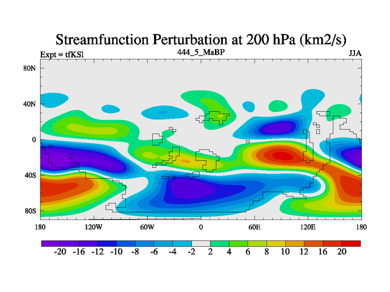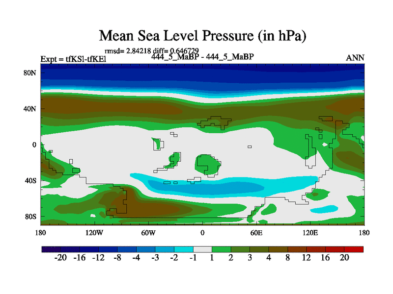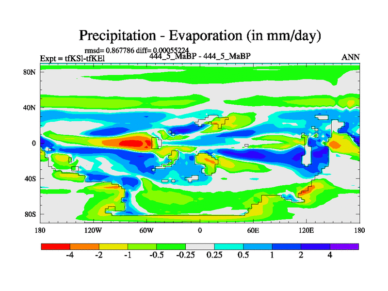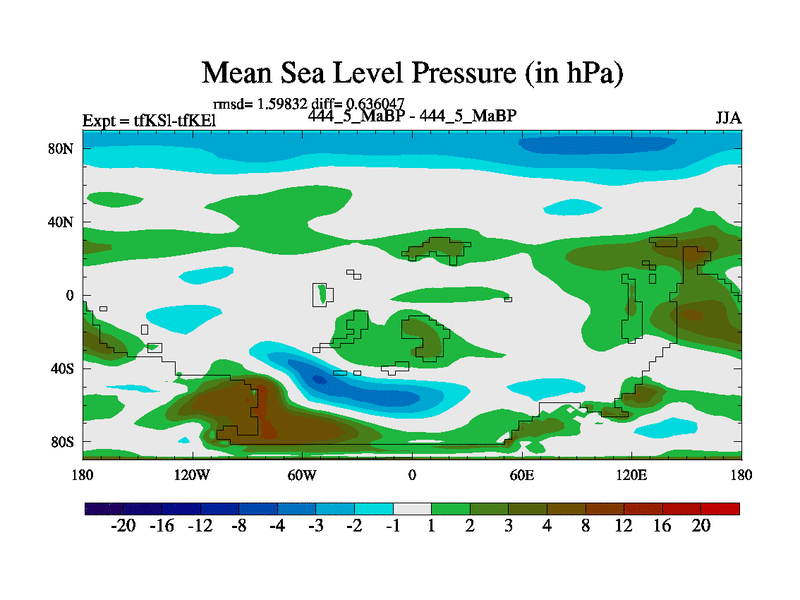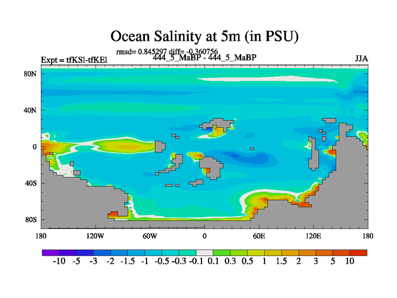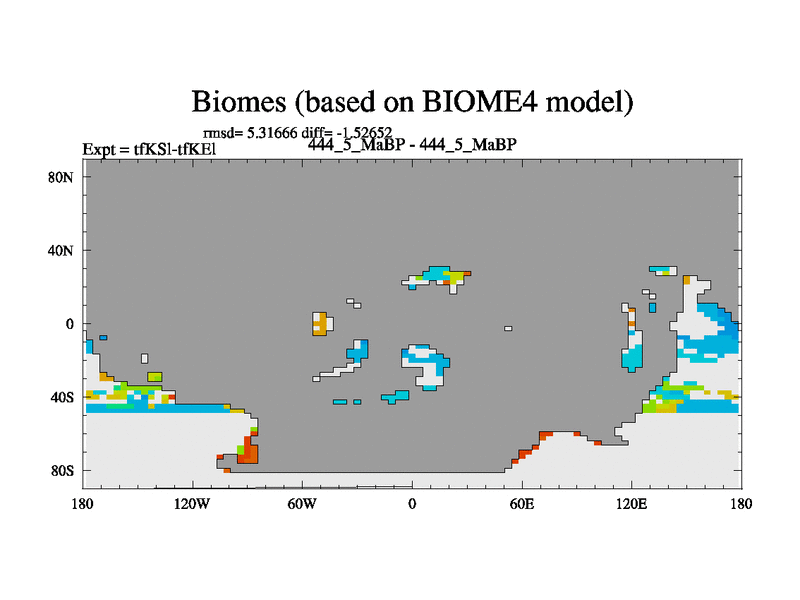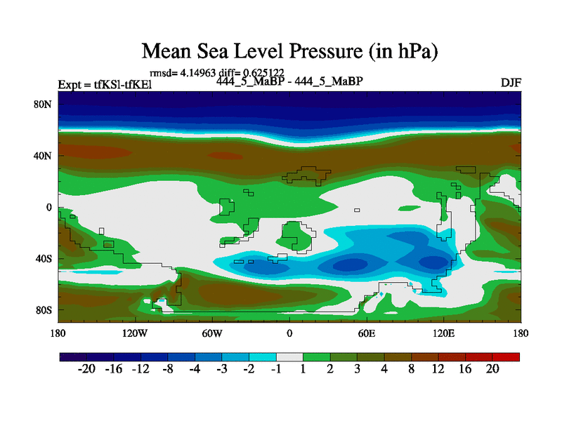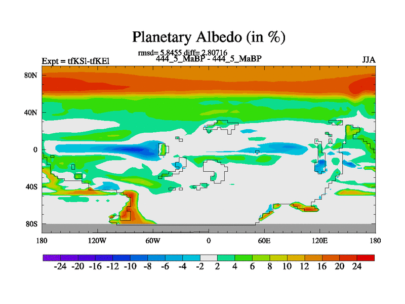 This is the 444.5 Ma simulation using the Scotese palaeogeographies and revised CCN etc. This version has islands and smoothing and desert albedo included. Tuned CO2 to give Scotese temperatures. Started from end of tfKEl.