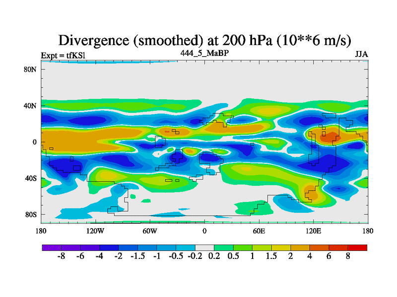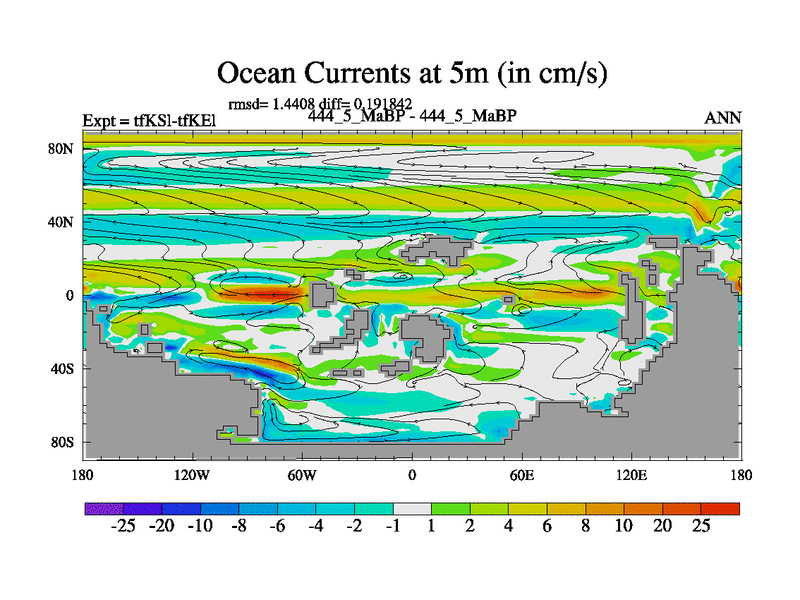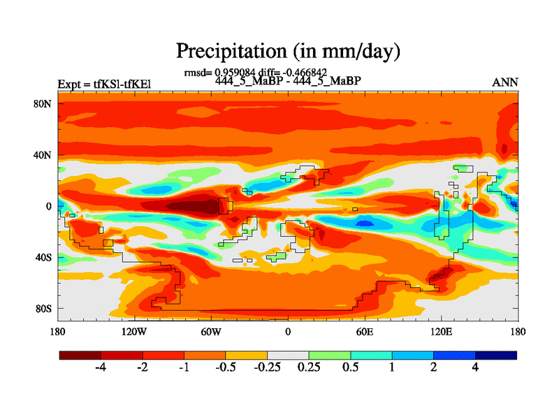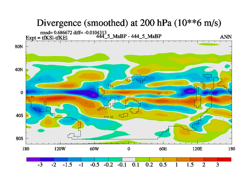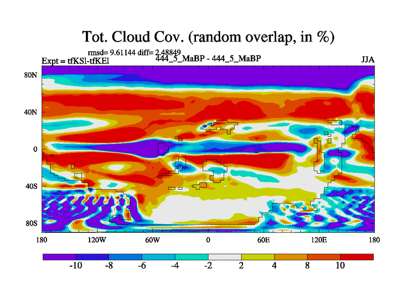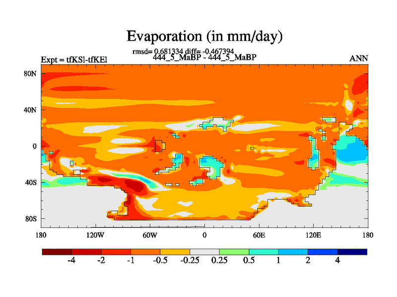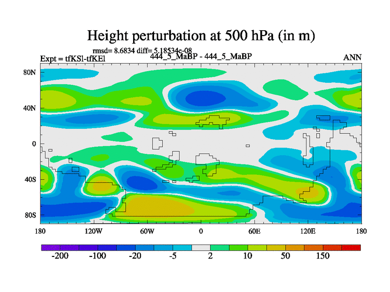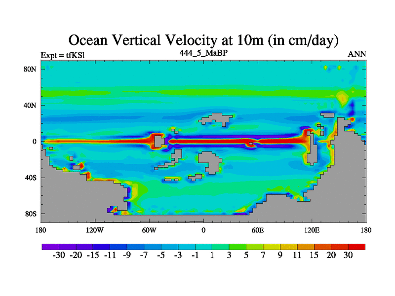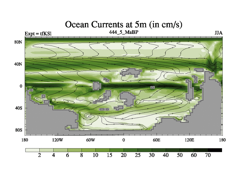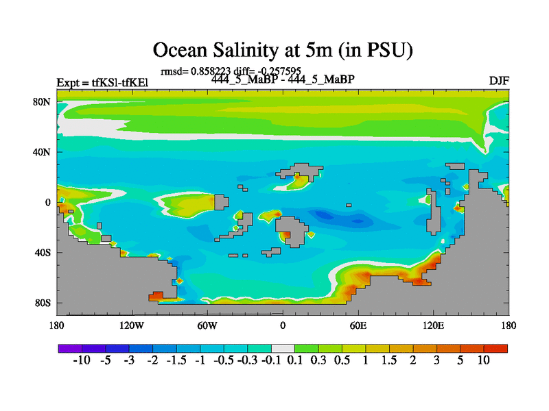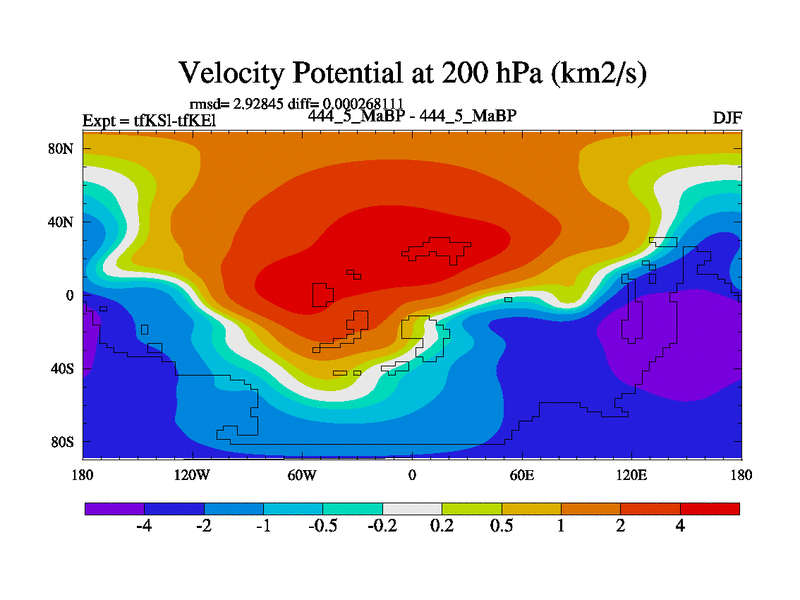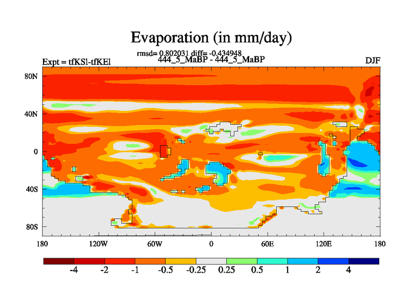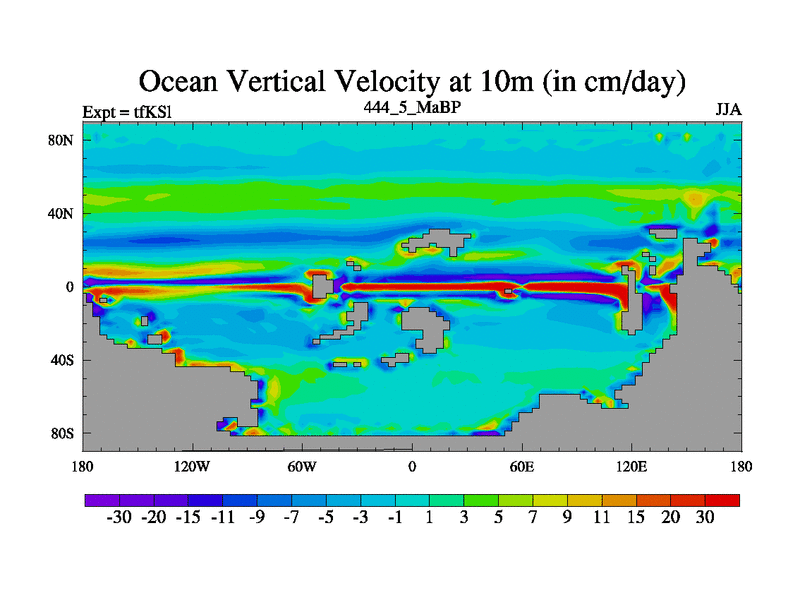 This is the 444.5 Ma simulation using the Scotese palaeogeographies and revised CCN etc. This version has islands and smoothing and desert albedo included. Tuned CO2 to give Scotese temperatures. Started from end of tfKEl.