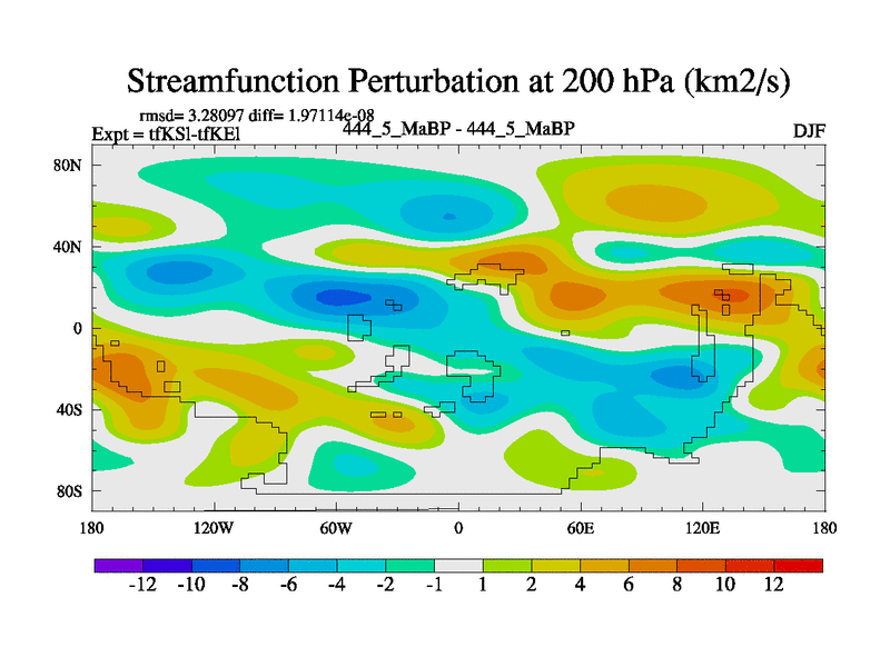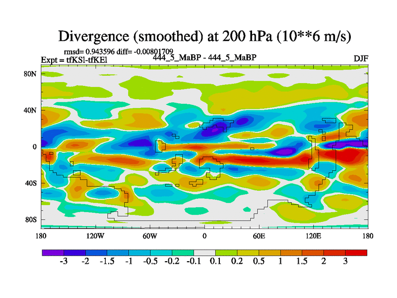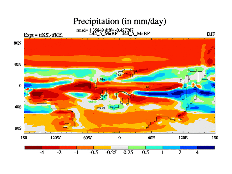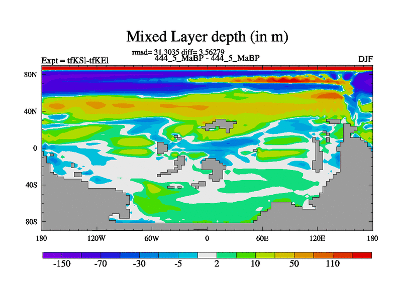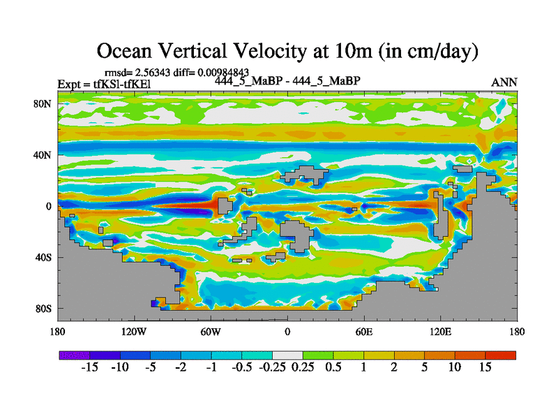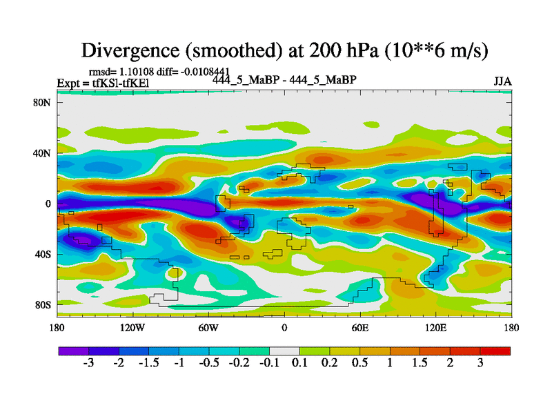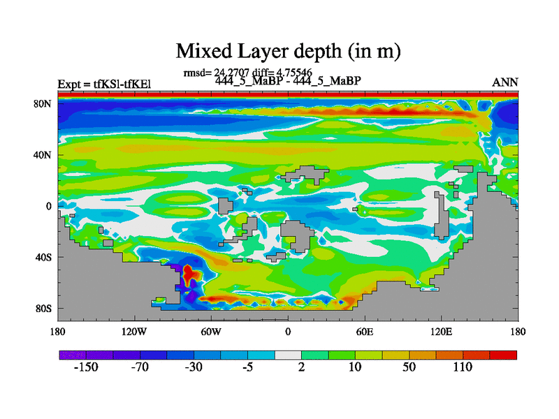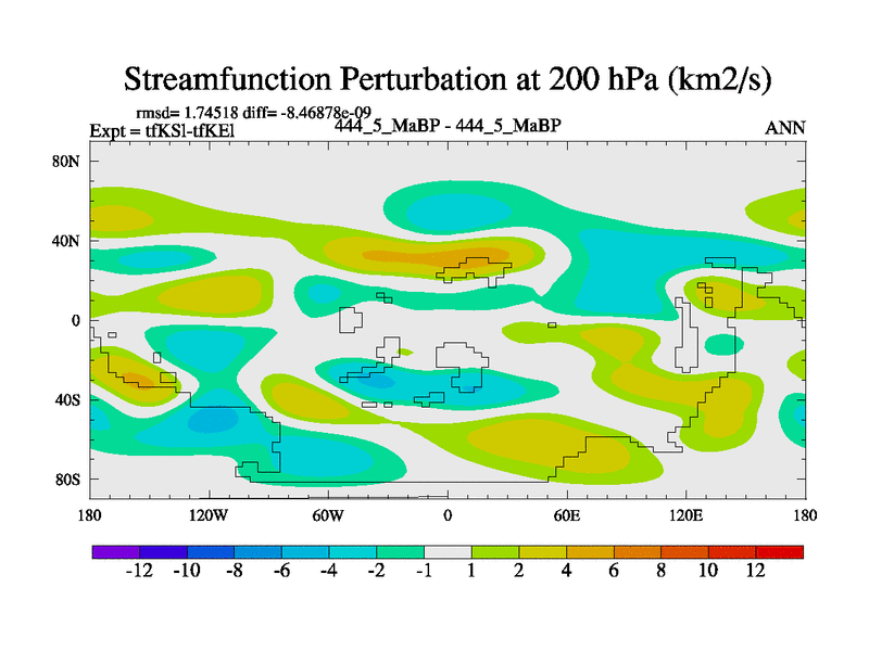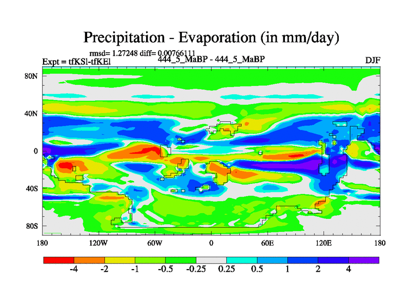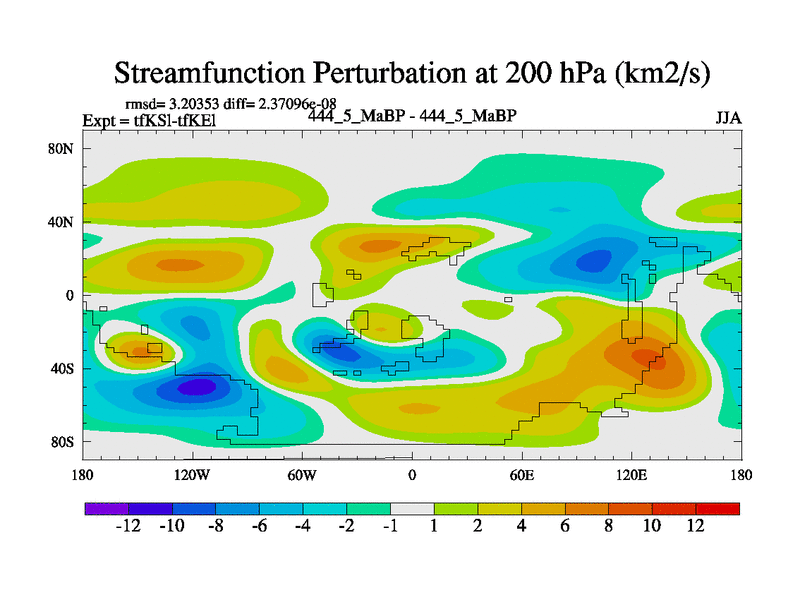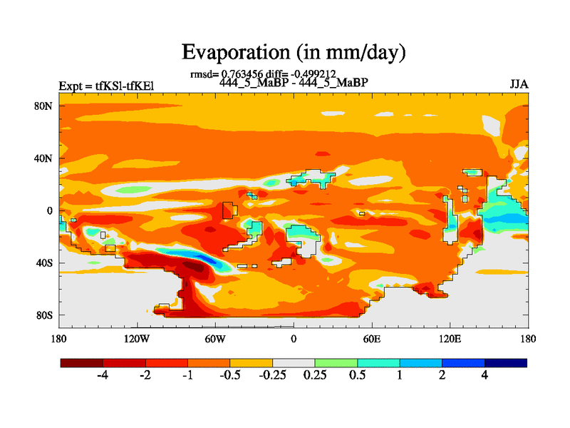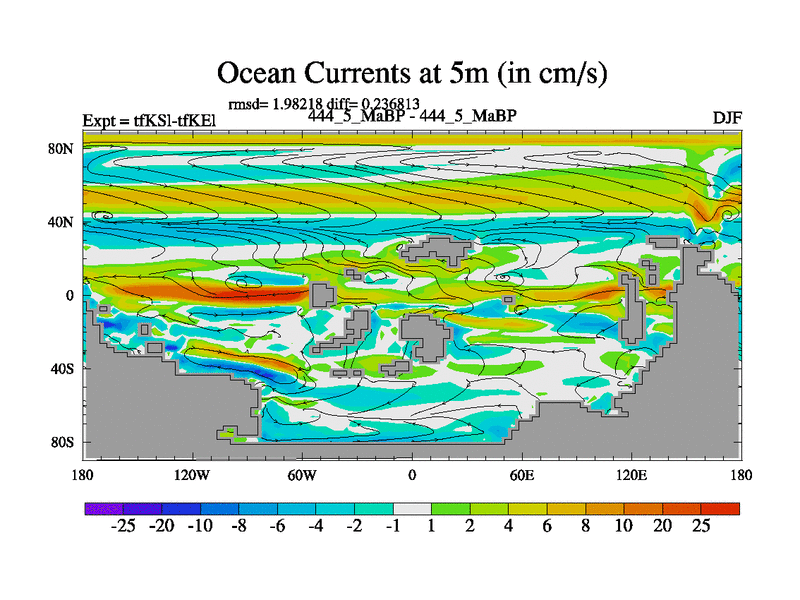 This is the 444.5 Ma simulation using the Scotese palaeogeographies and revised CCN etc. This version has islands and smoothing and desert albedo included. Tuned CO2 to give Scotese temperatures. Started from end of tfKEl.