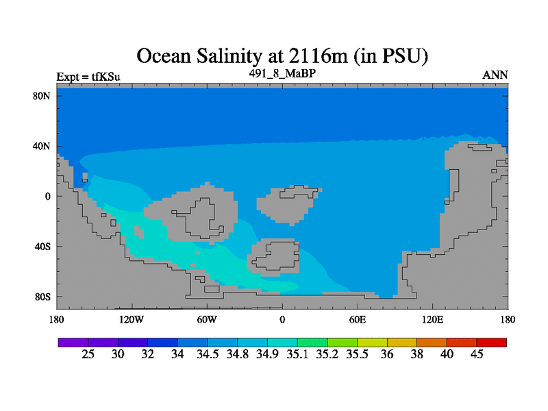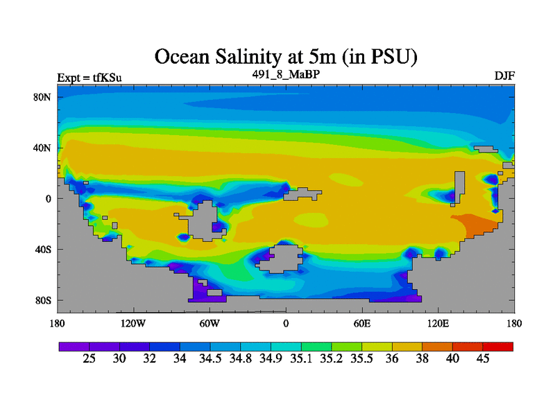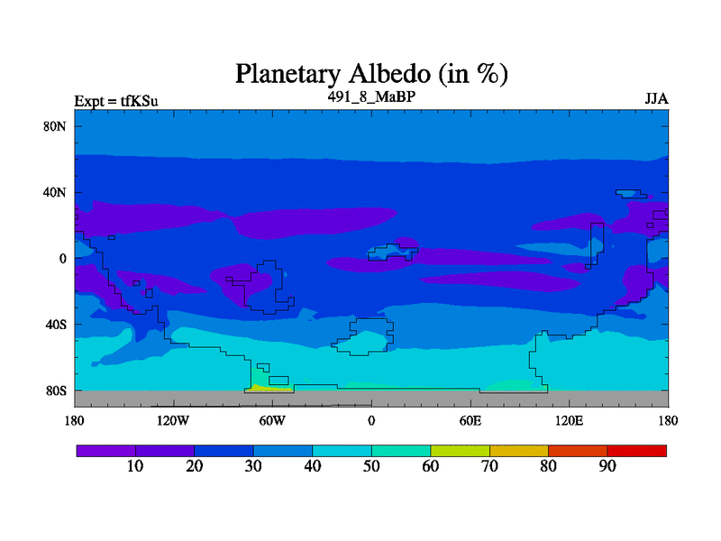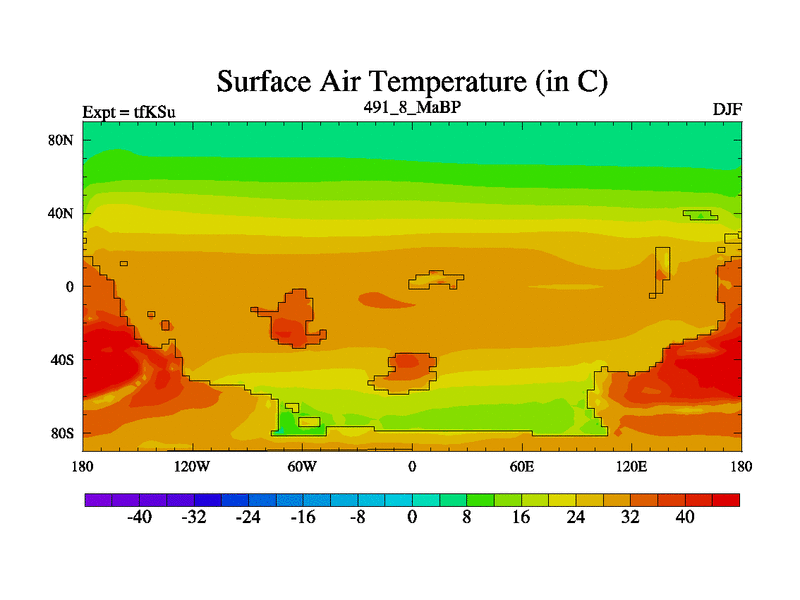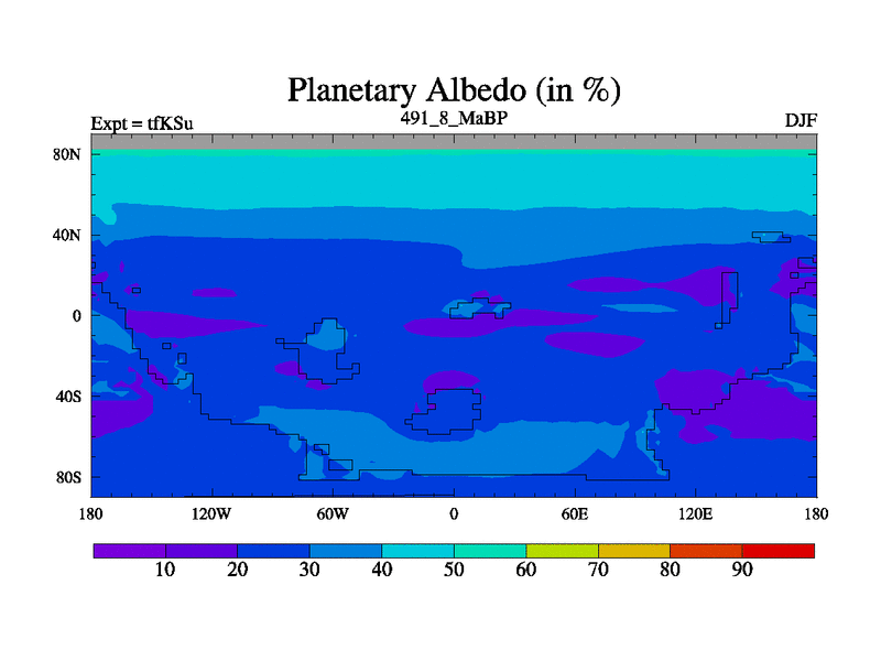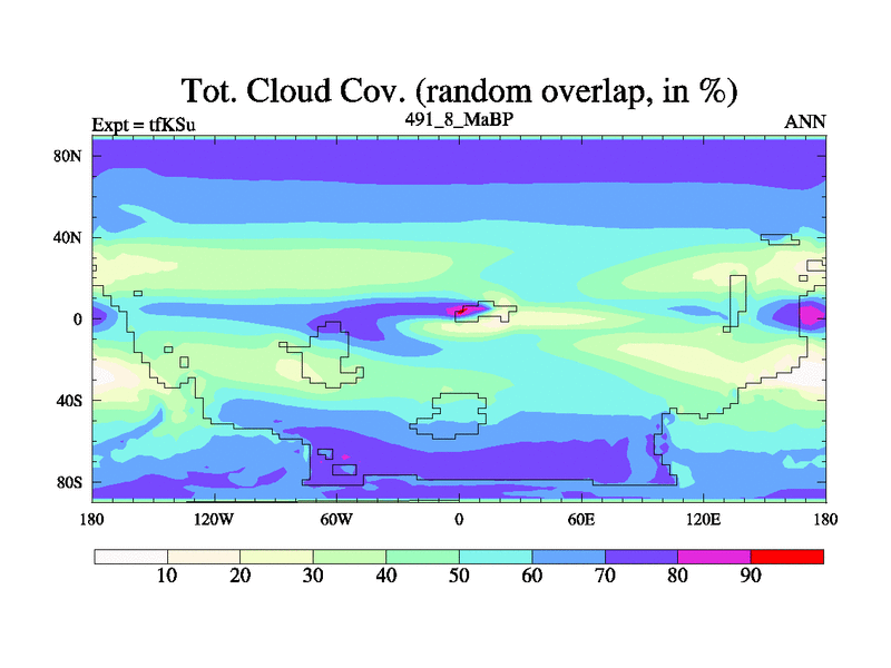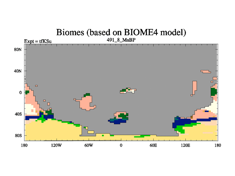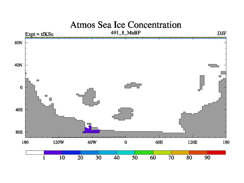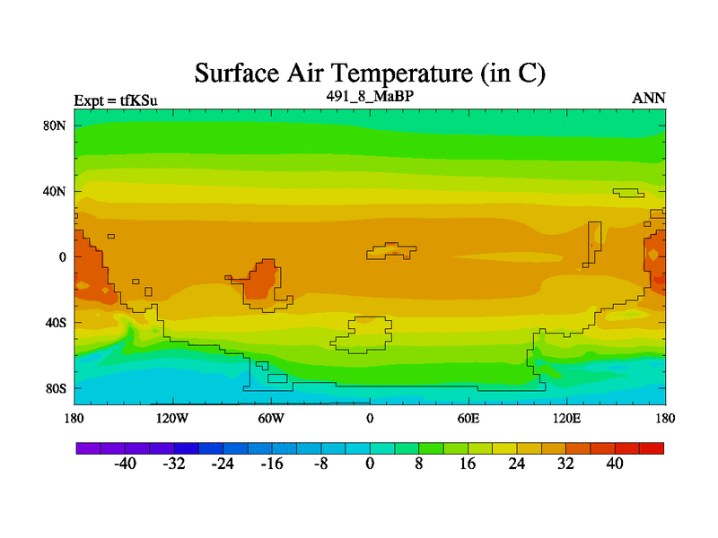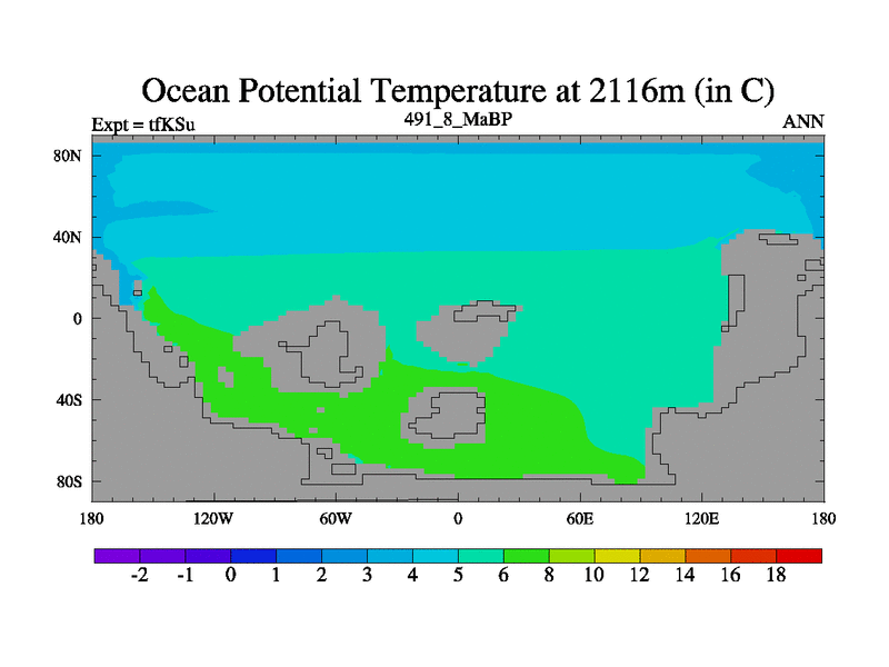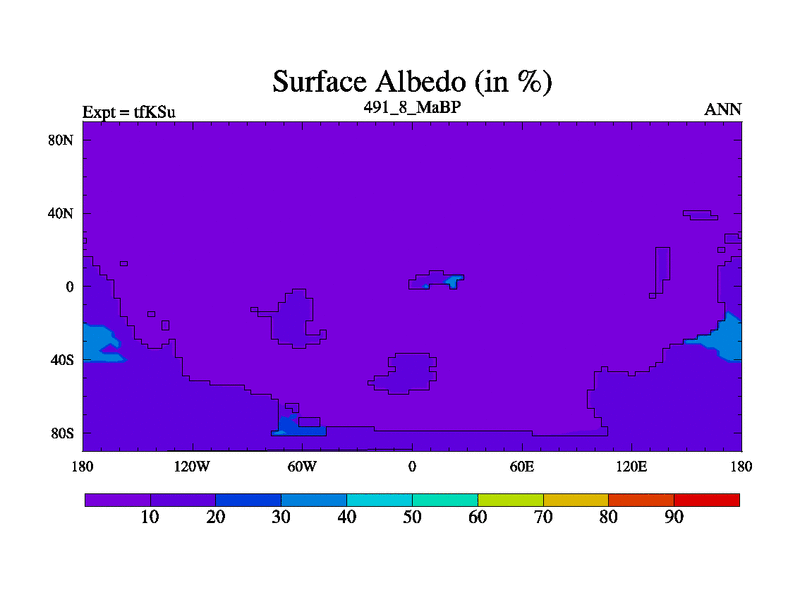 This is the 491.8 Ma simulation using the Scotese palaeogeographies and revised CCN etc. This version has islands and smoothing and desert albedo included. Tuned CO2 to give Scotese temperatures. Started from end of tfKEu.