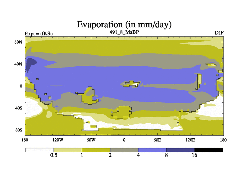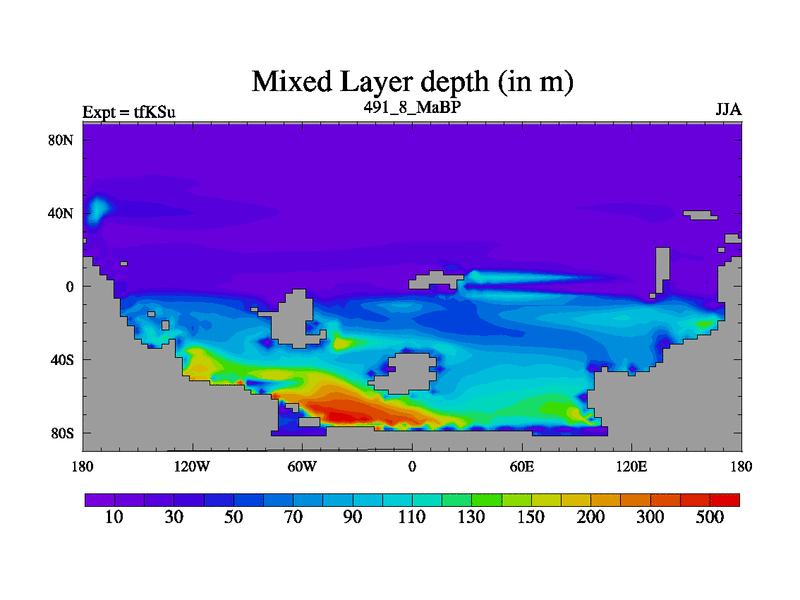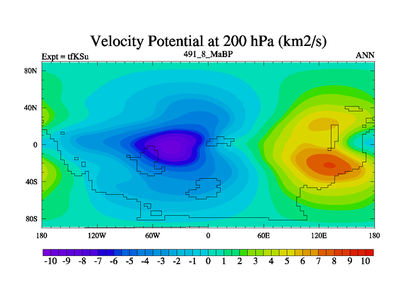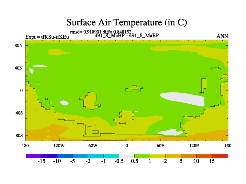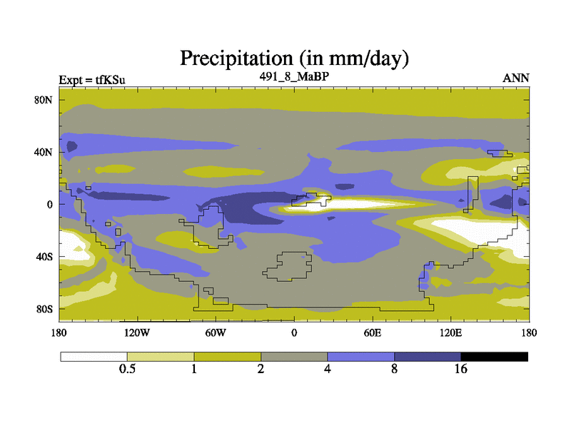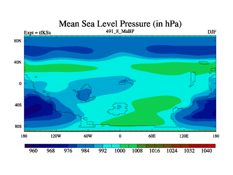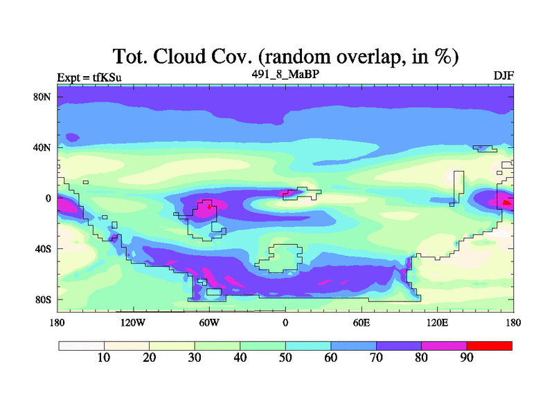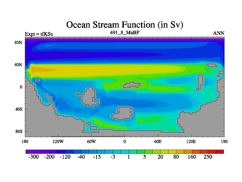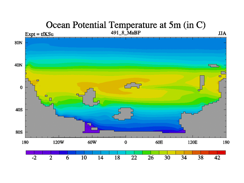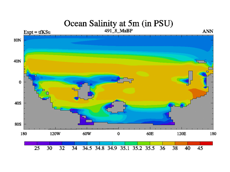 This is the 491.8 Ma simulation using the Scotese palaeogeographies and revised CCN etc. This version has islands and smoothing and desert albedo included. Tuned CO2 to give Scotese temperatures. Started from end of tfKEu.