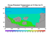 Scientifically as benchmark except using water age update, dark respiration, salinity conservation and revised ozone. Also using new orbital and solar update, and outputting leaf CO2. This version has islands included and atmospheric smoothing and desert albedo. Tuned CO2 to give Scotese temperatures. Started from end of tfKEu.